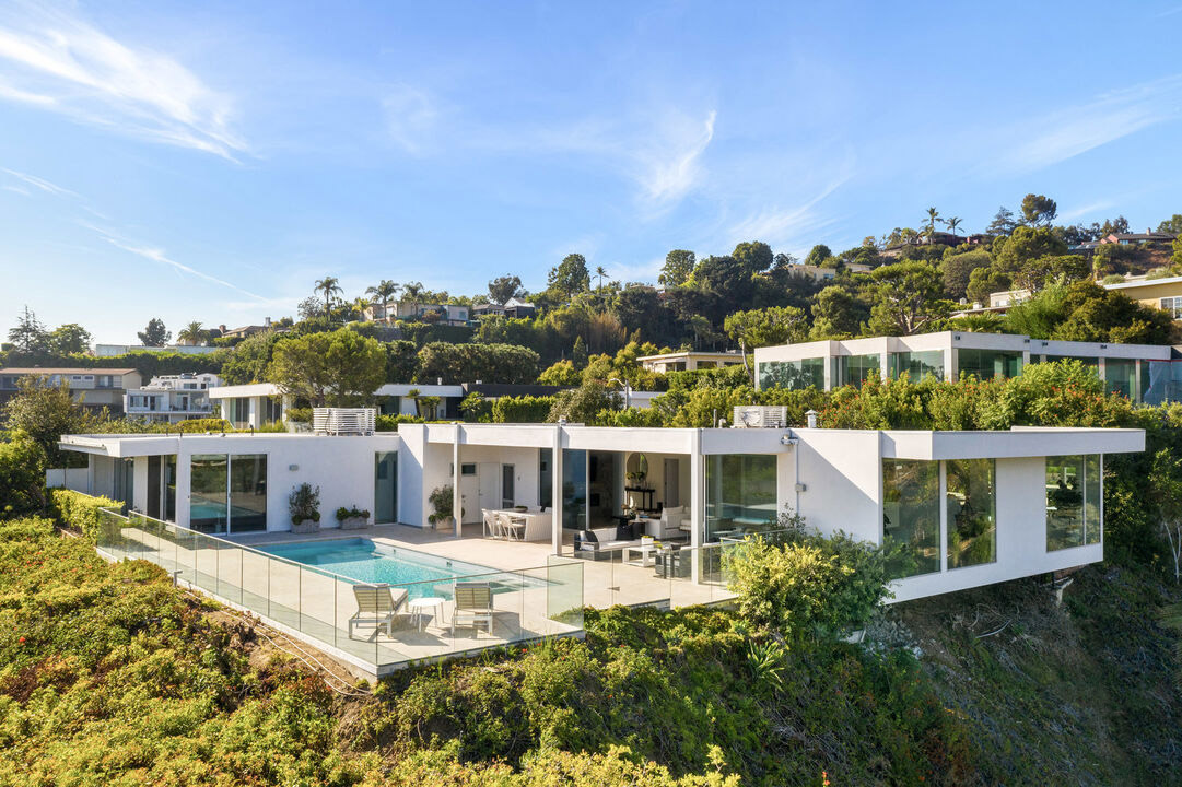 STUNNING CONTEMPORARY WITH HEAD-ON CITY TO OCEAN VIEWS. Totally remodeled & updated both inside & out. Gated entry through the dramatic foyer leads to an expansive living room featuring a wet-bar, gas fireplace, walls of glass with electronic shades overlooking the birds eye views of Los Angeles from downtown to the Pacific Ocean. The open kitchen with center island is fully equipped with chef grade appliances along with a glassed in breakfast room with sliders to a terrace. The master suite with jetliner views, double walk-in closets, dressing area, numerous built-ins, and a sunlit spa-like bath w/freestanding tub. Spacious 2nd ensuite bedroom, plus an office/den with pool bath, maids/gym w/bath, laundry room, and extra deep 2 car garage with storage. The heated swimmers pool is equipped with an auto cover and Jacuzzi surrounded by gorgeous travertine with a covered and open patio.