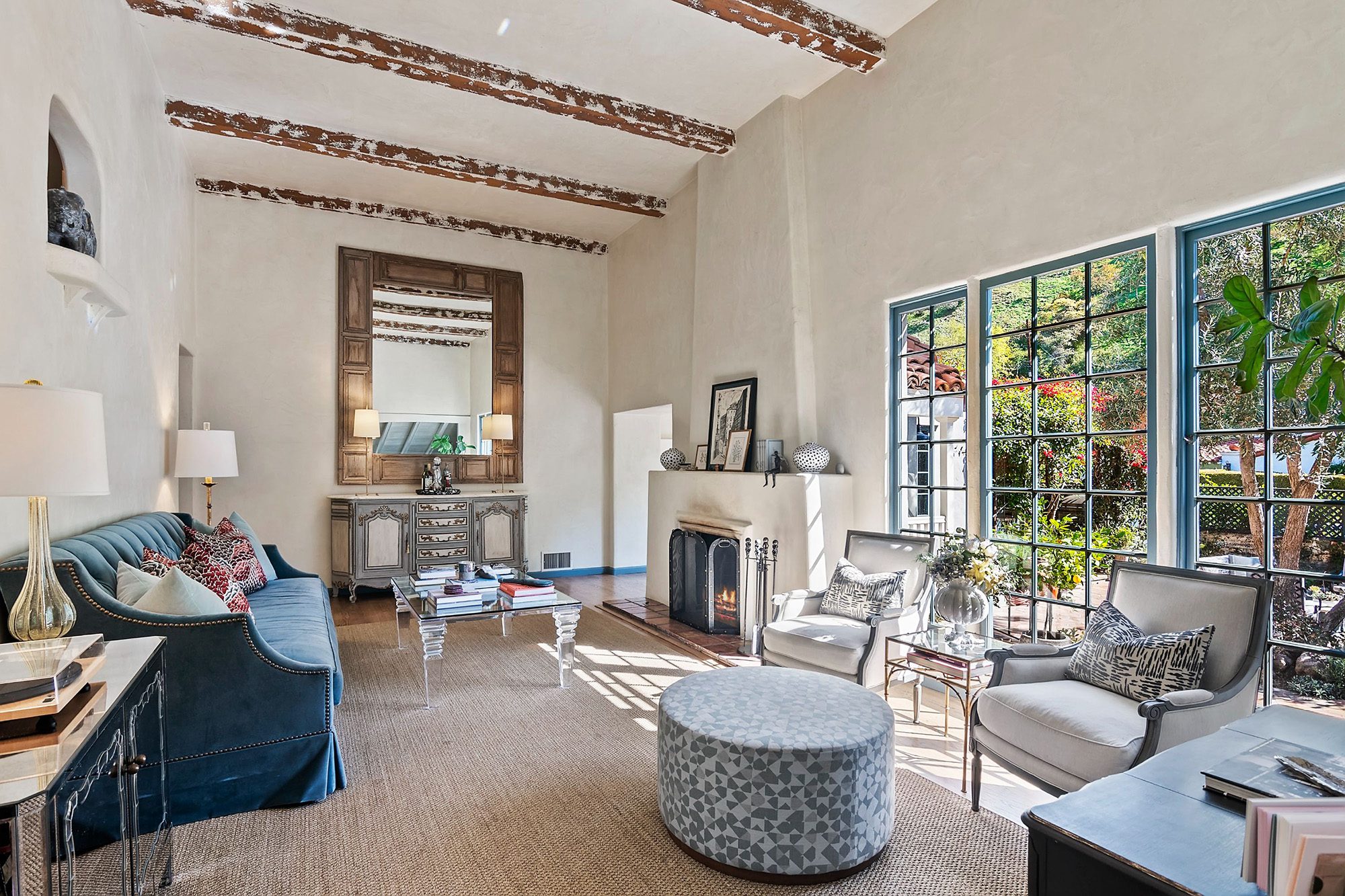 This Spanish hacienda home with a French flair is your beautiful, private oasis that transports you to the romantic Mediterranean countryside in Beverly Hills. Cloaked in privacy behind hedges of greenery and climbing roses is a warm, rustic, sultry setting with multiple wood-burning fireplaces, elegant indoor-outdoor flow and top-of-the-line finishes. A picture-postcard courtyard made for entertaining on any scale with a fireside lounge and alfresco pergola. Covered by lush climbers and rich blooms, the pergola features wood-stone pizza oven and DCS grill & rotisserie in a romantic atmosphere. Immersed in the tranquility of nature elements and coastal palettes, its open, light-filled interiors with vaulted wood beam ceilings embrace you with its beauty and warmth. Chef-grade kitchen and a chandelier dining room perfect for hosting. Two en-suite bedrooms with an oversized closet tailor made for domestic bliss. A pretty step-down lounge with a custom sofa-bed and privacy curtain transforms into another room. The primary suite features an elegant bathroom with Moroccan zellige and Mosaic House custom tiles. Experience this gorgeous home in a magical blend of rustic charm and luxury.