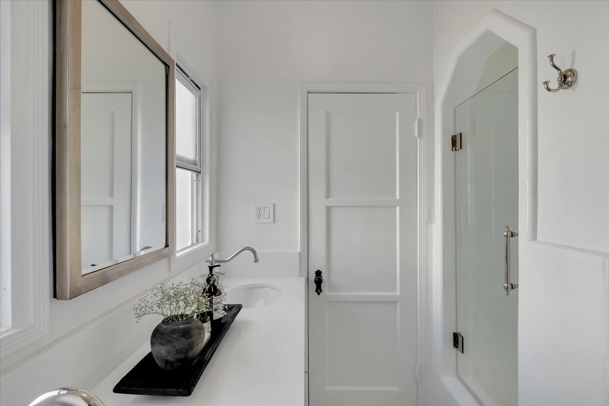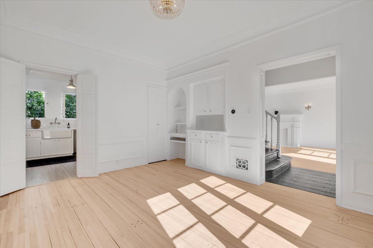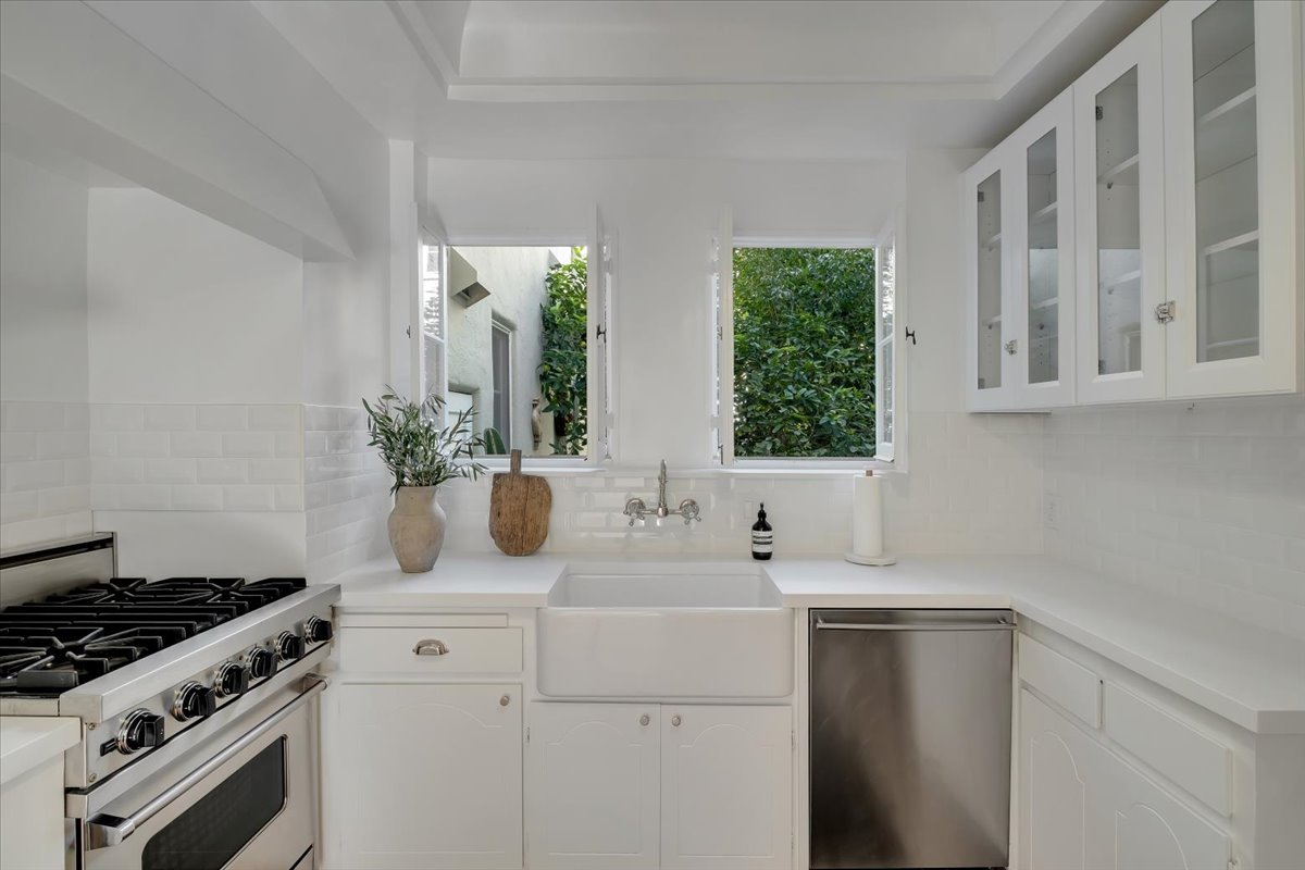 This beautifully restored designer townhouse in Beverly Hills exudes timeless elegance with its meticulous attention to original 1930s details. The classic charm is preserved through carefully refurbished crown moldings & hardwood floors, creating an ambiance reminiscent of Parisian sophistication. The kitchen has been revived with the utmost care, boasting top-of-the-line fittings, new countertops, cabinetry & high-end Viking & Bosch appliances. A farm sink adds a touch of rustic charm. Adjacent to the kitchen, a separate laundry room provides practicality with ample storage & a convenient folding counter. The large open living room, flooded with natural light from the bay window overlooking the rose-lined garden, seamlessly transitions into the formal dining room. The dining room is not only functional but also aesthetically pleasing with china cabinetry & ample storage. A half guest bath on the first floor adds convenience for residents & guests alike. Ascending the unique black staircase, you'll discover the incredibly spacious & light-filled primary bedroom. This space features large wardrobes, two additional closets & French doors leading to a private balcony. The recently remodeled bathroom exudes luxury with stunning cabinetry, double sinks, marble floors & a separate bathtub & shower. The second bedroom is generously sized & offers plenty of closet space, ensuring comfort & practicality. Additional features include an outdoor shared patio, a private detached garage with additional storage & a Nest thermostat for modern convenience. Situated in close proximity to the finest amenities Beverly Hills has to offer, this townhouse provides a perfect blend of classic design, modern amenities & a desirable location. The meticulous restoration work ensures that every corner of this residence reflects the charm and grace of its 1930s origins.