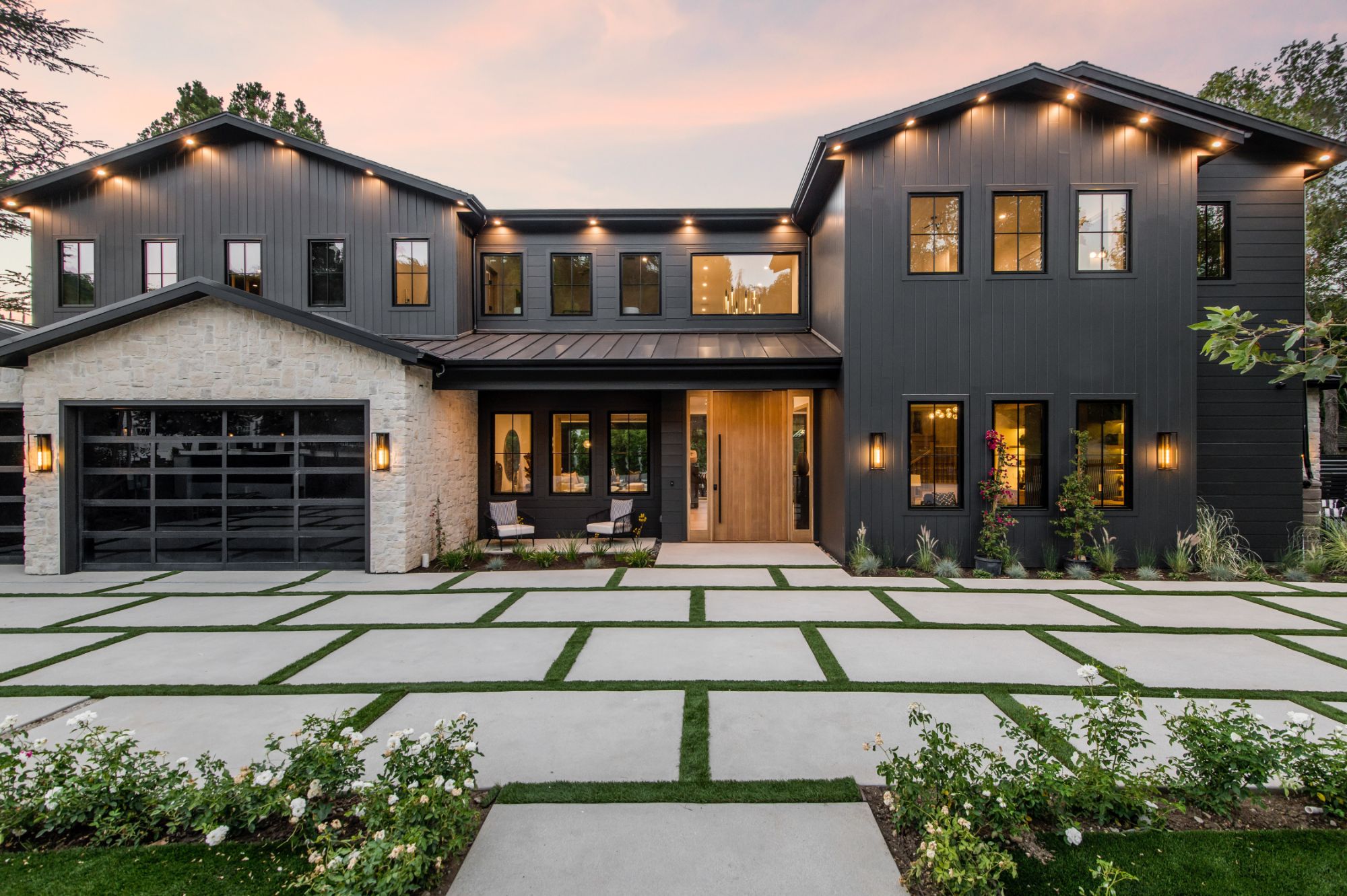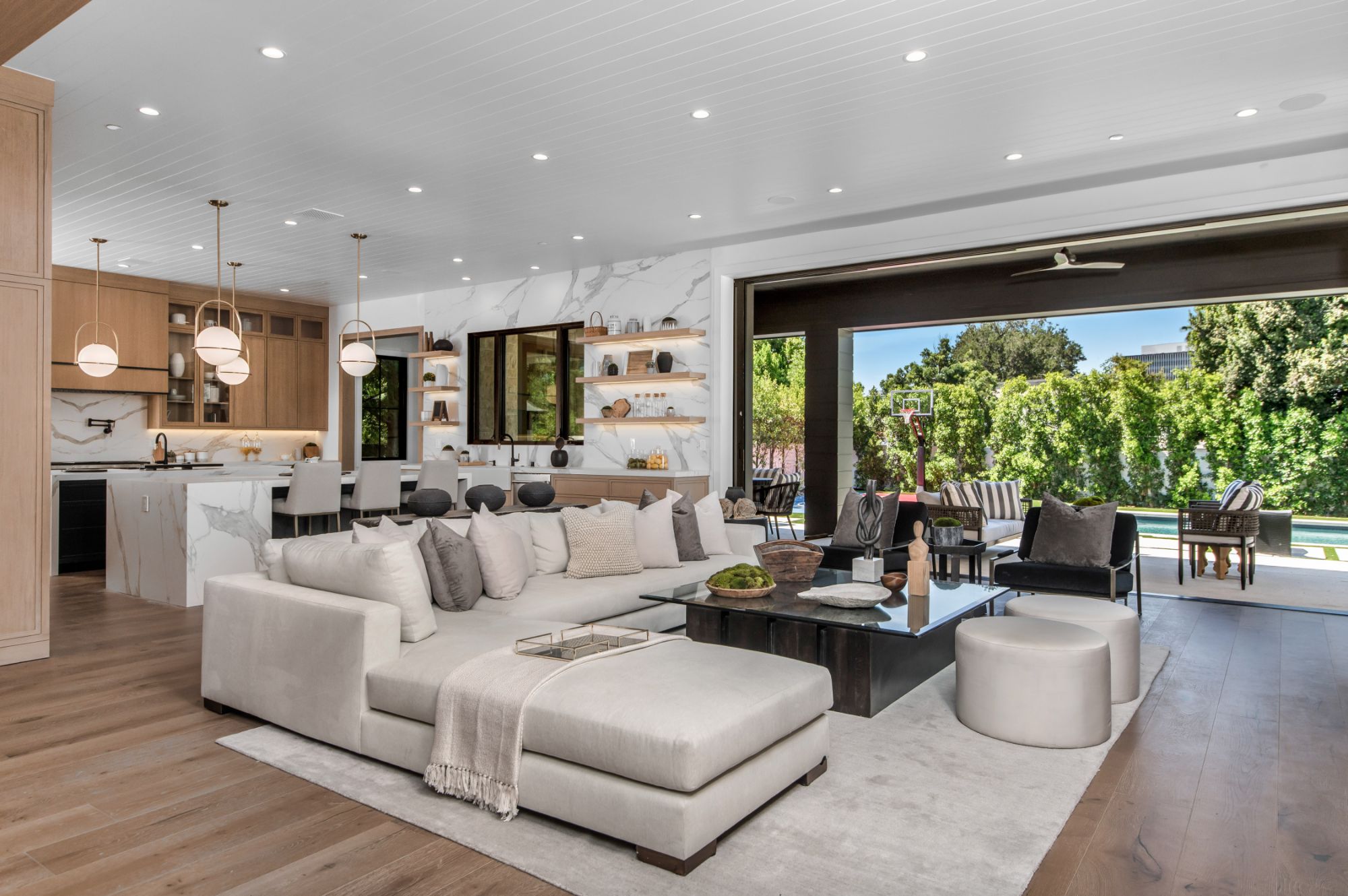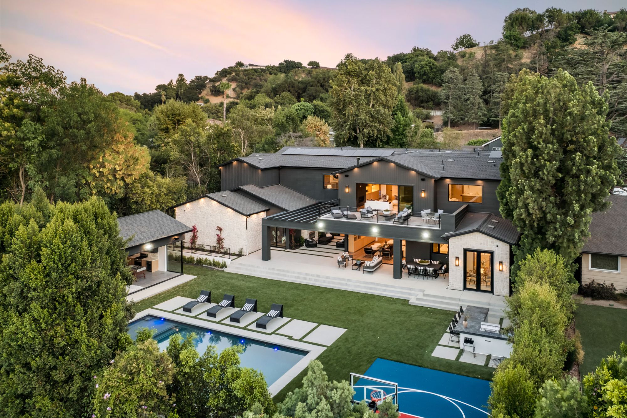 Exquisite new construction gated estate in the coveted enclave of Royal Oaks neighborhood of Encino. Past the motor court and covered entrance with farm door, guests are greeted by a stunning two-story foyer and wide-plank European Oak floors that oversee this spacious floor plan. A formal dining room and elegant formal living room with fireplace continue with a well-appointed office with corner sliding glass doors and state of the art media room featuring chic paneled walls. The gourmet Chef s kitchen boasts beautiful countertops, 72-Inch Subzero refrigerator/freezer with middle wine cooler, and 48-inch 6-burner Wolf range. The inviting family room with custom built-in bookshelves with storage. Oversized pocket doors open to a massive outdoor patio with fireplace, perfect for al fresco dining. Upstairs, the romantic primary suite showcases a fireplace, separate sitting area, incredibly spacious walk-in closet, and large balcony with views of the park-like backyard. The spa-like primary bath boasts soaring ceilings, large rain shower, dual vanity, and a soaking tub. The sprawling grounds feature a sparkling pool & spa, sports court, spacious elevated patio, grass area and guest house with a bedroom and full bathroom. Additional conveniences include Control 4 smart-home automation system. A genuine one-of-a-kind estate, near fine dining, shopping, & more.