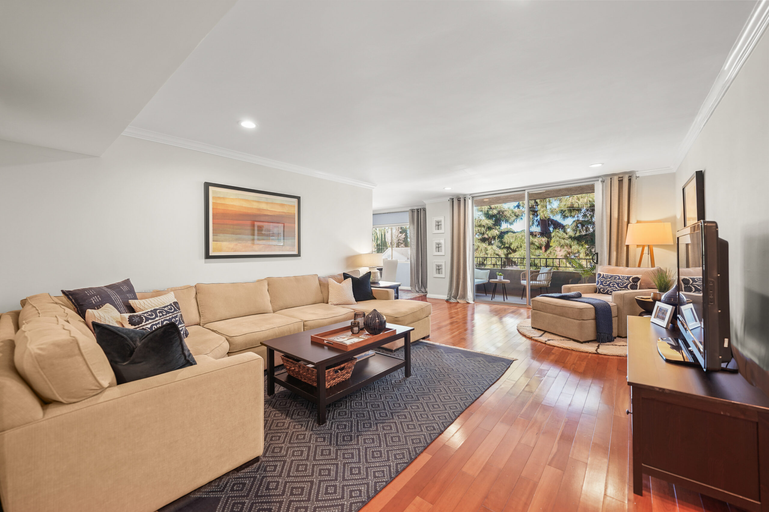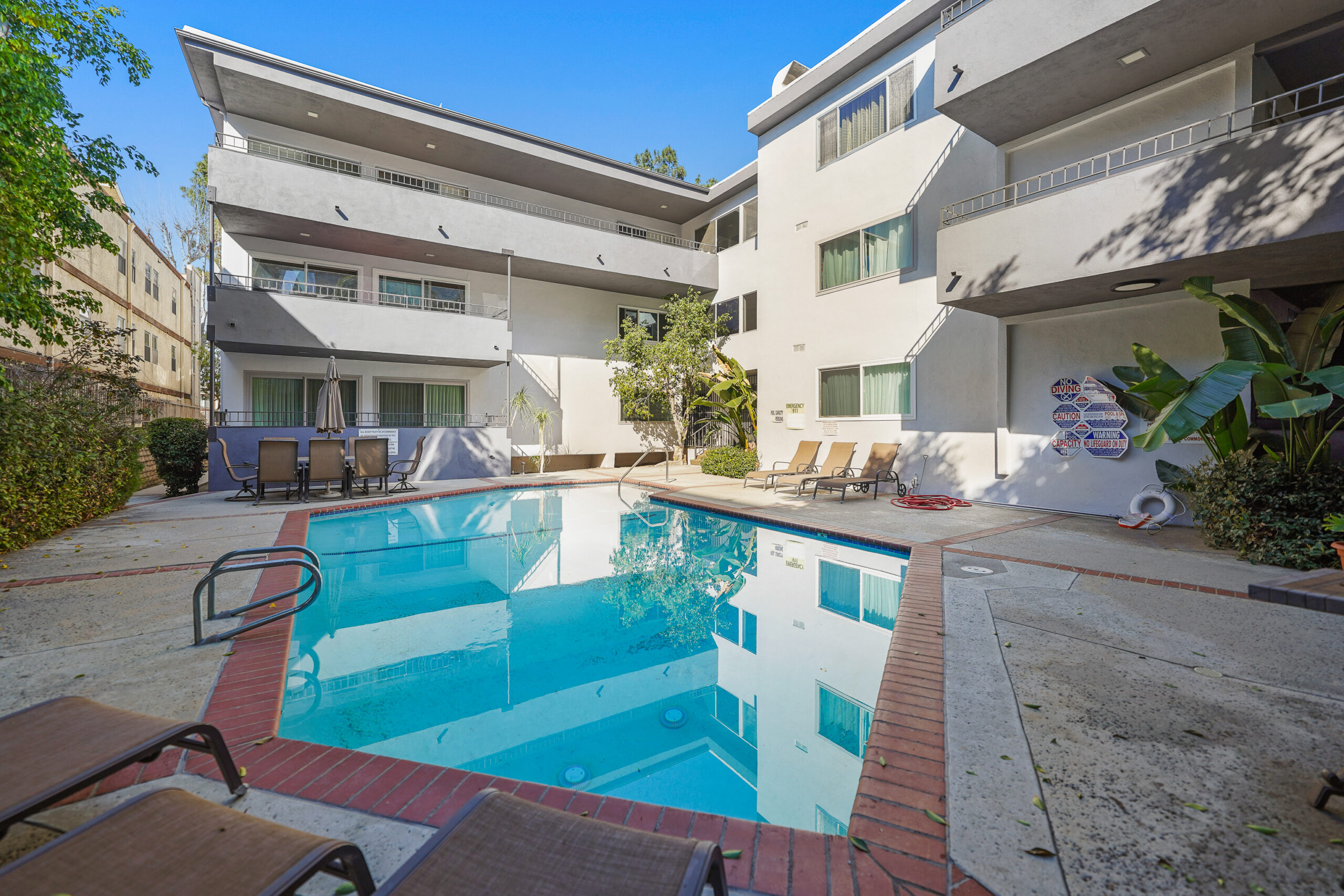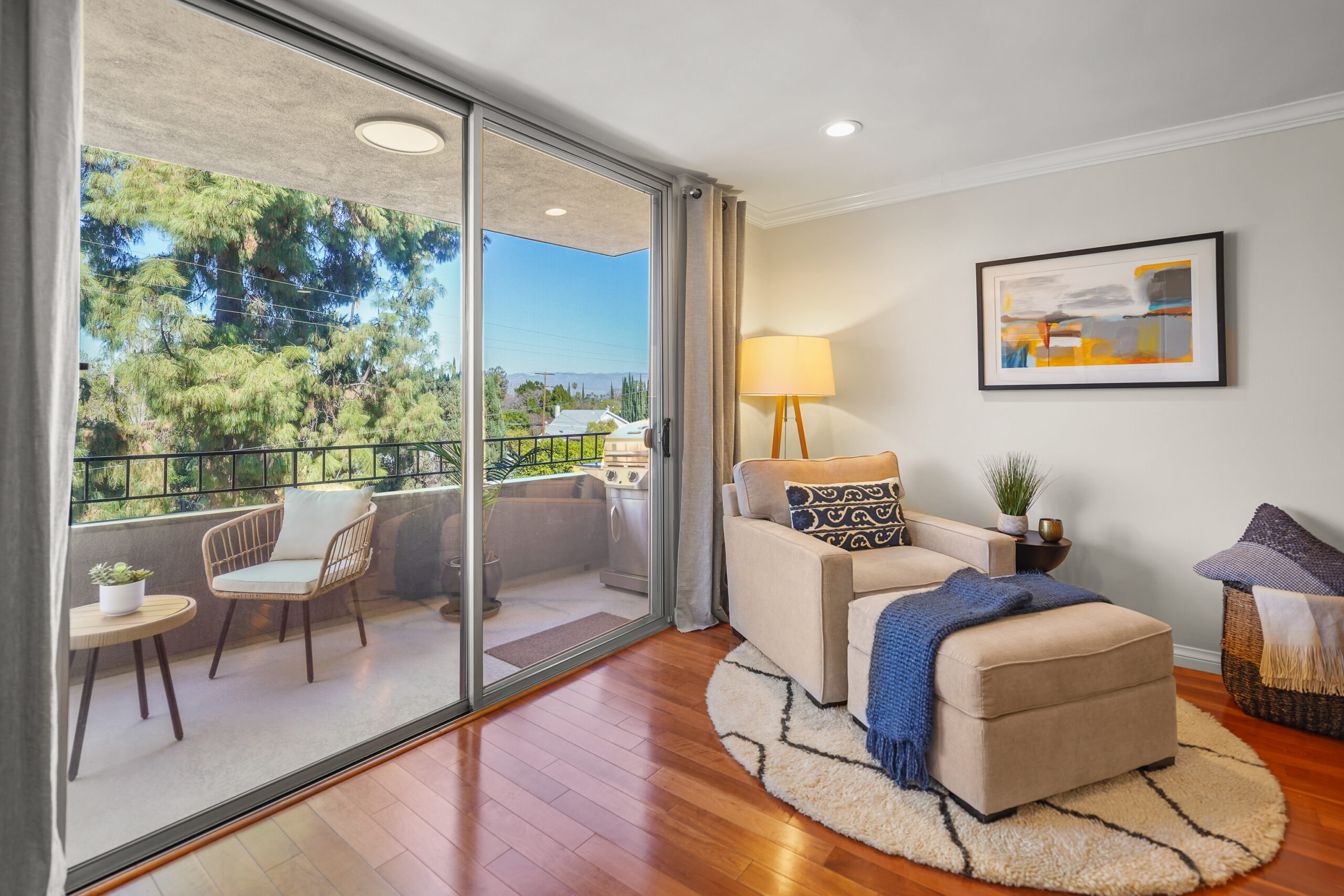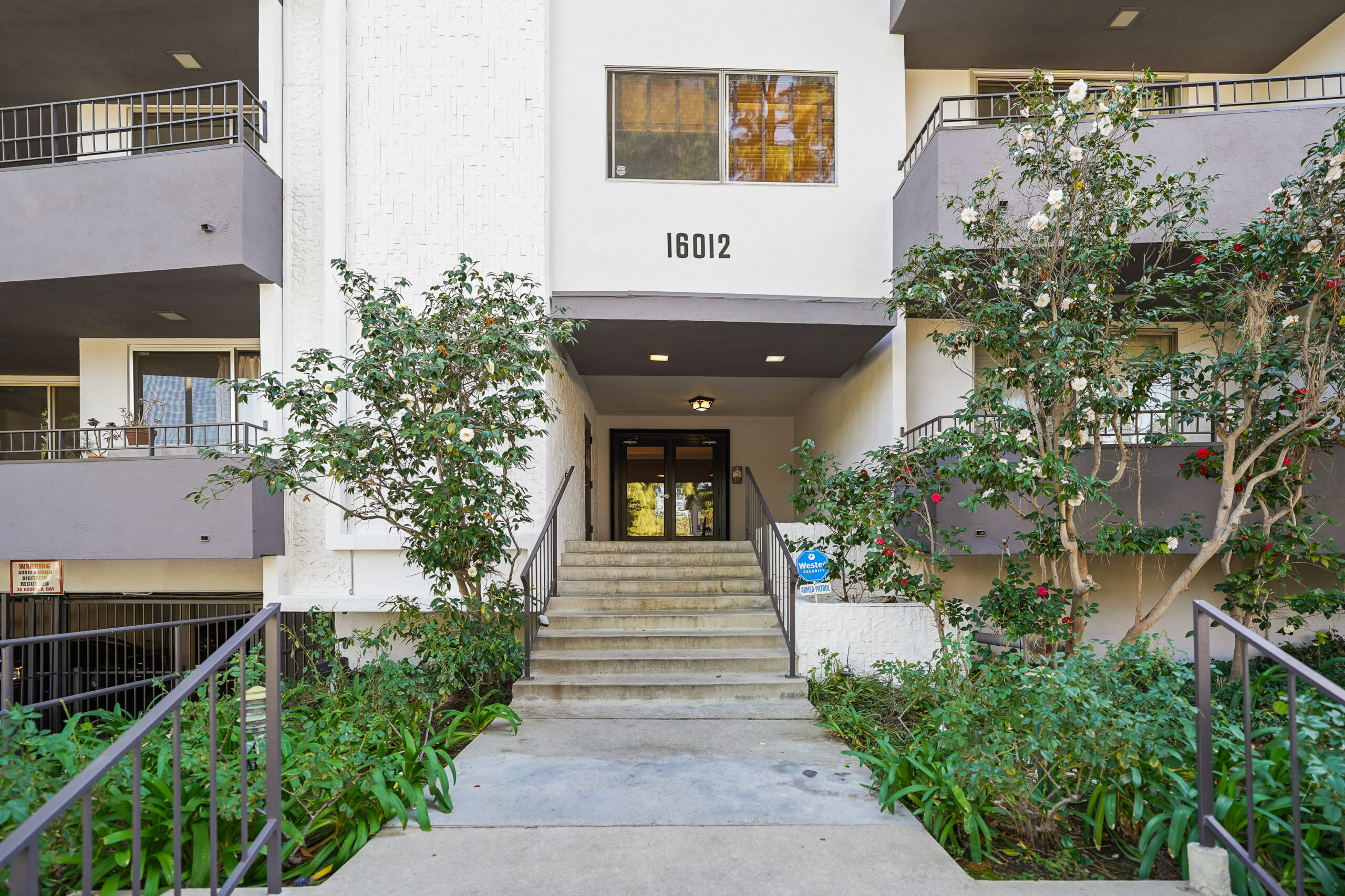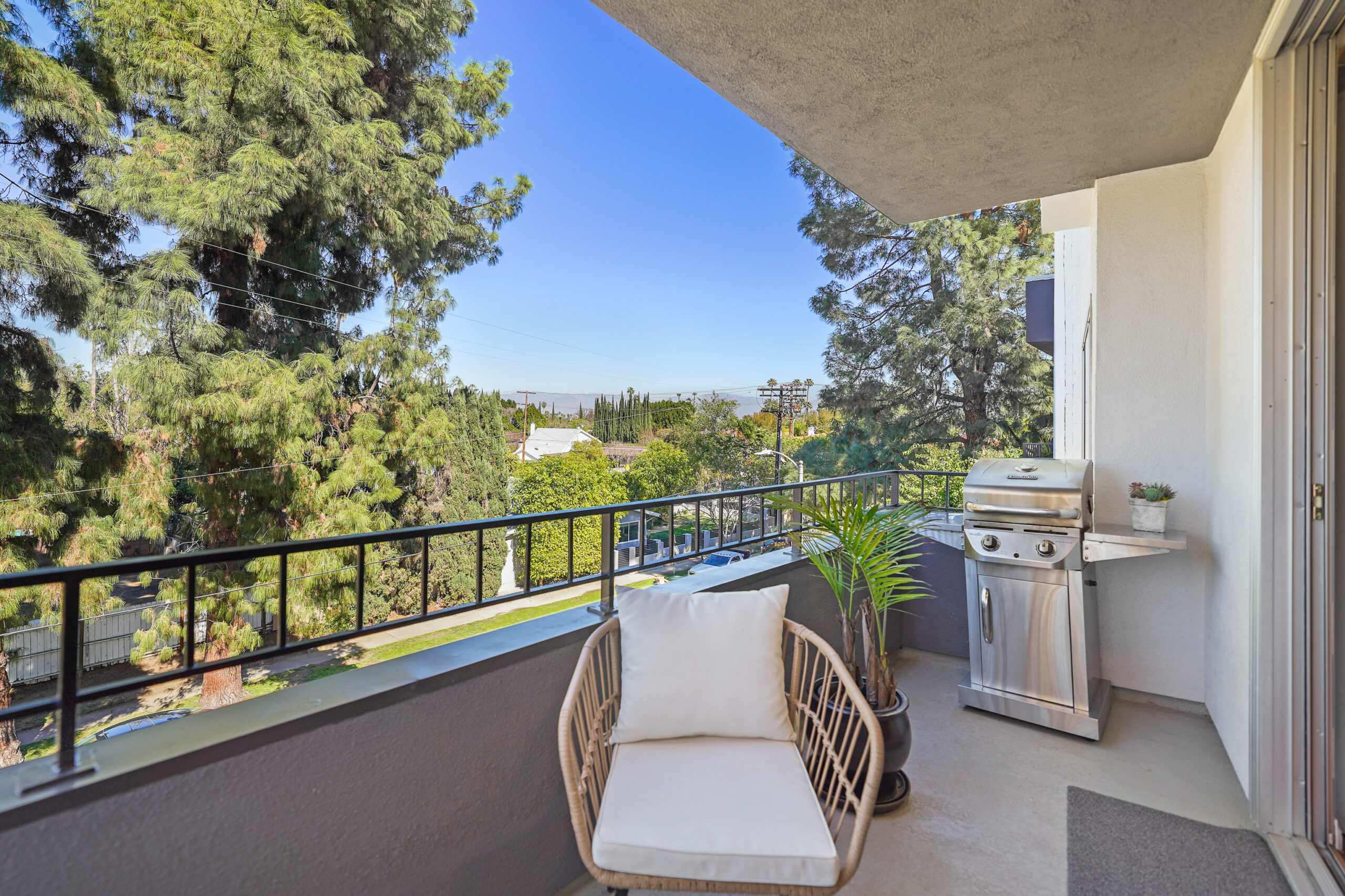 Top-Floor Condo with Mountain Views in Prime Location. Nestled in a highly desirable pocket of Encino surrounded by single-family homes, this top-floor unit offers a rare blend of privacy, modern updates, and convenience. Enjoy breathtaking sunrise and sunset views, all while being just steps from the vibrant shops and restaurants of Ventura Blvd. With easy access to the 101 and 405 freeways, this location offers both tranquility and accessibility. Inside, the spacious split-floorplan ensures comfort and privacy, with only one shared wall. The living and dining areas feature elegant laminate wood flooring, while both bedrooms boast plush carpeting and large walk-in closets with custom built-ins. The modern kitchen is a chef s dream, featuring granite countertops, stainless steel appliances, and custom cabinetry with lazy Susans, pull-out shelves, and soft-close drawers. Both en suite bathrooms have been beautifully updated with granite countertops, custom glass showers, and soft-close drawers. Additional conveniences include an in-unit washer and dryer, plus community laundry facilities on each floor. The well-maintained building was modernized in 2023, featuring a new roof and full exterior repaint, both under warranty. Residents enjoy a sparkling community pool, heated from Memorial Day through Labor Day, as well as gated subterranean parking with two side-by-side spaces and a private storage closet with built-in cabinets and shelves. A rare find in one of Encino's most sought-after locations, this home seamlessly blends modern comfort, stunning views, and unbeatable convenience.