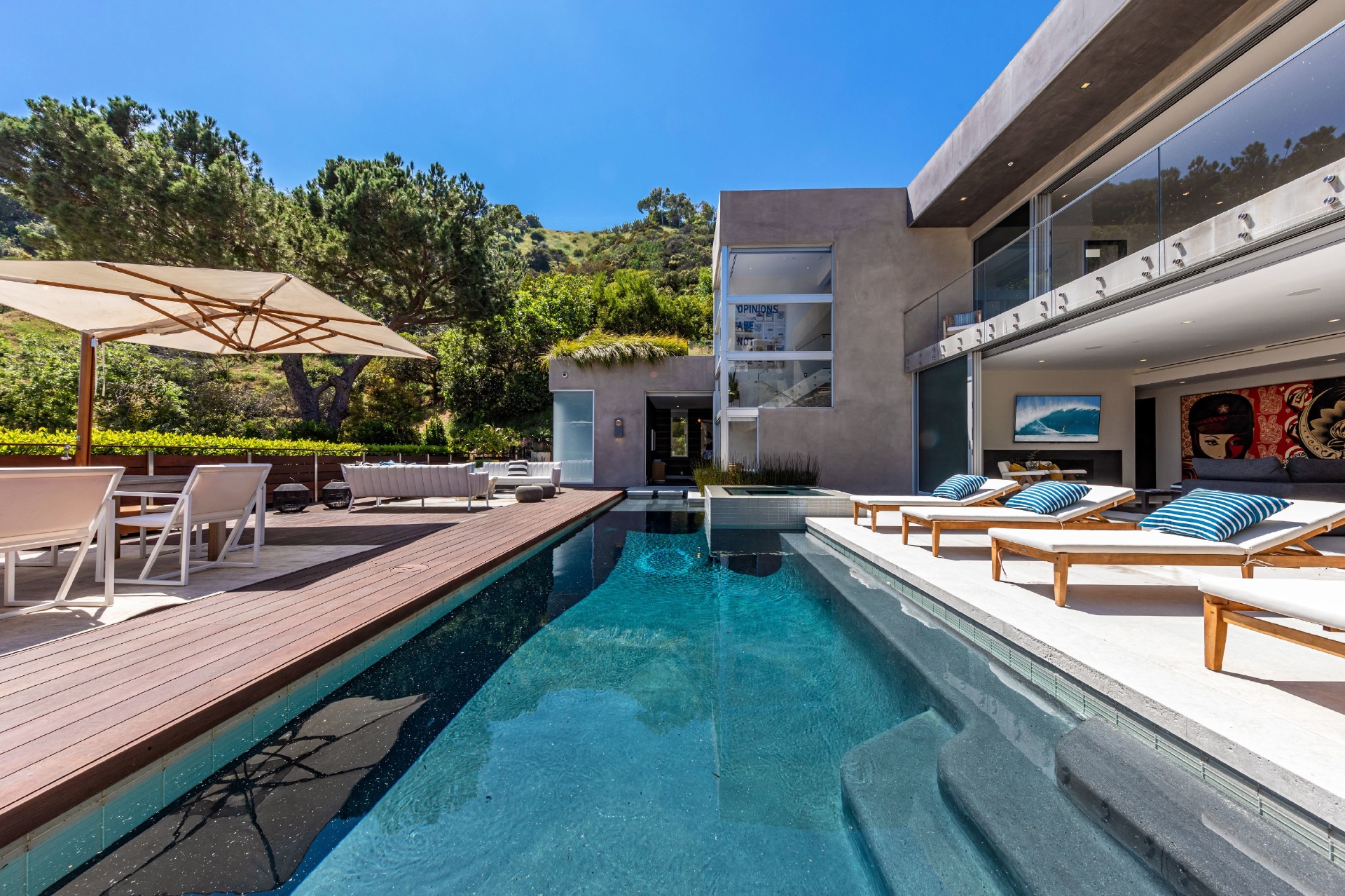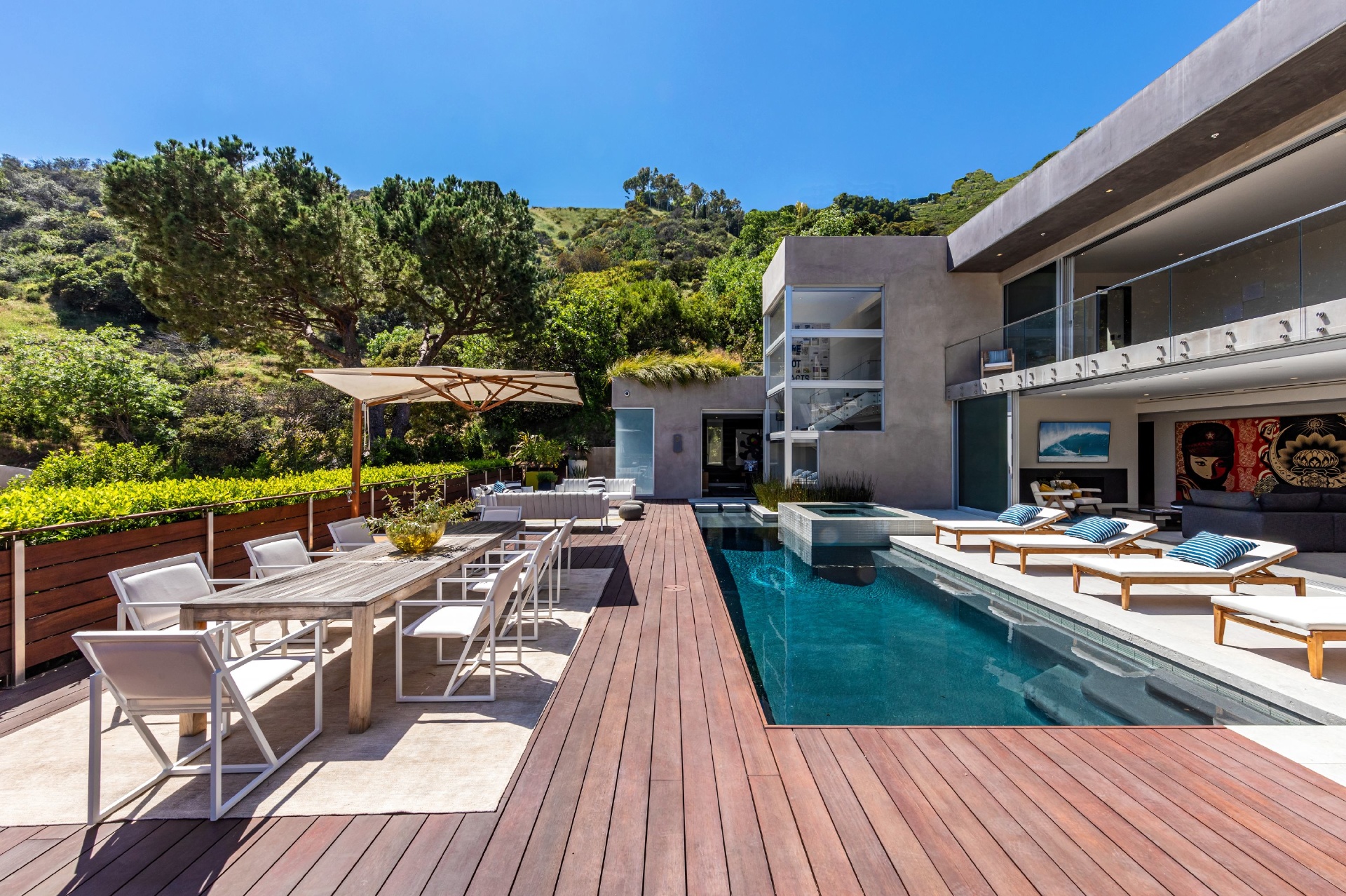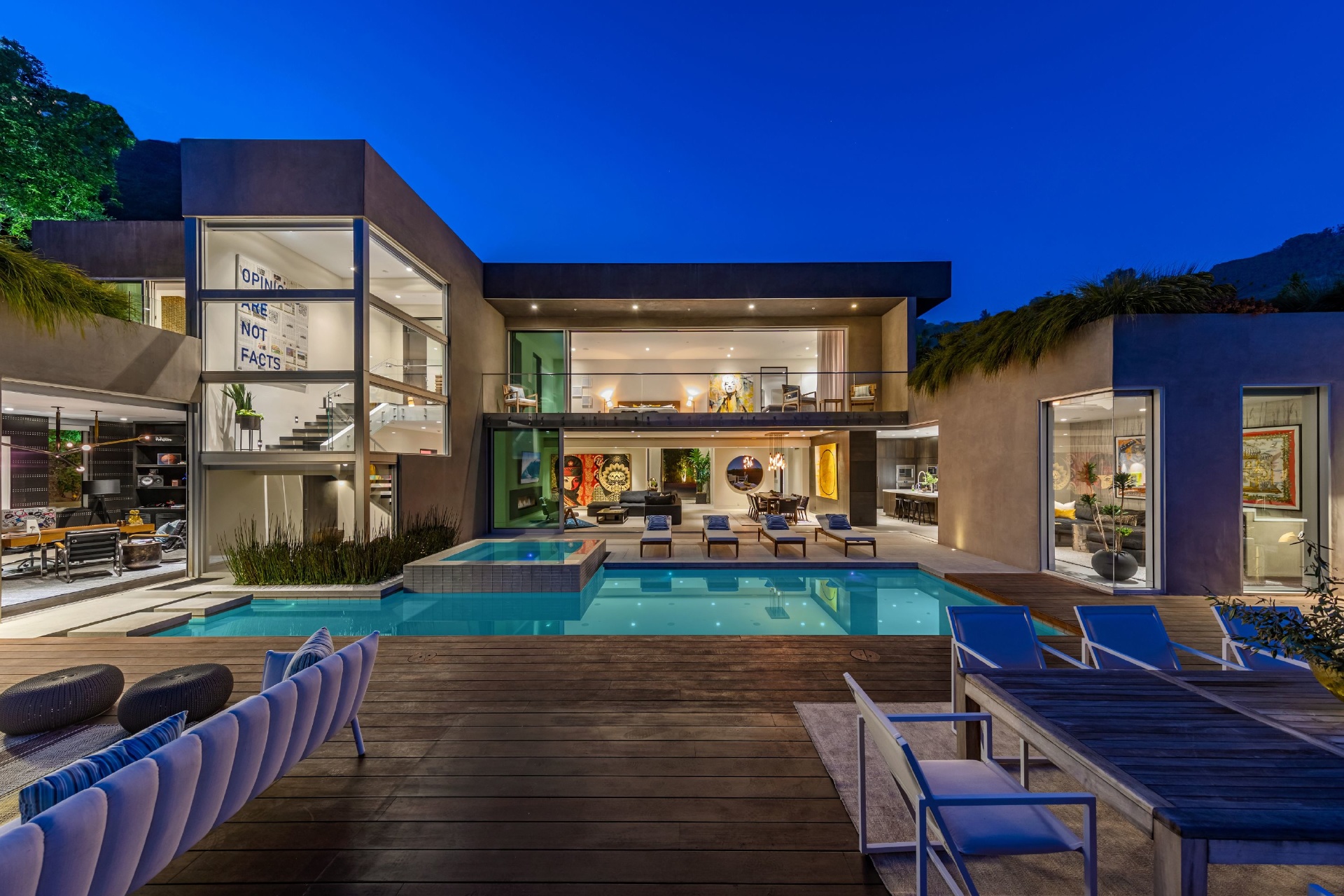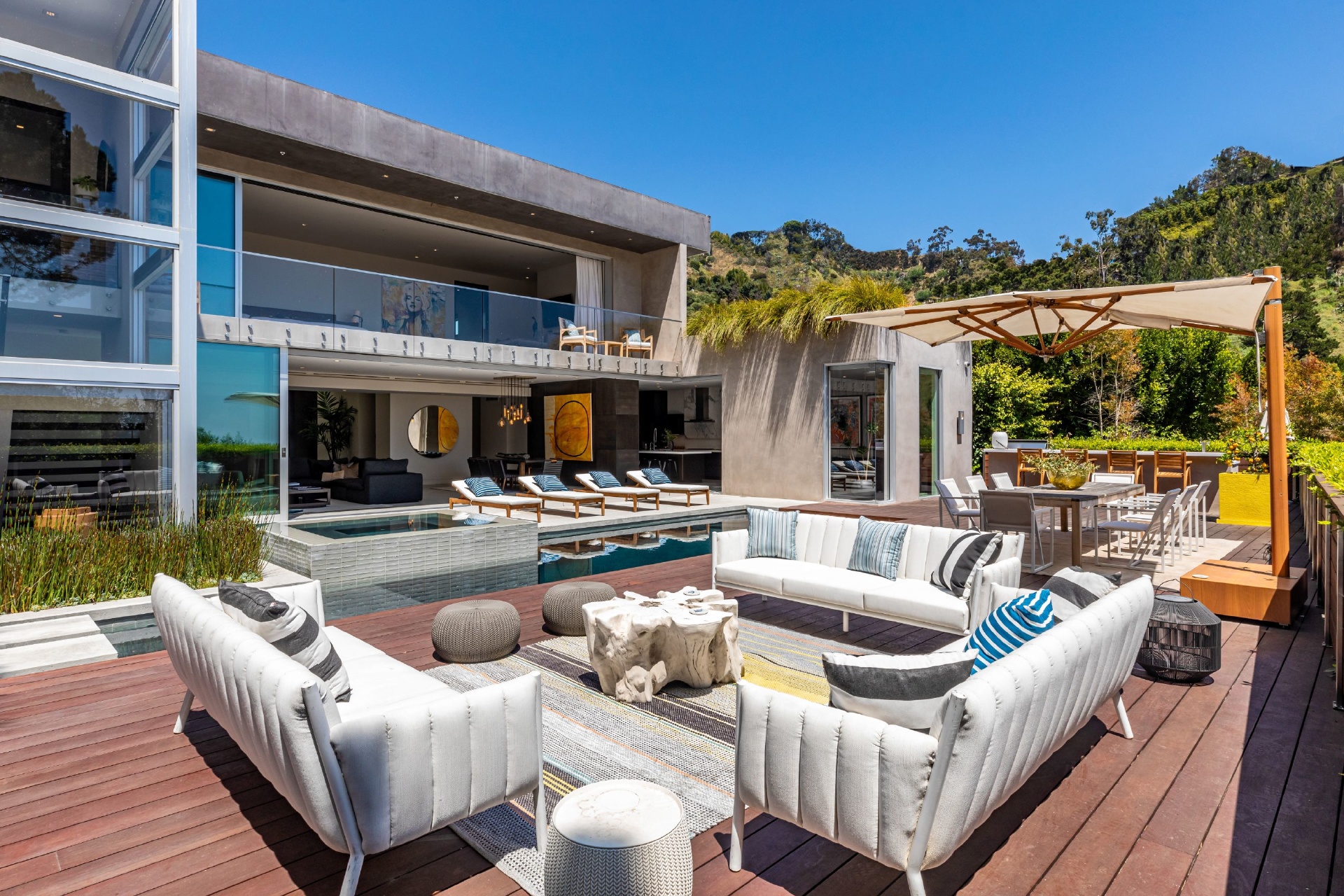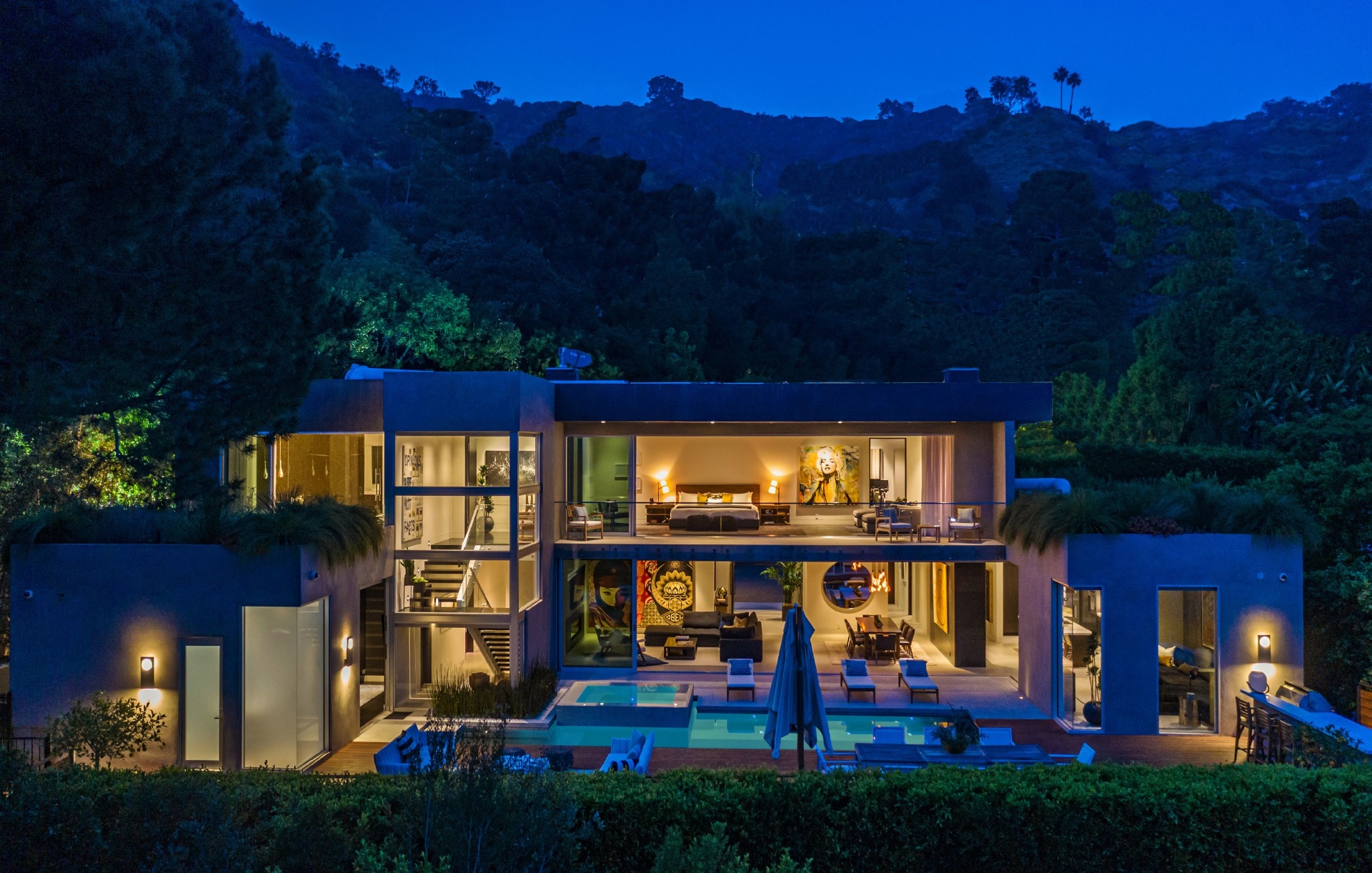 Enter 1709 Rising Glen: A modern estate set in the hills just above Sunset Plaza & the world famous Sunset Strip, minutes from the best shopping, dining & entertainment that LA has to offer. Enter a private & gated driveway to oversized motor court w/room for 10 cars & two-car garage. Step through the front door to a large open concept floor plan living & dining room w/honed limestone floors & Fleetwood glass sliders that open to the pool & entertainment deck. This is quintessential Southern California indoor/outdoor living at its finest. A sleek & modern, gourmet chef's kitchen includes top of the line appliances & adjoining lounge area. A modern floating staircase leads to the second story luxury master suite w/city and canyon views & includes a massive walk in closet, oversized bathroom, 2 private balconies & gym. Lower level includes 4 additional guest suites, a recording studio & large grassy yard/dog run. Experience the pinnacle of style & design and live among the stars.