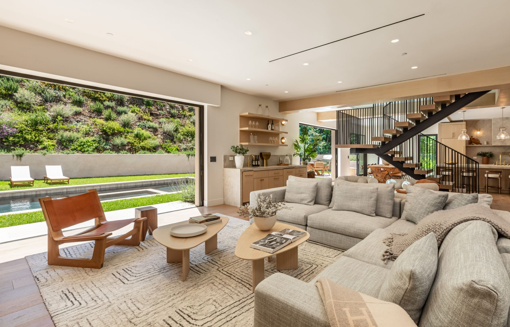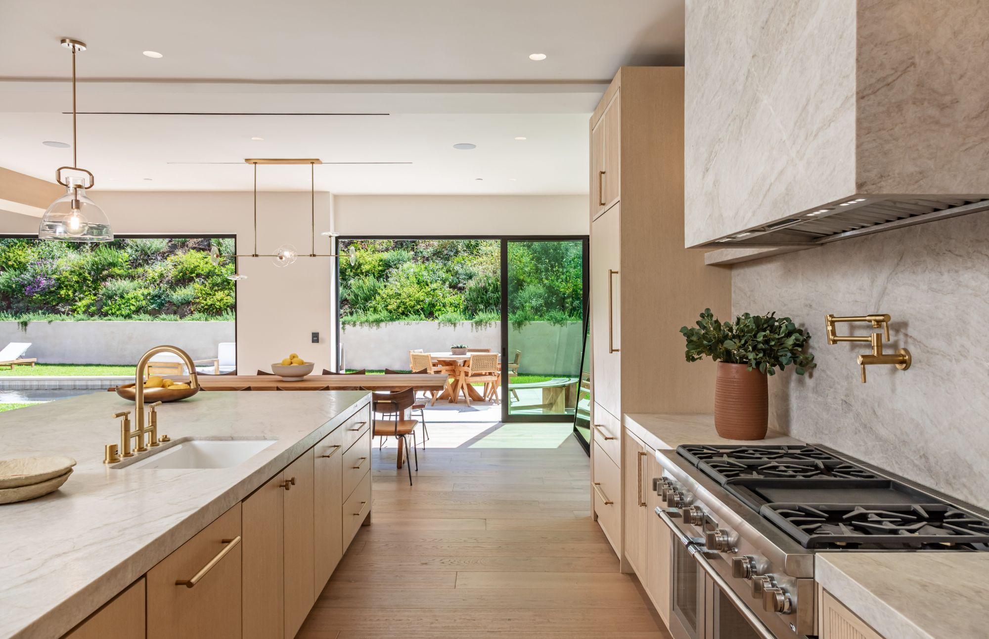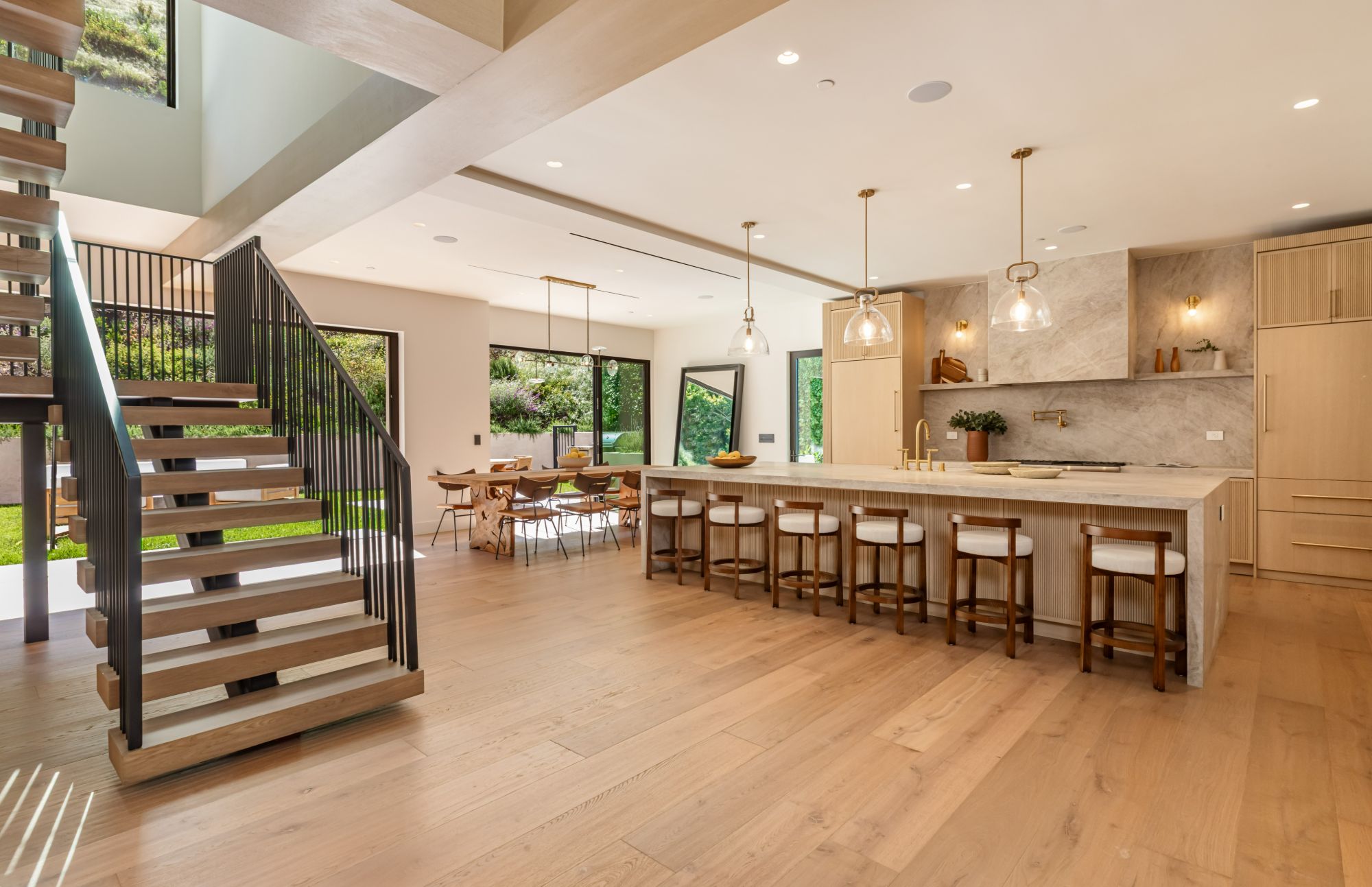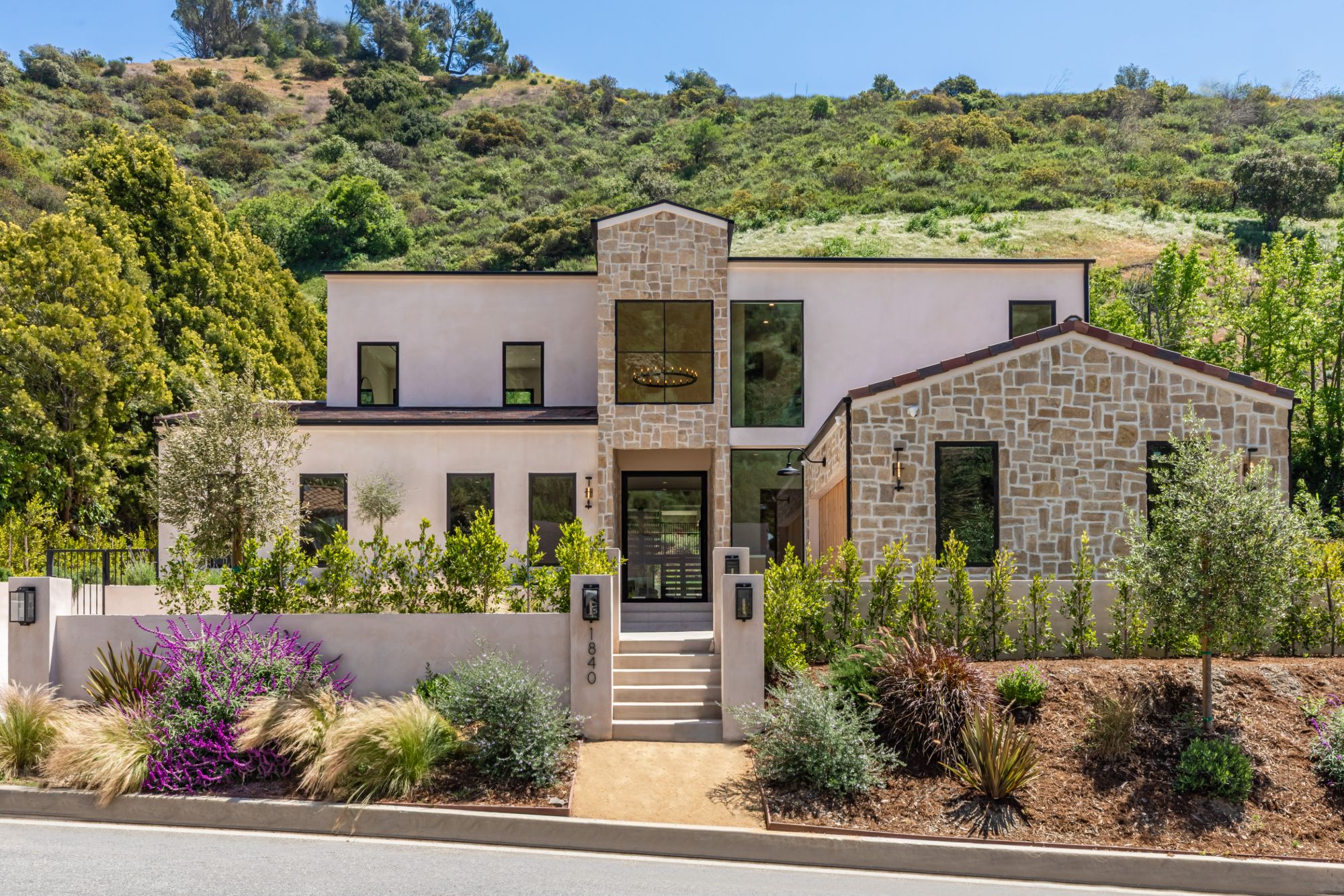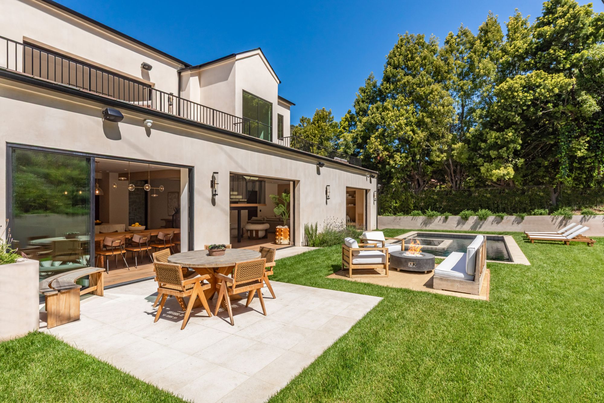 Discover ultimate luxury in this newly built European transitional home, where impeccable craftsmanship, custom finishes, and sophisticated design converge to create a truly exceptional residence. From the moment you enter through the statement pivoting front door, you're welcomed into a bright, airy space thoughtfully designed for both entertaining and everyday living. Expansive Fleetwood floor-to-ceiling pocket doors seamlessly blend indoor and outdoor living, bathing the interior in natural light and inviting in tranquil canyon breezes. At the heart of the home, the chef's kitchen features a striking 12-foot Taj Mahal quartzite island, professional Thermador appliances, custom cabinetry, and a full butler's pantry with a double oven, perfectly suited for culinary excellence. The open floorplan is unified by wide-plank European oak floors and a floating oak staircase, enhancing both flow and functionality. Four spacious en suite bedrooms offer custom walk-in closets and generous private decks with unobstructed canyon views. Set on a meticulously landscaped lot with mature olive trees, the exterior is designed for luxury and leisure. Enjoy multiple outdoor entertaining areas including a resort-style pool and spa, fully equipped outdoor kitchen, fire pit lounge, al fresco dining, and parking for up to six vehicles. A rare offering that harmonizes high-end materials, curated designer elements, and timeless elegance, this is more than a home, it's a lifestyle!