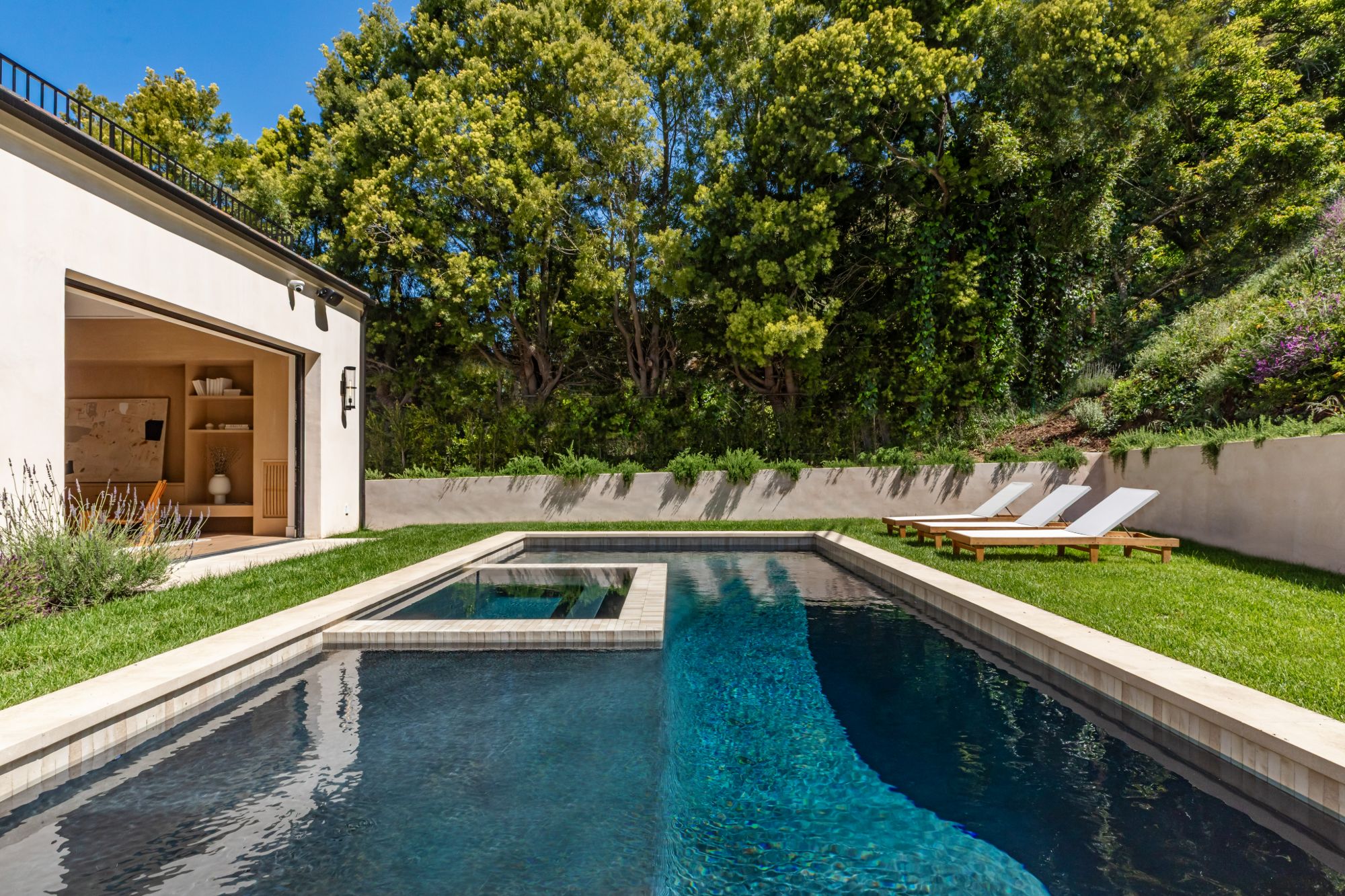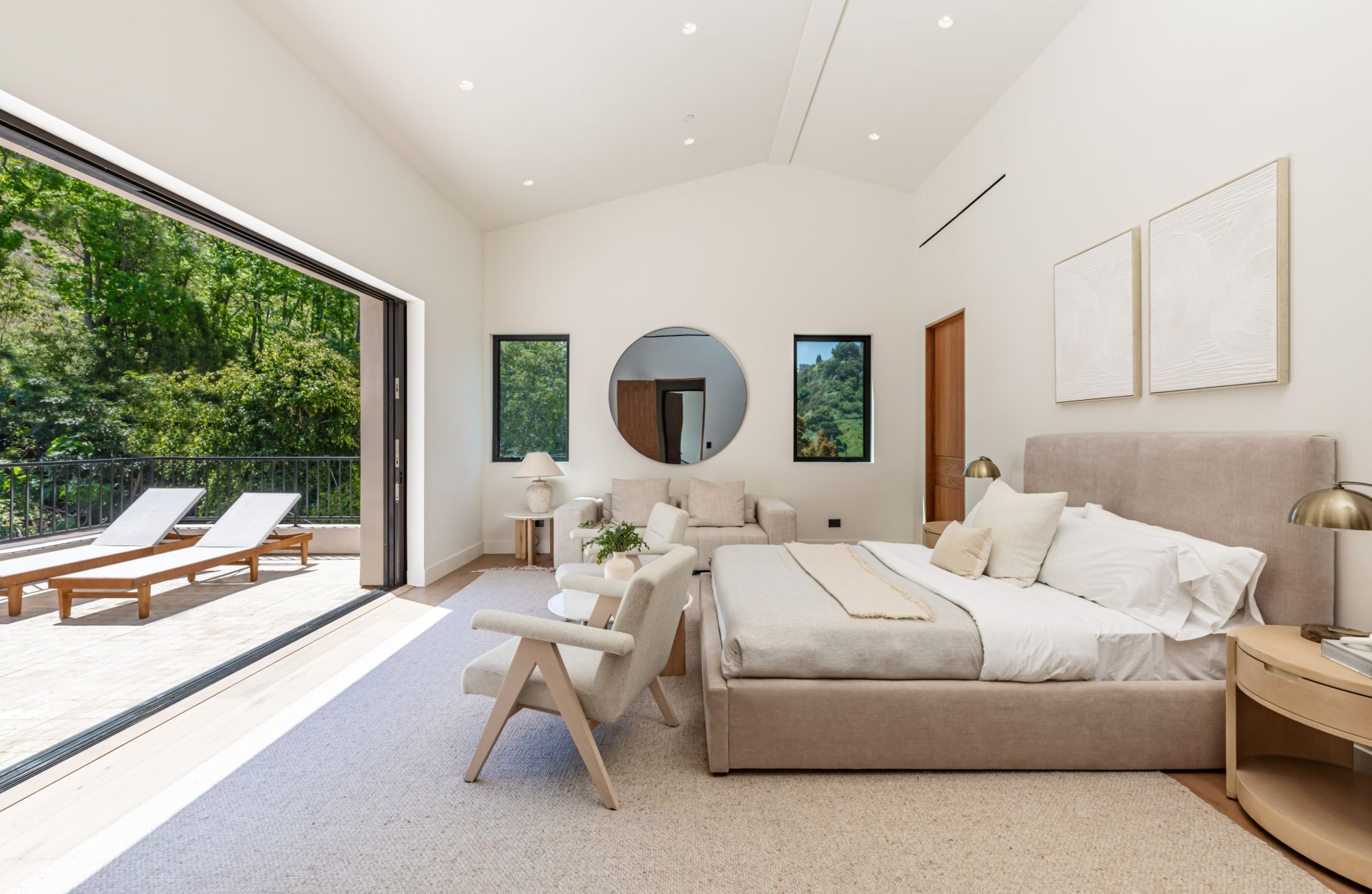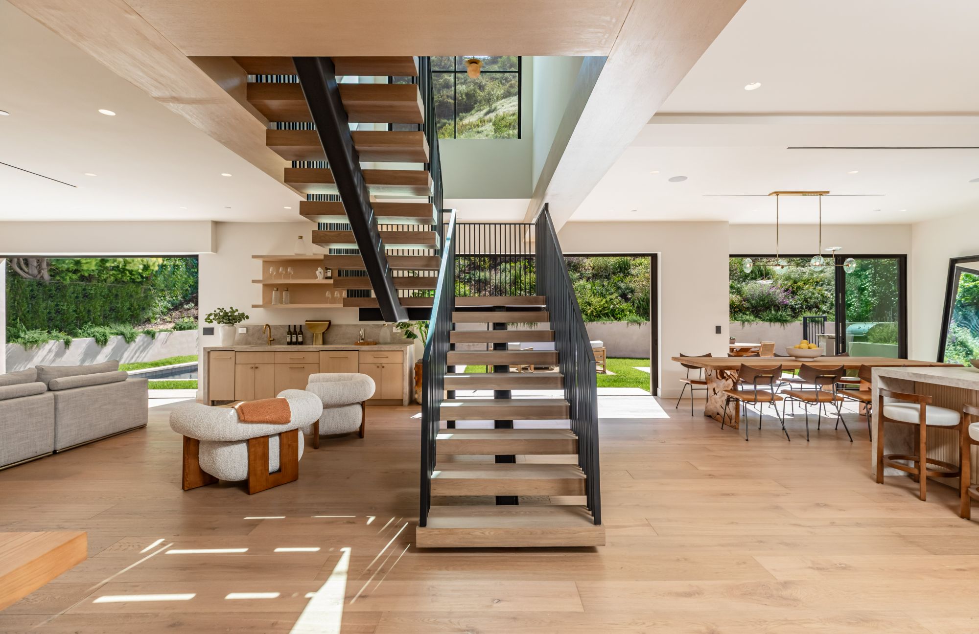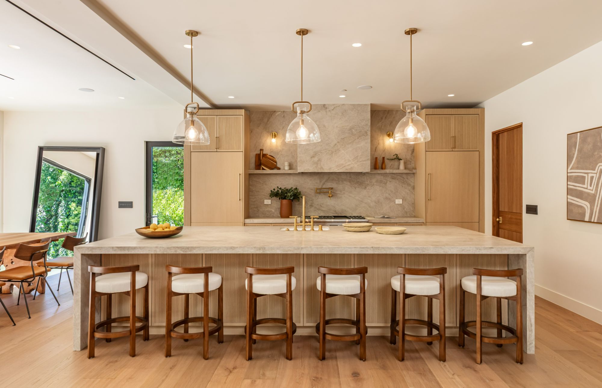 Discover ultimate luxury in this newly built European transitional home, where impeccable craftsmanship, custom finishes, and sophisticated design converge to create a truly exceptional residence. From the moment you enter through the statement pivoting front door, you're welcomed into a bright, airy space thoughtfully designed for both entertaining and everyday living. Expansive Fleetwood floor-to-ceiling pocket doors seamlessly blend indoor and outdoor living, bathing the interior in natural light and inviting in tranquil canyon breezes. At the heart of the home, the chef's kitchen features a striking 12-foot Taj Mahal quartzite island, professional Thermador appliances, custom cabinetry, and a full butler's pantry with a double oven, perfectly suited for culinary excellence. The open floorplan is unified by wide-plank European oak floors and a floating oak staircase, enhancing both flow and functionality. Four spacious en suite bedrooms offer custom walk-in closets and generous private decks with unobstructed canyon views. Set on a meticulously landscaped lot with mature olive trees, the exterior is designed for luxury and leisure. Enjoy multiple outdoor entertaining areas including a resort-style pool and spa, fully equipped outdoor kitchen, fire pit lounge, al fresco dining, and parking for up to six vehicles. A rare offering that harmonizes high-end materials, curated designer elements, and timeless elegance, this is more than a home, it's a lifestyle!