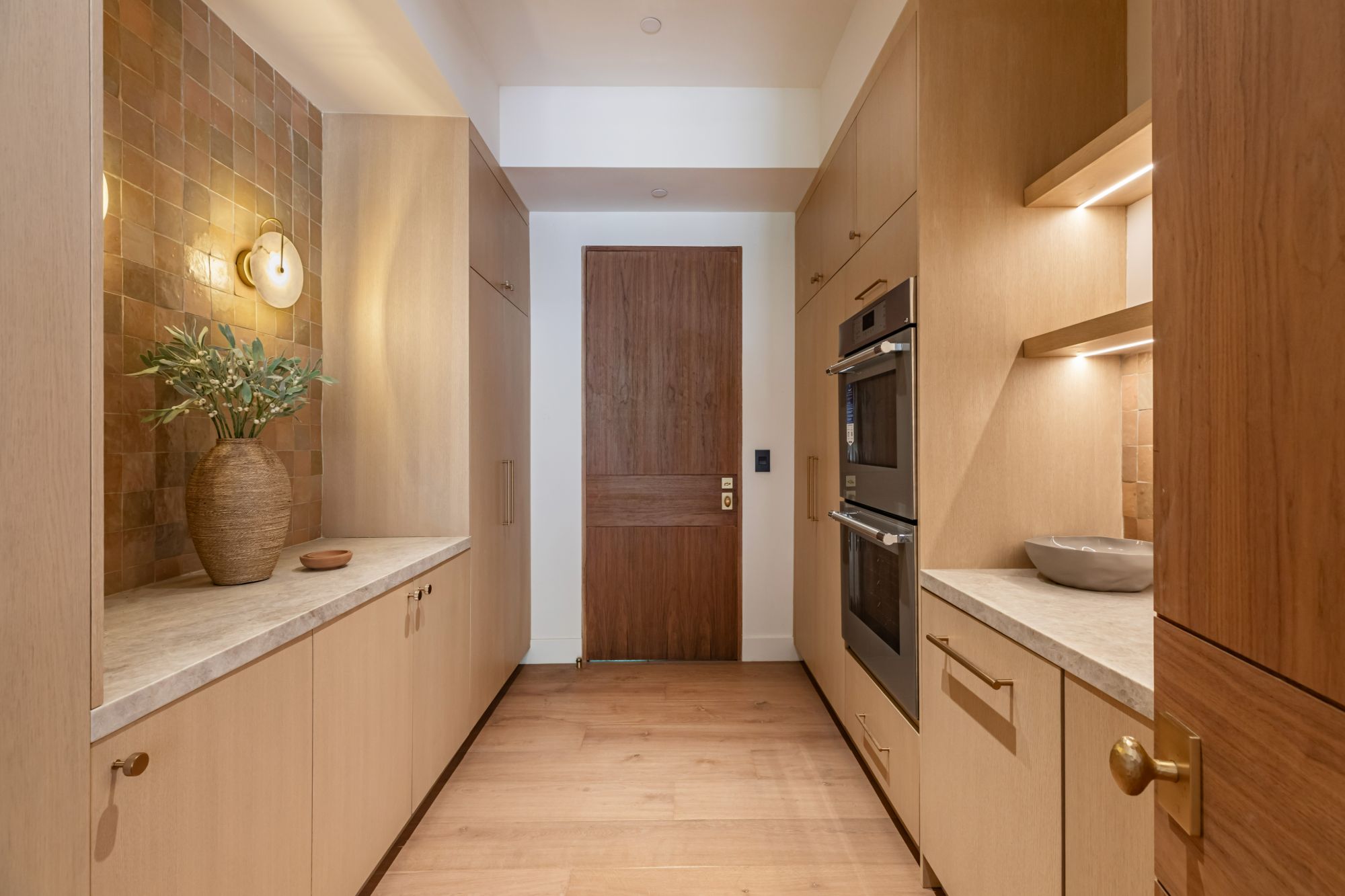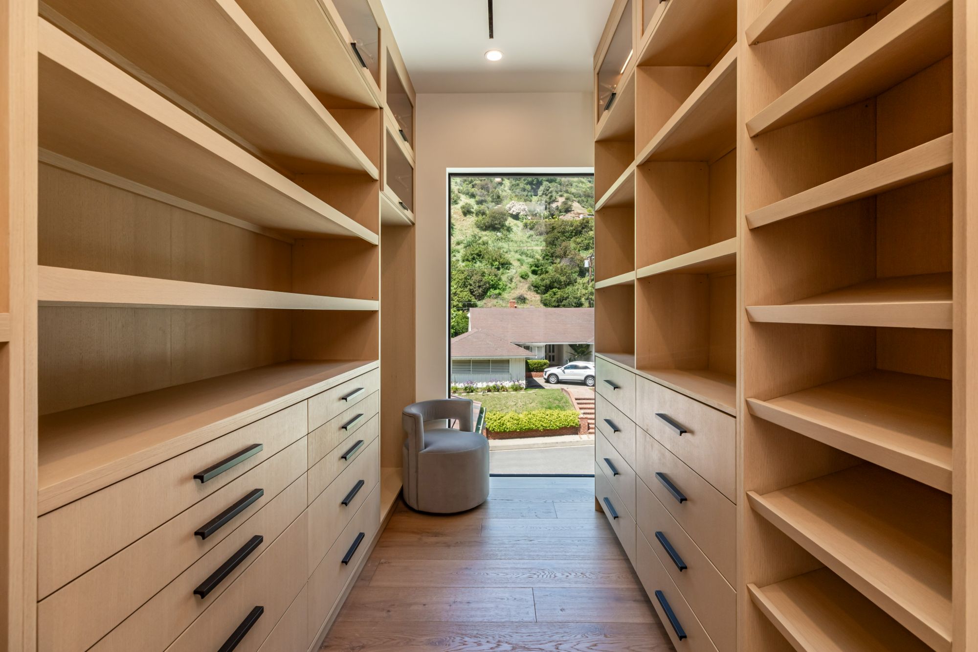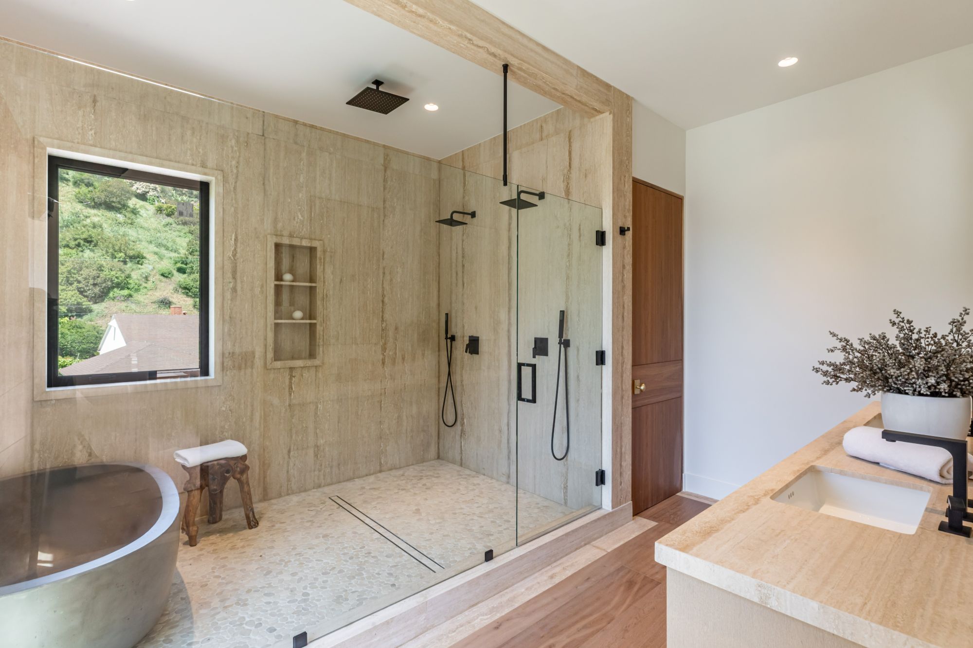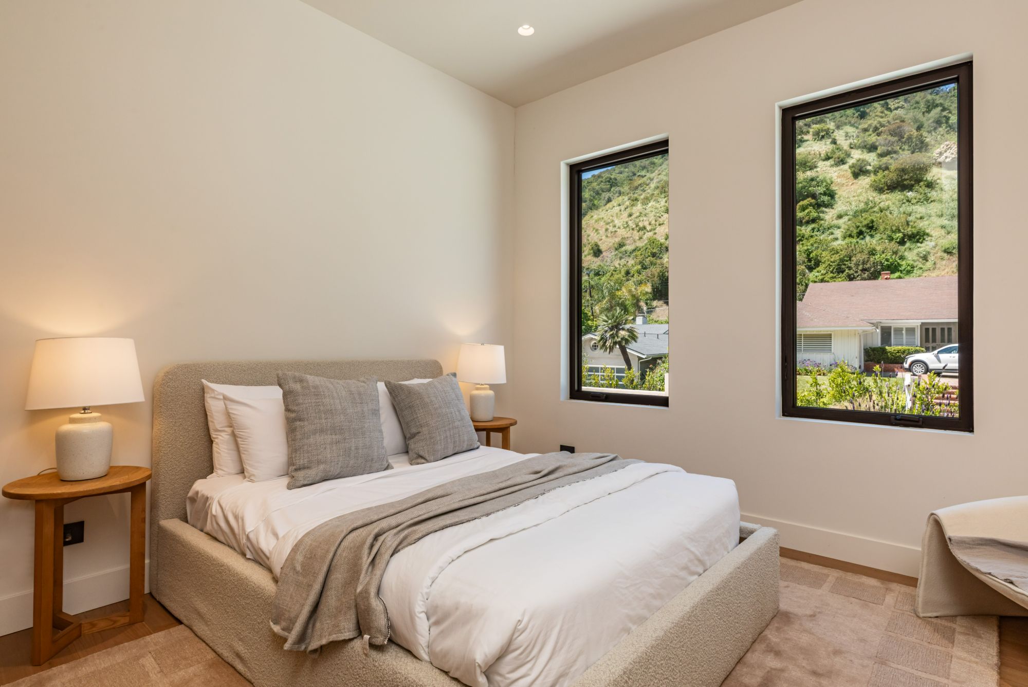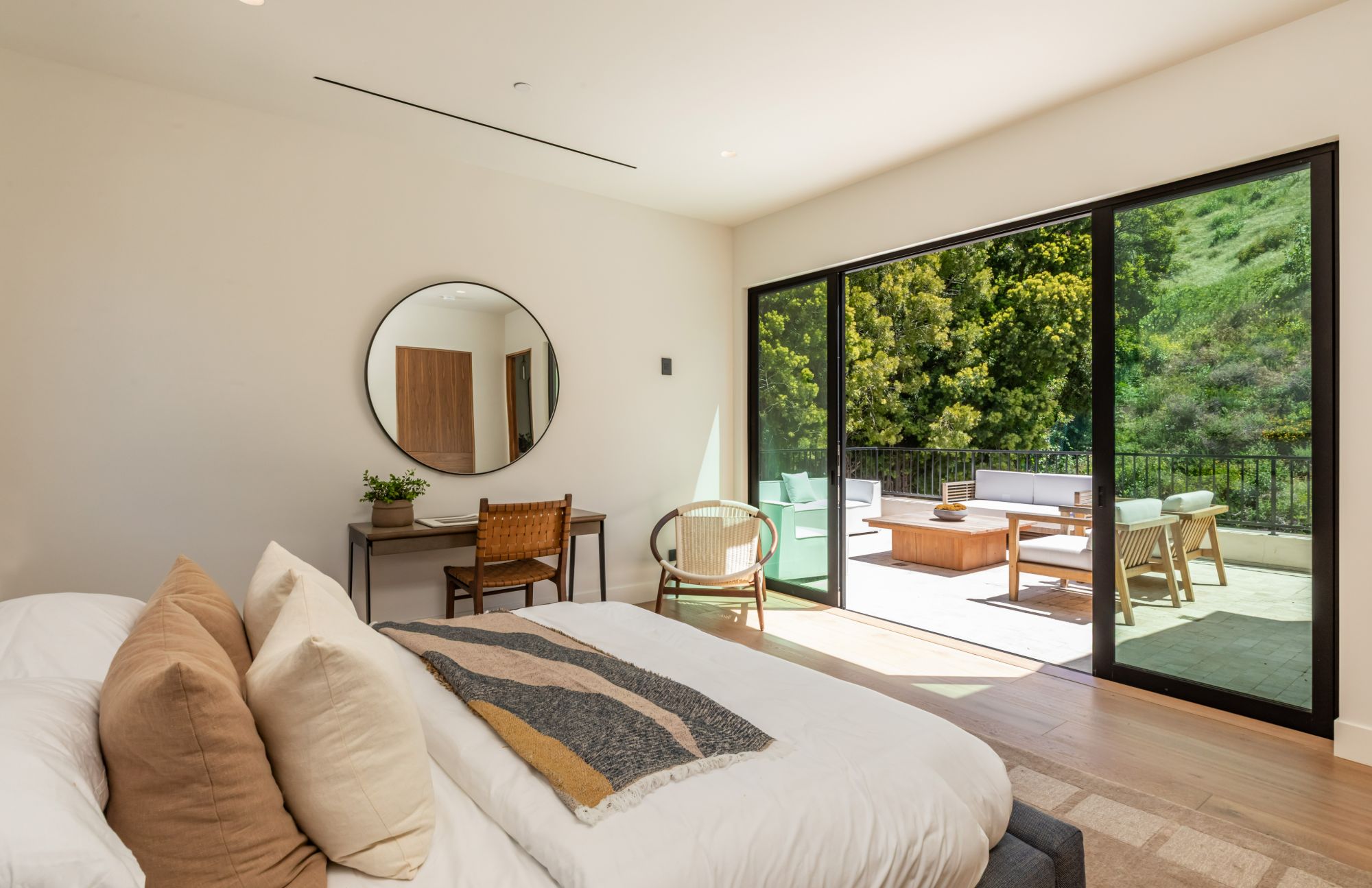 Discover ultimate luxury in this newly built European transitional home, where impeccable craftsmanship, custom finishes, and sophisticated design converge to create a truly exceptional residence. From the moment you enter through the statement pivoting front door, you're welcomed into a bright, airy space thoughtfully designed for both entertaining and everyday living. Expansive Fleetwood floor-to-ceiling pocket doors seamlessly blend indoor and outdoor living, bathing the interior in natural light and inviting in tranquil canyon breezes. At the heart of the home, the chef's kitchen features a striking 12-foot Taj Mahal quartzite island, professional Thermador appliances, custom cabinetry, and a full butler's pantry with a double oven, perfectly suited for culinary excellence. The open floorplan is unified by wide-plank European oak floors and a floating oak staircase, enhancing both flow and functionality. Four spacious en suite bedrooms offer custom walk-in closets and generous private decks with unobstructed canyon views. Set on a meticulously landscaped lot with mature olive trees, the exterior is designed for luxury and leisure. Enjoy multiple outdoor entertaining areas including a resort-style pool and spa, fully equipped outdoor kitchen, fire pit lounge, al fresco dining, and parking for up to six vehicles. A rare offering that harmonizes high-end materials, curated designer elements, and timeless elegance, this is more than a home, it's a lifestyle!