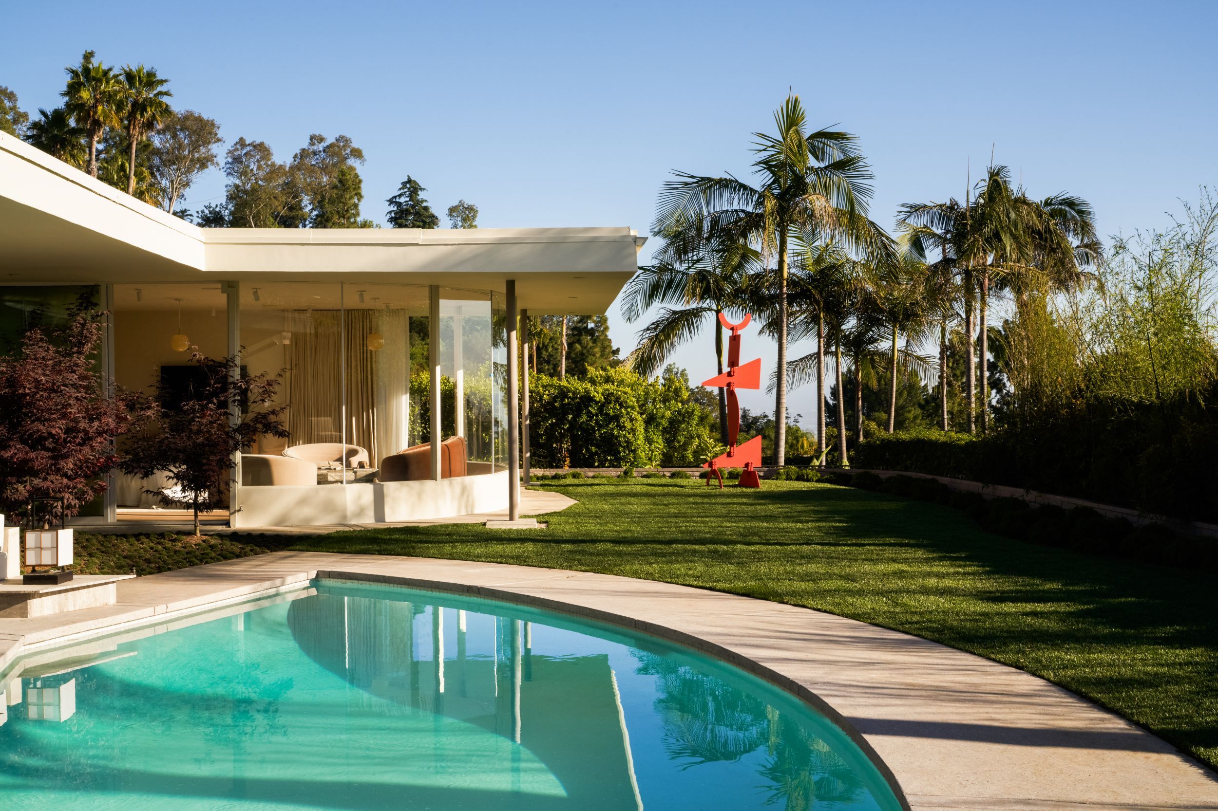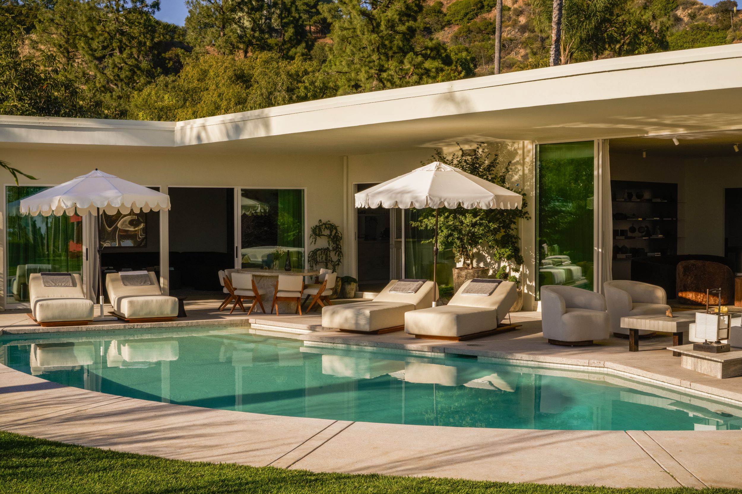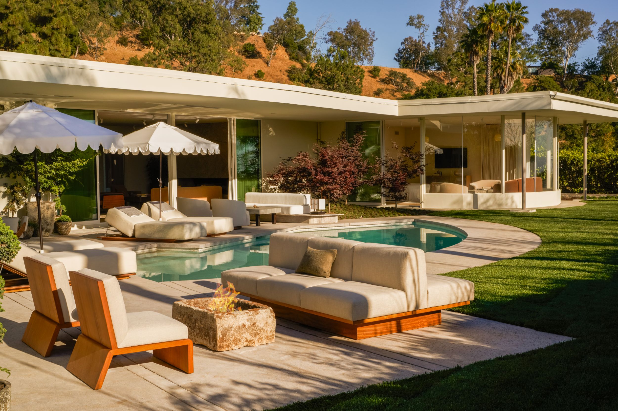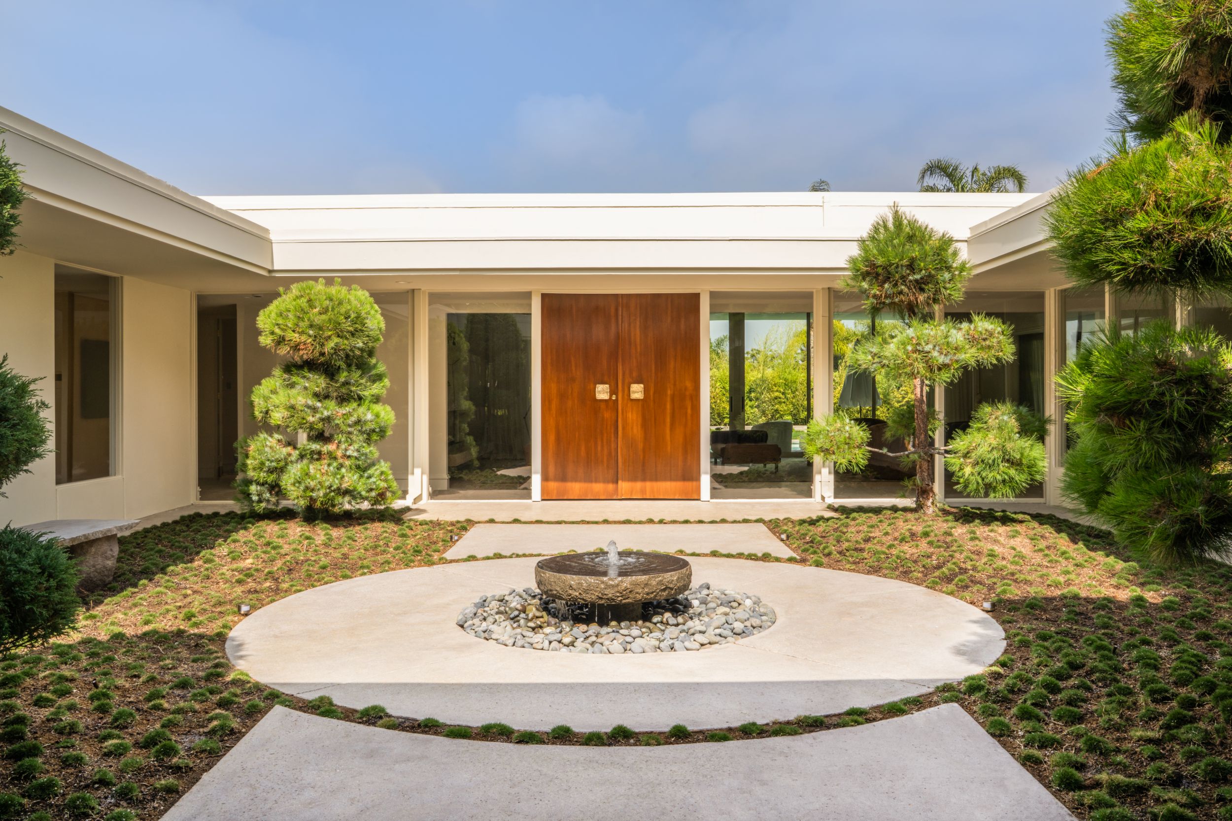 One of the best architectural mid-century homes built in Trousdale on a flat half-acre lot with city views of West LA, OSKLO House is an approx. 6,200 SF estate by Benton & Parks AIA, 1966, that has been completely reimagined by OSKLO. A dramatic courtyard with a sculptural fountain frames the front entrance to this fully furnished turn-key home. The living room, with oversized fireplace and floor-to-ceiling windows, creates a stunning entrance to this mid-century masterpiece. A collection of custom OSKLO furnishings, museum-level antiquities, and vintage pieces throughout the home perfectly accent the materials and finishes. No expense was spared. The kitchen is the epitome of Beverly Hills living with breakfast nook, butler's pantry, and a panel of windows that open to an outdoor garden. The unparalleled primary suite showcases nearly $1-million of stonework and offers wraparound windows that look out over the backyard with city lights in the distance. A long hallway overlooks the Japanese-inspired atrium and leads to 3 ensuite bedrooms. An additional ensuite bedroom near the kitchen as well as a pool bath near the outdoor cabana make this the perfect home for entertaining/hosting family and guests. Outside the angular pool pavilion features multiple gathering areas, a swimming pool, firepit, and outdoor bar. This home is the epitome of Trousdale mid-century indoor/outdoor living.