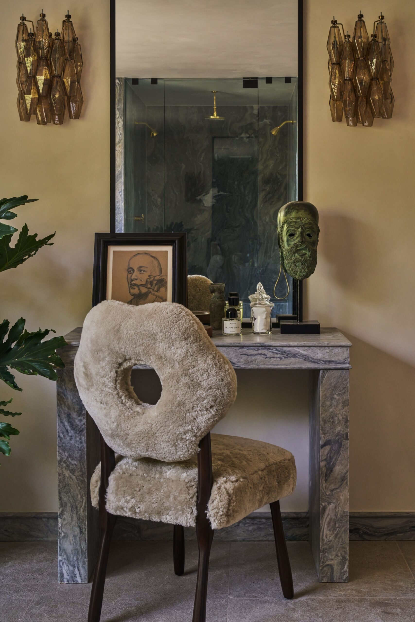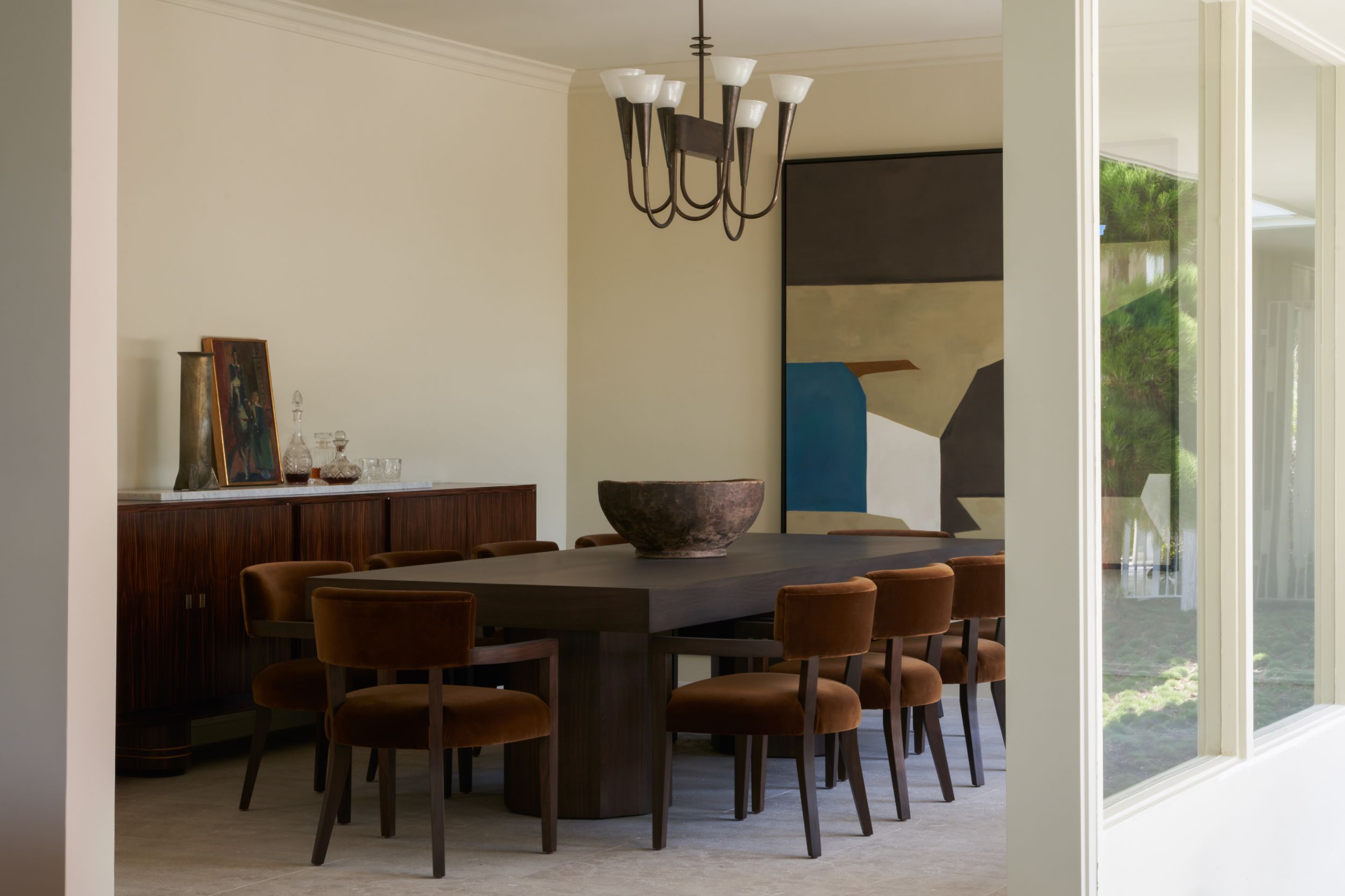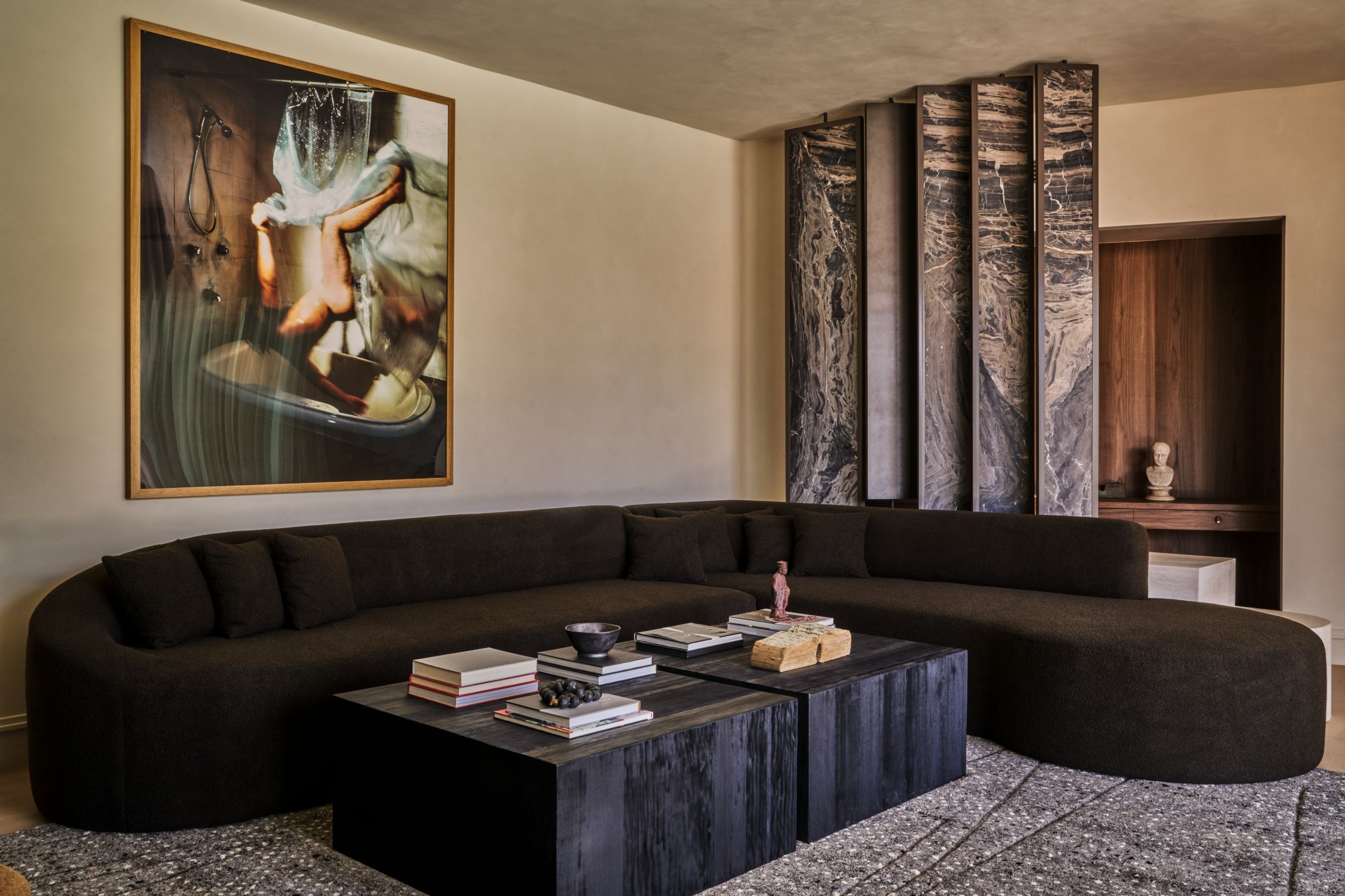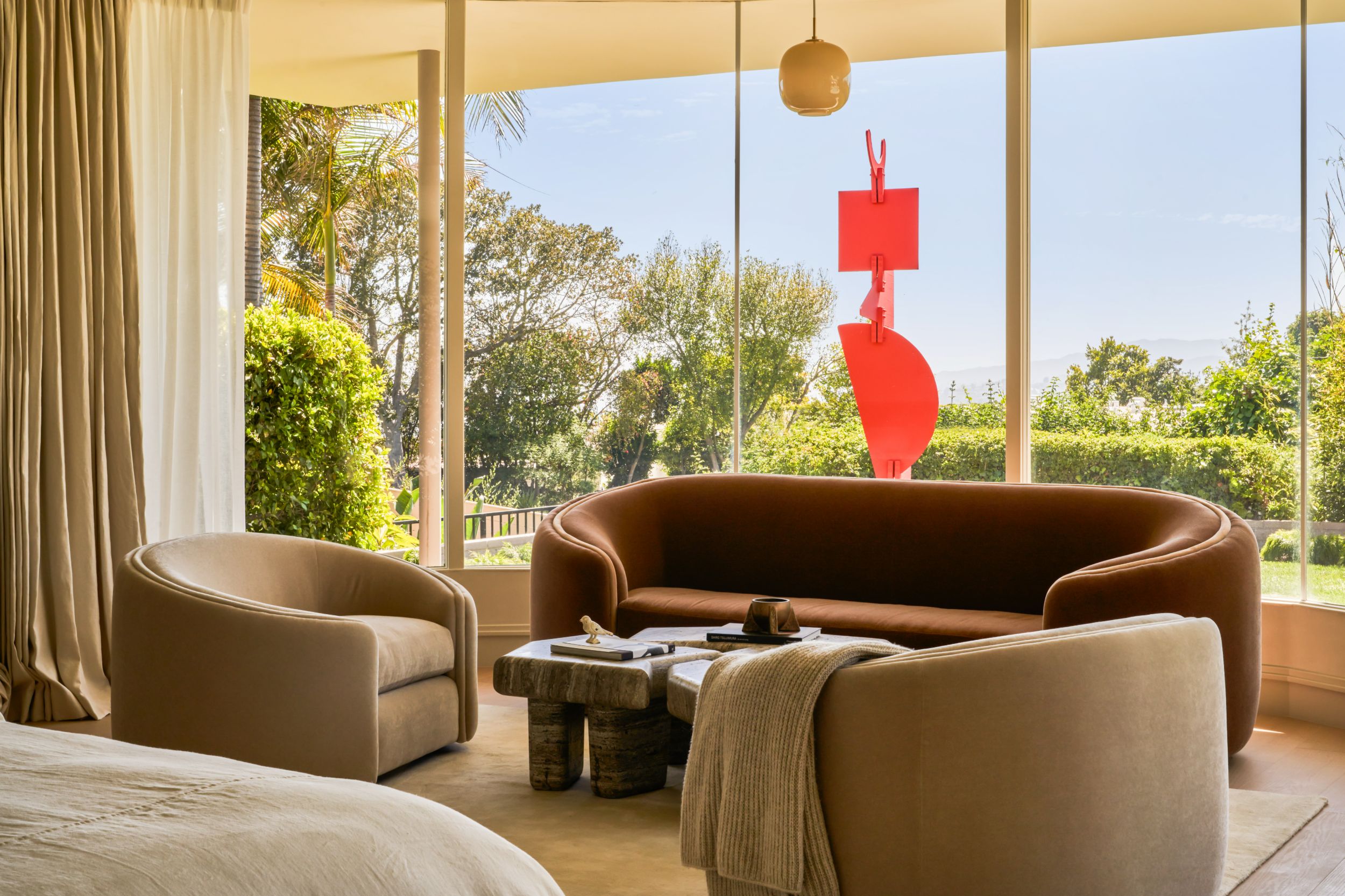 One of the best architectural mid-century homes built in Trousdale on a flat half-acre lot with city views of West LA, OSKLO House is an approx. 6,200 SF estate by Benton & Parks AIA, 1966, that has been completely reimagined by OSKLO. A dramatic courtyard with a sculptural fountain frames the front entrance to this fully furnished turn-key home. The living room, with oversized fireplace and floor-to-ceiling windows, creates a stunning entrance to this mid-century masterpiece. A collection of custom OSKLO furnishings, museum-level antiquities, and vintage pieces throughout the home perfectly accent the materials and finishes. No expense was spared. The kitchen is the epitome of Beverly Hills living with breakfast nook, butler's pantry, and a panel of windows that open to an outdoor garden. The unparalleled primary suite showcases nearly $1-million of stonework and offers wraparound windows that look out over the backyard with city lights in the distance. A long hallway overlooks the Japanese-inspired atrium and leads to 3 ensuite bedrooms. An additional ensuite bedroom near the kitchen as well as a pool bath near the outdoor cabana make this the perfect home for entertaining/hosting family and guests. Outside the angular pool pavilion features multiple gathering areas, a swimming pool, firepit, and outdoor bar. This home is the epitome of Trousdale mid-century indoor/outdoor living.
