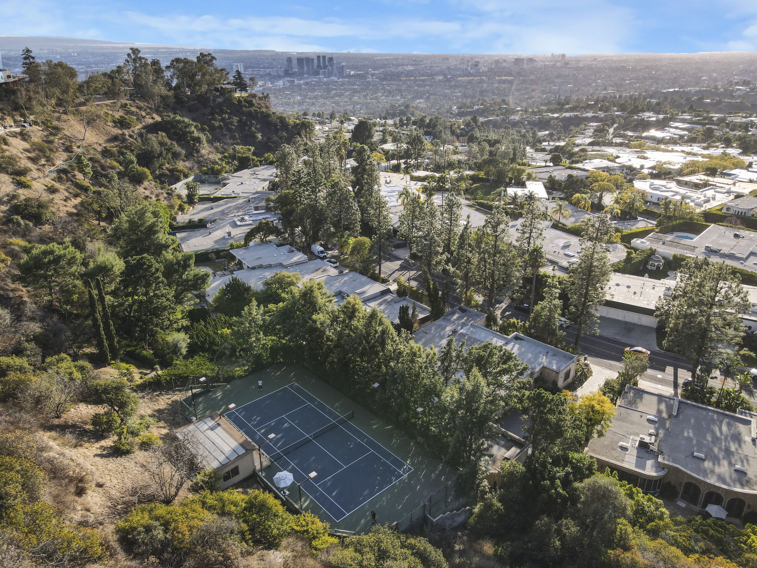Rare Tuscan Villa with Tennis Court in Prestigious Trousdale Estates. This exceptional 0.66 acre property combines the timeless elegance of a single-story Tuscan villa with the rare luxury of an oversized professional-grade tennis court. The 5,081 sq. ft. At the heart of this estate is an exquisite single-story Tuscan villa spanning 5,081 sq. ft., blending timeless Mediterranean charm with modern sophistication. The home boasts 4 ensuite bedrooms, 6 bathrooms, and a welcoming gated driveway leading to a 3-car garage with ample additional parking. Upon entering, you are greeted by a grand foyer adorned with intricate crown molding and sparkling chandeliers, setting a tone of elegance and refinement.The open floor plan, complemented by French doors throughout, invites natural light into the home, enhancing its seamless flow and bright, airy ambiance. The state-of-the-art chef's kitchen, outfitted with top-tier Thermidor appliances, features 1,200 sq. ft. of marble and limestone countertops, centered around a striking blue Caesar stone island. Adjacent to the kitchen, a formal dining room, wet bar, and wine cellar make this home a true entertainer's dream.The luxurious master suite offers the ultimate retreat, complete with an office overlooking the backyard and pool, as well as separate his-and-her walk-in closets. The spa-like bathrooms feature double sinks, a steam sauna, a vanity, and serene garden views. Two additional spacious ensuite bedrooms and a guest suite with direct access to the pool and backyard ensure comfort for family and guests alike.The outdoor grounds are nothing short of spectacular. A sparkling pool, sundeck, and lush landscaping provide a serene escape, Perfect for both avid tennis enthusiasts and large-scale entertaining, the court is detached from the main house, ensuring privacy and versatility. With a fitness center perched above, it offers a space for recreation and exercise without disrupting the serenity of the main residence. This multifunctional property epitomizes the best of Beverly Hills luxury living, offering privacy, elegance, and convenience, just moments from Rodeo Drive and world-class dining and shopping.