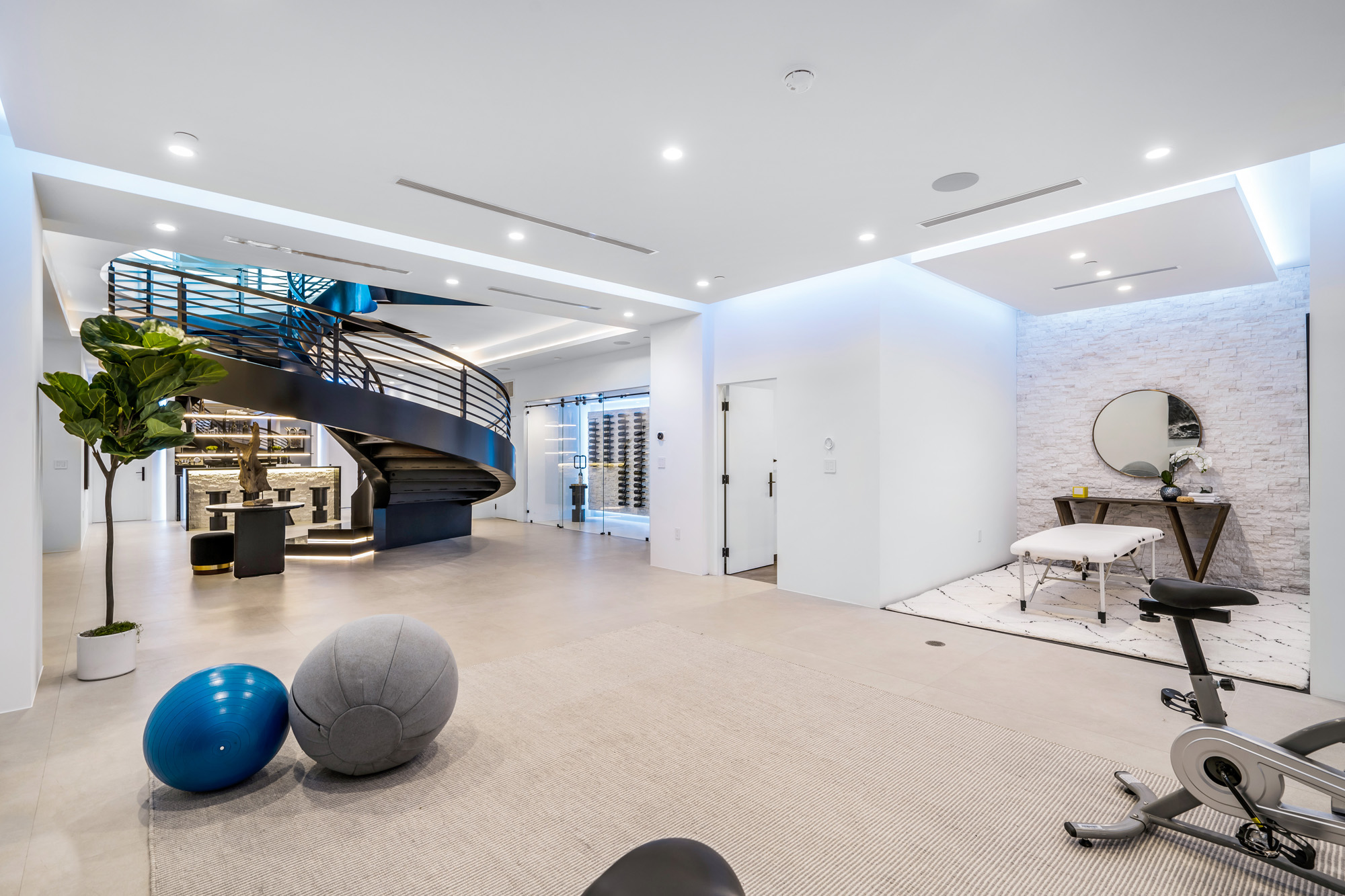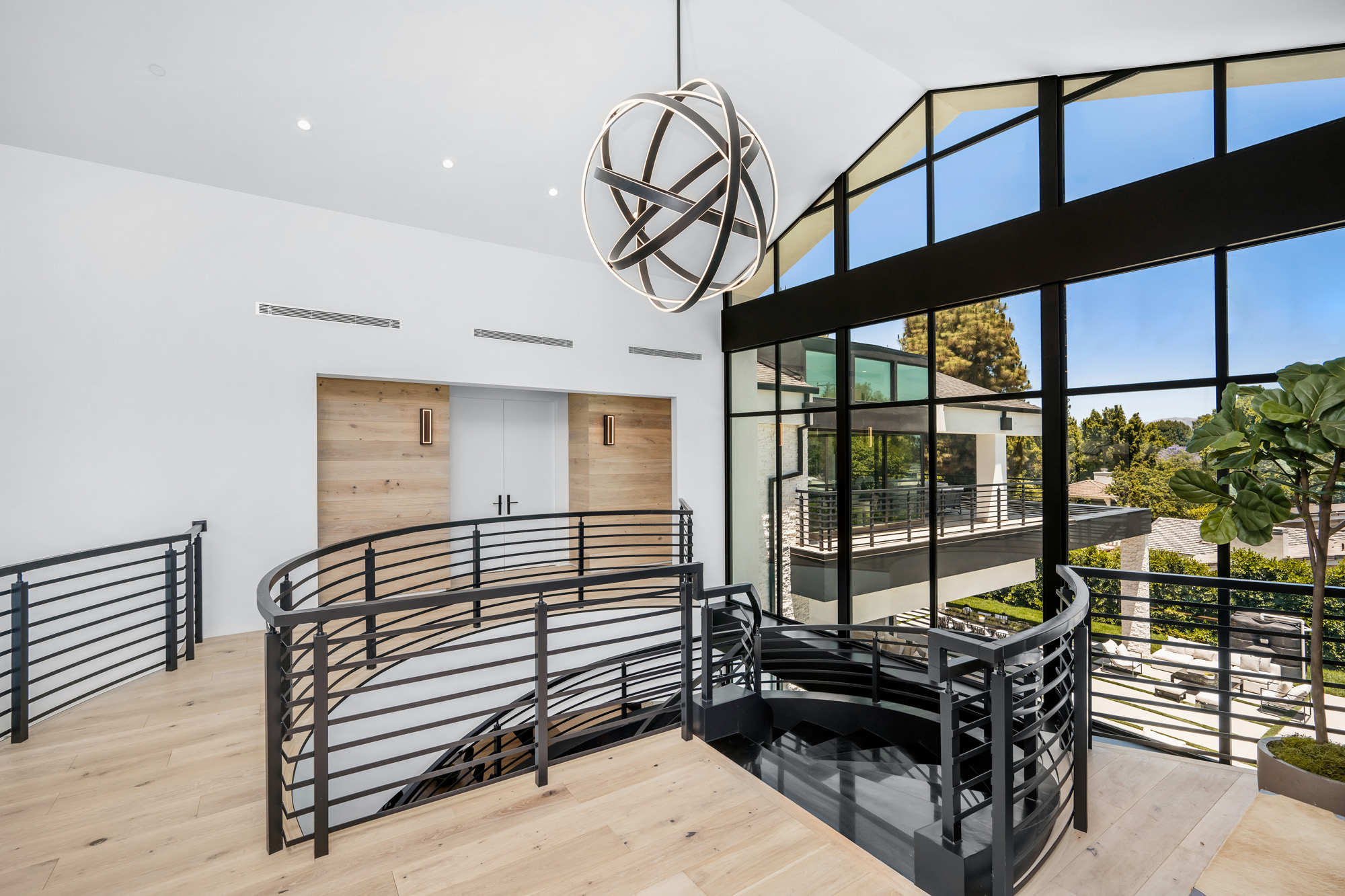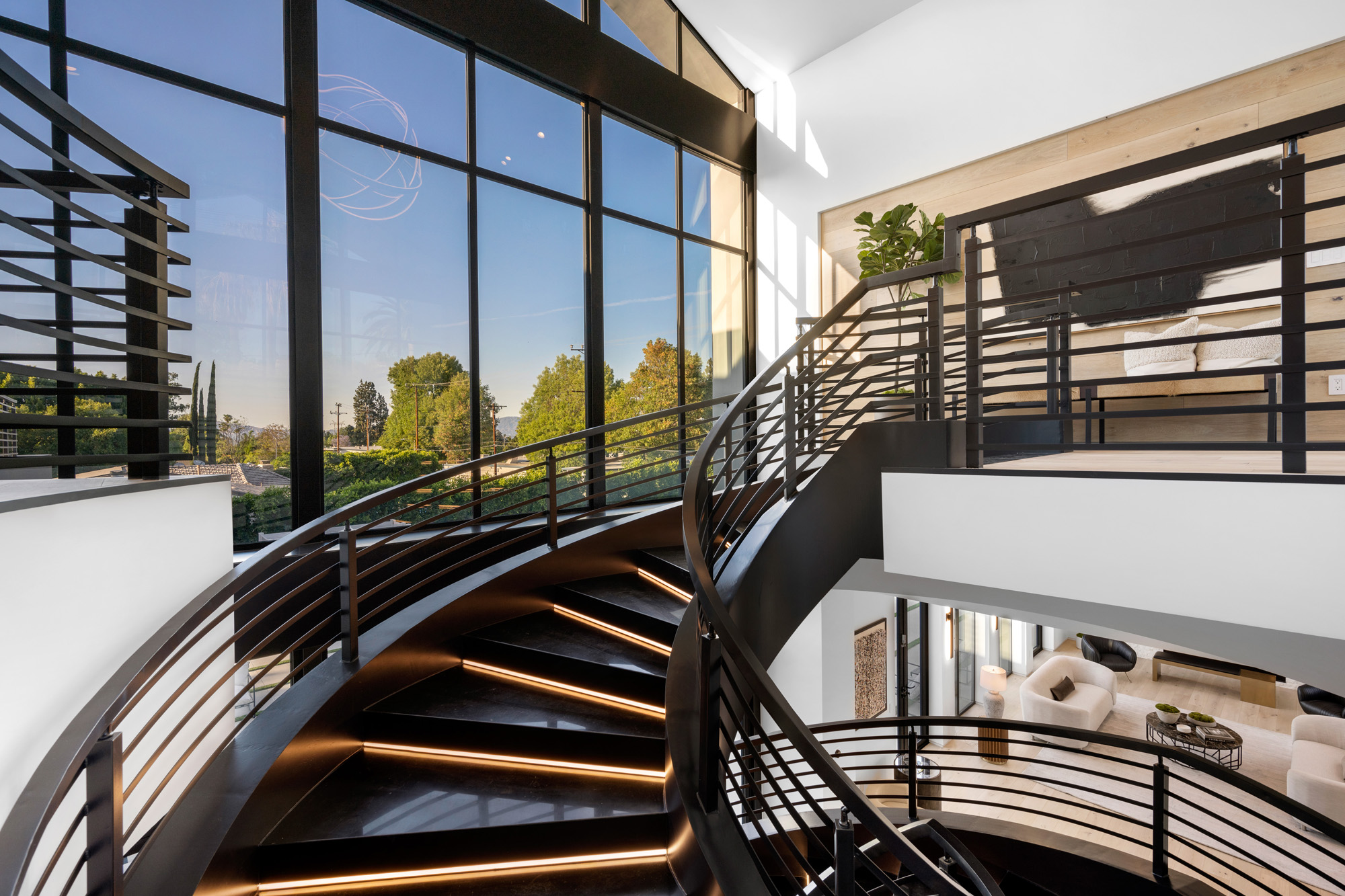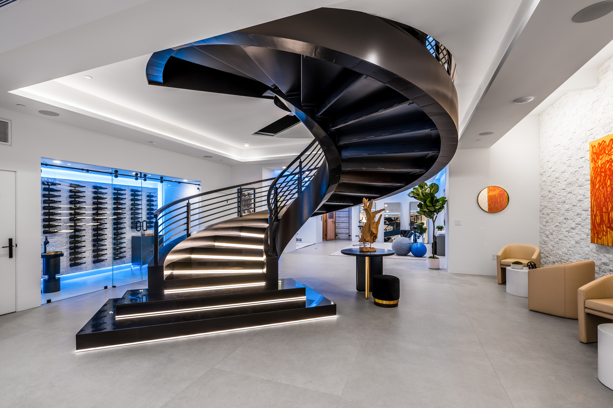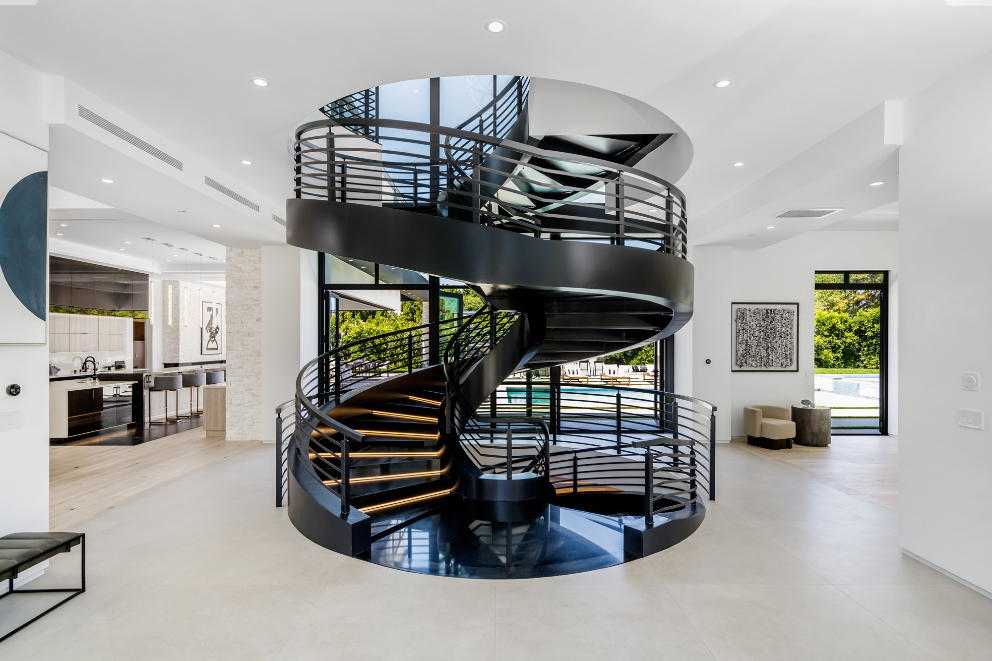 An architectural masterpiece and arguably one of the most unique and special properties in all of Los Angeles. The centerpiece of this incredible property is a 60 ton floating and spiraling staircase that rises from the 2,000 sq.ft. basement, to the second floor. Absolutely magnificent design, featuring a beautiful 30 foot plus glass entry that flows through to another 30 foot plus rear glass facade which leads to the backyard. The property sits on over half an acre and features a builtin BBQ, sunken fire pit, half basketball court with NBA 3 point line, and lots of fresh grass throughout. The circular driveway gracefully flows from one side to another providing enough space to park plenty of cars. The aforementioned basement features a theater, bar, wine cellar, lounge, and wellness center with dry sauna. A must see!!!!