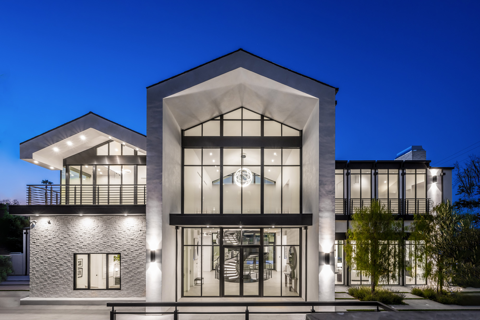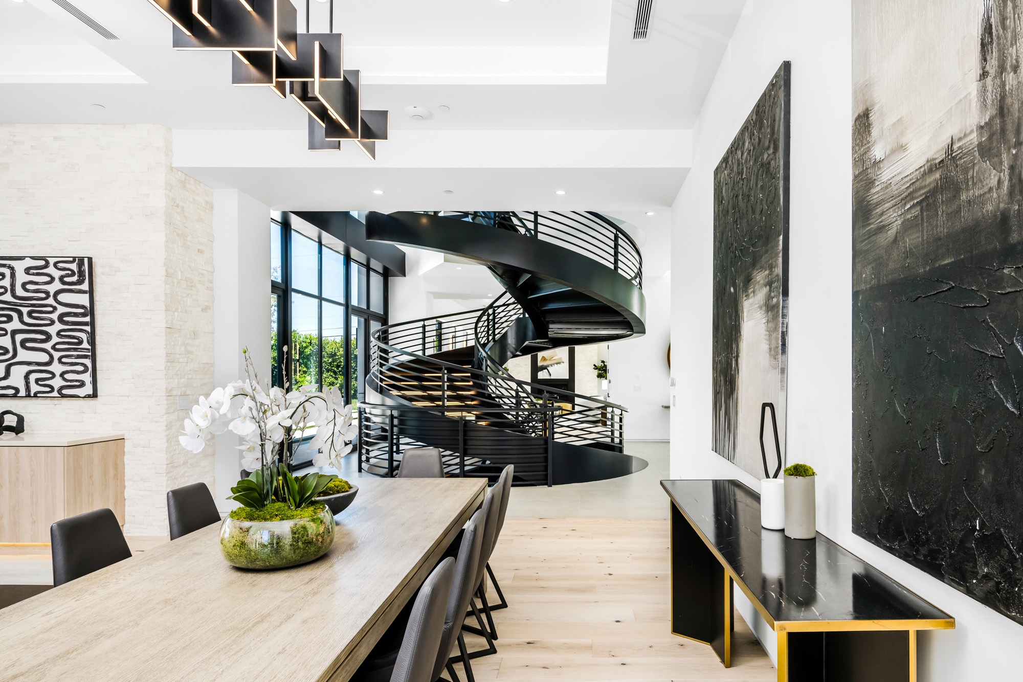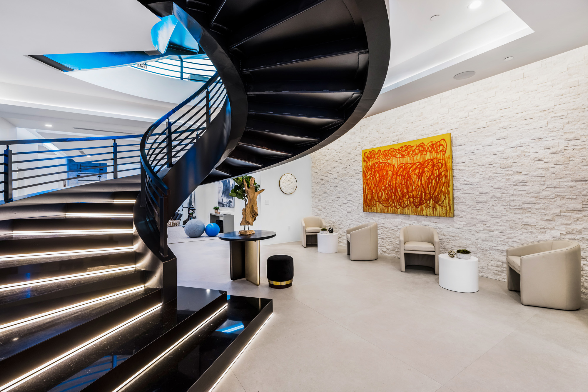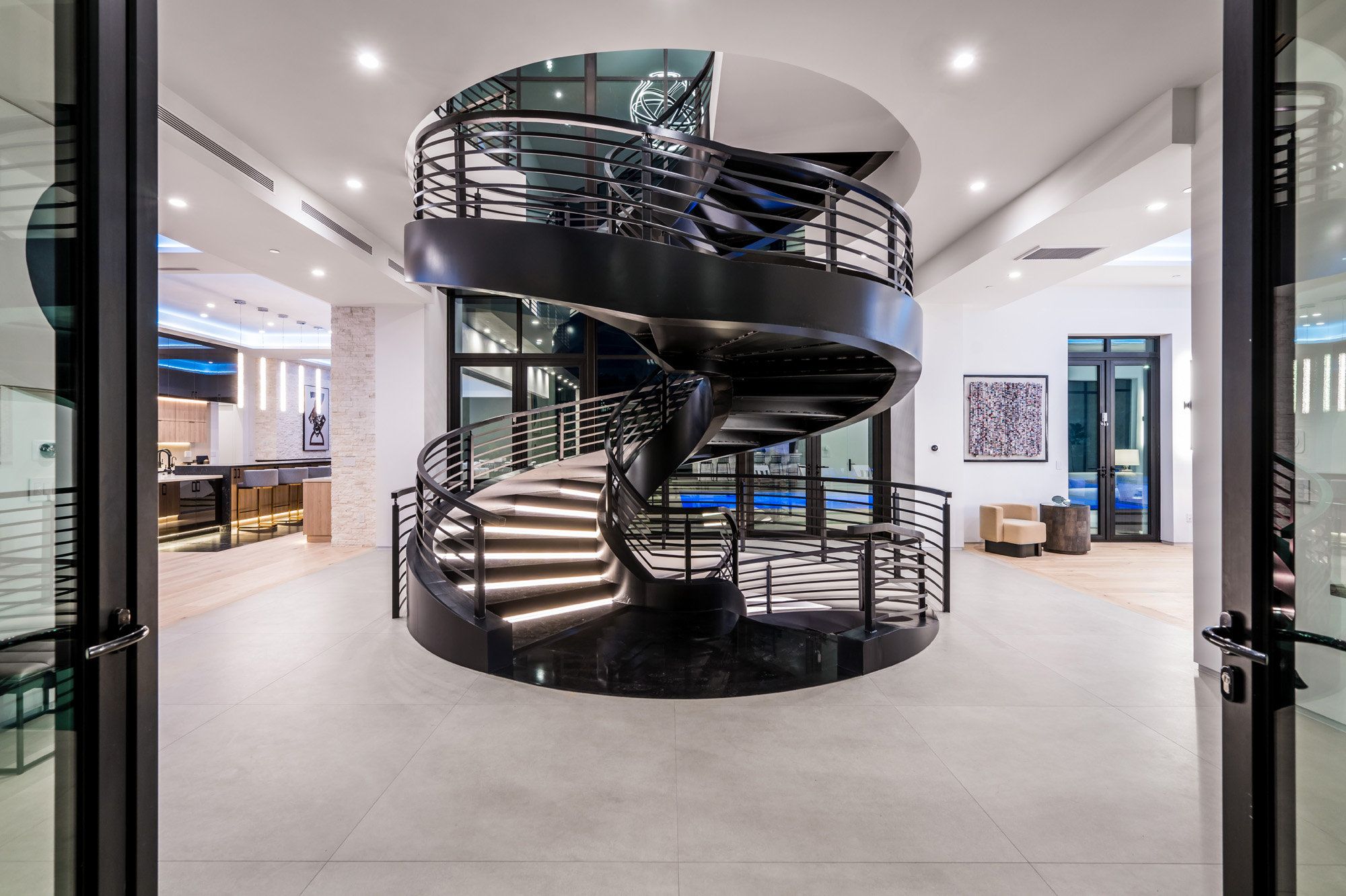 An architectural masterpiece and arguably one of the most unique and special properties in all of Los Angeles. The centerpiece of this incredible property is a 60 ton floating and spiraling staircase that rises from the 2,000 sq.ft. basement, to the second floor. Absolutely magnificent design, featuring a beautiful 30 foot plus glass entry that flows through to another 30 foot plus rear glass facade which leads to the backyard. The property sits on over half an acre and features a builtin BBQ, sunken fire pit, half basketball court with NBA 3 point line, and lots of fresh grass throughout. The circular driveway gracefully flows from one side to another providing enough space to park plenty of cars. The aforementioned basement features a theater, bar, wine cellar, lounge, and wellness center with dry sauna. A must see!!!!
