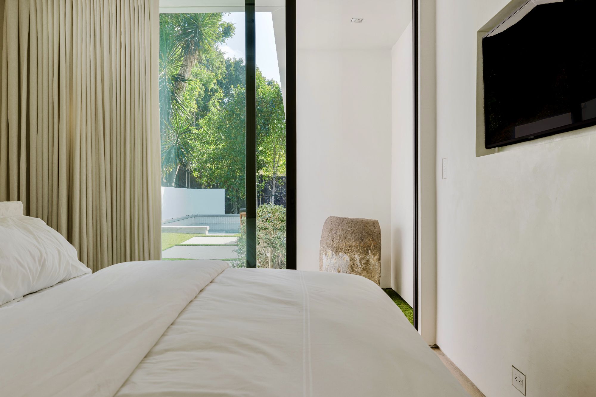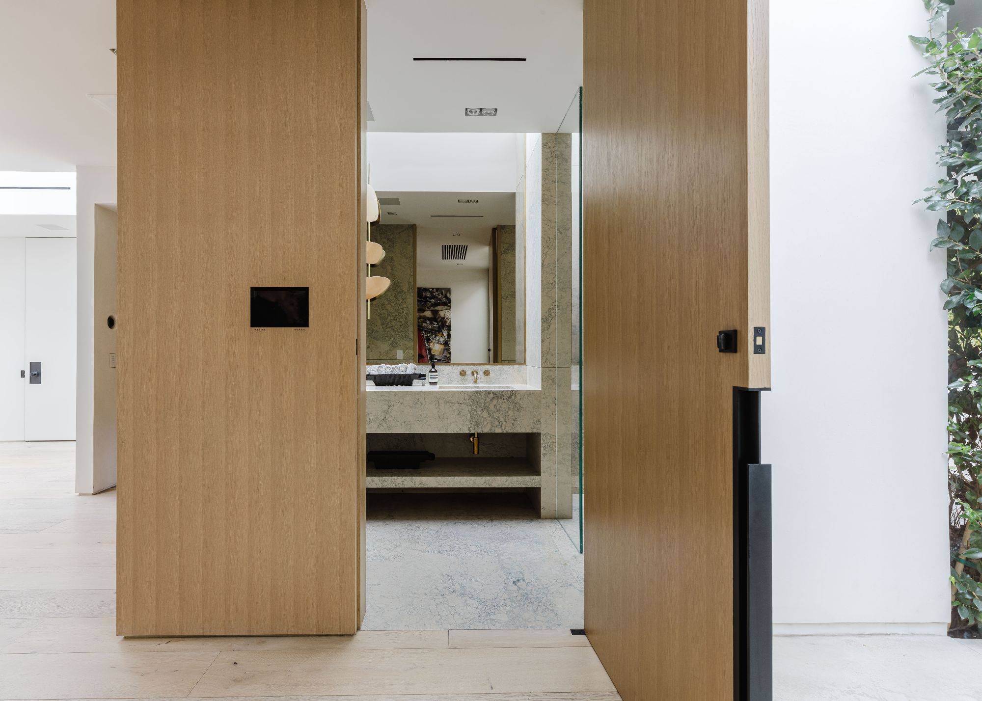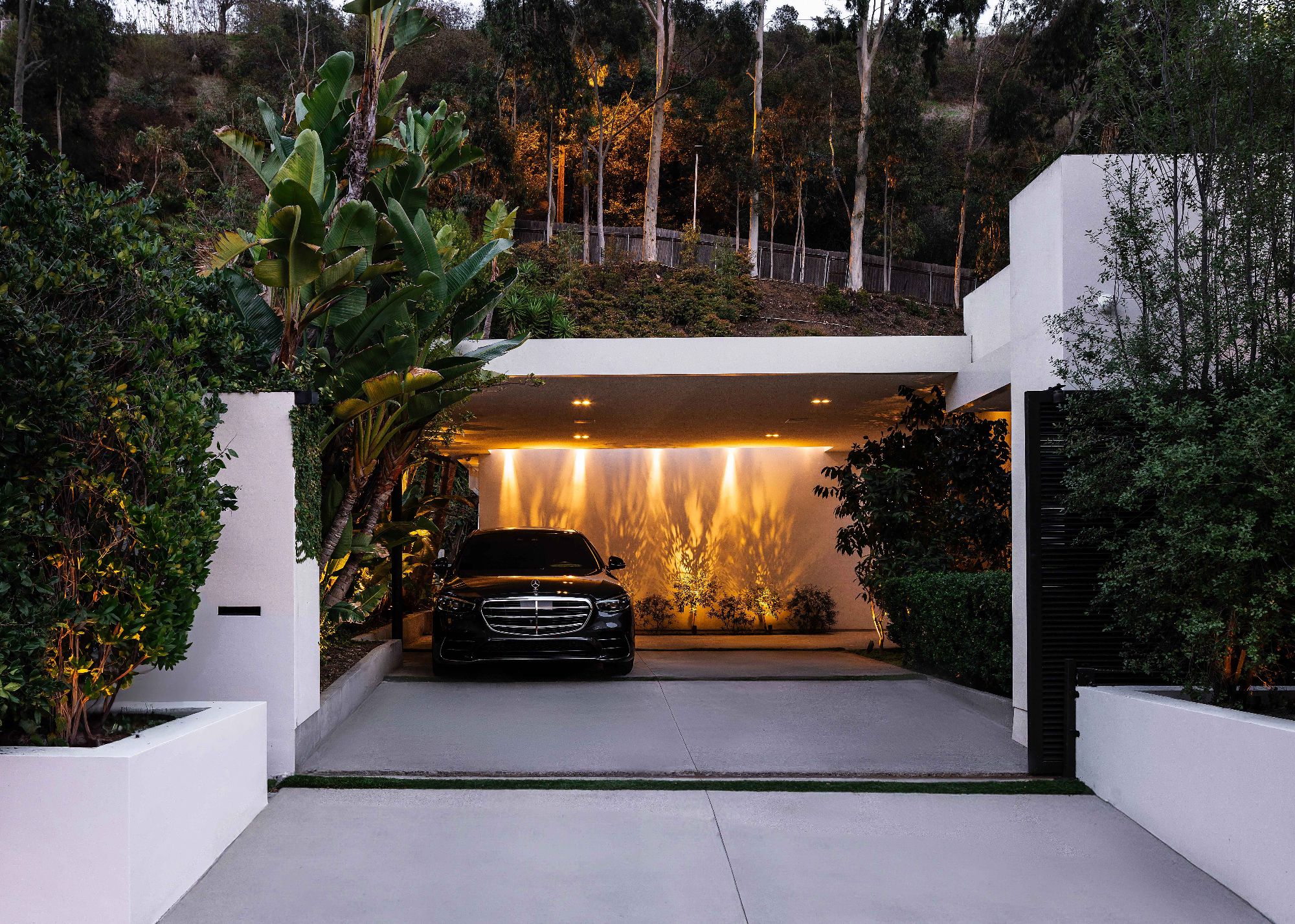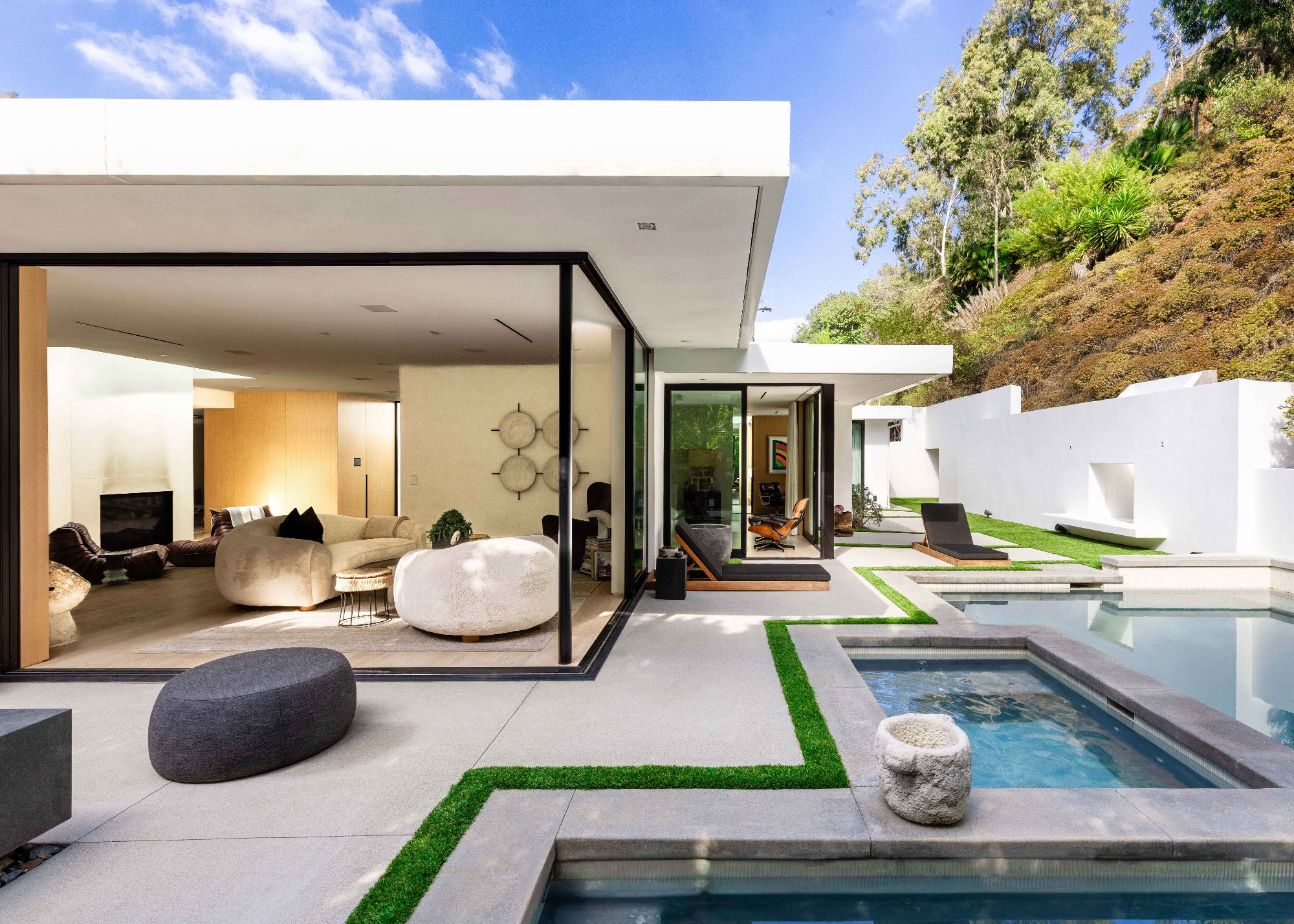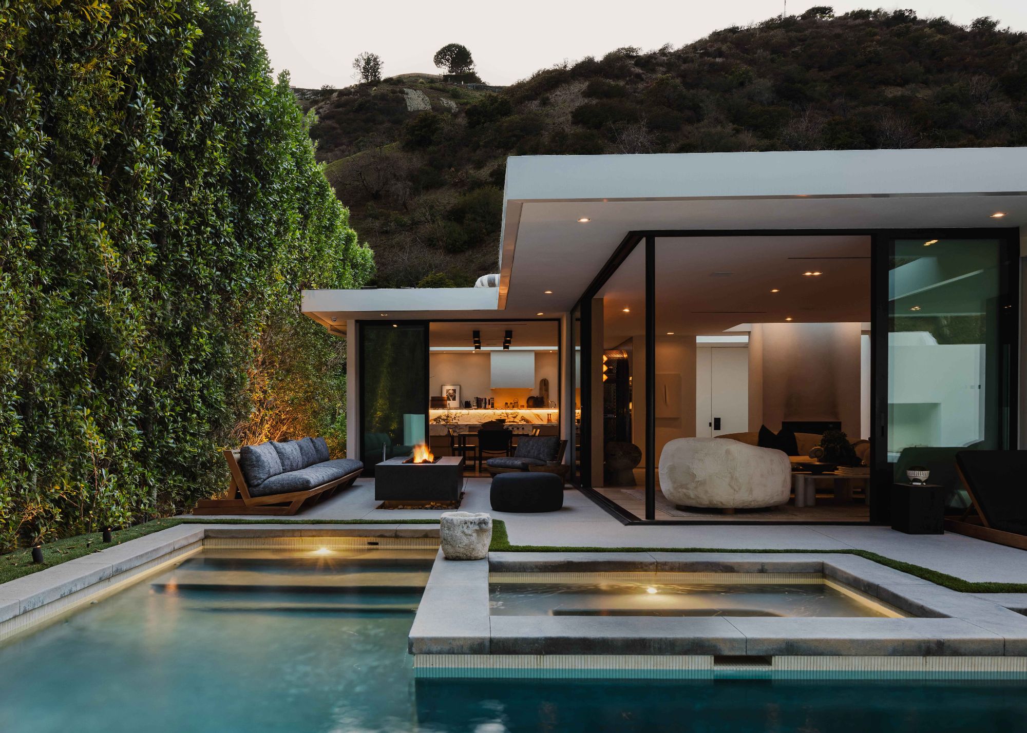 Tucked away just north of Sunset and the iconic Beverly Hills Hotel, 1952 North Beverly Drive is a sleek, single-story residence that balances refined international design with effortless California living. Designed by Yoram LePair (a Gehry Partners alum) and illuminated to perfection by noted lighting designer Mark Raissen (Sunset Tower Bar, San Vicente Bungalows), the home is defined by refined silhouettes, an abundance of natural light, and fluid indoor–outdoor connection. Expanses of floor-to-ceiling glass, meticulously detailed rift-oak paneling, and wide French oak planks in generous proportions set a sophisticated tone. The kitchen is conceived for openness and connection, inviting conversation and versatile entertaining with a large, centralized dining area as a natural gathering space for shared meals. Appliances include premier selections from Sub-Zero, Wolf, and Miele, along with wine refrigeration for 300 bottles and a full-service wet bar detailed in blackened steel, ebony millwork, and honed Saint Laurent marble. A formal living space orients toward the yard and pool, capturing views of the softly rising hillside that extend toward the gated entrance of Franklin Canyon Park. The primary suite offers an expansive walk-in wardrobe with thoughtfully designed dressing areas, and a luxurious bath finished in stone and tailored millwork, with sleek pocket doors that blur thresholds with graceful simplicity. A secondary bedroom—presently configured as a den—serves as a retreat for entertainment and quiet conversation, with a discreetly integrated full bath concealed behind sculpted oak walls. Outdoors evoke the atmosphere of a boutique hotel, with a firepit lounge framed by teak sofas, a pool and spa detailed in muted Japanese tile, and a large fireplace thoughtfully incorporated into a bespoke garden wall. Multiple SONANCE speaker systems complete the setting, creating a fully immersive environment for an activated outdoor lifestyle. Intelligent living is defined by Control4, Lutron, and AI-driven automation. The detached guest casita (fully permitted with its own address at 1954 North Beverly) offers the ultimate in private accommodation, with a stone-clad bathroom, custom wardrobe, concealed refrigeration, and dedicated storage. A separate laundry/tech room includes additional wine refrigeration and generous organizational space. The restrained exterior façade blends discretion and design, softened by native landscape architecture from Elysian Landscapes. Covered parking is secured behind an 8-foot louvered steel gate, maintaining the residence’s understated presence.