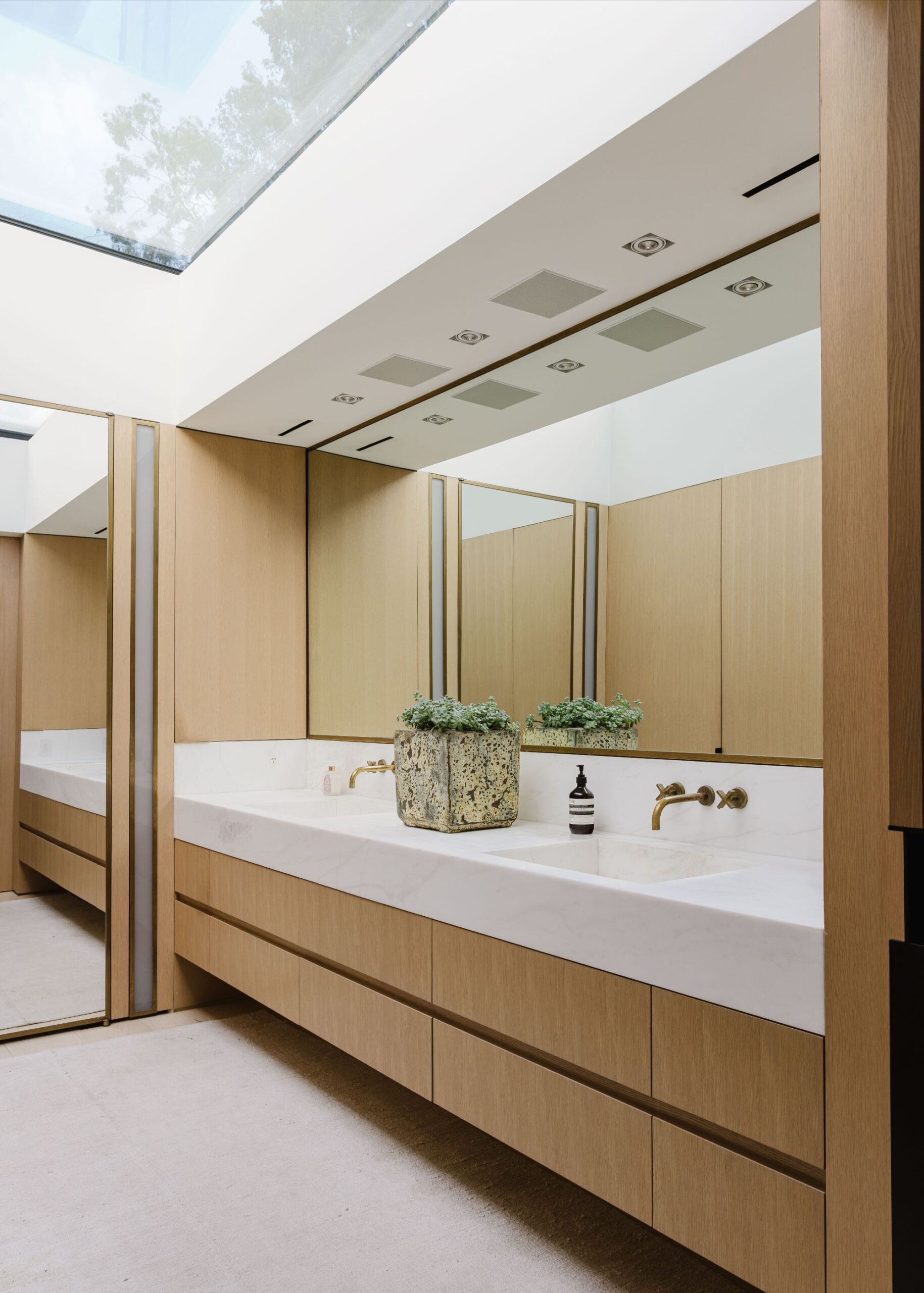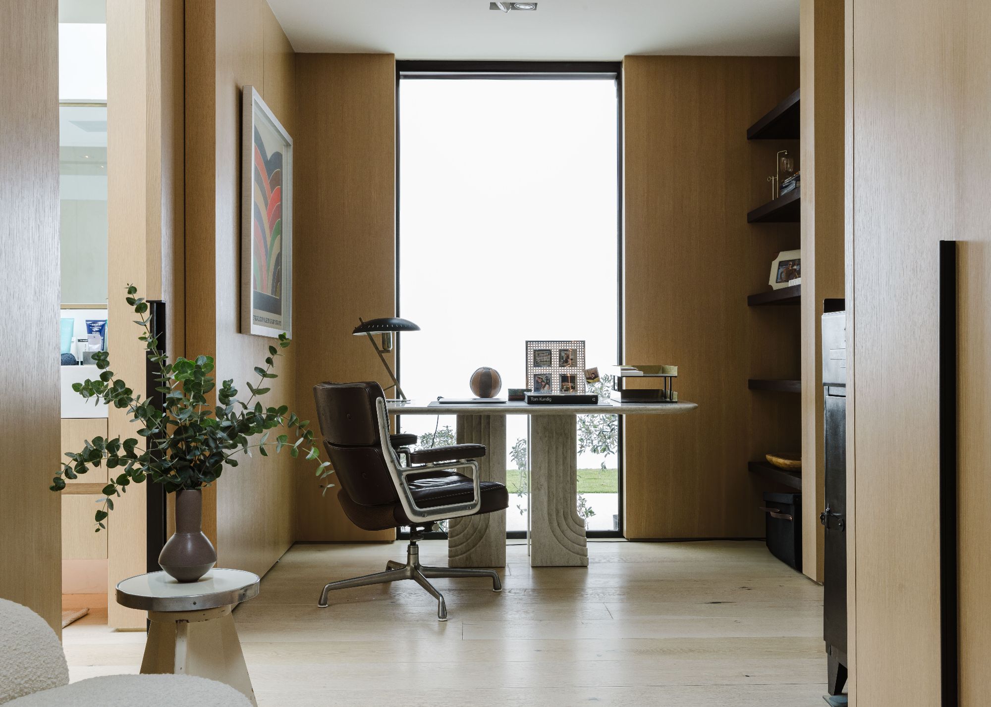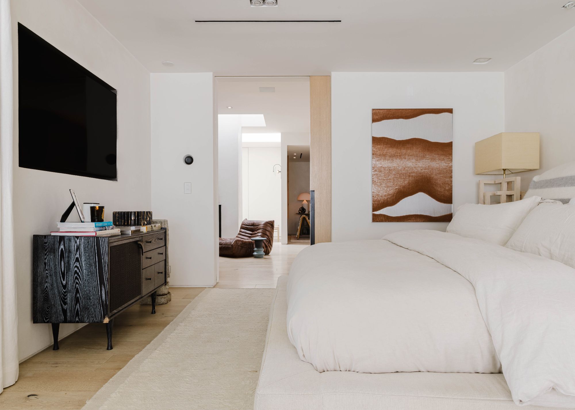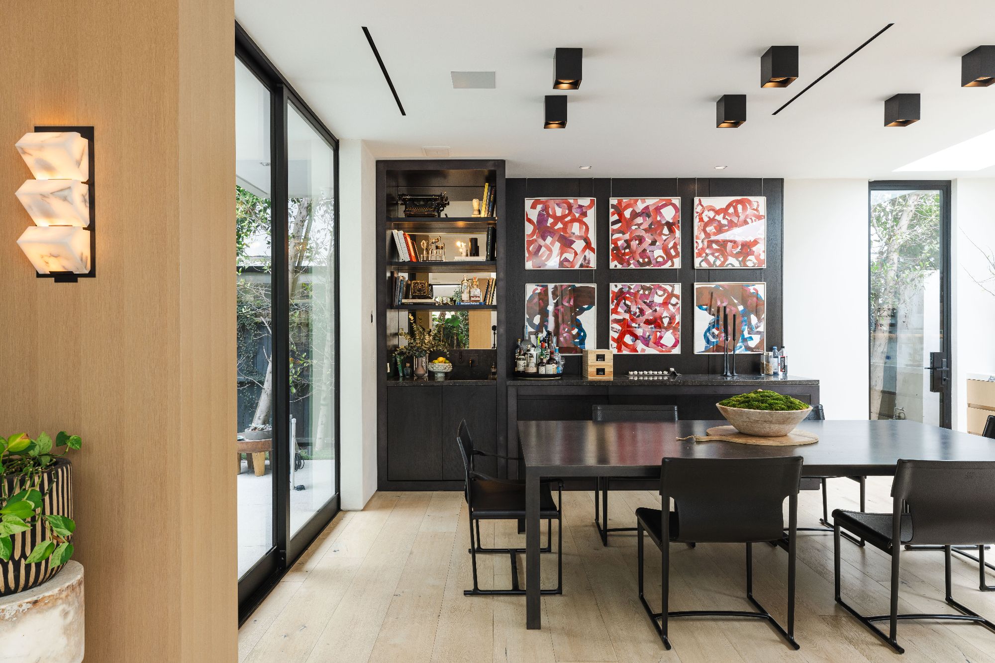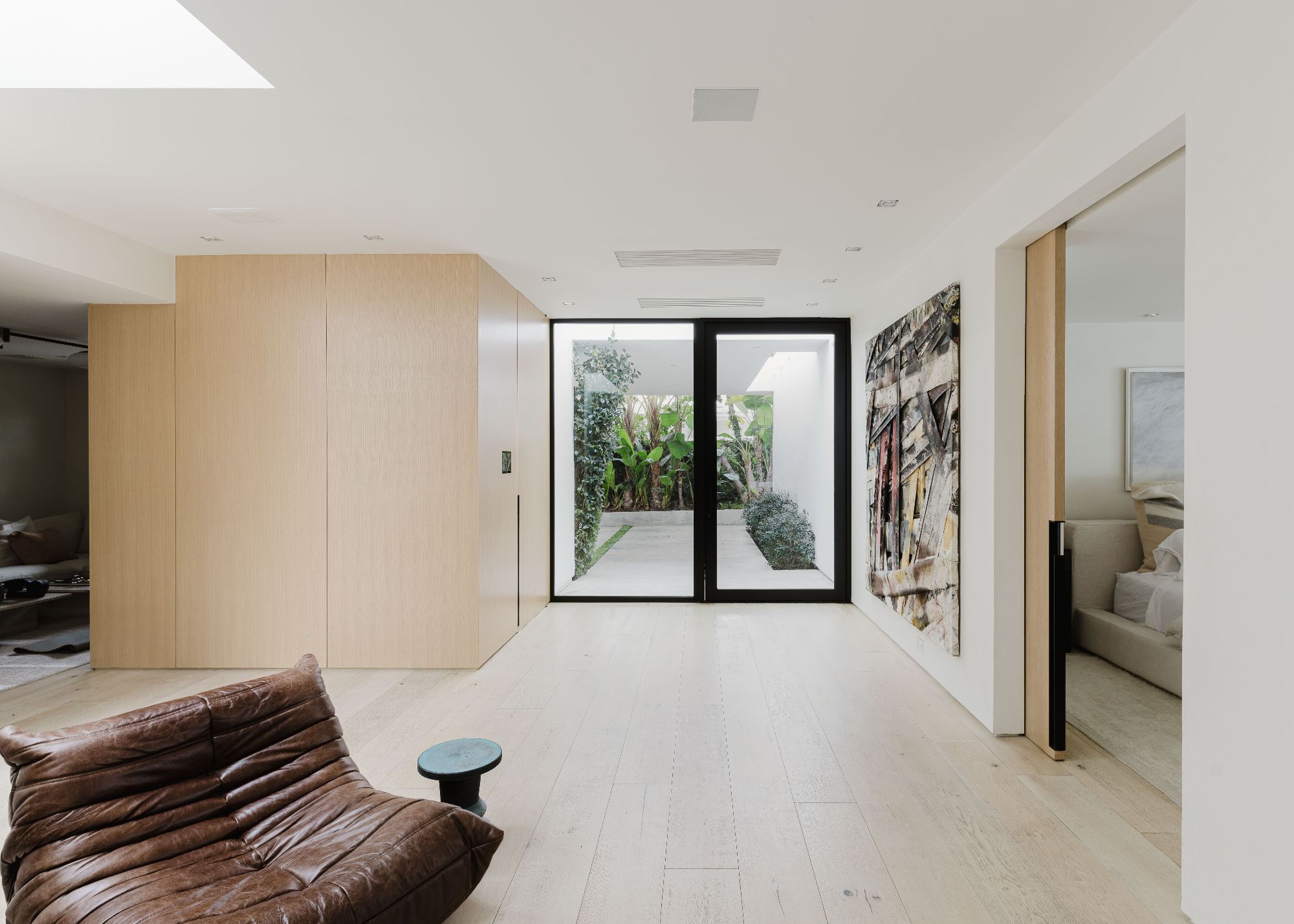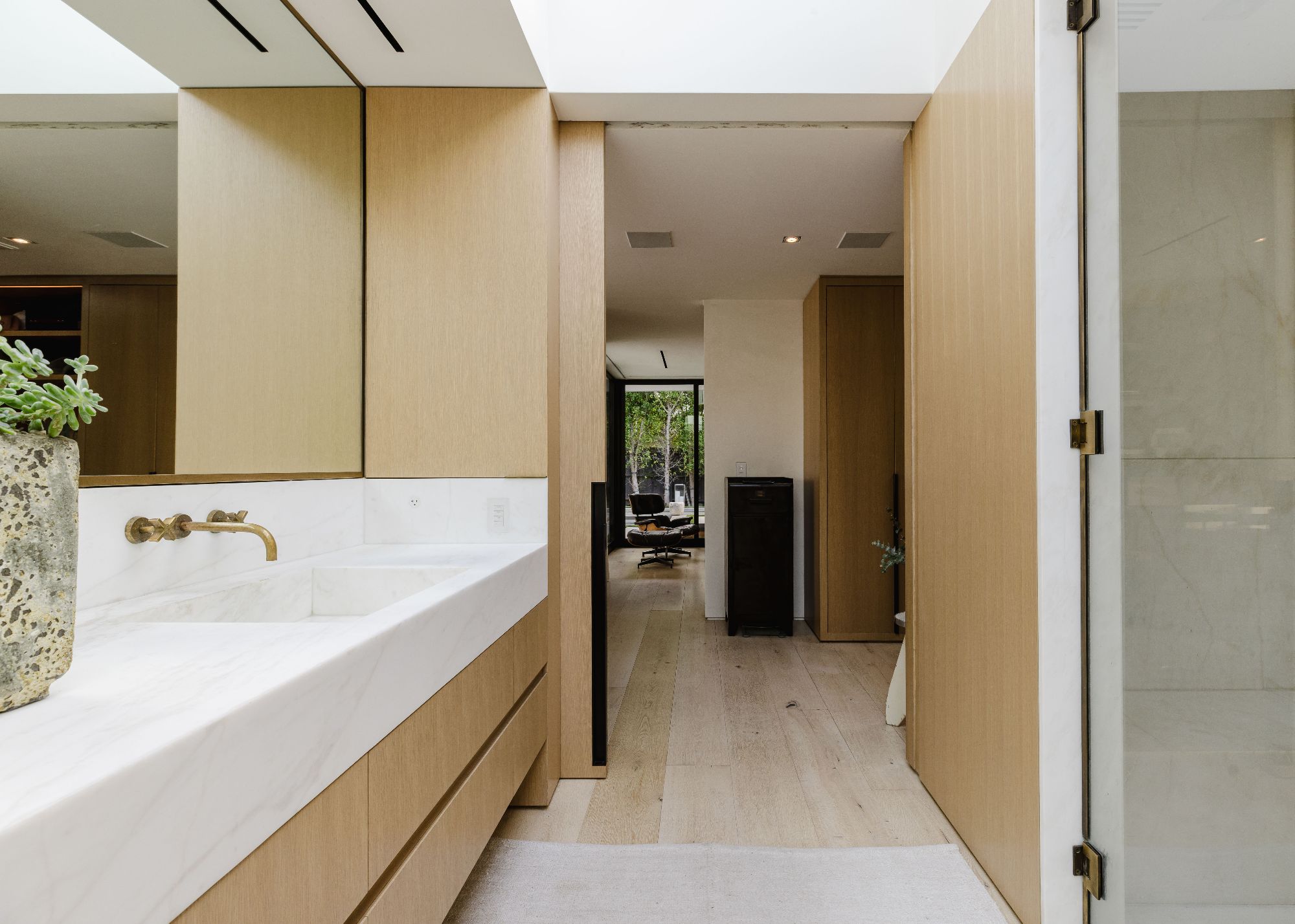 Tucked away just north of Sunset and the iconic Beverly Hills Hotel, 1952 North Beverly Drive is a sleek, single-story residence that balances refined international design with effortless California living. Designed by Yoram LePair (a Gehry Partners alum) and illuminated to perfection by noted lighting designer Mark Raissen (Sunset Tower Bar, San Vicente Bungalows), the home is defined by refined silhouettes, an abundance of natural light, and fluid indoor–outdoor connection. Expanses of floor-to-ceiling glass, meticulously detailed rift-oak paneling, and wide French oak planks in generous proportions set a sophisticated tone. The kitchen is conceived for openness and connection, inviting conversation and versatile entertaining with a large, centralized dining area as a natural gathering space for shared meals. Appliances include premier selections from Sub-Zero, Wolf, and Miele, along with wine refrigeration for 300 bottles and a full-service wet bar detailed in blackened steel, ebony millwork, and honed Saint Laurent marble. A formal living space orients toward the yard and pool, capturing views of the softly rising hillside that extend toward the gated entrance of Franklin Canyon Park. The primary suite offers an expansive walk-in wardrobe with thoughtfully designed dressing areas, and a luxurious bath finished in stone and tailored millwork, with sleek pocket doors that blur thresholds with graceful simplicity. A secondary bedroom—presently configured as a den—serves as a retreat for entertainment and quiet conversation, with a discreetly integrated full bath concealed behind sculpted oak walls. Outdoors evoke the atmosphere of a boutique hotel, with a firepit lounge framed by teak sofas, a pool and spa detailed in muted Japanese tile, and a large fireplace thoughtfully incorporated into a bespoke garden wall. Multiple SONANCE speaker systems complete the setting, creating a fully immersive environment for an activated outdoor lifestyle. Intelligent living is defined by Control4, Lutron, and AI-driven automation. The detached guest casita (fully permitted with its own address at 1954 North Beverly) offers the ultimate in private accommodation, with a stone-clad bathroom, custom wardrobe, concealed refrigeration, and dedicated storage. A separate laundry/tech room includes additional wine refrigeration and generous organizational space. The restrained exterior façade blends discretion and design, softened by native landscape architecture from Elysian Landscapes. Covered parking is secured behind an 8-foot louvered steel gate, maintaining the residence’s understated presence.