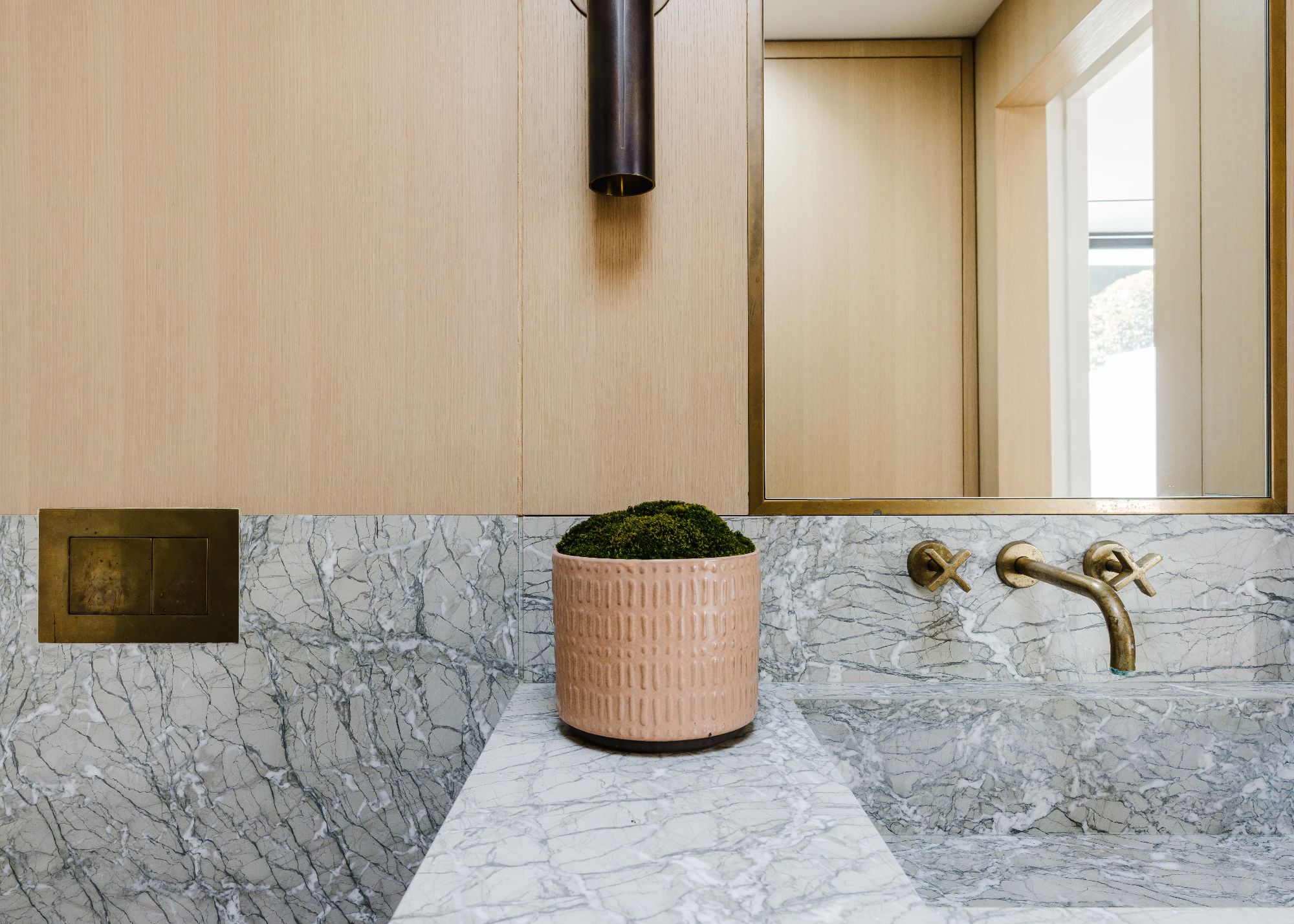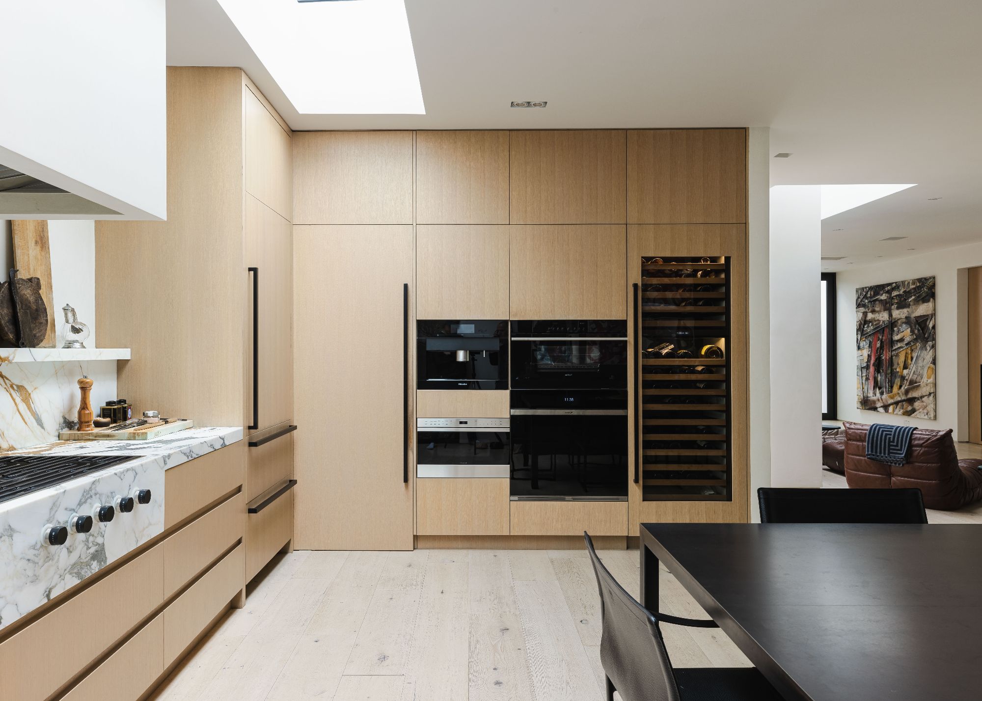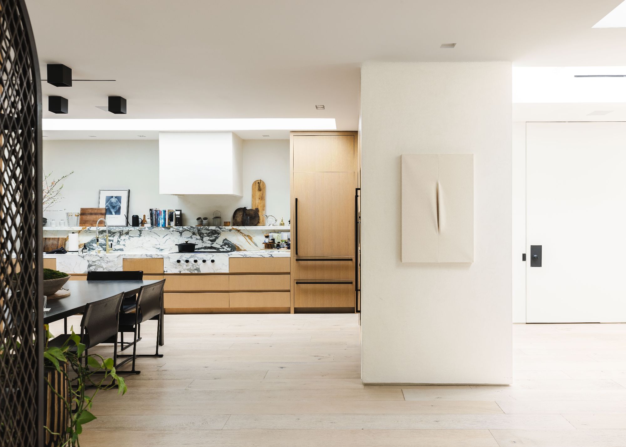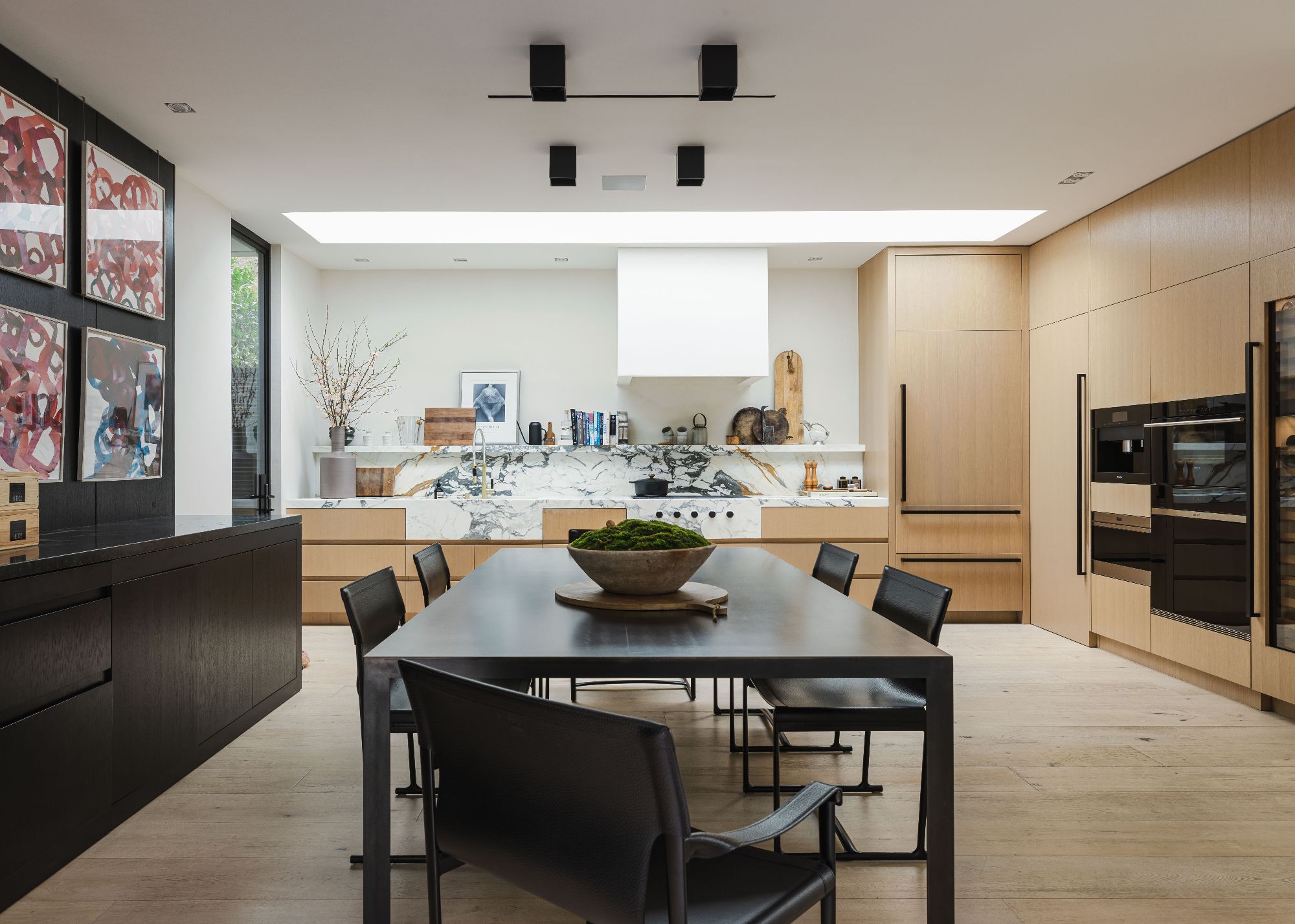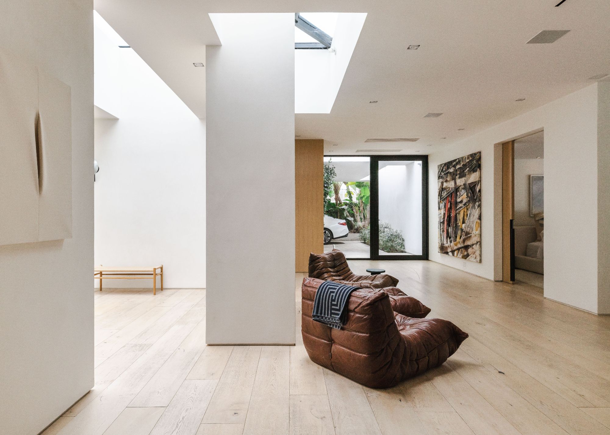 Tucked away just north of Sunset and the iconic Beverly Hills Hotel, 1952 North Beverly Drive is a sleek, single-story residence that balances refined international design with effortless California living. Designed by Yoram LePair (a Gehry Partners alum) and illuminated to perfection by noted lighting designer Mark Raissen (Sunset Tower Bar, San Vicente Bungalows), the home is defined by refined silhouettes, an abundance of natural light, and fluid indoor–outdoor connection. Expanses of floor-to-ceiling glass, meticulously detailed rift-oak paneling, and wide French oak planks in generous proportions set a sophisticated tone. The kitchen is conceived for openness and connection, inviting conversation and versatile entertaining with a large, centralized dining area as a natural gathering space for shared meals. Appliances include premier selections from Sub-Zero, Wolf, and Miele, along with wine refrigeration for 300 bottles and a full-service wet bar detailed in blackened steel, ebony millwork, and honed Saint Laurent marble. A formal living space orients toward the yard and pool, capturing views of the softly rising hillside that extend toward the gated entrance of Franklin Canyon Park. The primary suite offers an expansive walk-in wardrobe with thoughtfully designed dressing areas, and a luxurious bath finished in stone and tailored millwork, with sleek pocket doors that blur thresholds with graceful simplicity. A secondary bedroom—presently configured as a den—serves as a retreat for entertainment and quiet conversation, with a discreetly integrated full bath concealed behind sculpted oak walls. Outdoors evoke the atmosphere of a boutique hotel, with a firepit lounge framed by teak sofas, a pool and spa detailed in muted Japanese tile, and a large fireplace thoughtfully incorporated into a bespoke garden wall. Multiple SONANCE speaker systems complete the setting, creating a fully immersive environment for an activated outdoor lifestyle. Intelligent living is defined by Control4, Lutron, and AI-driven automation. The detached guest casita (fully permitted with its own address at 1954 North Beverly) offers the ultimate in private accommodation, with a stone-clad bathroom, custom wardrobe, concealed refrigeration, and dedicated storage. A separate laundry/tech room includes additional wine refrigeration and generous organizational space. The restrained exterior façade blends discretion and design, softened by native landscape architecture from Elysian Landscapes. Covered parking is secured behind an 8-foot louvered steel gate, maintaining the residence’s understated presence.