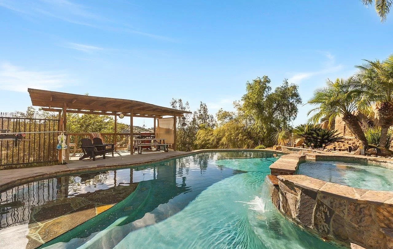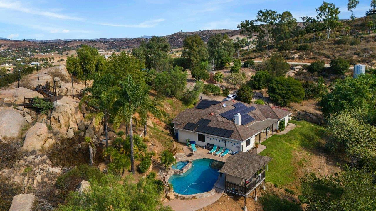 Welcome to your own private oasis. This exquisite 4-bedroom, 2-bathroom home sits on a 4.02-acre lot, surrounded by the beauty of mature fruit trees, rolling hills, and views from every direction. A true sanctuary, this home invites you to unwind with its enticing pool, soothing spa, and a brand-new expansive deck where panoramic views of mountains, cityscapes, and awe-inspiring sunsets await. The interior of the home is a true entertainer's delight, featuring a spacious kitchen, 10-foot ceilings, and an open floor plan that seamlessly blends style and functionality. The large master bedroom with private bath and a generous walk-in closet is nestled on the opposite side of the home from the other bedrooms, making it the perfect retreat for peace and privacy. With three additional rooms, this residence offers an abundance of space for your family and guests. This property is not just a home; it's an extraordinary opportunity to embrace a lifestyle of serenity and luxury.