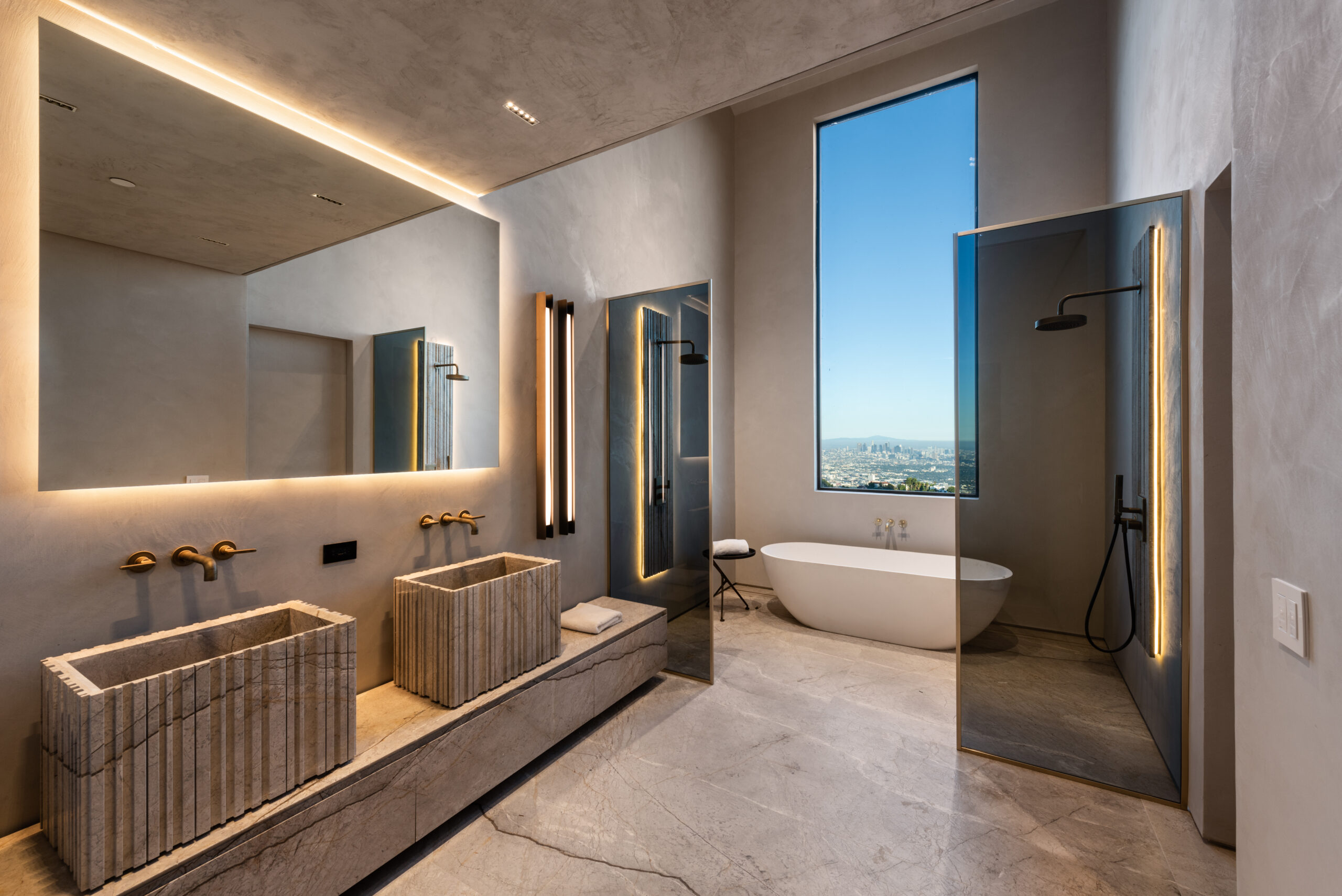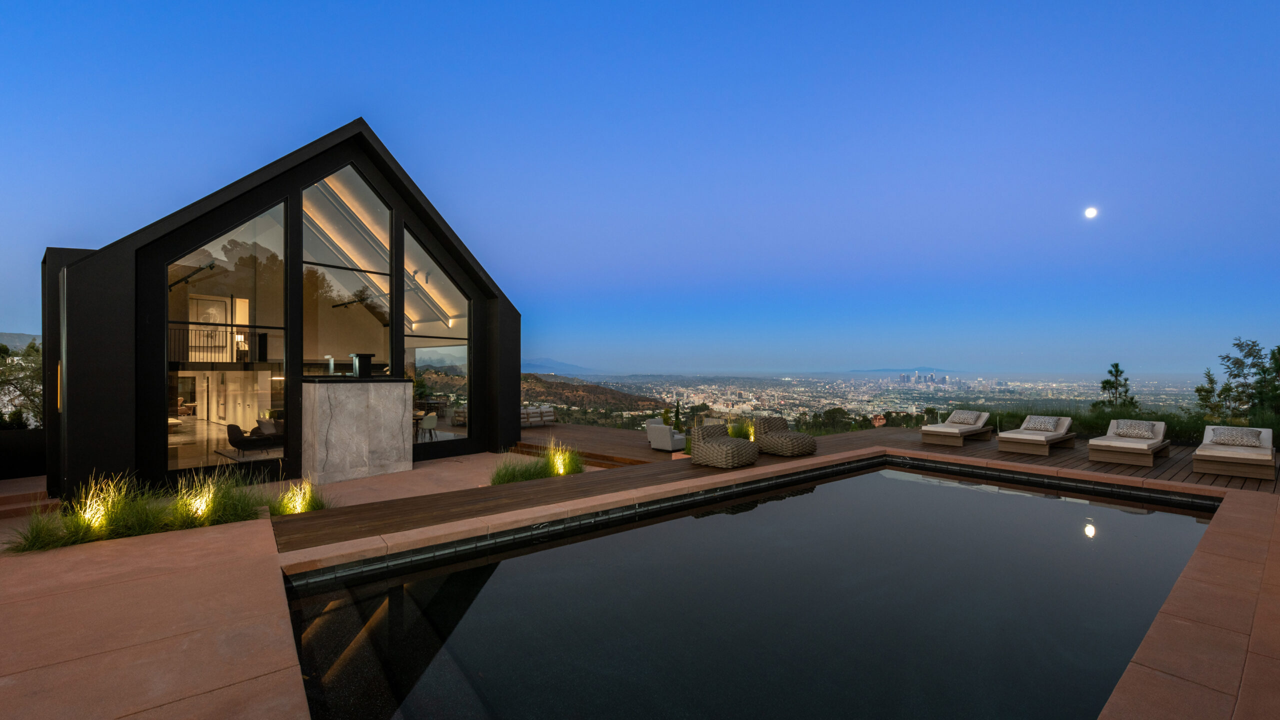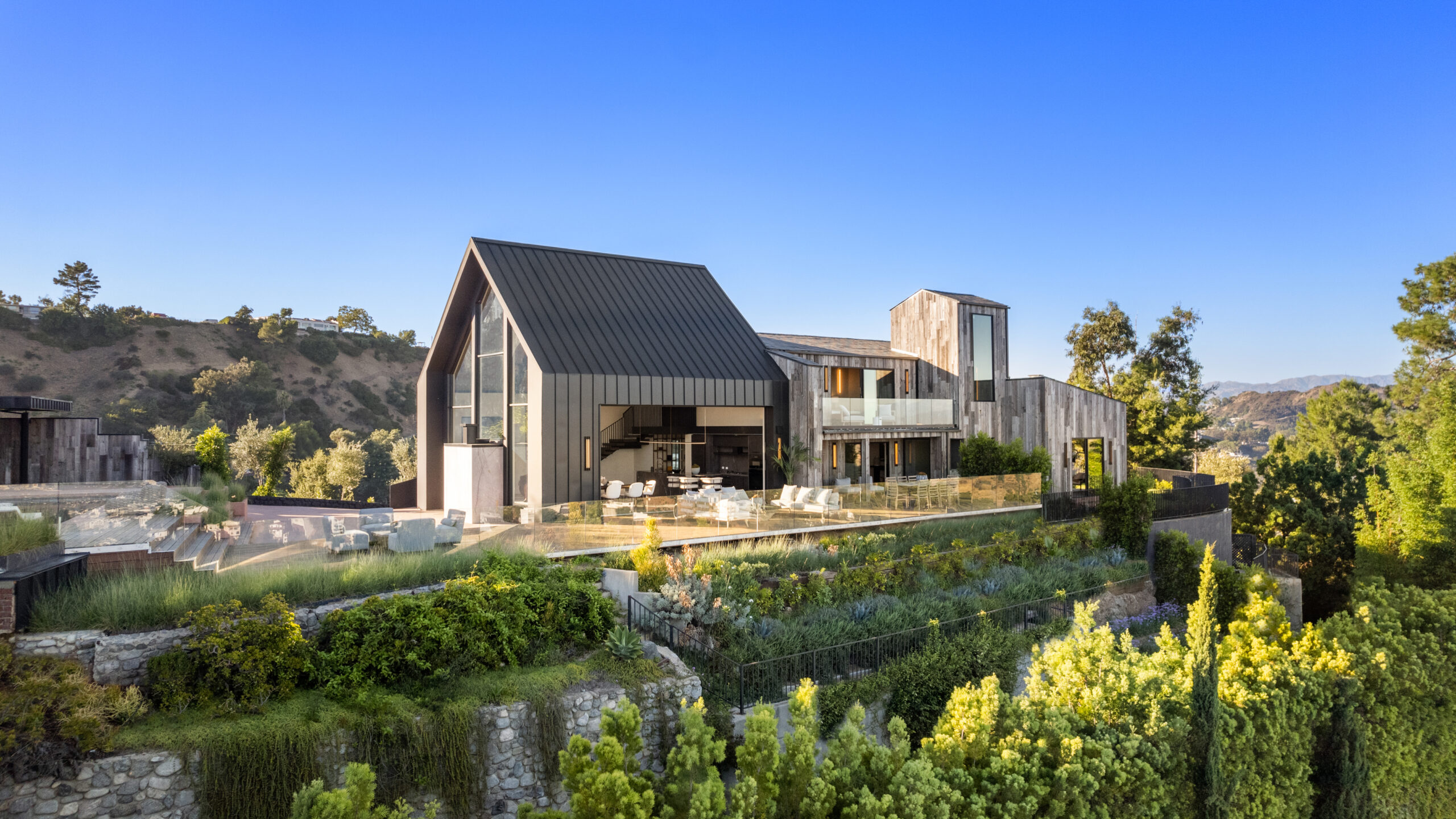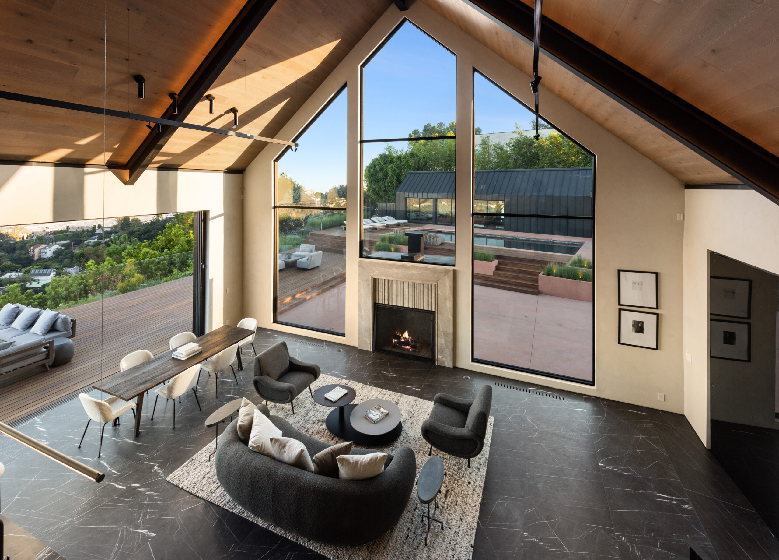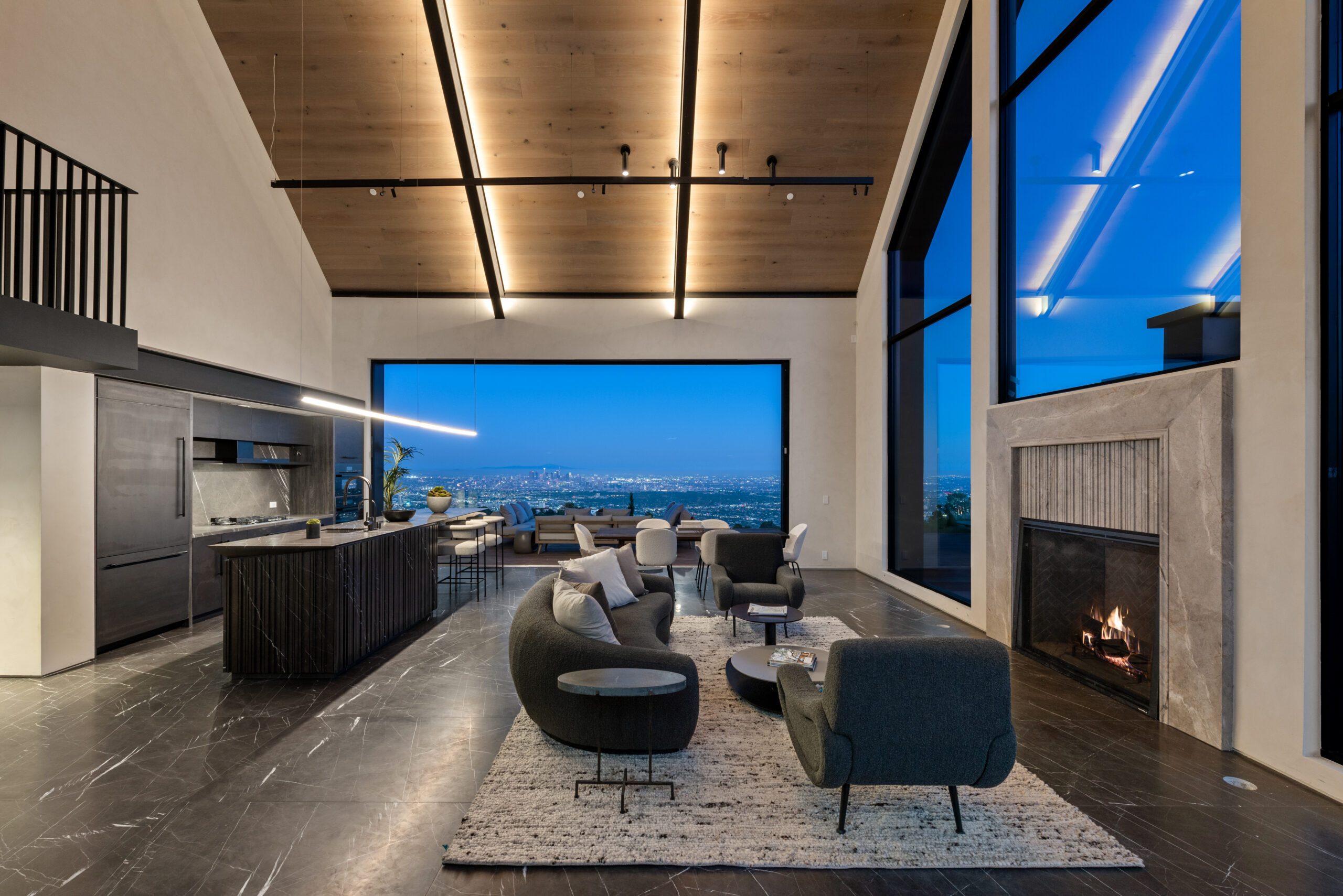This NOBEL designed modern barnhouse boasting world class architecture and luxury, is a LA gem that's perched atop the infamous Hollywood Hills offers unparalleled 300 degreeviews. All major Los Angeles landmarks are visually attainable from every room of this home. From the city skyline to the famous Hollywood sign, Griffith observatory and a tranquil embrace of the ocean. This meticulously designed sanctuary spans two levels, with 4 bedrooms and 4 bathrooms, this home caters to both privacy and spacious living. Upon entry you'll be greeted by an open floor plan seamlessly integrating the expansive living area with pietra gray marble flooring throughout. The towering windows flood the space with natural light, while Fleetwood doors that collapse into the wall seamlessly blurring the lines between indoor and outdoor living, accentuating the rich textures of pietra marble and wood flooring. The heart of the home boasts two elegant fireplaces, one in the living room and another in the primary bedroom, offering unlimited warmth and ambiance at your disposal. With two primary bedrooms, one on the ground floor and the other on the upper level, feature spacious walk-in closets and luxurious en-suite bathrooms with indulgent tubs and custom vanities. Discover the perfect blend of relaxation and entertainment with a pristine pool deck featuring a pool house which adds the flexibility to use as a private retreat or accommodating guests. The pool house seamlessly flows with the main residence, this entertainer's dream adds an element of sophistication and leisure. Positioned to the south, this home basks in an abundance of natural light, with the breathtaking sun rising in the morning and casting its warm glow over the pool, ensuring you'll enjoy the natural light glistening over the water throughout the day. Completing this extraordinary residence is a three-car garage with a guard room for added security, a long private driveway that climbs nearly 30 feet above street level, and a host of amenities. This home reflects the fusion of art and architecture, capturing the essence of modern luxury with each detail carefully curated to create not just a home, but a living, breathing piece of artistry.