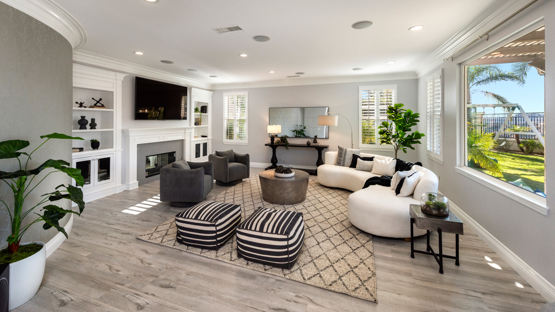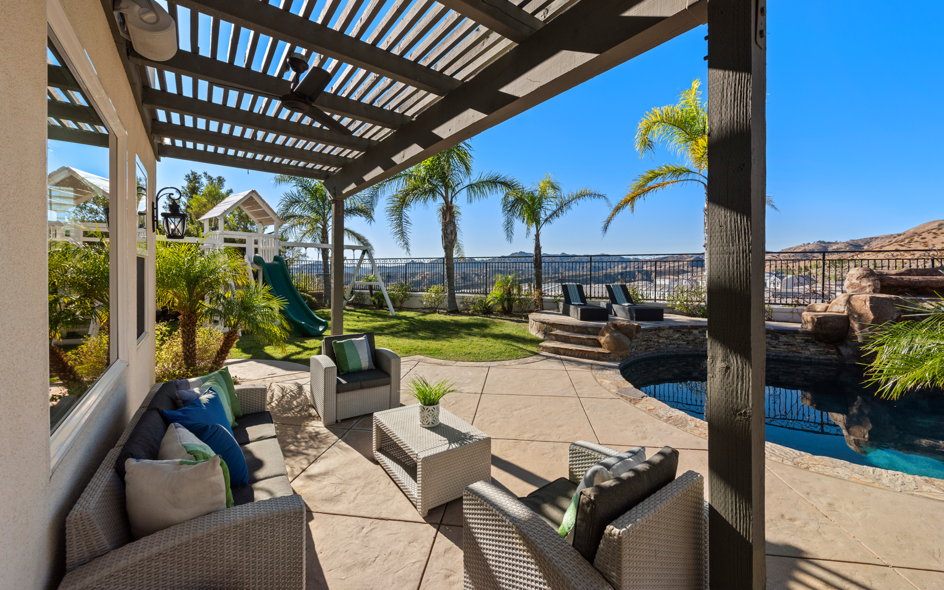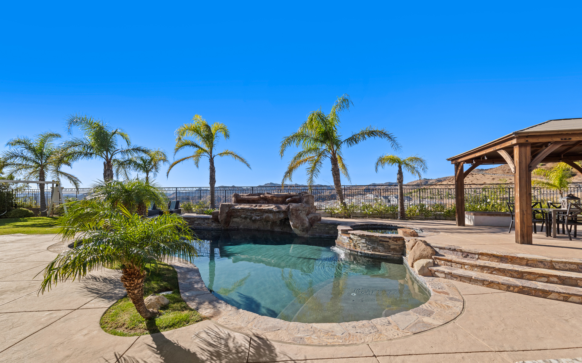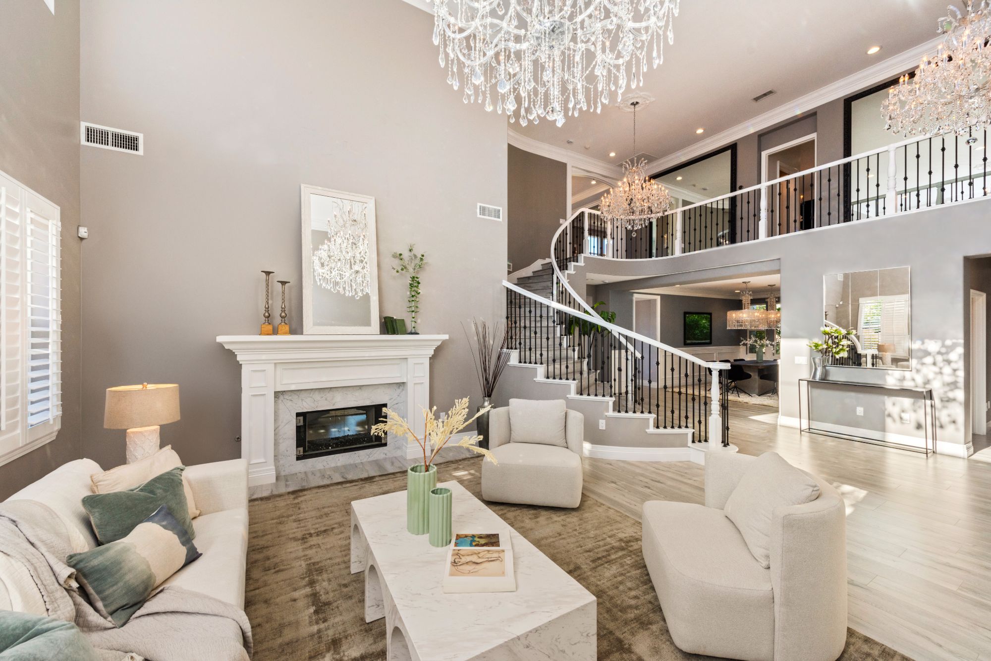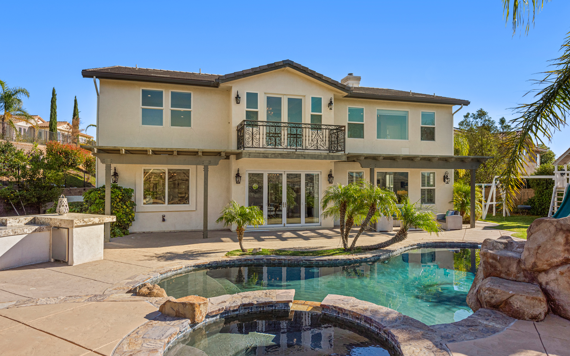 Situated within the exclusive guard gated Renaissance community of Porter Ranch, this elegant estate offers an exceptional combination of luxury, comfort, and breathtaking views. Located at the end of a quiet cul-de-sac this home is bathed in natural light and designed to impress. This 5-bedroom, 4.5 bathroom residence spans 4,271 square feet on over a half an acre lot. Step inside the grand entryway to soaring ceilings and a seamless floor plan that balances sophistication and livability. The chef's kitchen boasts custom cabinetry, sub zero appliances and marble countertops, perfect for entertaining or everyday cooking. The primary suite is a personal sanctuary, complete with sitting area, and a private balcony offering panoramic views of the sparkling pool and serene mountain backdrop. With generously sized secondary bedrooms providing ample space for family, guests, or a home office. Step into the resort-style backyard featuring a pool and spa, custom BBQ area, and a sports court. With breathtaking views and a thoughtfully designed layout, this home offers an unparalleled blend of luxury and functionality.