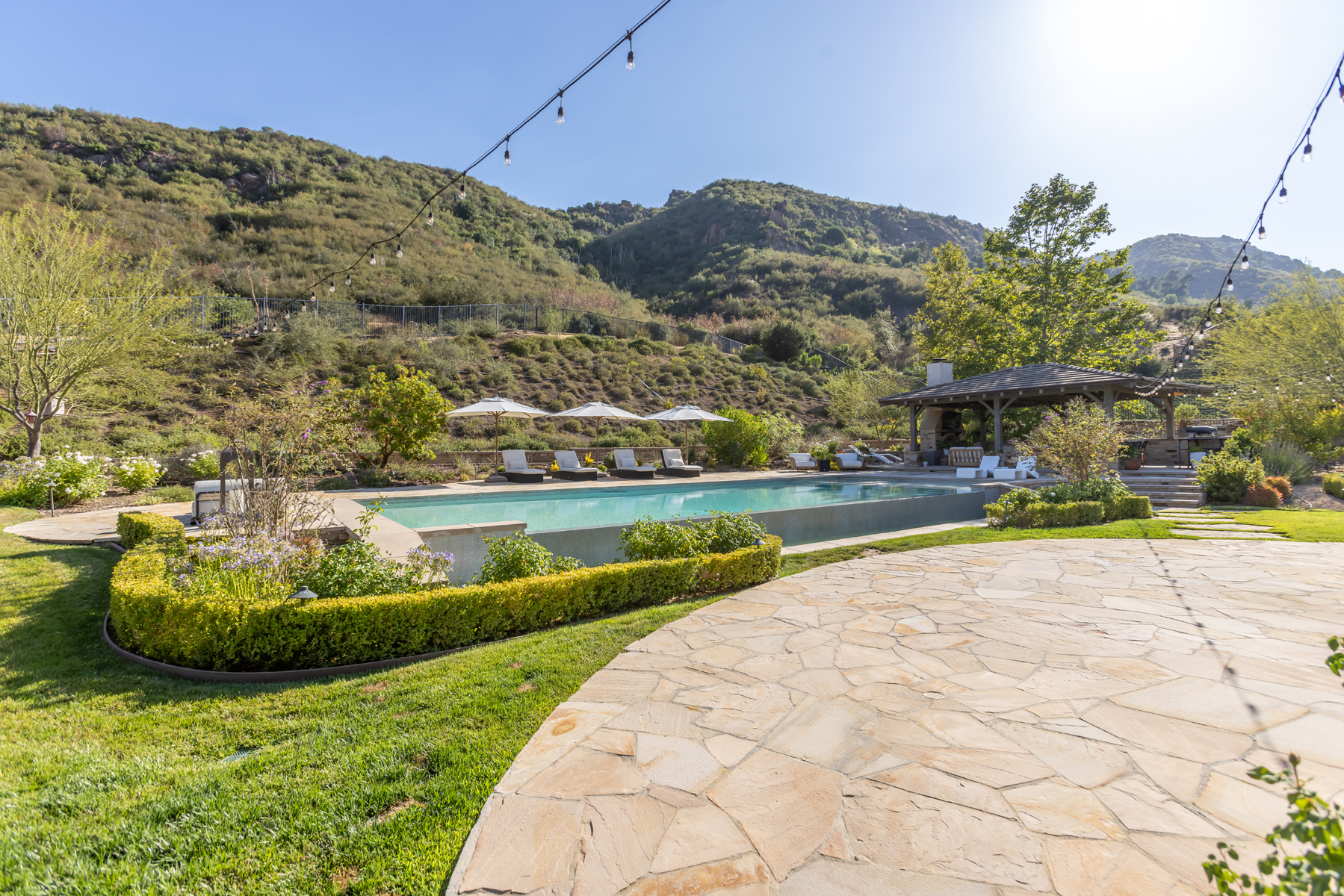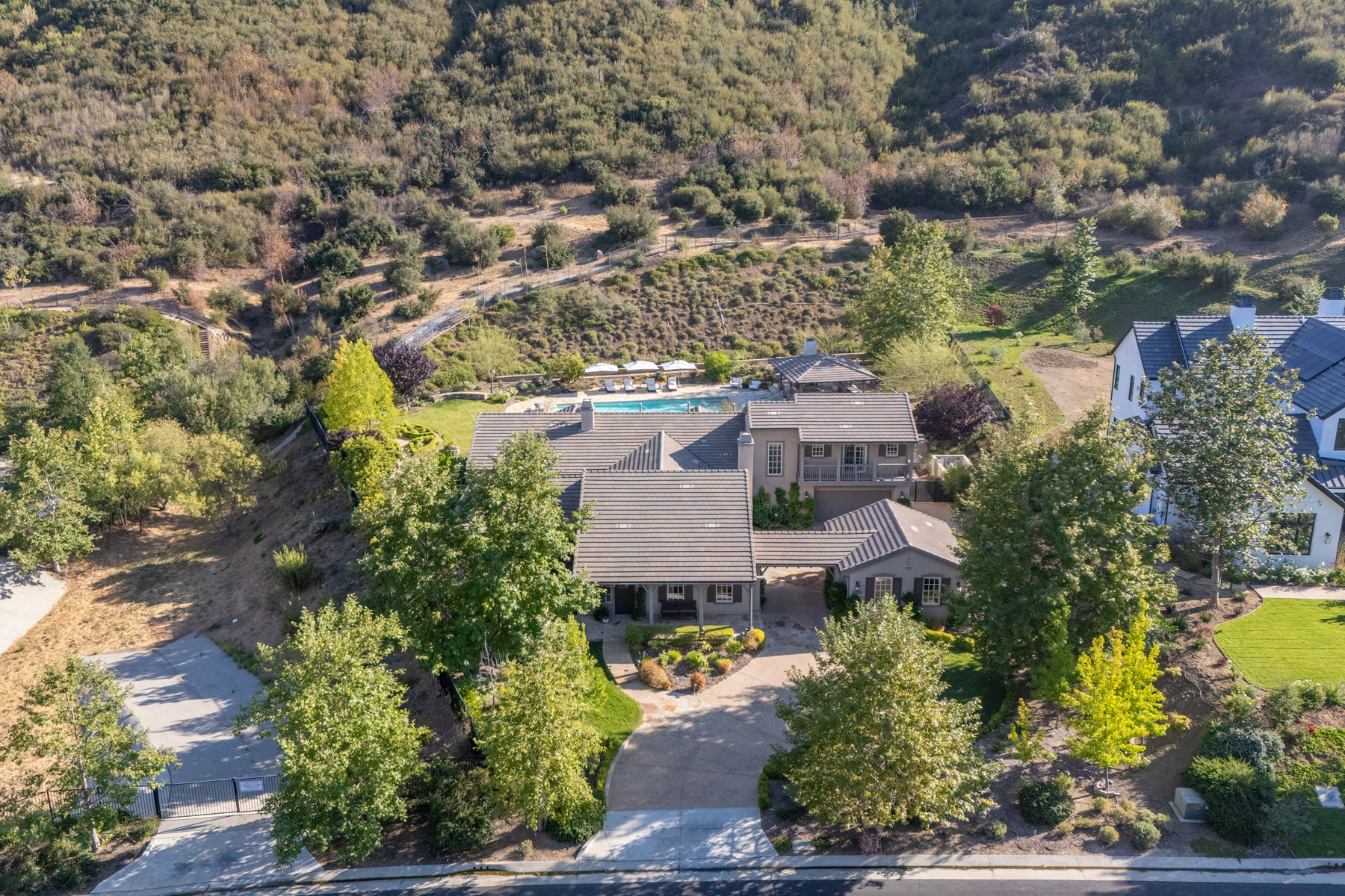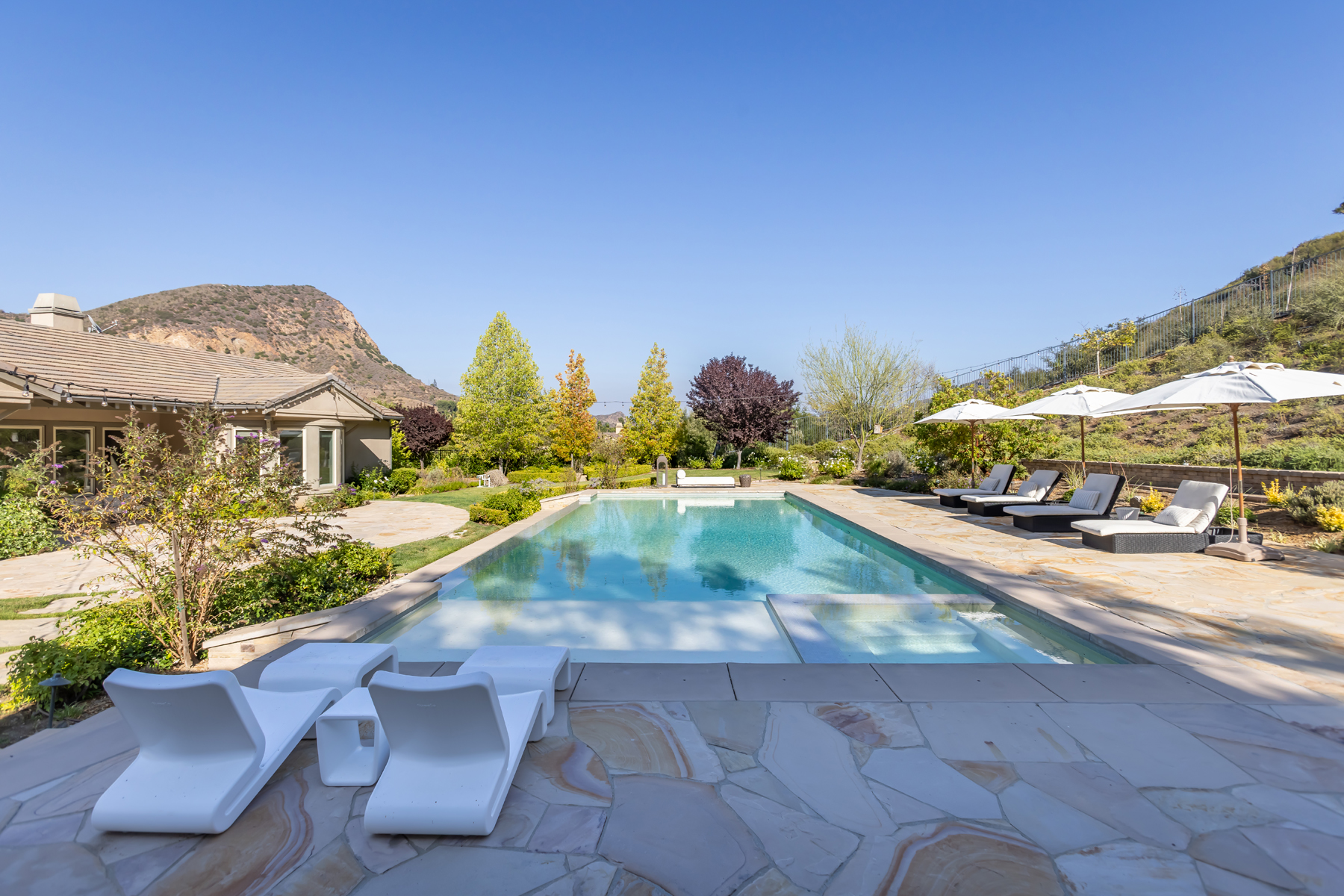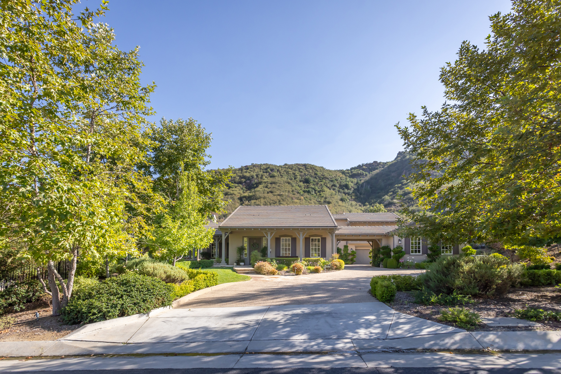 Welcome to a one-of-a-kind retreat, nestled behind private gates in the scenic hills of Agoura, where resort-style living meets timeless elegance. Located in the exclusive Vintage at Hidden Park community, this exquisitely remodeled estate sits on nearly 1.5 acres of beautifully landscaped grounds, offering the perfect blend of luxury, privacy, and natural beauty. The home features four spacious ensuite bedrooms, a thoughtfully designed nursery, and five fully remodeled bathrooms, each appointed with premium finishes and spa-inspired details. A completely renovated gourmet kitchen serves as the heart of the home, boasting top-of-the-line appliances, custom cabinetry, and designer stone countertopsideal for both everyday living and elevated entertaining.The open-concept floor plan is filled with natural light and high ceilings, creating a seamless flow between the expansive living and dining areas. The luxurious primary suite offers a peaceful sanctuary, complete with a spa-like bathroom and dual walk-in closets, providing both functionality and indulgence. For wellness enthusiasts, the home includes a private gym and sauna, creating a true at-home retreat.Designed with health and wellness in mind, this home features a whole-house water filtration system and non-toxic paint products throughout, ensuring a cleaner, healthier indoor environment for you and your loved ones.Step outside into your own resort-style backyard, where a sparkling pool is surrounded by lush landscaping, mature trees, and a tranquil al fresco dining area perfect for outdoor entertaining or quiet evenings under the stars. Additional features include a 4-car garage, ample driveway parking, and access to nearby hiking trails and open space preserves. All of this, just minutes from the iconic beaches of Malibu, offering the best of both hillside privacy and coastal lifestyle. This move-in ready estate has been meticulously upgraded and styled to perfection an exceptional opportunity to own a turnkey luxury home on nearly 1.5 acres in one of Agoura's most desirable gated communities.