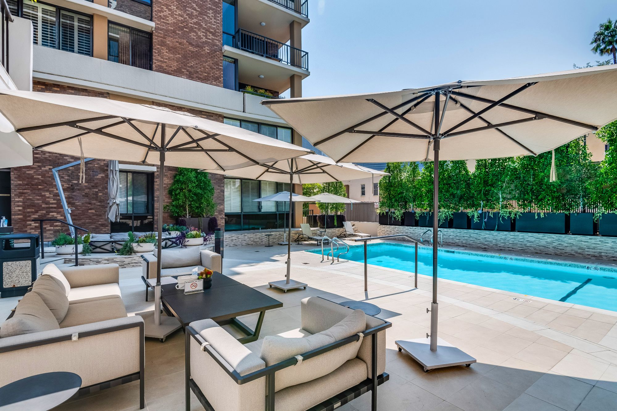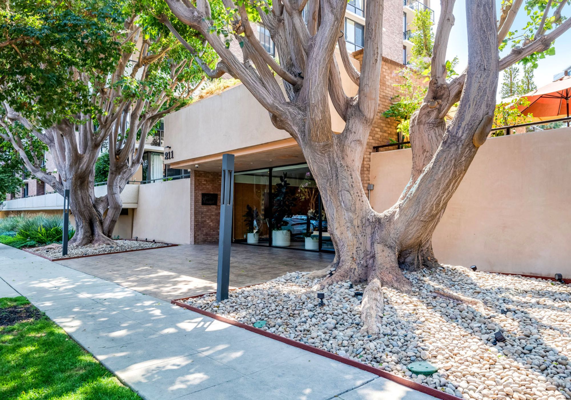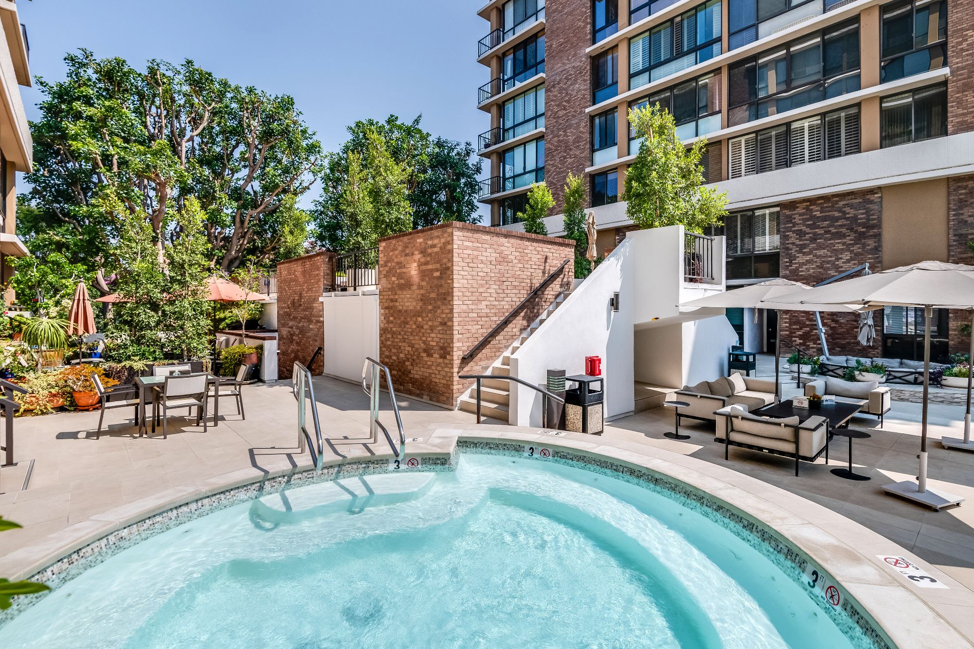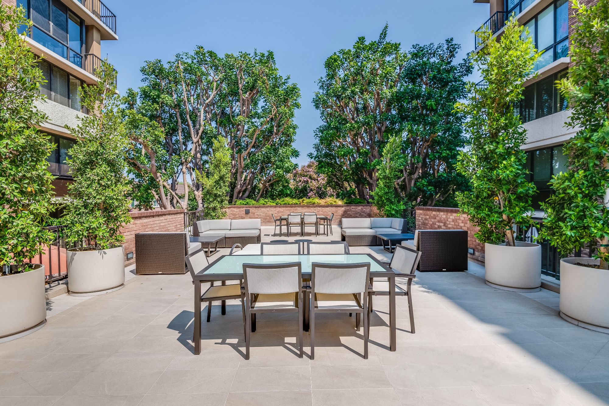 Luxurious living in one of Beverly Hills most exclusive full-service doorman buildings. Residents enjoy full 24/7 security, valet parking, newly redesigned pool and spa area, professional level gym, and top of the line service at their disposal. The beautifully designed, three-bedroom, three-bath townhome offers nearly 2,500 sq ft of elegant living. This corner unit boasts tremendous natural light and features open dining area leading to the gourmet kitchen featuring stainless steel appliances and plenty of cabinetry. Enjoy private garden patio surrounded by lush, mature trees offering a refreshing outdoor retreat. Upstairs find three well-sized bedrooms, including the chic primary bedroom displaying designer walk-in closets and a relaxing ensuite bath showcasing a soaking tub and a glass-enclosed shower. For added convenience, theres also an upper-level laundry room with extra storage. Experience dream living in one of the city's most rare and sought after locations.