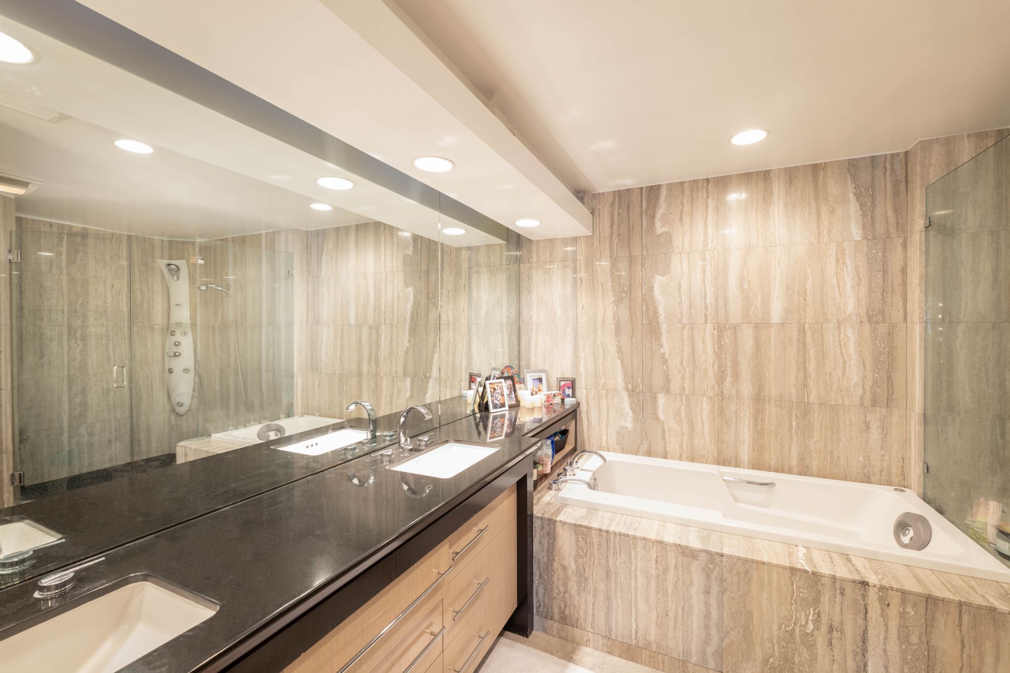 Remodeled 2-story townhome style condo in the most prestigious, luxurious full-service building in Beverly Hills. First level: Double door entry leads to the spacious living room with polished stone floors, gas fireplace, plantation shutters, chef's kitchen with granite countertops, stainless steel appliances, and breakfast bar. Dining area with built-in cabinetry, wet bar with refrigerated wine cabinet, floor to ceiling glass doors which open to private patio. Powder room with granite countertops & vessel sink. Upper level: master suite with designer walk-in closet, custom glass doors, bath with dual sinks, separate spa tub & shower. 2nd bedroom with own bathroom. Laundry room. Each level is accessible by building elevators. Two zones of HVAC. Full service building with 24 security, concierge, valet, swimming pool, spa, fitness room, sundeck, on site manager. Walk to Rodeo Dr, shops, restaurants, hotels, schools. Ready to move in!