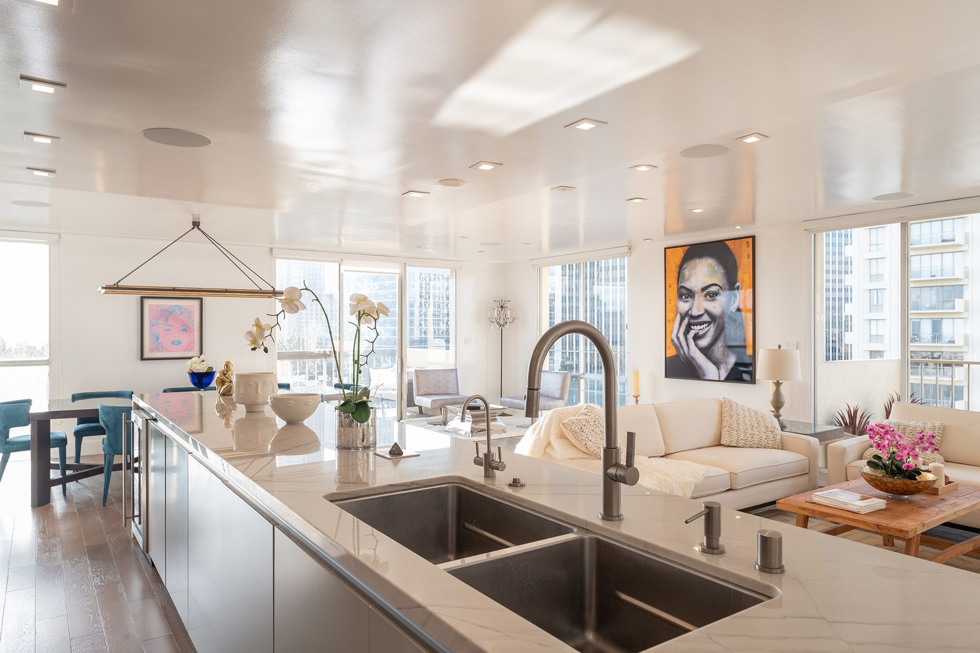 Ocean and Hollywood Hills views from this 14th floor corner unit. This beautifully finished 2 bedroom and 2 bathroom 1416 sqft North West facing bright unit has modern design throughout. Large waterfall kitchen island covered in quartzite. Two balconies looking out to the ocean and all the way to the Hollywood sign. One of few units that has a permitted washer/dryer in unit. A full-service building with 24 hour security, concierge, valet parking, Olympic-sized pool, fitness center, tennis court, private dog park and more.