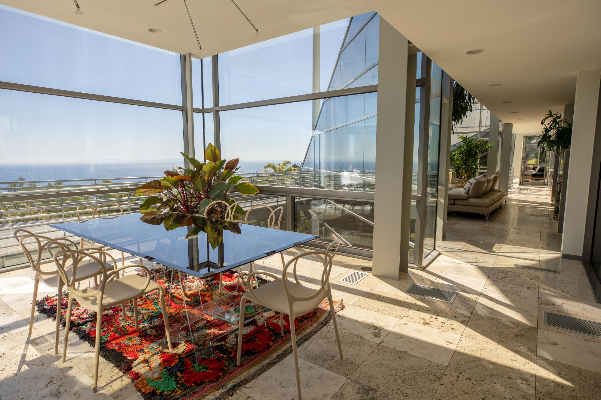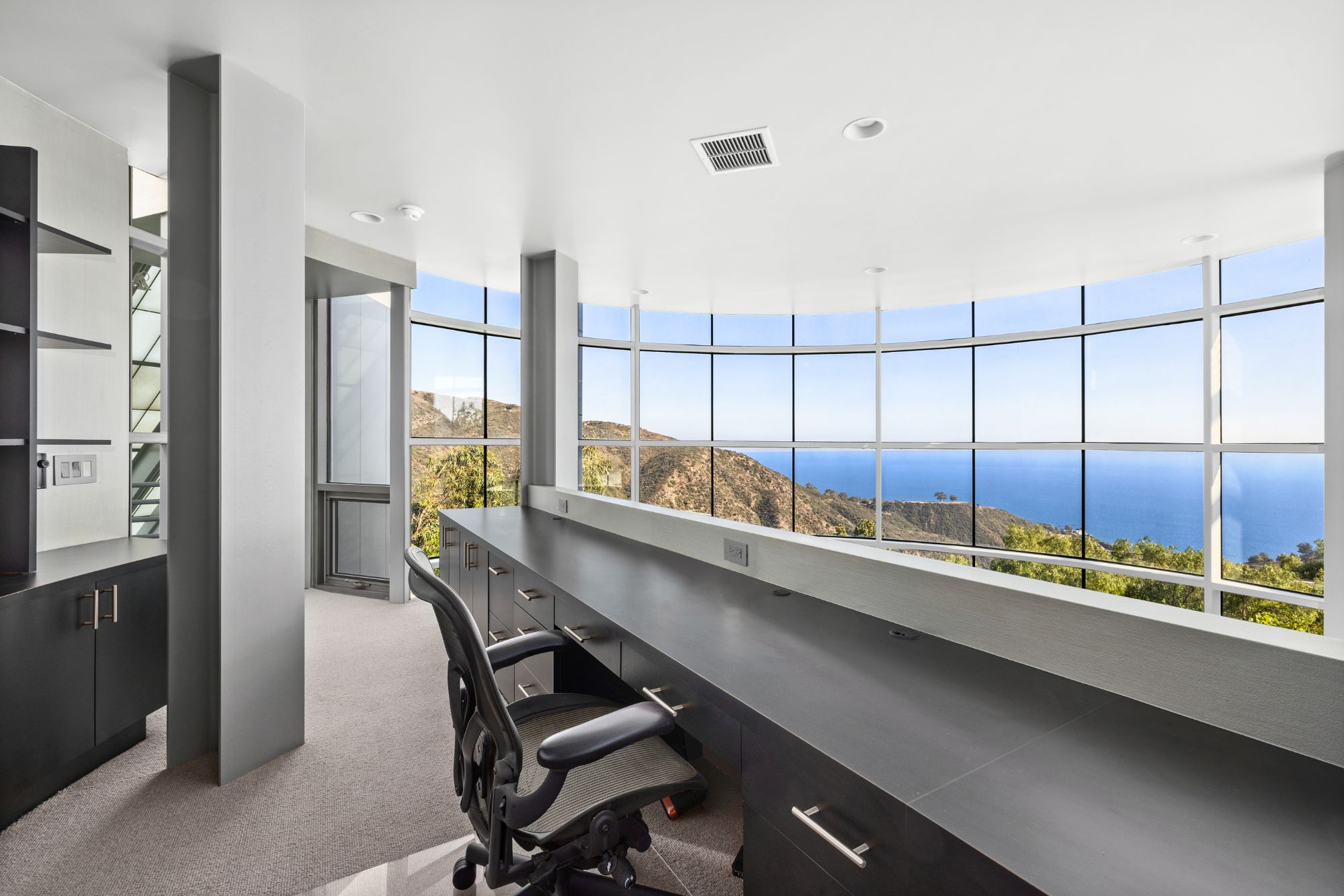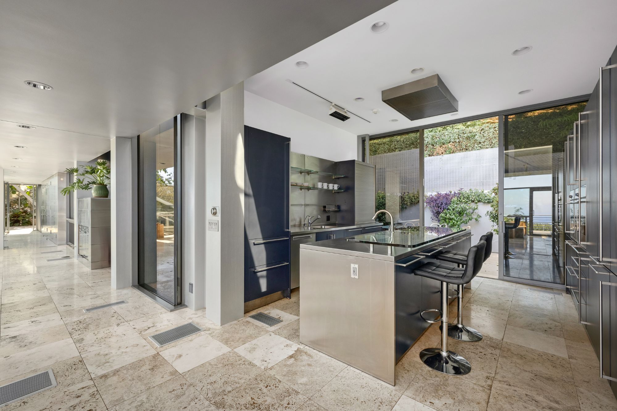 Welcome to The Power Plant by Ed Niles, FAIA: A true architectural marvel by renowned architect Ed Niles, masterfully blending glass, steel, and concrete. This extraordinary residence sits on nearly an acre of lushly landscaped grounds. Designed with precision, every room offers breathtaking, uninterrupted views of the Pacific Ocean, Catalina Island, the iconic Queen's Necklace, and the surrounding mountains.Inside, you'll find luxurious limestone floors throughout, a state-of-the-art Bulthaup kitchen, and custom Niles cabinetry. The contrast between the steel framework and the abundance of indoor greenery creates a warm and inviting atmosphere.The master suite impresses with its soaring ceilings, walk-in closet, cozy fireplace, and spa-like bathroom featuring a glass-enclosed shower, separate tub, and a mezzanine office with panoramic ocean views. A second suite in the main residence includes a wet bar and an ensuite bathroom, while a separate third bedroom/guest house below offers privacy with its own entrance.Entertainment and relaxation are key, with a private elevator providing seamless access to every level. The home is equipped with a SONOS sound system throughout, high-speed wireless internet, a 48-foot private pool, spa, outdoor lounge areas, and a gated motor court with a two-car garage. Access to Pacific Coast Highway is just a 5-minute drive via a private gated road.
