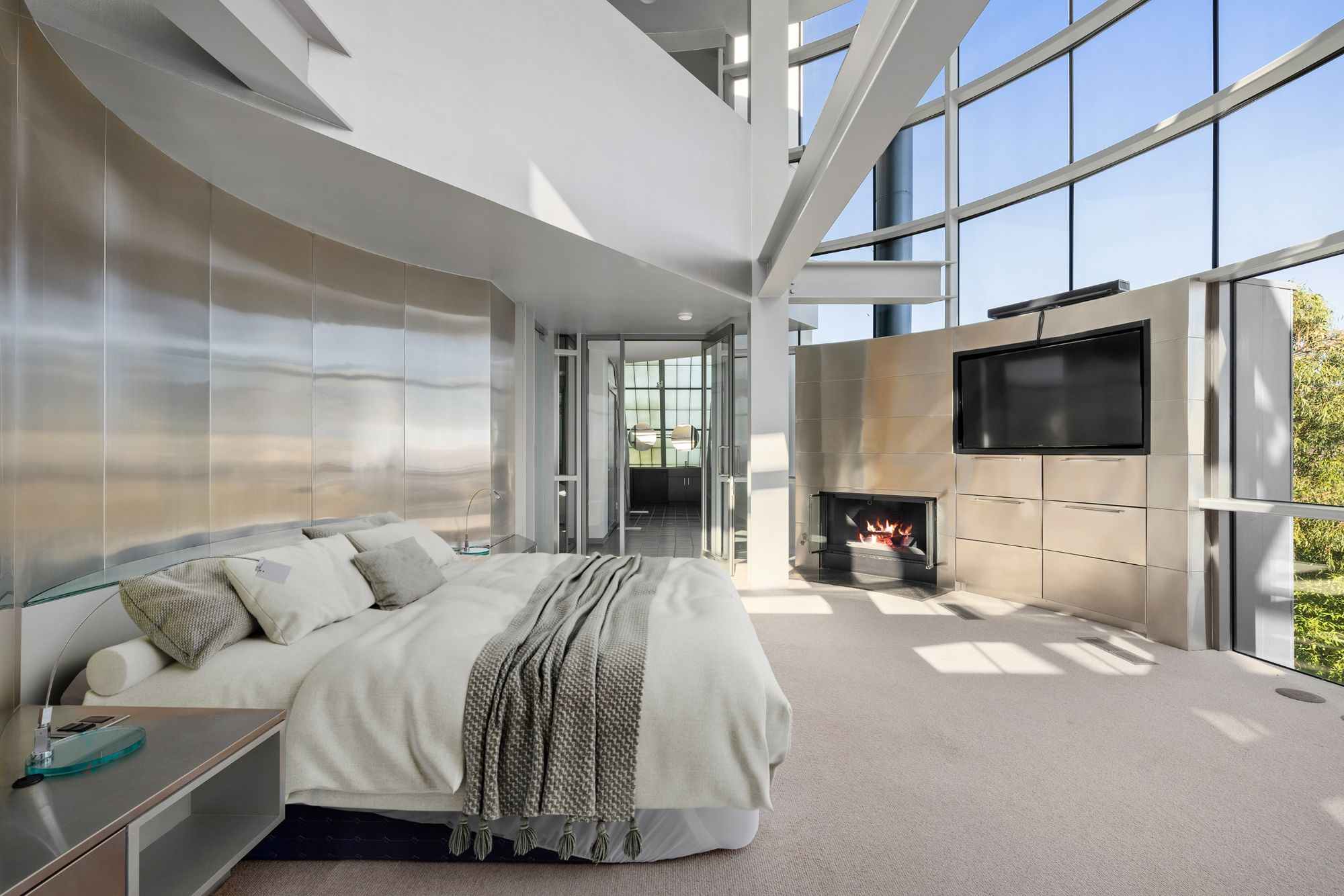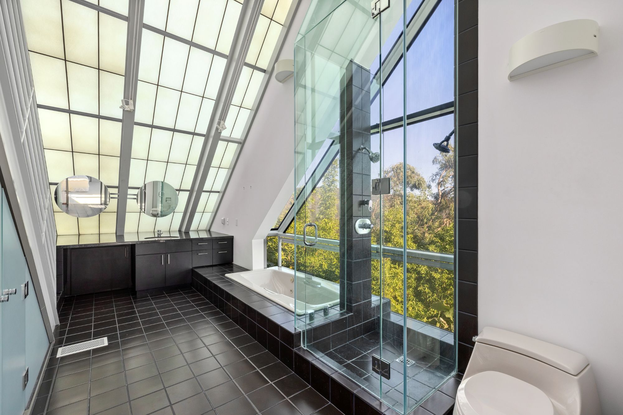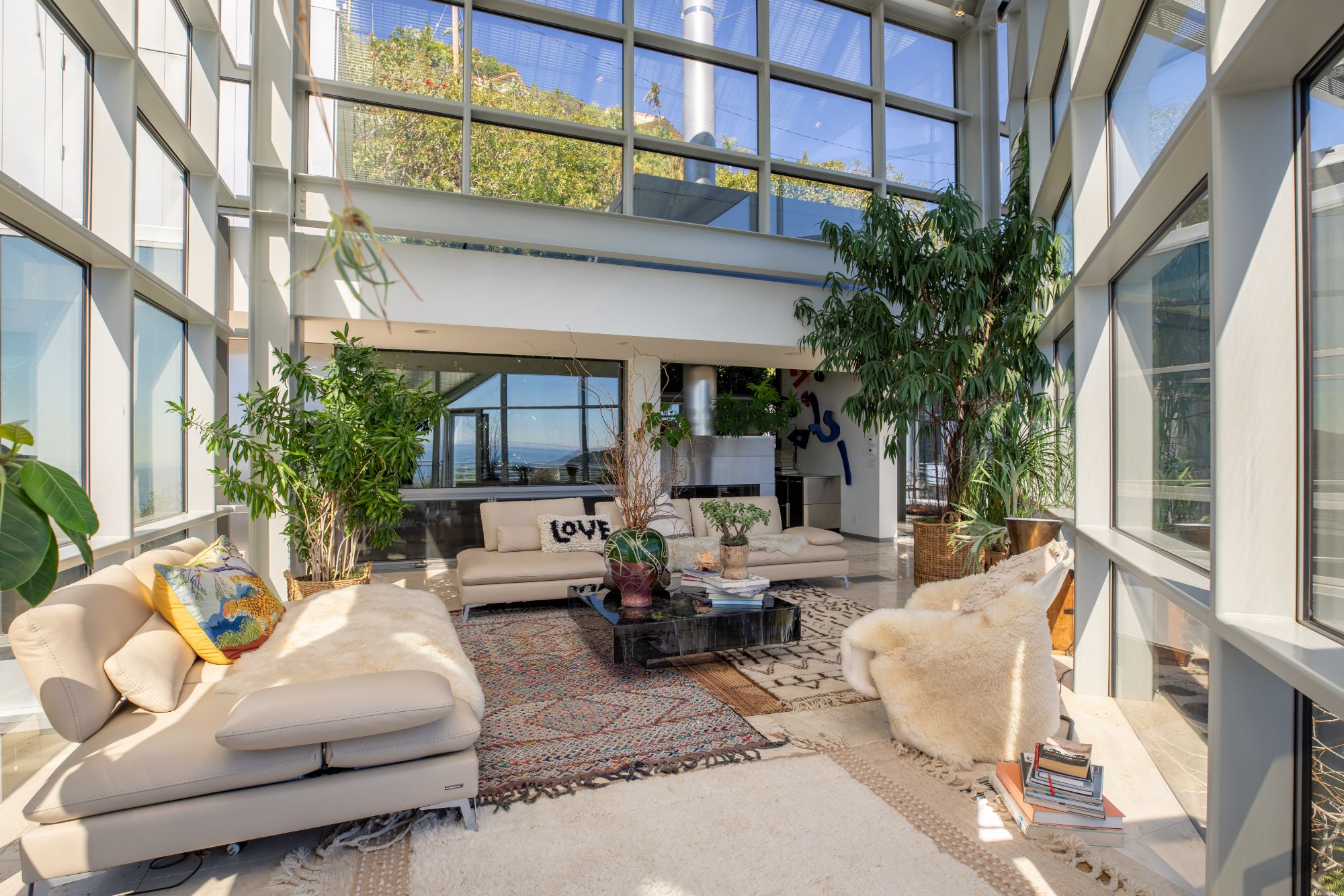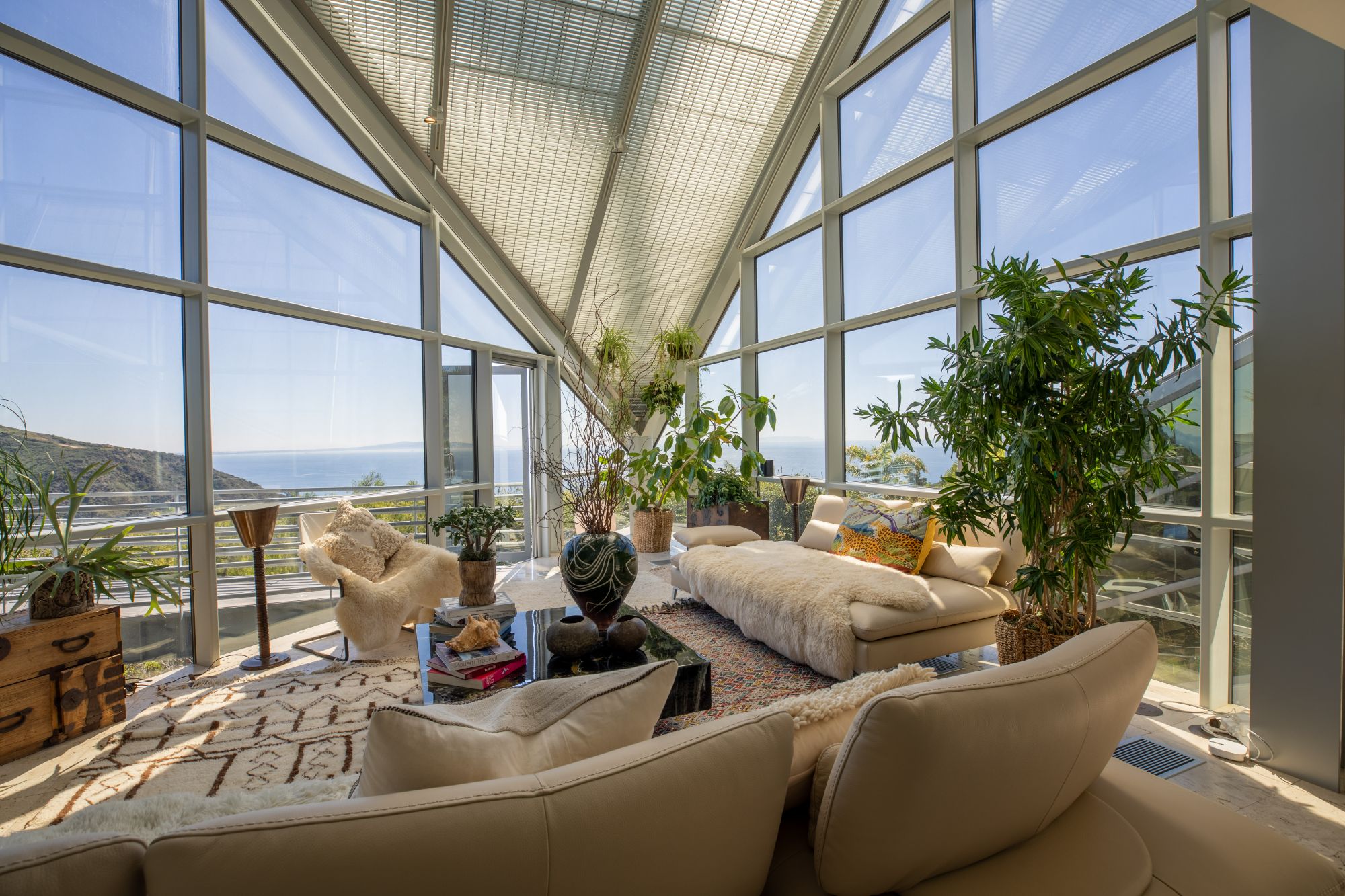 Welcome to The Power Plant by Ed Niles, FAIA: A true architectural marvel by renowned architect Ed Niles, masterfully blending glass, steel, and concrete. This extraordinary residence sits on nearly an acre of lushly landscaped grounds. Designed with precision, every room offers breathtaking, uninterrupted views of the Pacific Ocean, Catalina Island, the iconic Queen's Necklace, and the surrounding mountains.Inside, you'll find luxurious limestone floors throughout, a state-of-the-art Bulthaup kitchen, and custom Niles cabinetry. The contrast between the steel framework and the abundance of indoor greenery creates a warm and inviting atmosphere.The master suite impresses with its soaring ceilings, walk-in closet, cozy fireplace, and spa-like bathroom featuring a glass-enclosed shower, separate tub, and a mezzanine office with panoramic ocean views. A second suite in the main residence includes a wet bar and an ensuite bathroom, while a separate third bedroom/guest house below offers privacy with its own entrance.Entertainment and relaxation are key, with a private elevator providing seamless access to every level. The home is equipped with a SONOS sound system throughout, high-speed wireless internet, a 48-foot private pool, spa, outdoor lounge areas, and a gated motor court with a two-car garage. Access to Pacific Coast Highway is just a 5-minute drive via a private gated road.