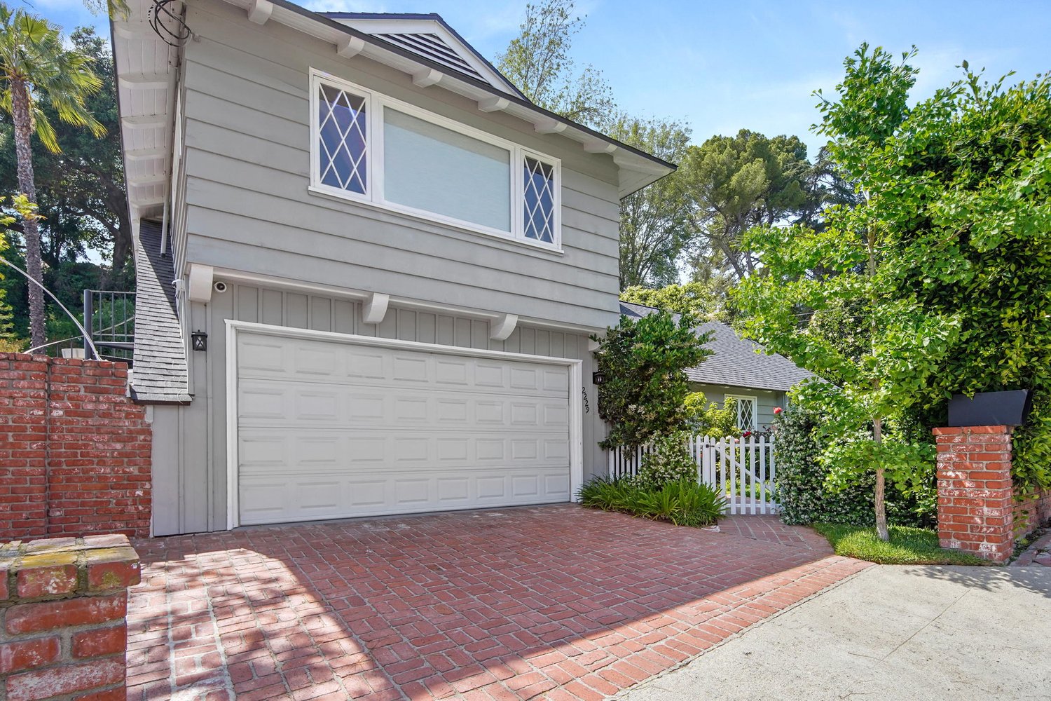 Welcome to this beautiful, extensively renovated traditional-meets-contemporary home shrouded by privacy hedges with inviting curb appeal. Red brick lines the property, complemented by mature greenery, diamond glass windows, and country white picket fence and gate enclosing the grassy front yard adorned with thoughtfully placed landscaping. A chic wood-and-glass door greets guests upon arrival. Inside, discover wood floors that flow from the living room with fireplace to the dining room and kitchen. The smartly appointed culinary center is a gourmand's dream and features a large island plus additional prep island, backsplash, gorgeous countertops, ample cabinetry, temperature-controlled wine column, and top-of-the-line stainless-steel appliances. Natural light pours through walls of glass as French doors open to the outside. The ground-level primary suite includes clerestory windows, a vibrant accent wall, doors to the rear patio, and an exceptionally designed bathroom with large glass-enclosed shower, soaking tub, and the latest in fine fixtures and hardware. Dual walk-in closets, each with built-ins, provide plenty of wardrobe storage space. Upstairs, the en-suite secondary bedrooms are spacious and filled with light, and one overlooks the rear grounds with its own private balcony. Updates include custom window treatments as well as newer appliances, fixtures, floors, walls, tiles, and high-end designer lighting. There is also AV wiring throughout, triple-zone air conditioning, and updated video security. In the backyard, dine al-fresco under the covered patio, barbecue with friends, relax in the heated spa, or lounge poolside while enjoying your own lush California paradise. Enjoy this prime location near Roscomare Road Elementary School, famous Mulholland Drive, and all the city offers.