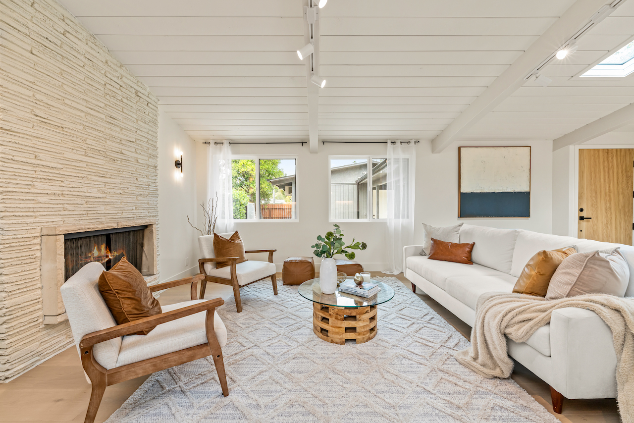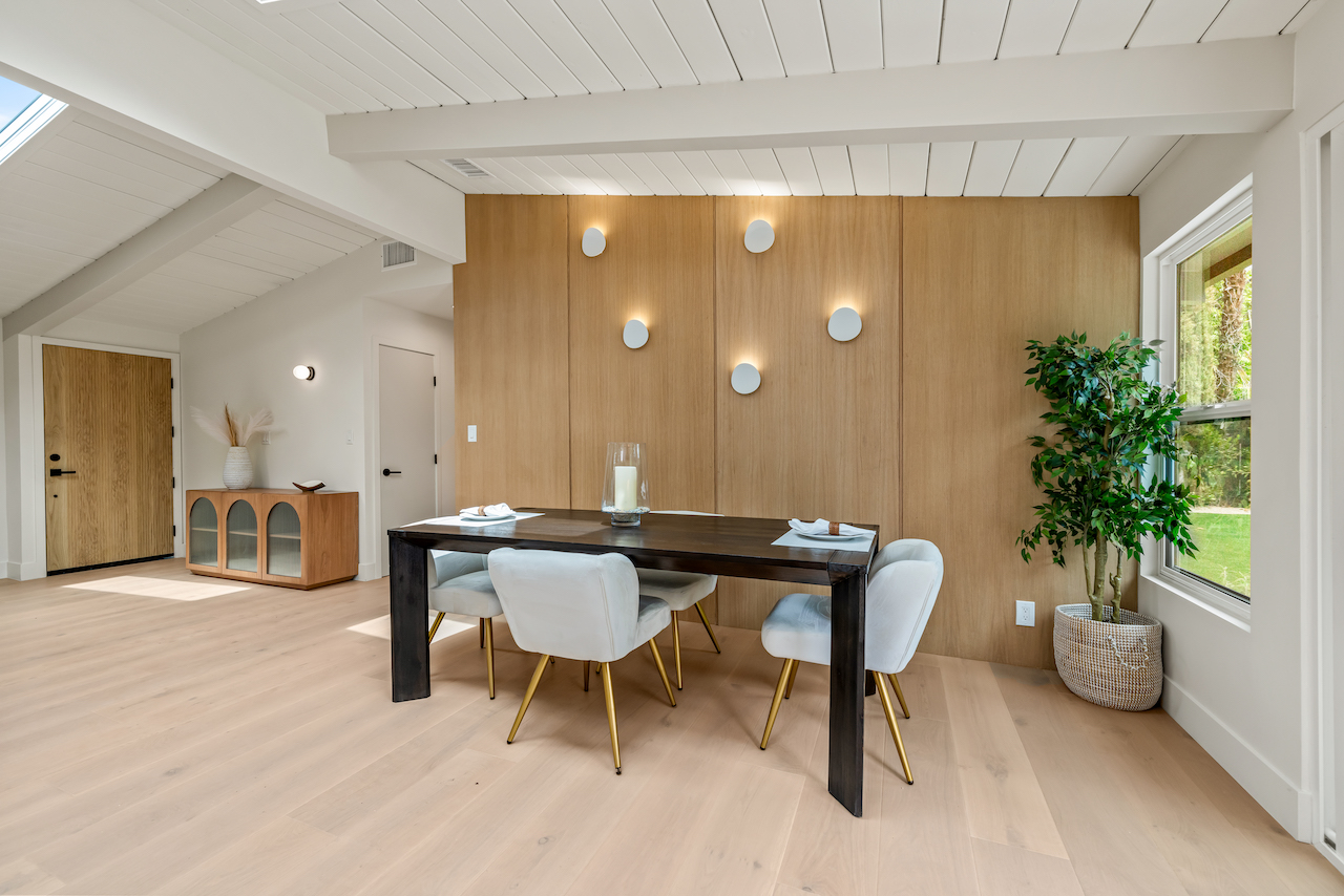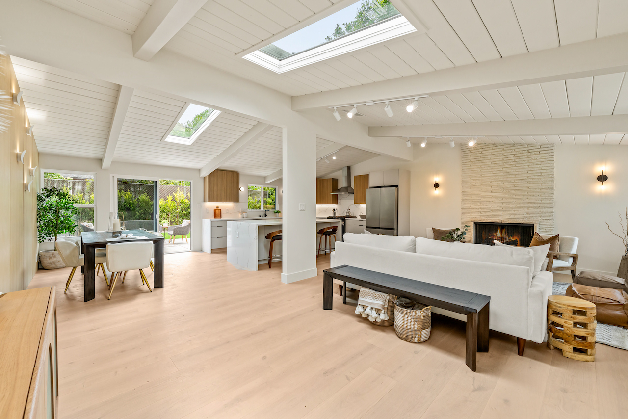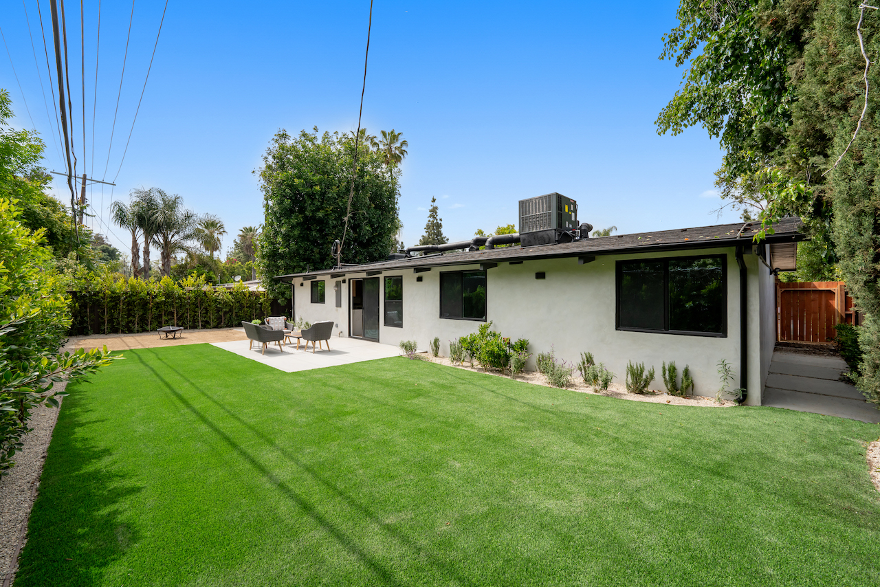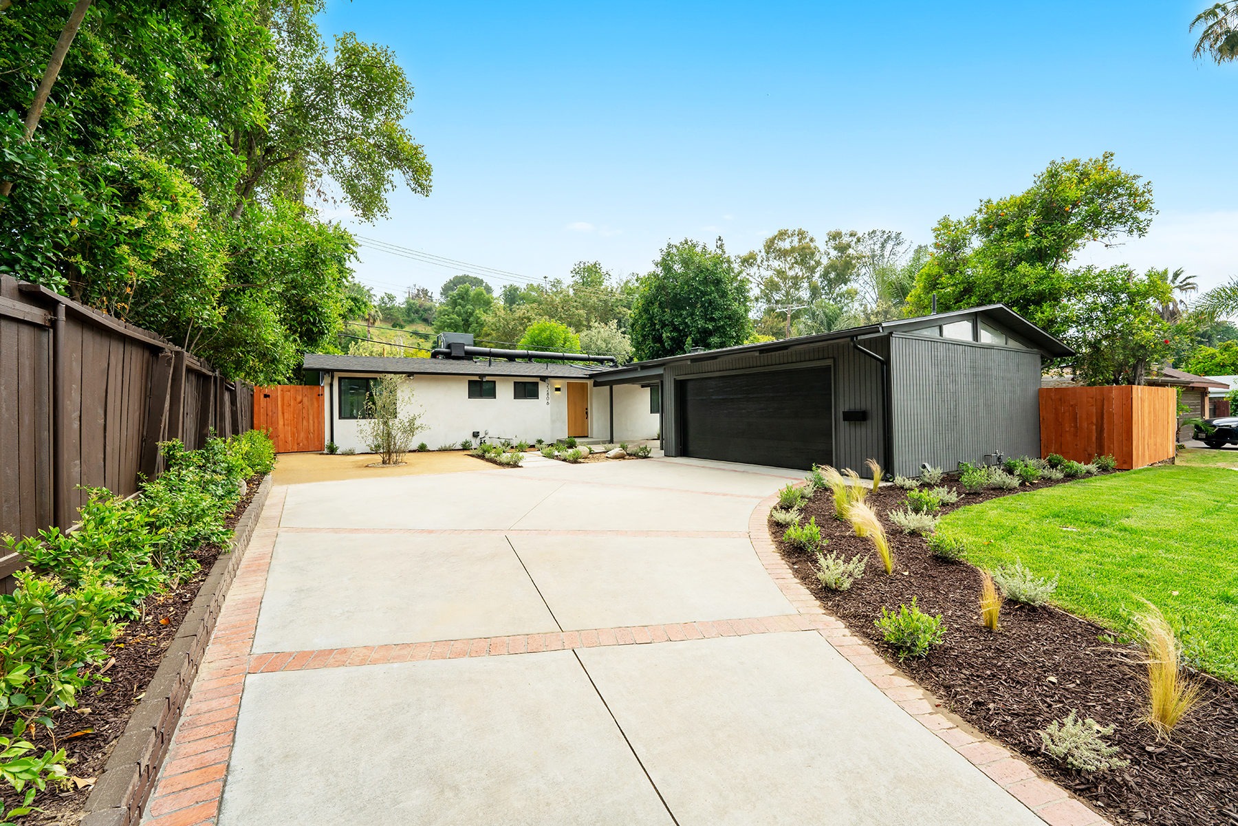 Step into your exquisitely reimagined mid-century modern oasis, a single-story retreat in the heart of Woodland Hills' most coveted neighborhood, just south of the vibrant boulevard. This three-bedroom, two-bathroom haven hits the highest mark for those who appreciate the finer things in life. As you enter through the grand designer wood door, you're greeted by a fully remodeled sanctuary where every detail exudes sophistication and comfort. The newer roof offers peace of mind, while the remodeled kitchen, with its elegant designer finishes, invites culinary creativity. The warmth of new white oak flooring flows seamlessly throughout, harmonizing with stunning white oak feature paneling and high, wood-paneled arched ceilings that elevate the home's style. The open and airy floor plan, bathed in natural light from skylights, makes every corner of this home a delight. The eat-in kitchen island, equipped with a built-in microwave and spacious pots-and-pan drawers, is the perfect spot for gatherings, while the cozy fireplace in the living area invites you to unwind on quiet evenings. Retreat to the luxurious primary bathroom, where a spa-like shower promises relaxation and rejuvenation. The attached garage, with a covered carport entry, adds convenience to your daily routine. Beyond the comfort of the home, you'll enjoy easy access to premier charter schools, pristine beaches, the 101 Freeway, and a host of award-winning educational institutions. Welcome to modern living at its finest, where every element has been meticulously curated to offer you the ultimate in comfort and style.