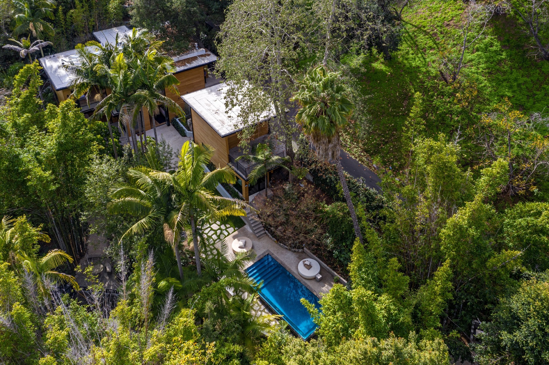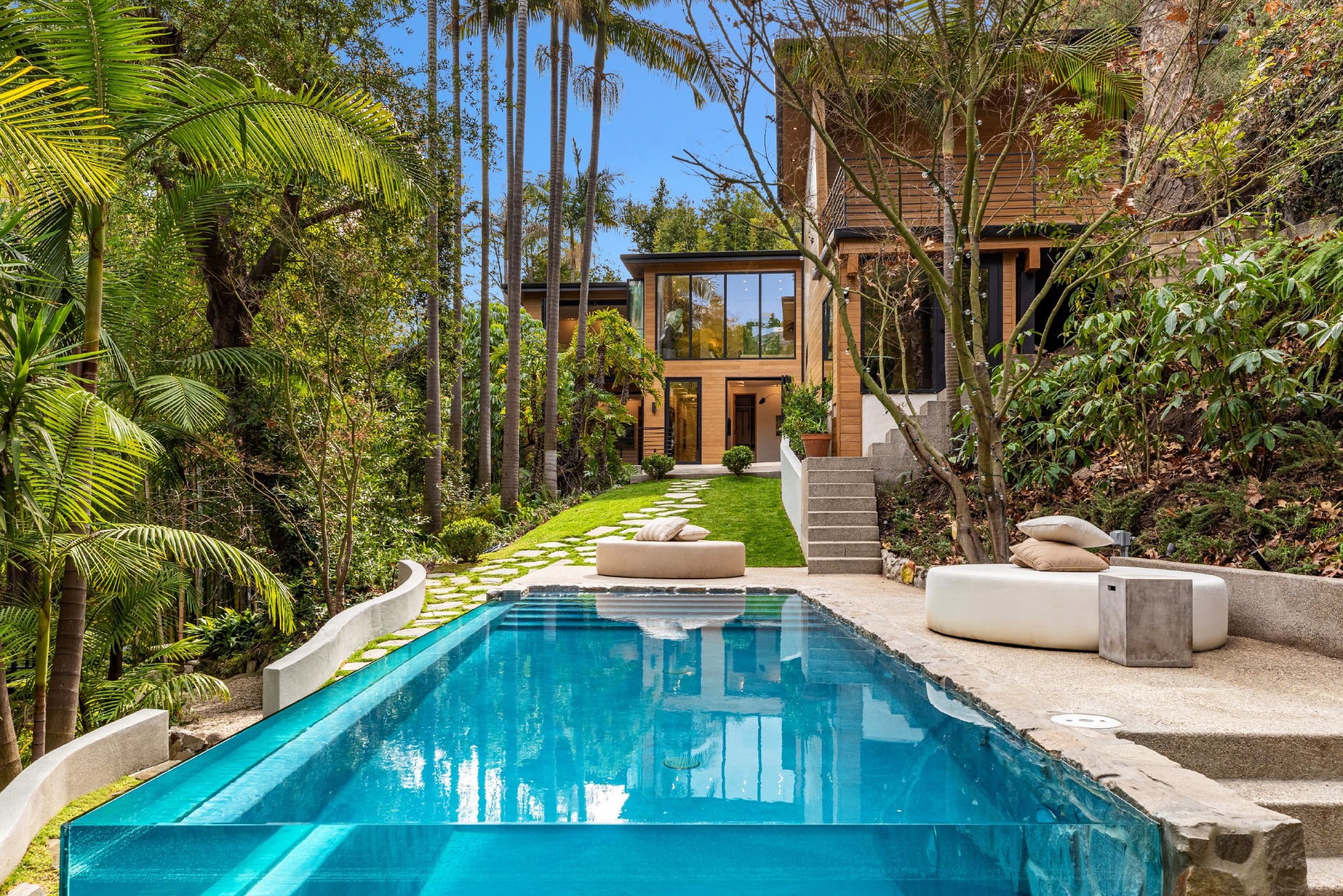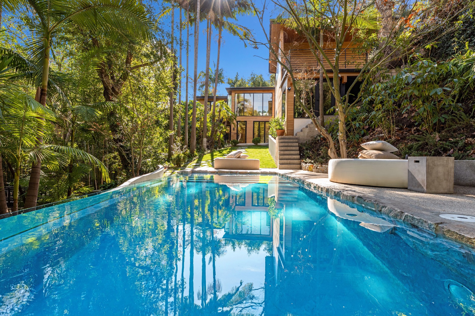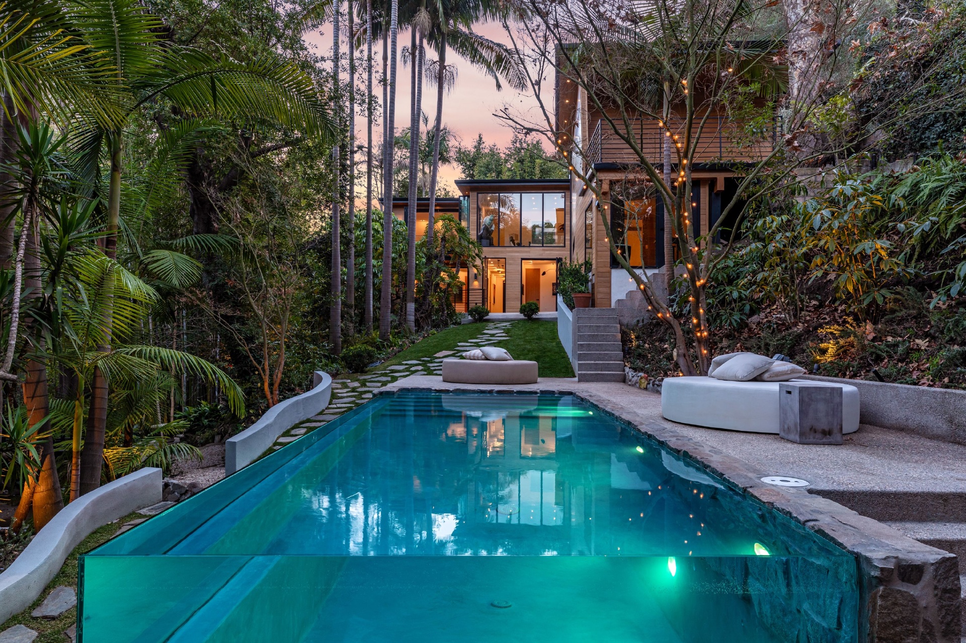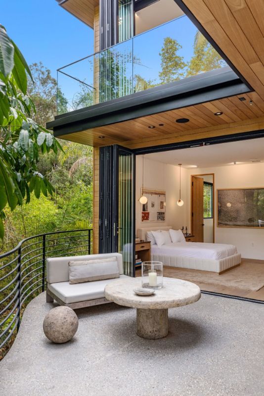 Welcome to Eight Palms, an organic modern private tropical retreat set in the celebrity enclave of Nichols Canyon. This secluded teak-clad dwelling is nestled among the trees and caressed by a trickling stream. Tucked away, yet standing proud in Nichols Canyon’s stunning natural beauty, the clean geometric lines and crisp angles of the structure lend a Zen-like quality that is punctuated by a glass sided pool, carved out of the hillside. Fully retractable sliding glass doors provide an airiness that invites all the natural elements at your whim. With an open-plan main living space and five inviting bedrooms, this sublime woodland residence will encourage you to stay home and relax. Wood, stone, glass, and rich earth tones abound, as the sounds of nature envelope you completely, creating a serene and truly harmonious atmosphere. This is the ultimate one of a kind private tropical oasis not to be missed.