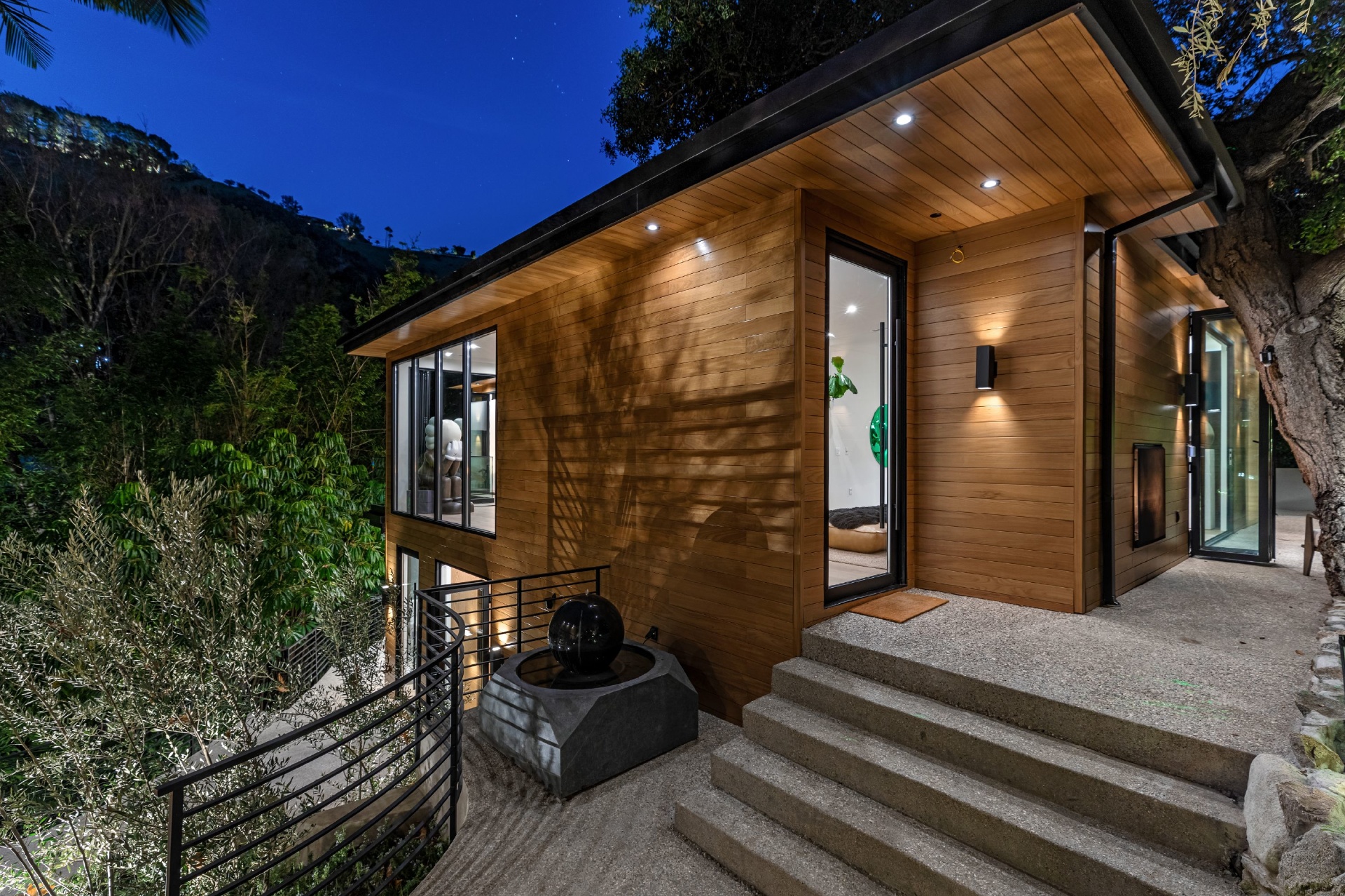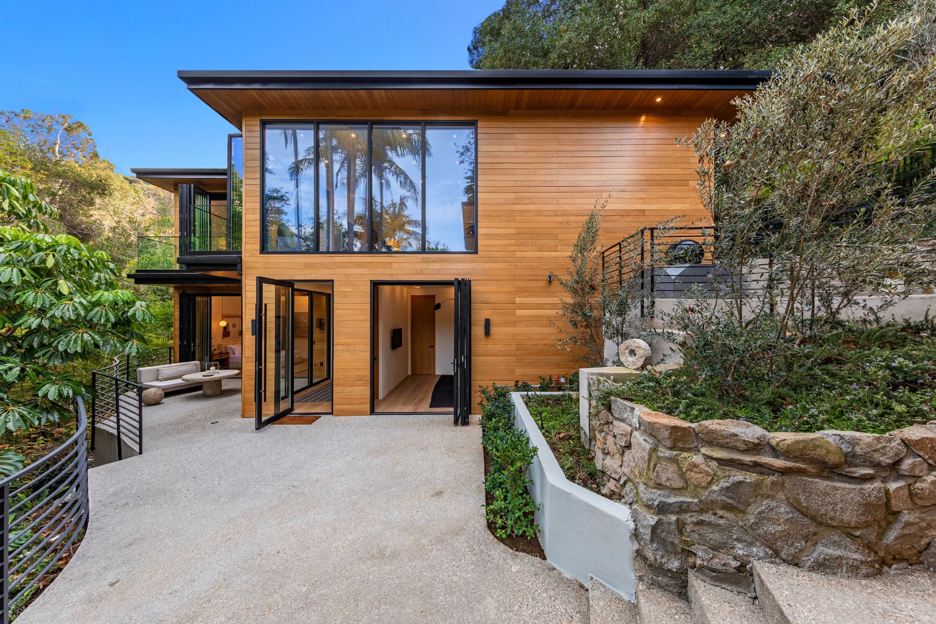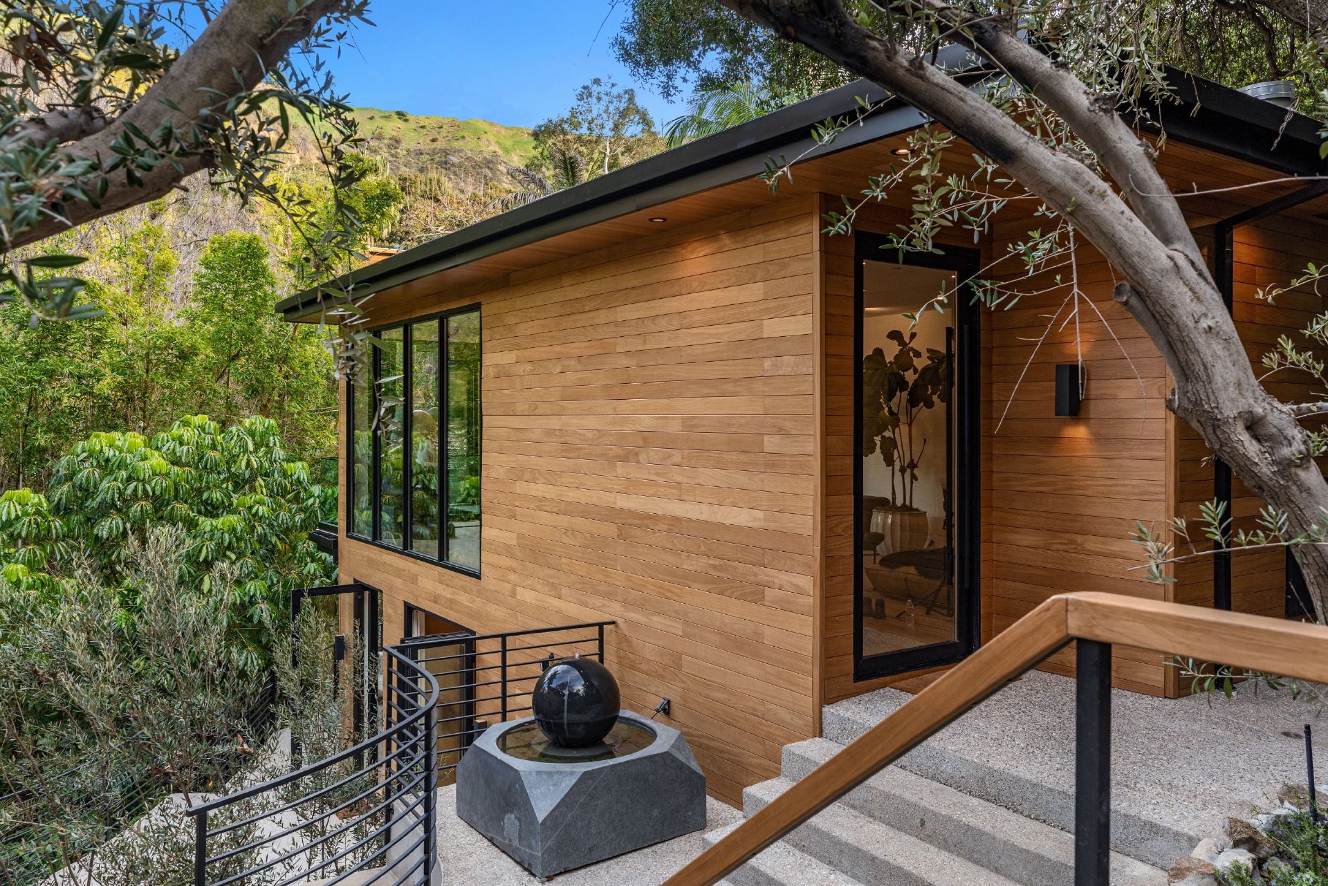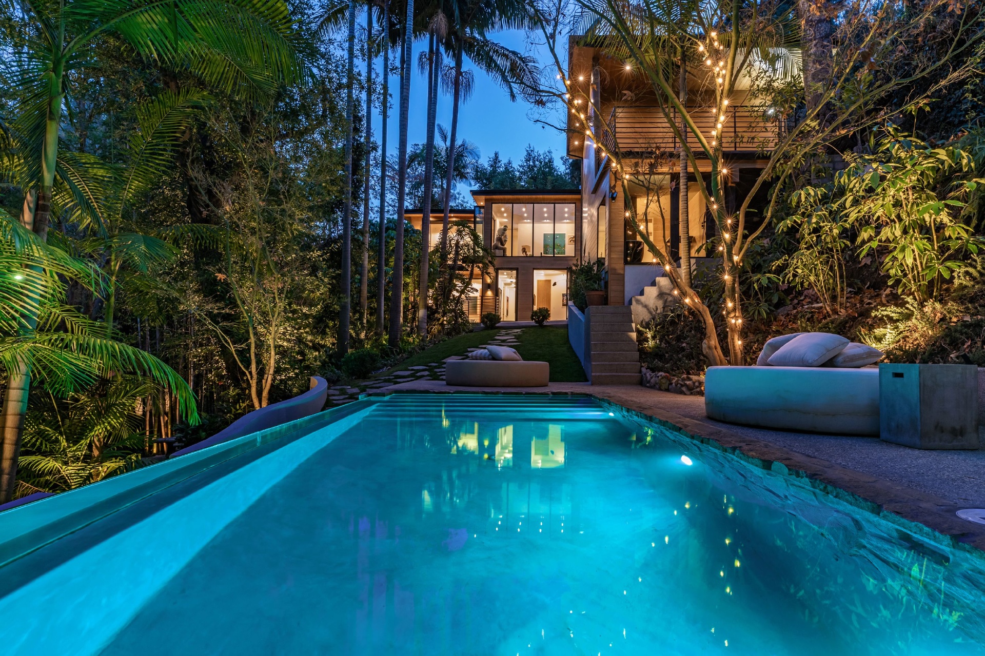 Welcome to Eight Palms, an organic modern private tropical retreat set in the celebrity enclave of Nichols Canyon. This secluded teak-clad dwelling is nestled among the trees and caressed by a trickling stream. Tucked away, yet standing proud in Nichols Canyon’s stunning natural beauty, the clean geometric lines and crisp angles of the structure lend a Zen-like quality that is punctuated by a glass sided pool, carved out of the hillside. Fully retractable sliding glass doors provide an airiness that invites all the natural elements at your whim. With an open-plan main living space and five inviting bedrooms, this sublime woodland residence will encourage you to stay home and relax. Wood, stone, glass, and rich earth tones abound, as the sounds of nature envelope you completely, creating a serene and truly harmonious atmosphere. This is the ultimate one of a kind private tropical oasis not to be missed.