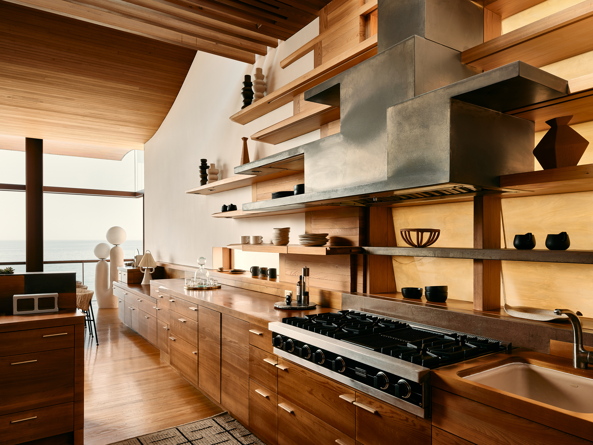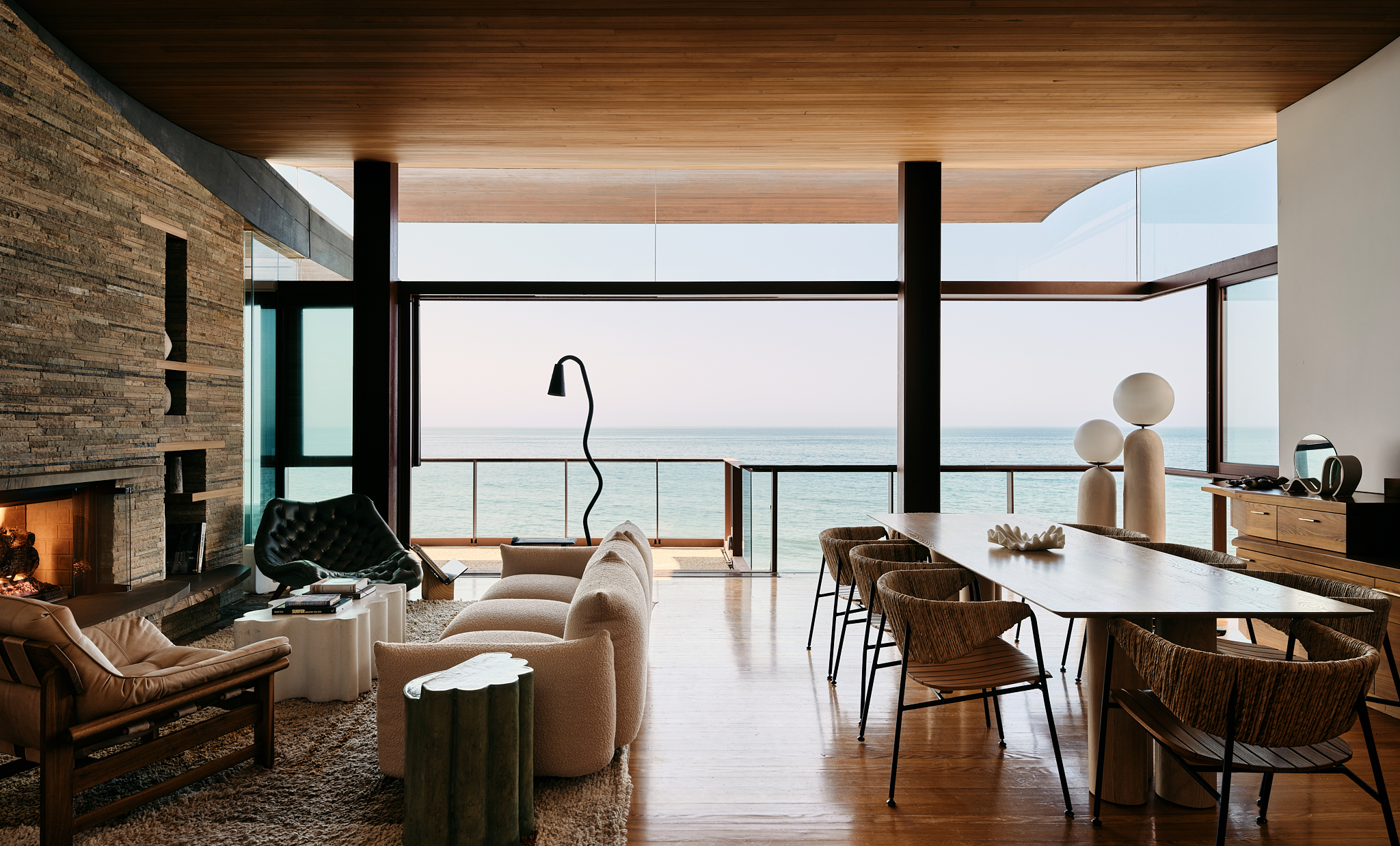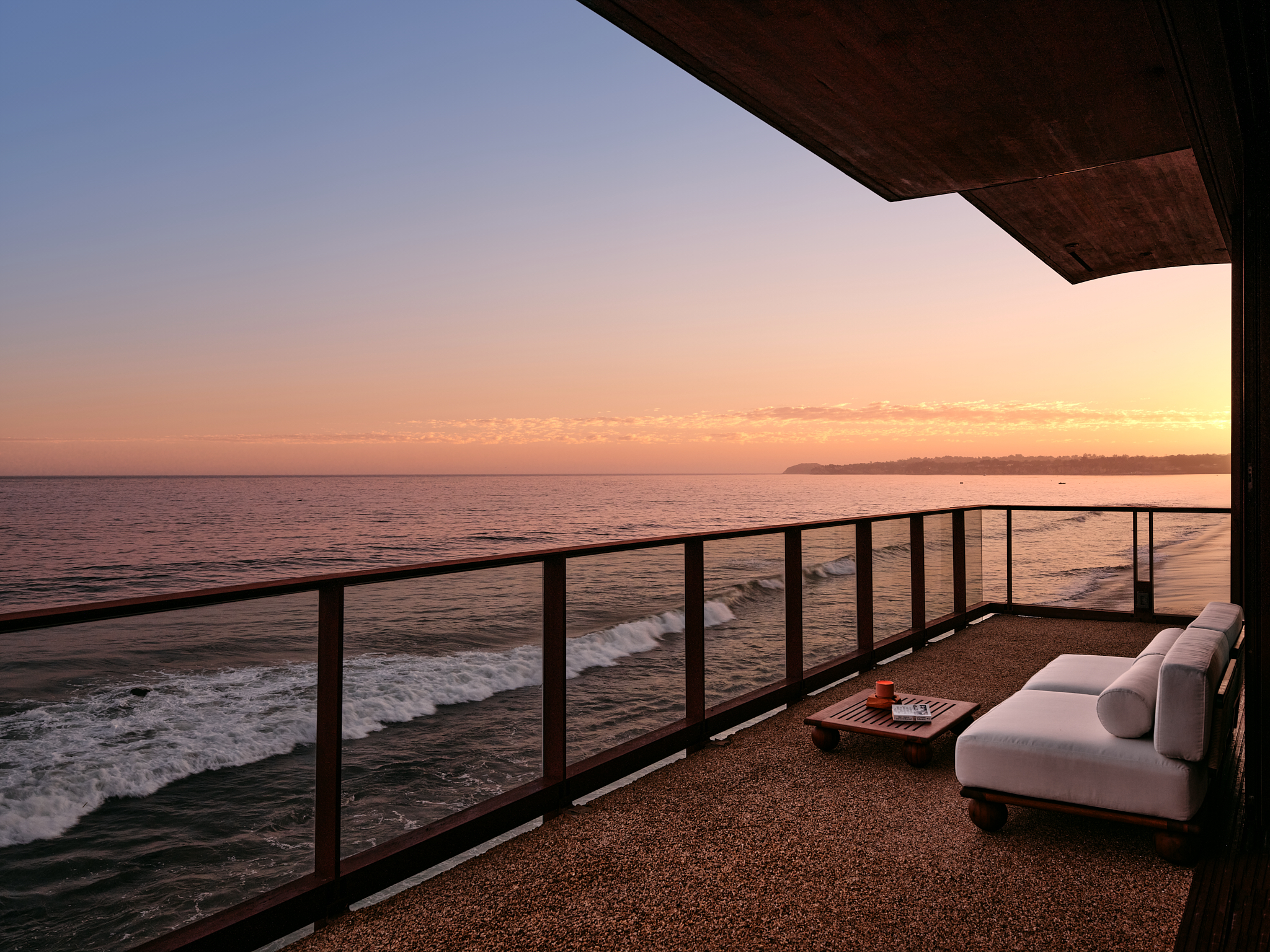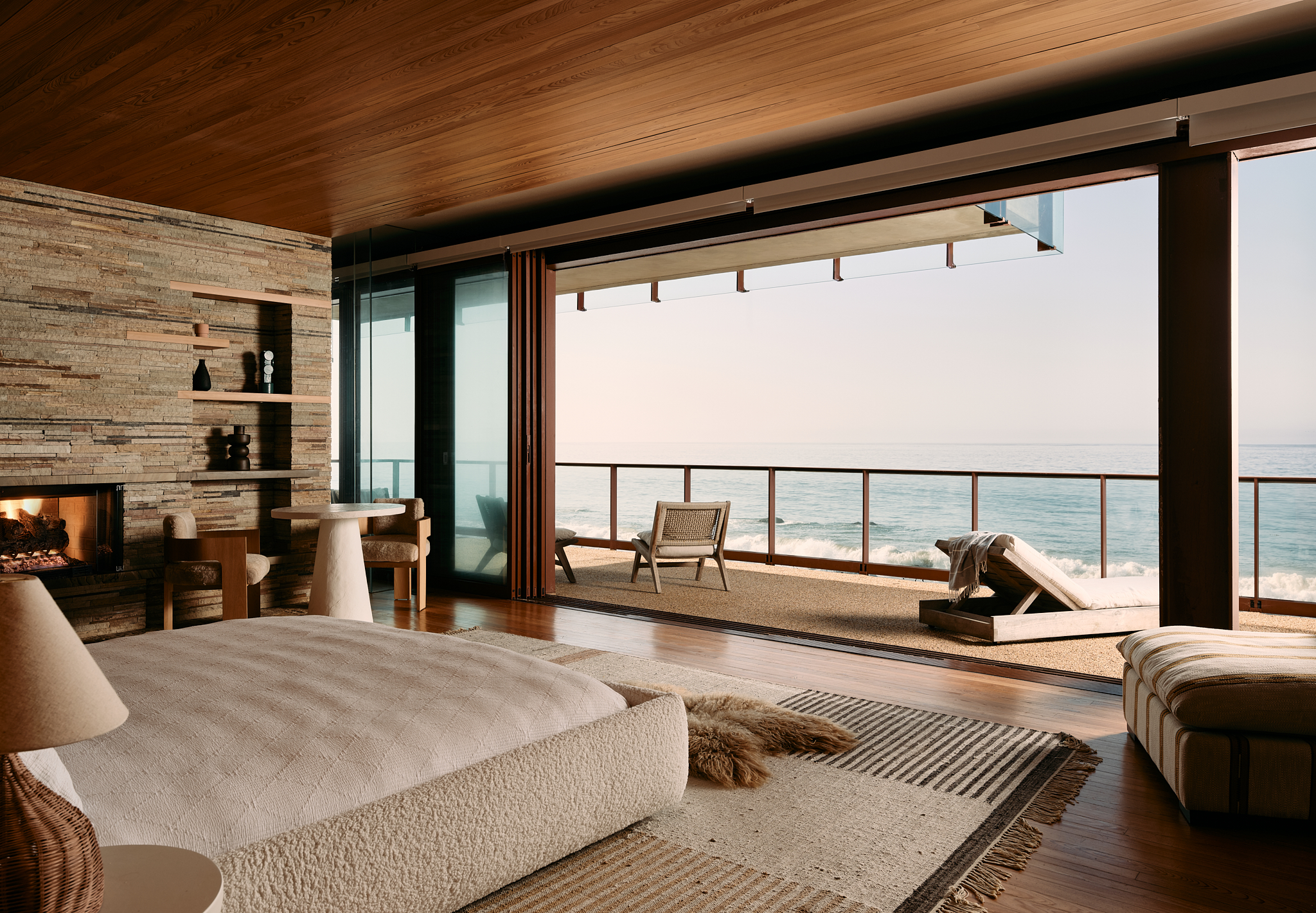 This architectural marvel features an intricate blend of vertical and horizontal planes of wood, stone, and metal, bathed in natural light streaming through sliding glass walls, strategically placed skylights, and an artistic glass floor. Designed by architect Jay Vanos, the finest woodworkers used American Southern cypress for its durability and golden hue on the floors and walls, complemented by a soaring wave redwood ceiling. With ocean views from almost every room, the home boasts a great room with a fireplace, a sitting/dining area, a gourmet kitchen with high-end appliances, and glass walls that open to an outdoor deck perfect for intimate or lavish entertaining. It includes three spacious master suites with fireplaces, luxurious spa-like baths, large closets, and ocean view decks, along with two additional bedrooms. Additional spaces include a sun-filled office/den, a cozy reading/library area, an art studio, an indoor sauna, a zen-style wellness area with sauna and cold plunge, and more. Steps lead to a lower-level surfboard storage area and provide direct access to the beach and renowned Latigo surf spot, making it an ideal home for surfing enthusiasts.