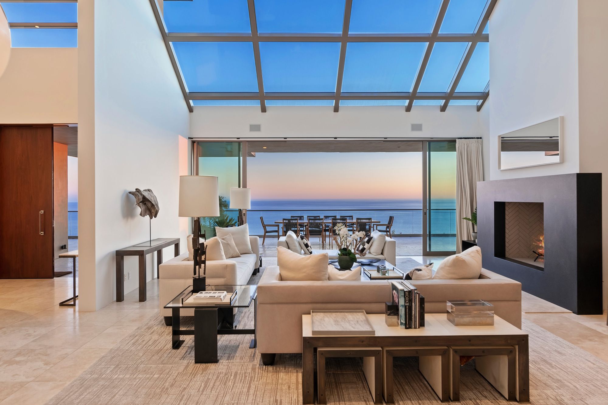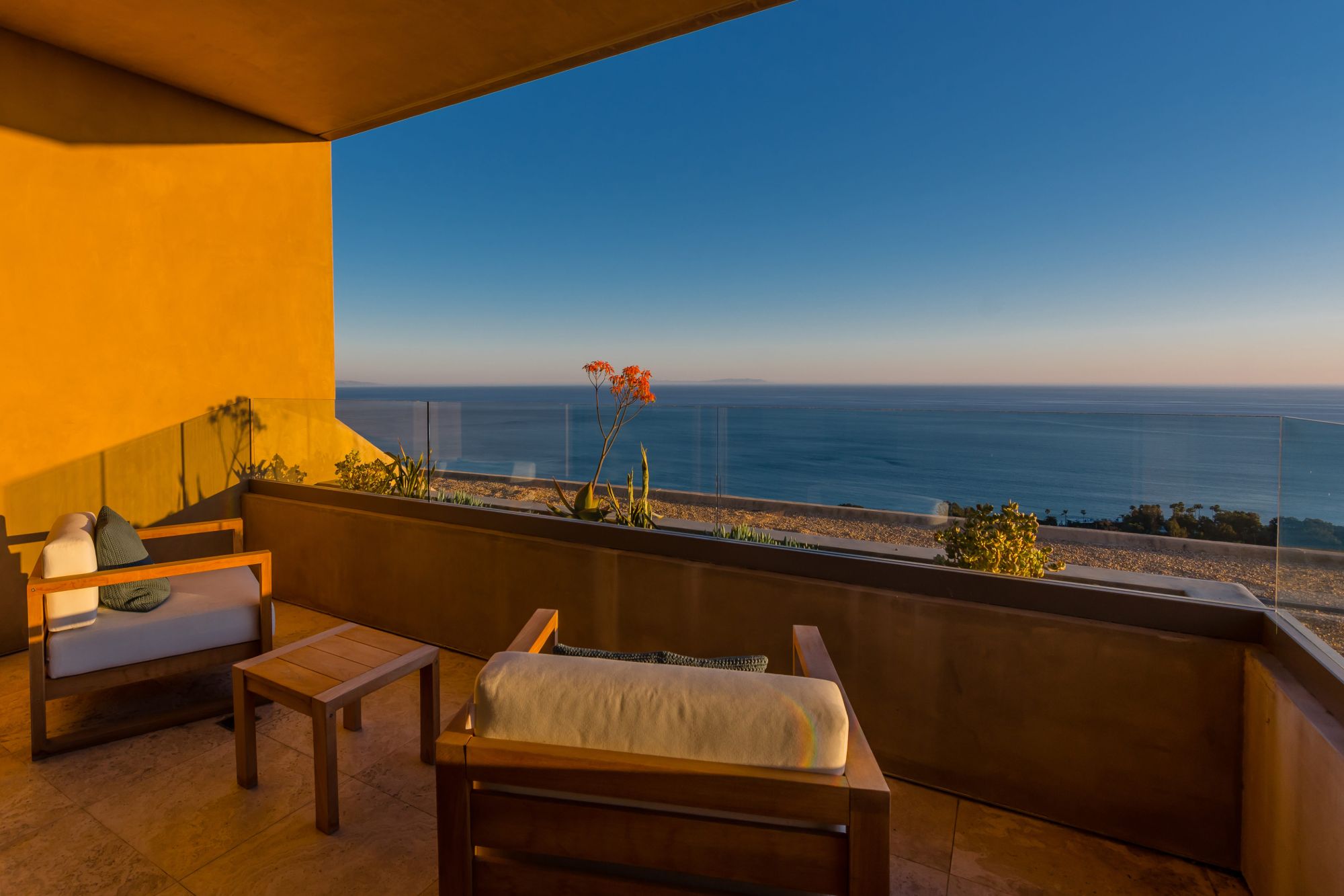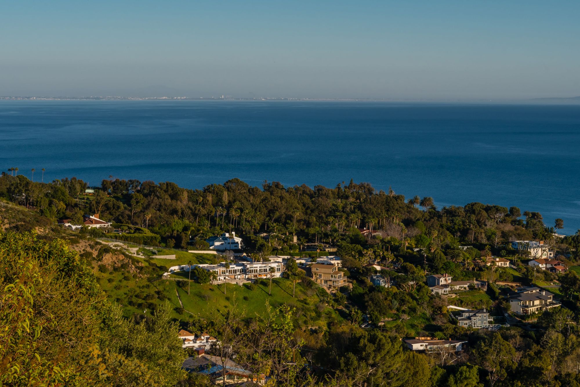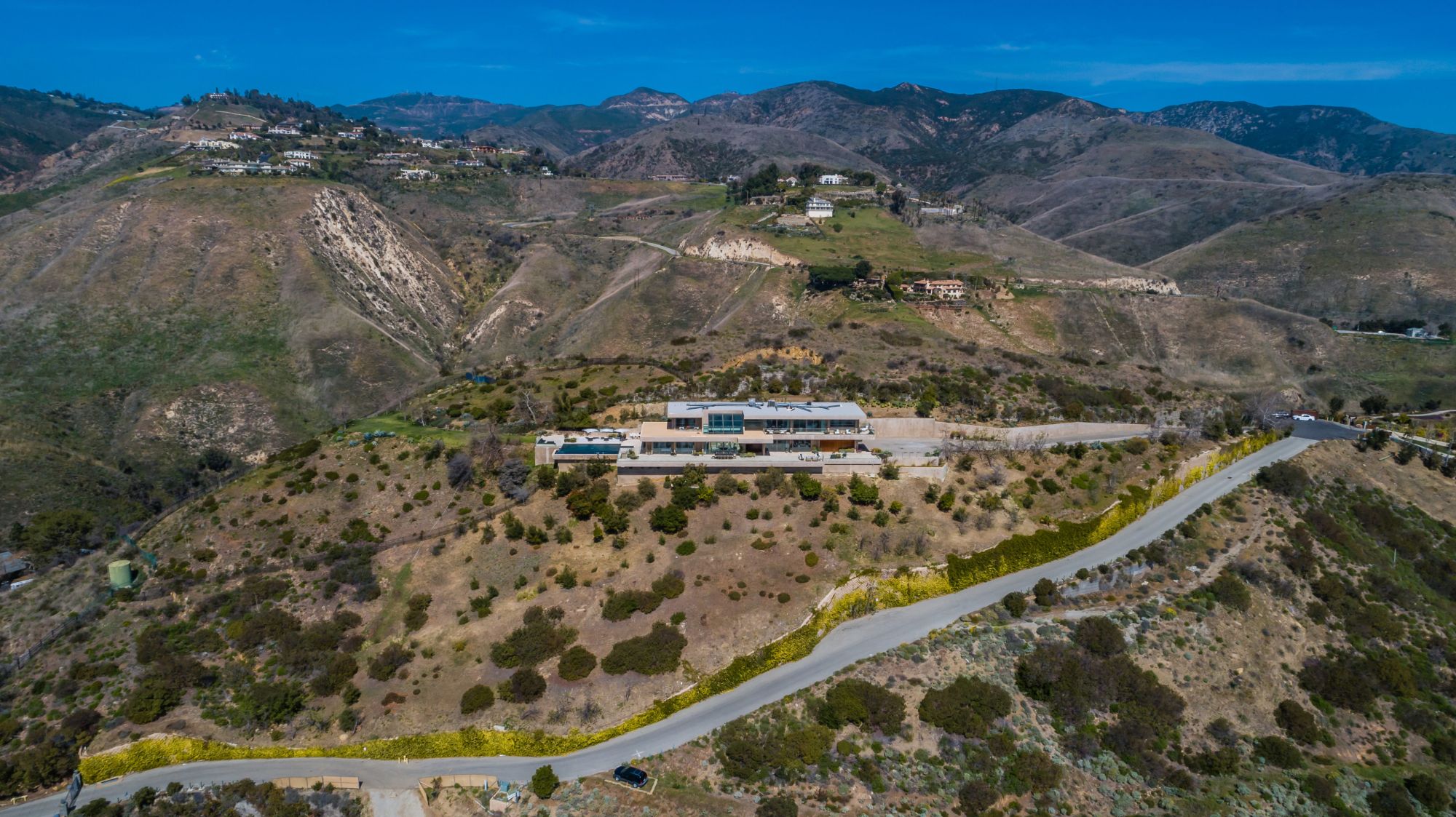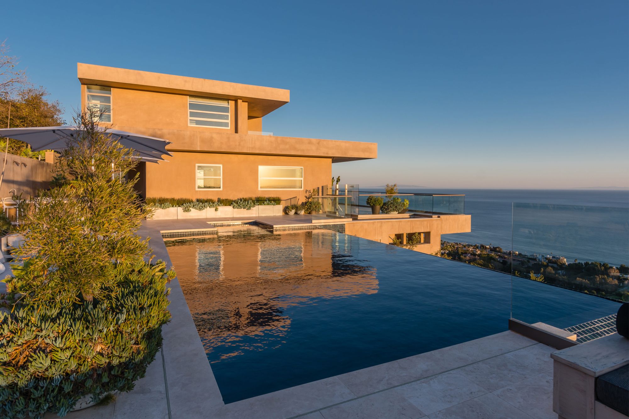 Set on approximately 15.5 acres in Malibu at the top of Winding Way, this contemporary masterpiece by architect Michael E. Barsocchini offers panoramic ocean views from Palos Verdes to Point Mugu. A double height entry welcomes you to a stunning great room featuring a fireplace, disappearing glass walls, travertine floors & an open floor plan with gorgeous views throughout. The living, dining, kitchen & media rooms all open, via wide glass doorways, onto the deck that stretches the length of the home. A floating walkway leads to the primary wing featuring a spacious suite with fireplace, luxury bath, exercise/yoga room, custom closet, office & private deck overlooking the Pacific. Three additional en-suite bedrooms with ocean views. A beautifully landscaped lawn sits beside the infinity pool, spa & BBQ area. Just beyond the pool trails leading to add'l acreage above the house allowing you to reconnect with nature. Enjoy incredible sunsets from this designer home set in the hills of Malibu.