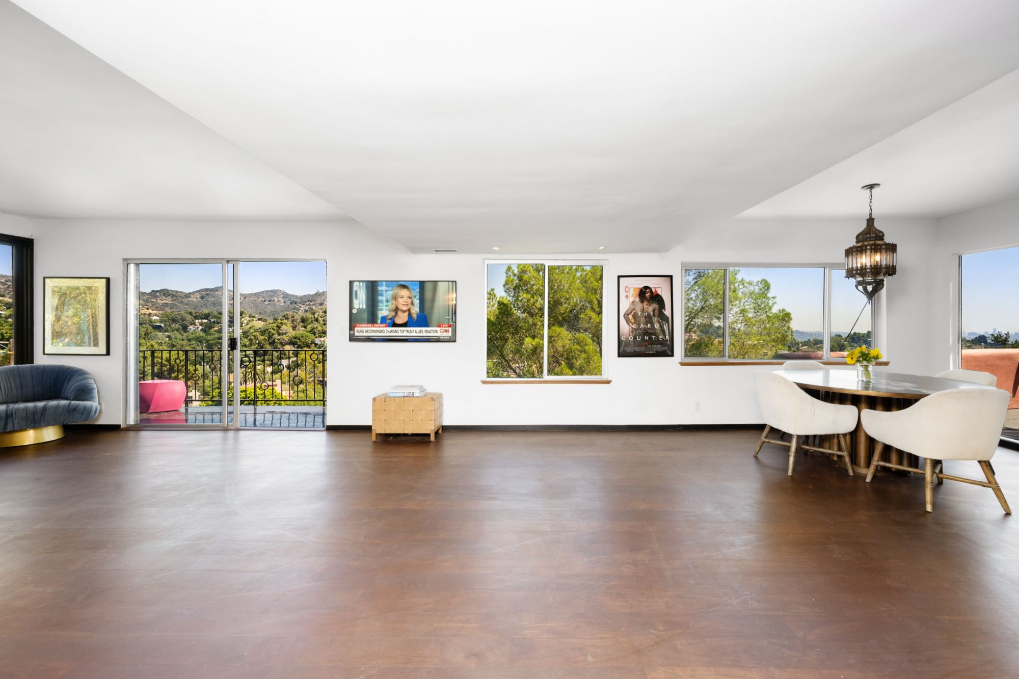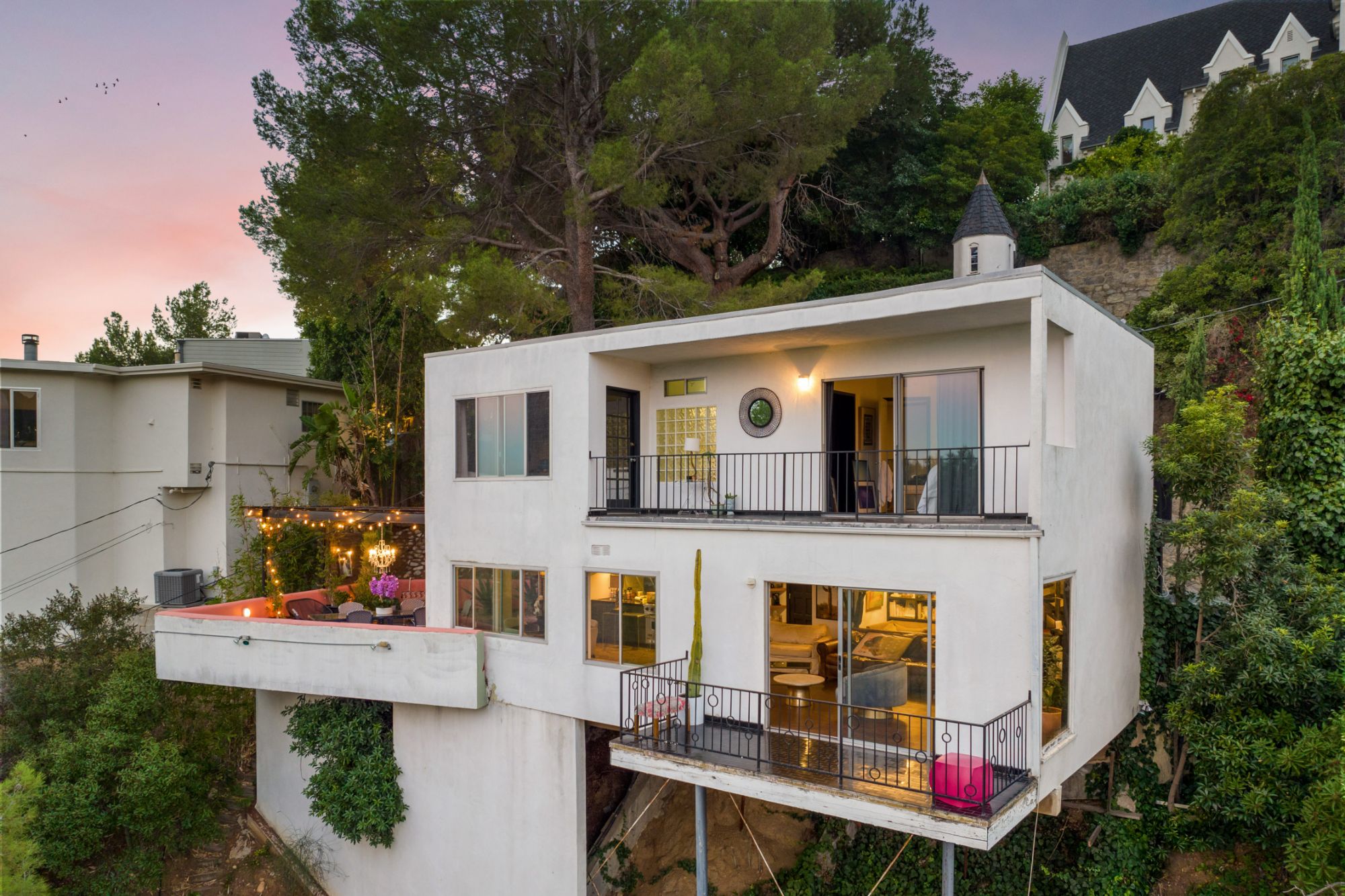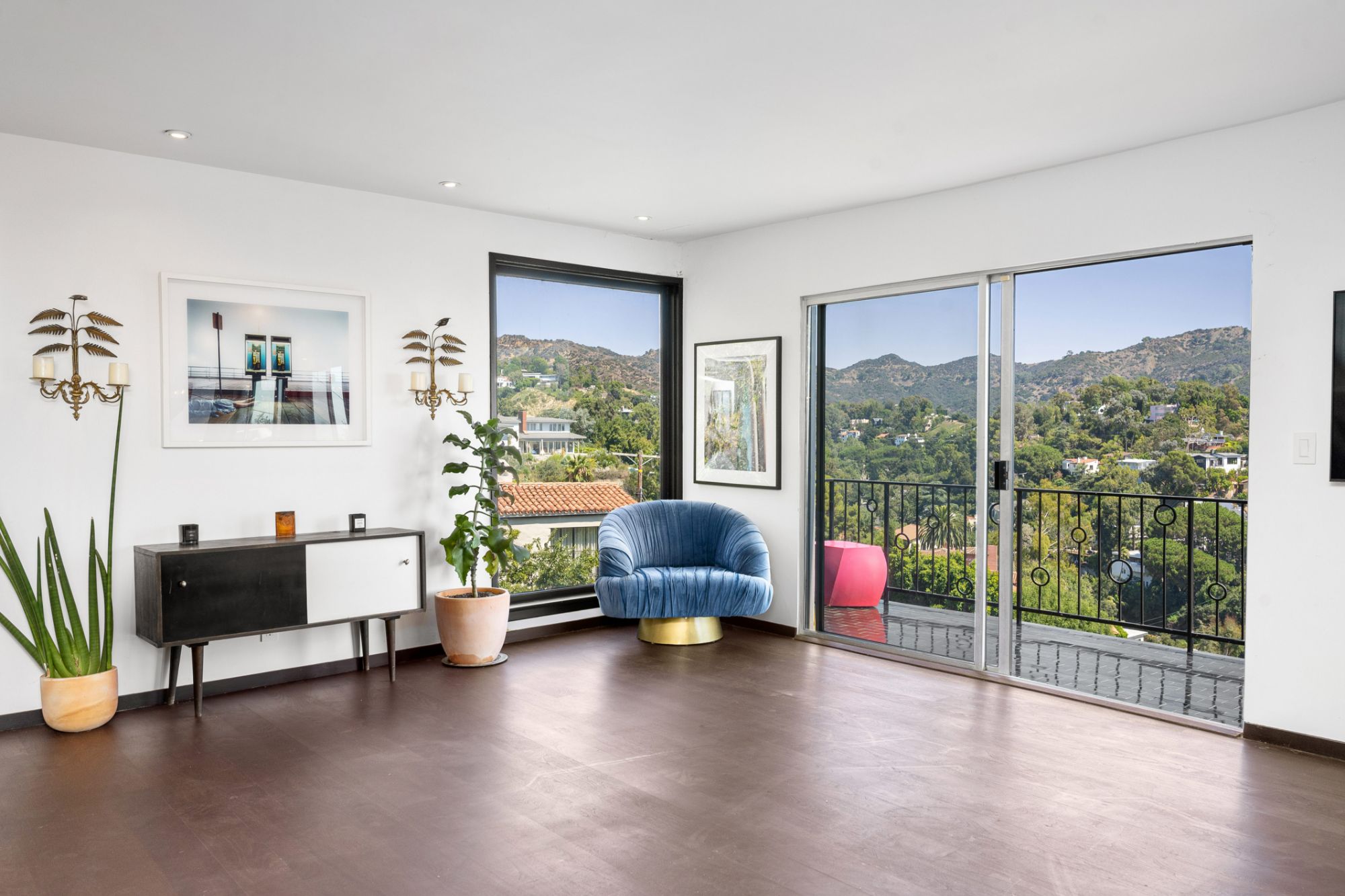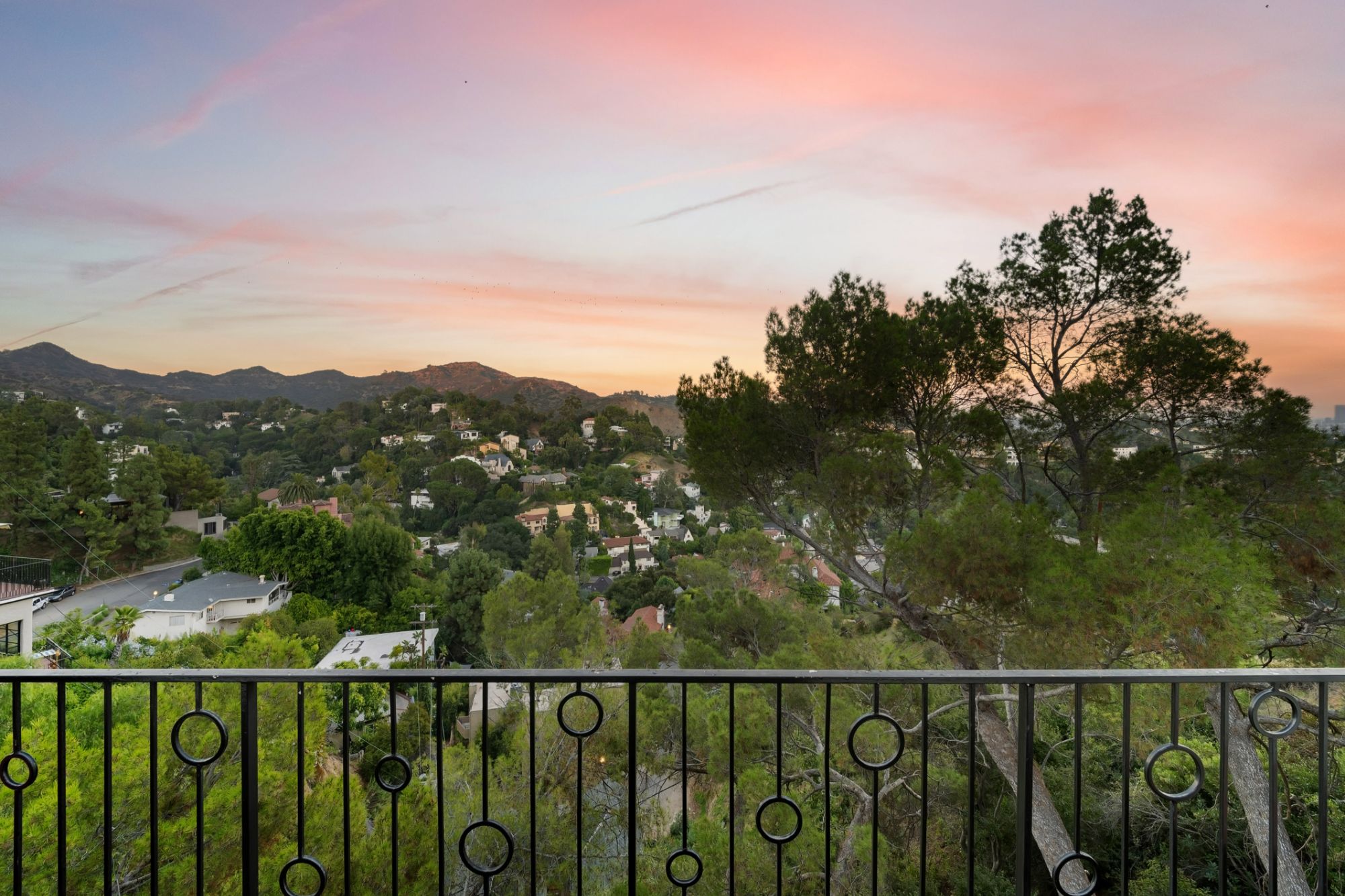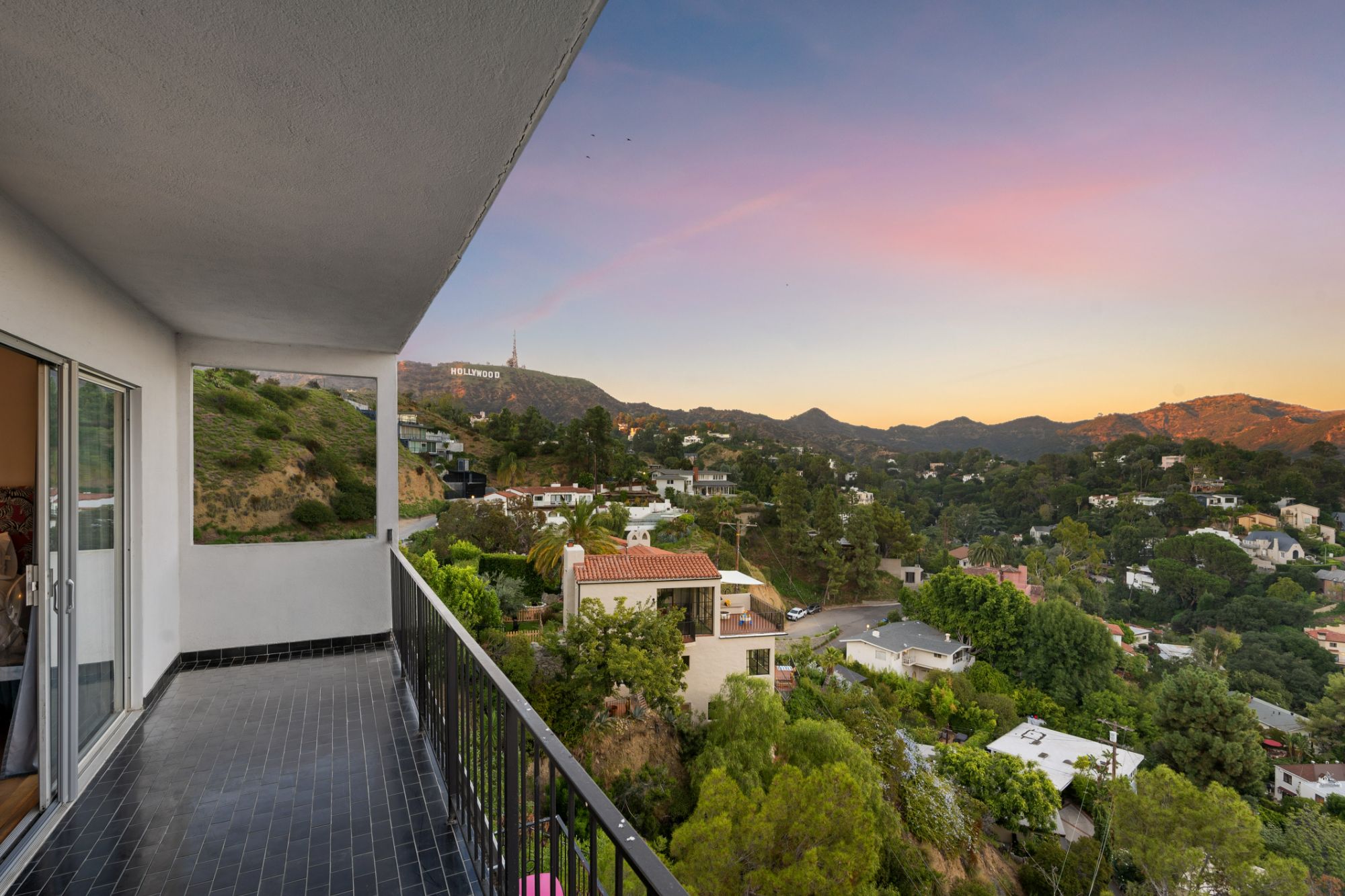 Mid Century diamond nestled in the hills of Beachwood. Every room is graced with sweeping 180 degree views from the Hollywood sign to downtown LA. Glass walls of windows create a serene sanctuary with breathtaking mountain views and a peaceful indoor/outdoor flow. Gorgeous walnut floors, custom cabinetry, and floating architecturally modern steel and pebble staircase encapsulate this two bedroom, two bathroom that defines of style and distinction. Two tiled balconies and expansive outdoor living room surrounded by exotic bamboo, greenery and trees. This incredible gem is located steps from the legendary Wolf's Lair Castle and scenic Lake Hollywood.