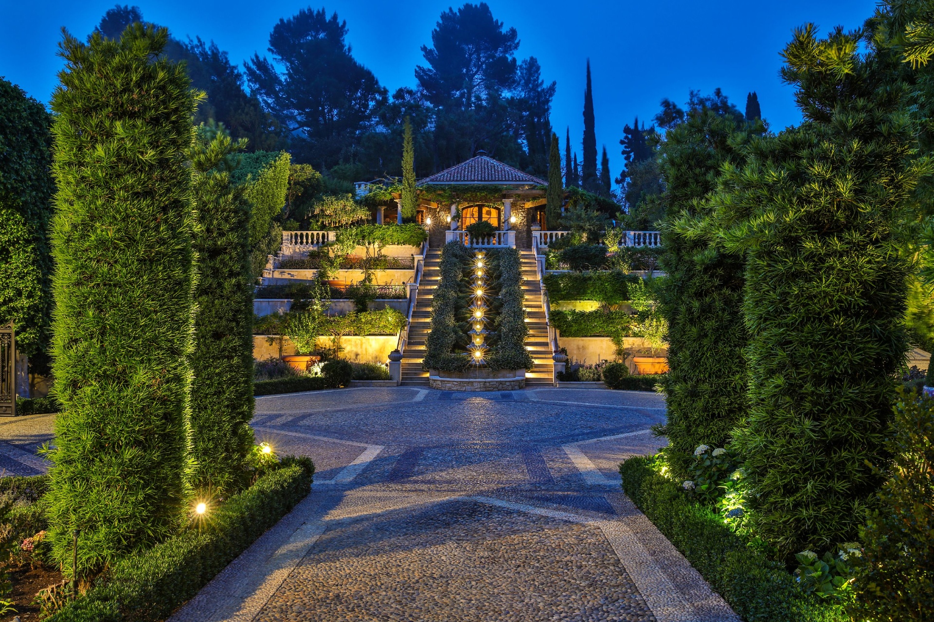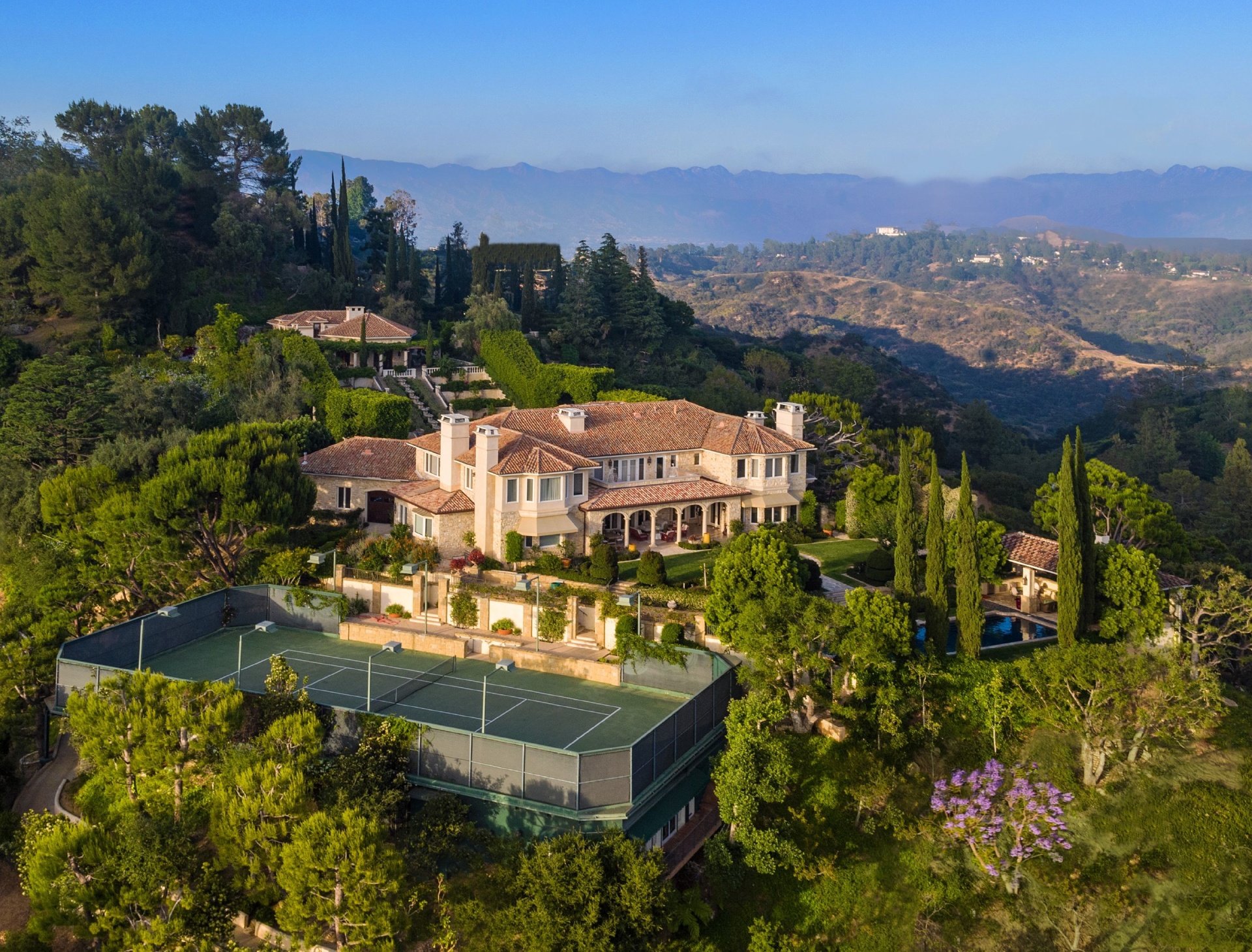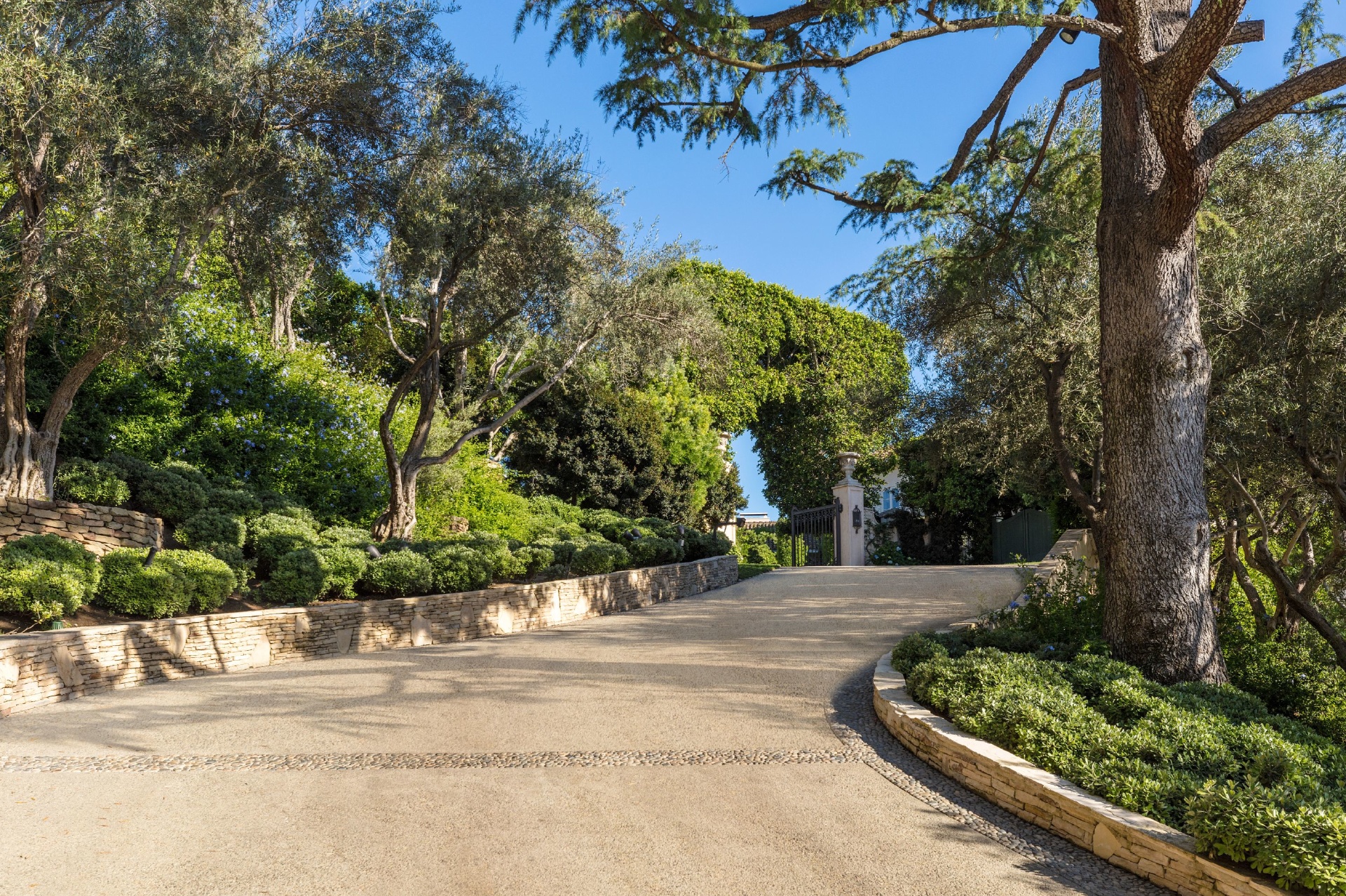 Nestled over 5 verdant acres in the hills of Bel Air rests this hidden estate, transporting all who enter to the enchanting countryside while moments from the city. Offering total privacy for the most discerning, property sits at the end of a quiet cul-de-sac within an exclusive enclave, behind gates that open to a motor court flanked by the magnificent main house & cascading water feature/upper pavilion. The extensive grounds, comprising of 2 legal parcels (each 2+ acres w/separate APNs), encompasses 2 detached guest houses (1,000 & 3,000 sqft), N/S tennis court, pool cabana & lush expanses of lawns, gardens & paths leading to secreted troves w/soaring views. The main dwelling, w/high ceilings and bright, light-filled spaces, is perfectly proportioned to accommodate large-scale entertaining and nurture harmony in everyday living. A sense of warmth pervades throughout, complemented by rich detailing & panoramic views while offering all the amenities of a premiere, first-class estate.