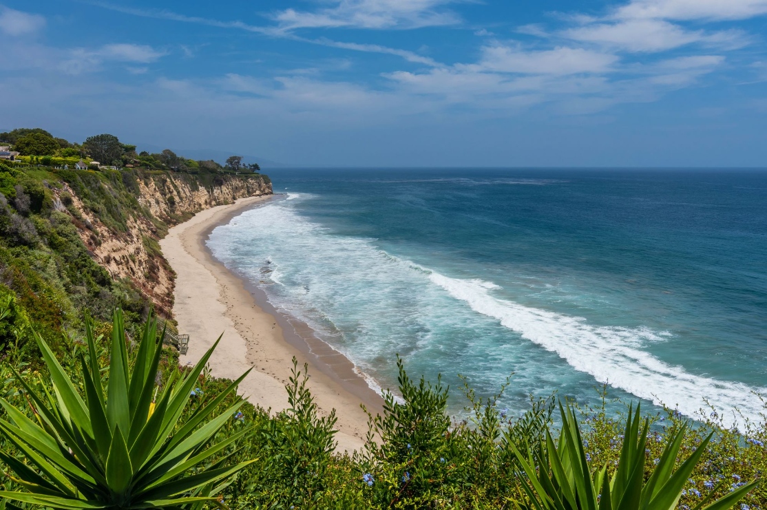 Perfectly situated for panoramic vistas, light and spacious gated Mediterranean villa on Pt Dume bluff. Open interior, expansive grounds for casual living and sophisticated entertaining. High ceilings, skylights, walls of glass, hardwood floors, multiple ocean-view patios and decks, pool/spa, lawns, trail to Big Dume Beach. Enormous living room with wood-plank ceiling, windows on three sides, stone fireplace with seating, decks outside; large family/media room/library with bookcase walls and projection screen, huge dining area, wet bar. Skylight kitchen has wood cabinets, marble countertops, hammered copper stove hood, breakfast bay seating with windows. Sensational pool-and-ocean-view master with trussed ceilings, fireplace, spa-style bath with glass-block wall. Indoor spa with massage room, Jacuzzi, cold plunge, sauna. Fountain motorcourt entry with ample guest parking, paddle tennis court, and separate guesthouse with full kitchen. This is Malibu living at its most comfortable.
