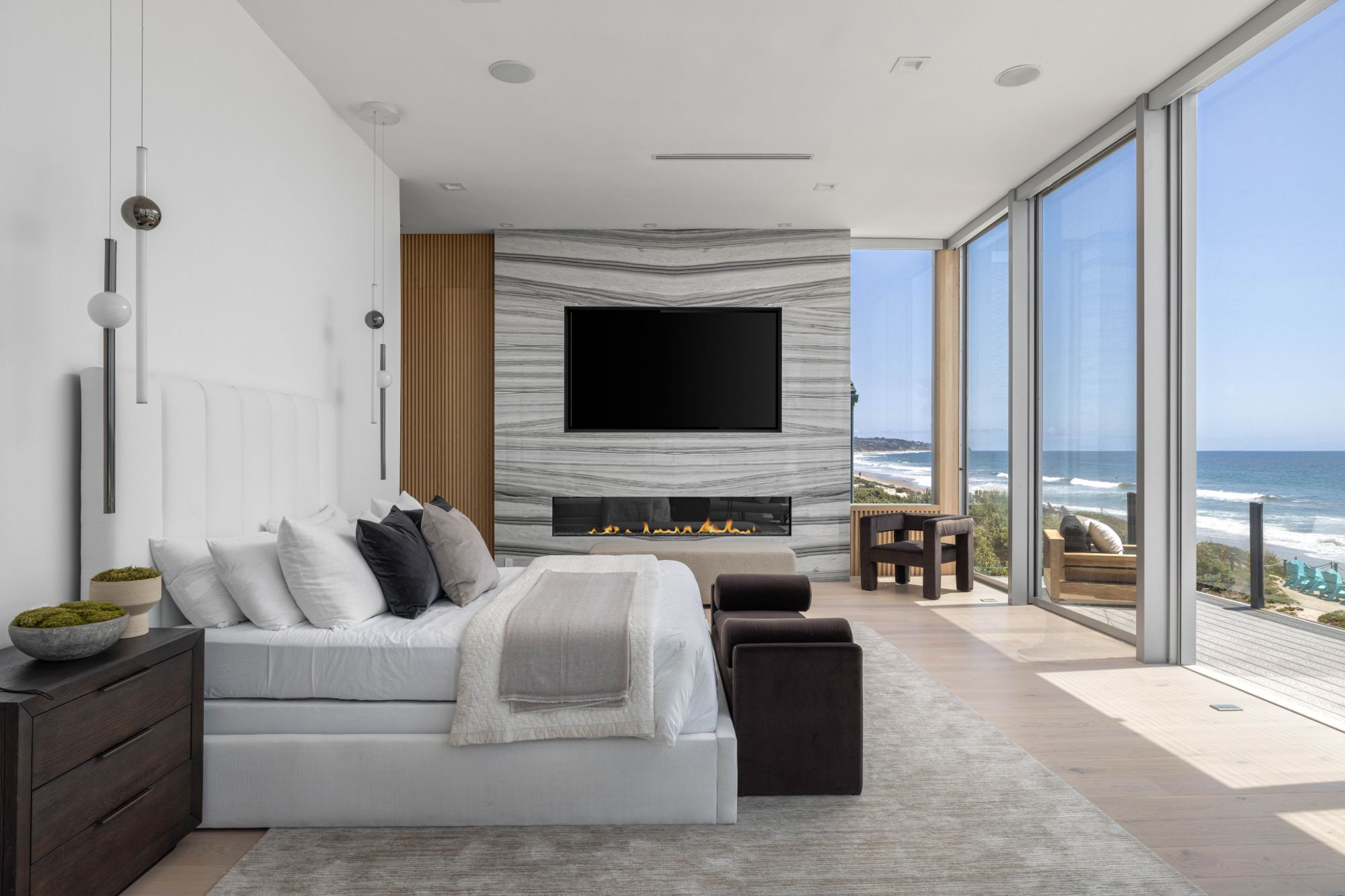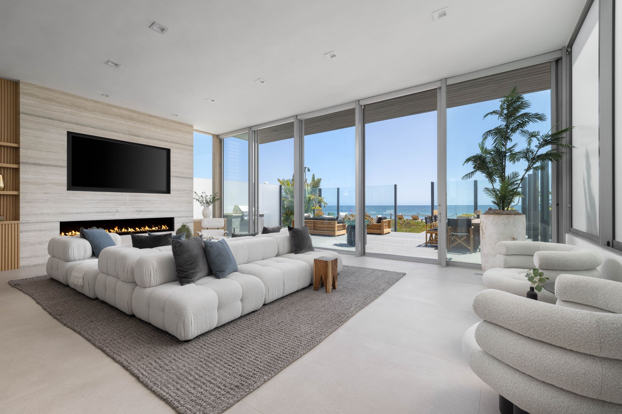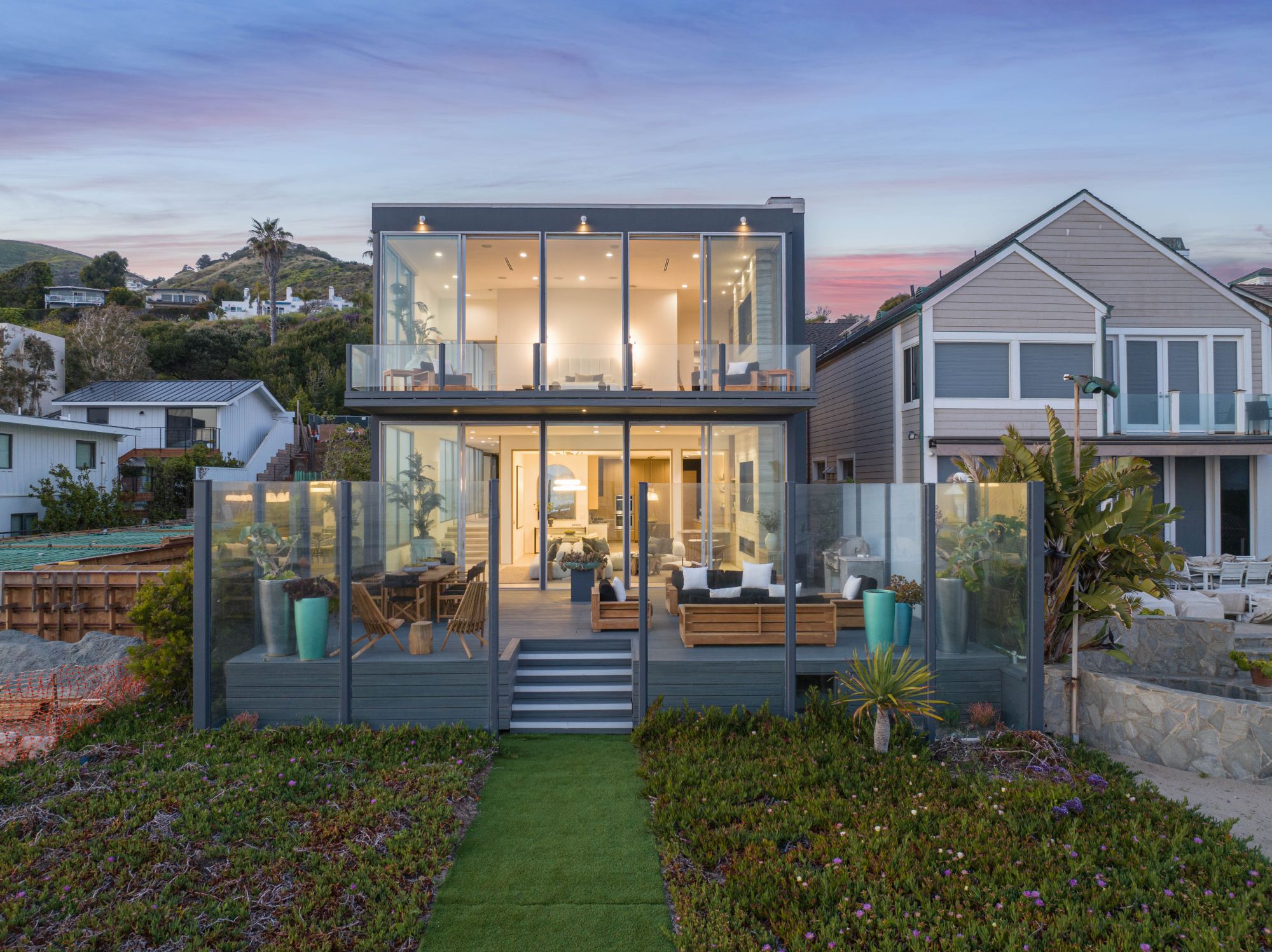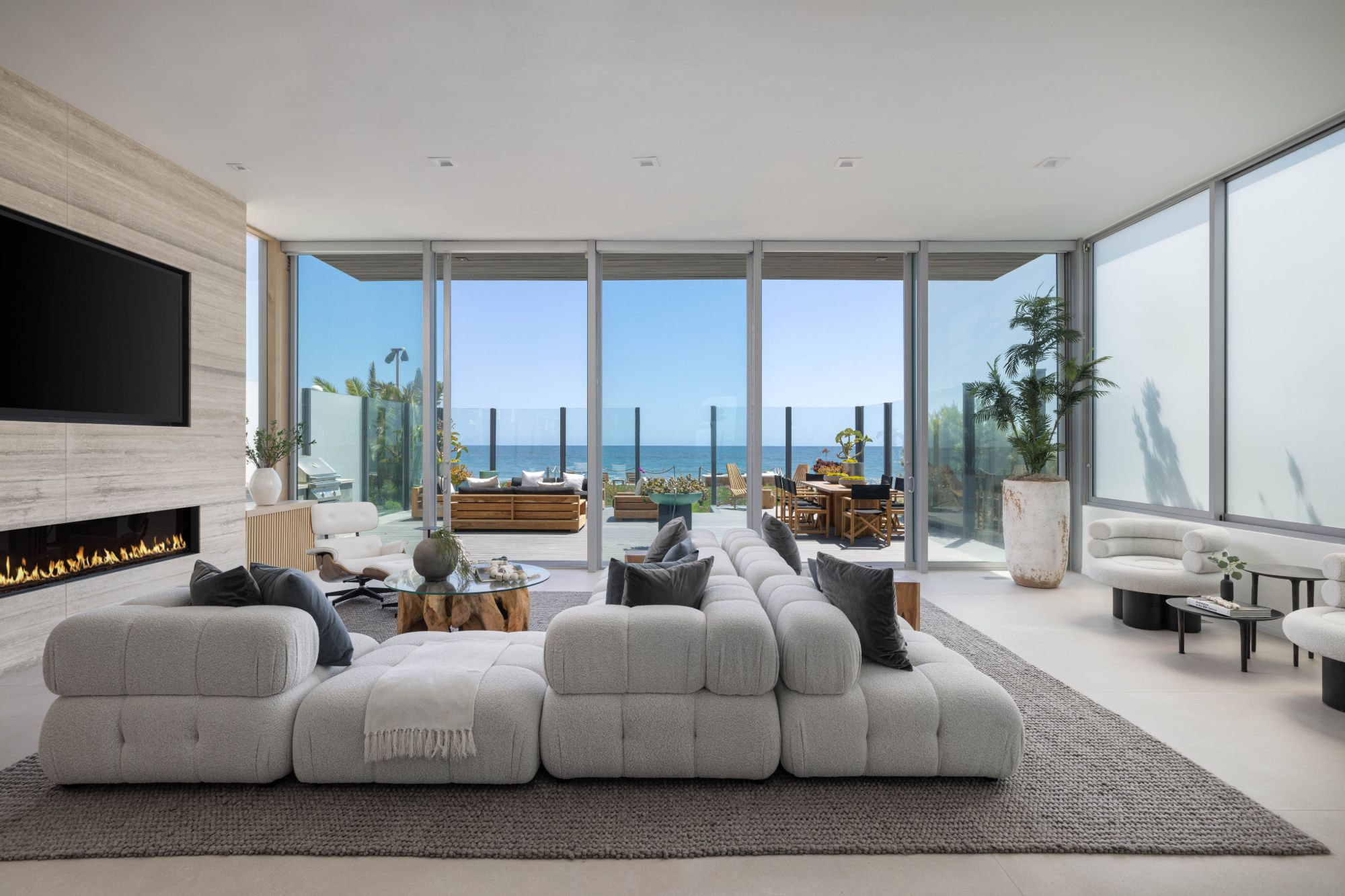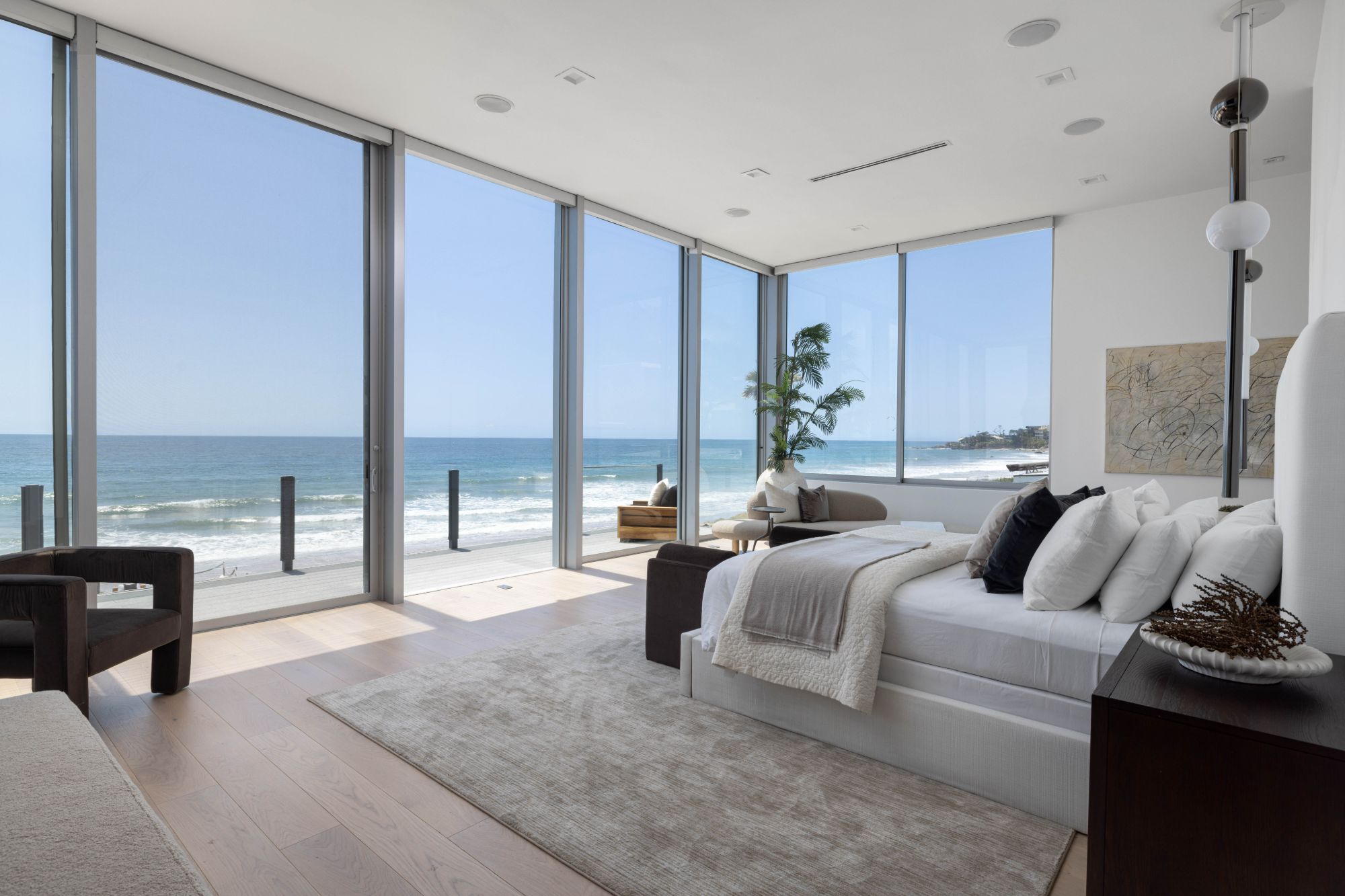 Hidden behind a quiet, luxurious, warm teakwood facade sits a spectacular Broad Beach architectural retreat. It offers seamless indoor-outdoor beach-style living with breathtaking ocean views and great privacy from your front deck, which leads you to your private lawn right on the sand. Nothing gets better than this! Away from the street, separated by the 3-car garage and a welcoming courtyard, this jewel has been completely reimagined and crafted with the finest materials, a soothing color palette, natural elements, white Oak floors, custom natural wood sidings, and electric shades throughout the house. The open-concept living area speaks volumes with a 12' high ceiling and floor-to-ceiling glass doors which frames the picture-perfect view of the ocean, sand, and beach. The expensive living room offers a 7' long fireplace with a flawless stone accent wall that seamlessly blends with the dining area. The upscale and airy chef's kitchen is adorned with quartzite walls, an oversized kitchen island, well-equipped Miele appliances, and custom light fixtures. Architectural hallways with frosted side window panels and skylights fill the space with natural light. The sophisticated circular stairway leads to the second floor where double doors grant you access to the grand primary suite. As you enter the suite, the mesmerizing views of white water and coastline remind you why Malibu is one of the most sought-after places in the world. The primary is generously sized with thoughtful 11' high ceilings providing massive, full-width sized floor-to-ceiling windows. The calming atmosphere, state-of-the-art fireplace, and private deck will make you never want to leave. The grand suite includes a custom, spacious, walk-in closet and an exquisite spa-like bathroom enhanced with a stand-alone bathtub, marvelous natural stones, and an oversized shower with a stylish rain showerhead and lavish fixtures. The game/media room is located at the lower/basement level and is opened to the side of the house with a large window to invite the light in. Along with the main house includes 4 bedrooms and an ideal separate 1 bedroom /1 bathroom guest house with a kitchenette. The exquisite glass-protected deck area is fit for an outdoor dining experience. The seating area has been enhanced with a firepit to enjoy dreamy al fresco evenings. The private outdoor space extends to a long turfed walkway leading to your own sun lounge area where you can spend days watching the ever-changing panorama of ocean, islands, coastline, and sky from morning light to those stargazing nights. Enjoy the magic of mother nature from the comfort of your own sanctuary: whale watching, dolphins riding the waves, flocks of birds flying under the sunset. The combination of a finished home with a private lawn on the sandy beach, full-width glass doors facing the ocean, multiple high-ceiling floors, privacy, full views, and an extraordinary guest house make this a trophy property- too rare to be found again.
