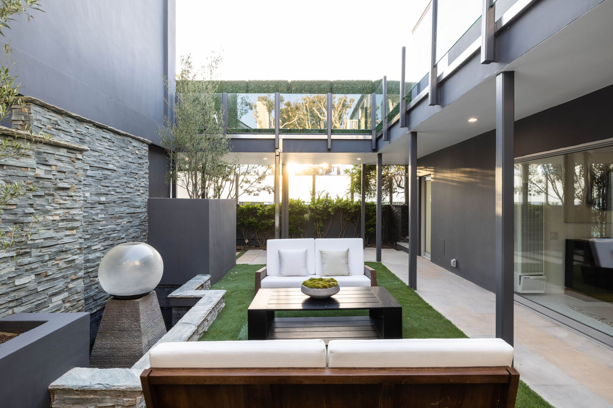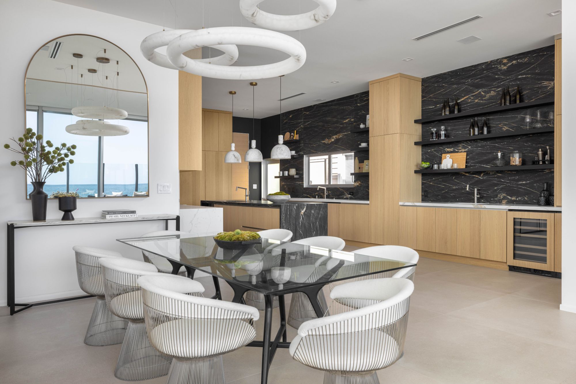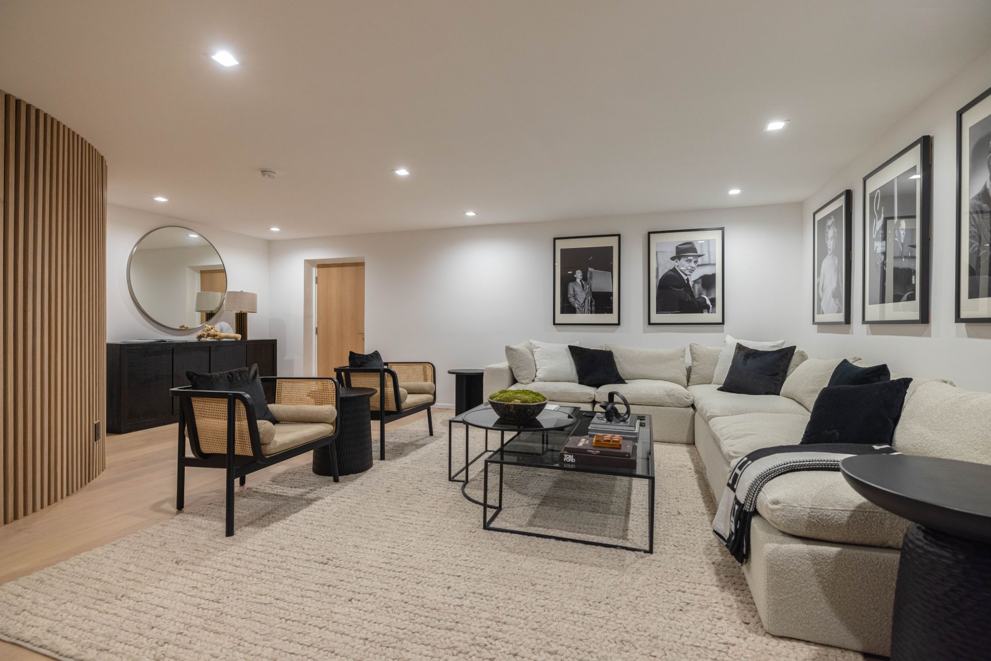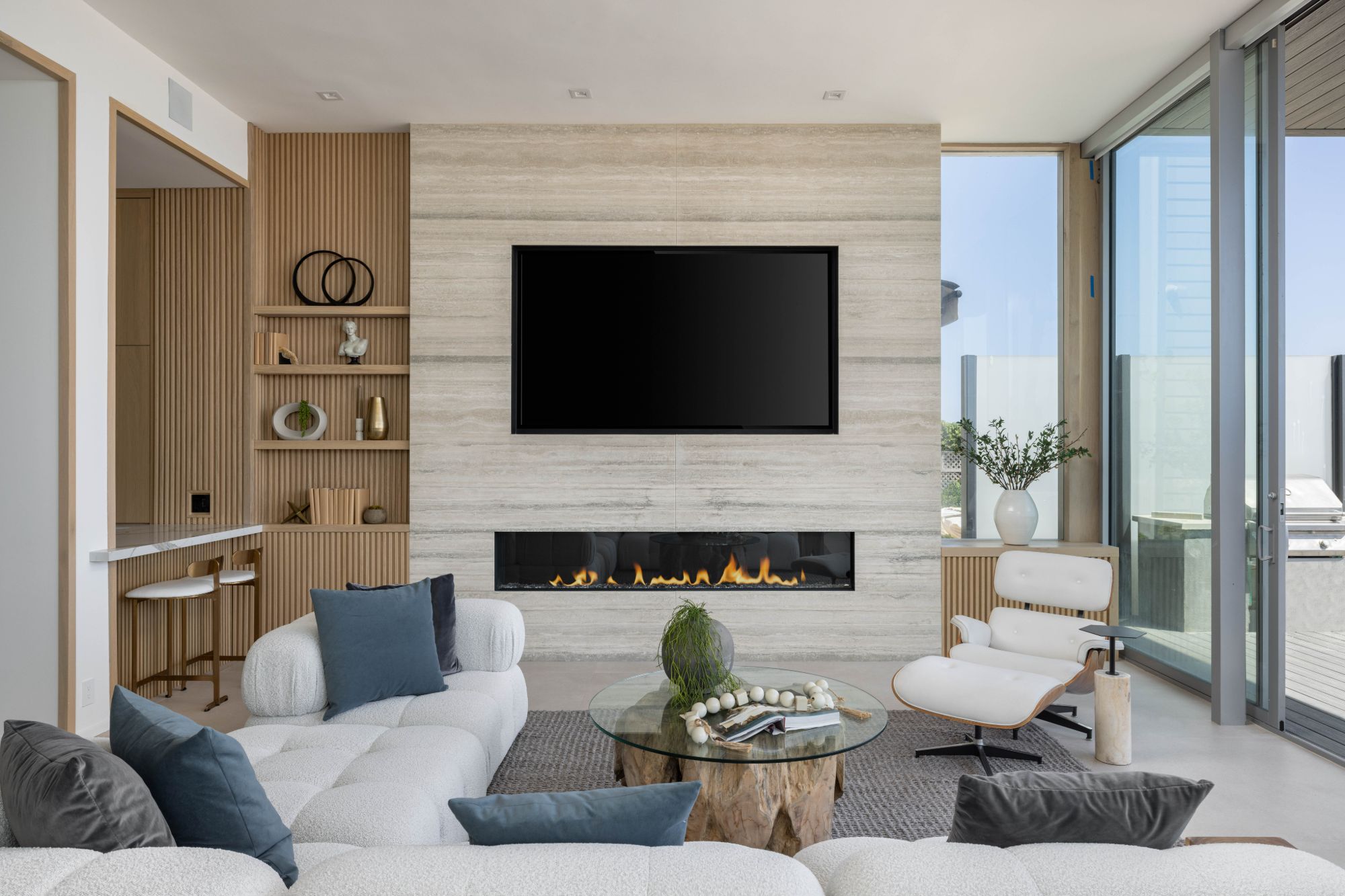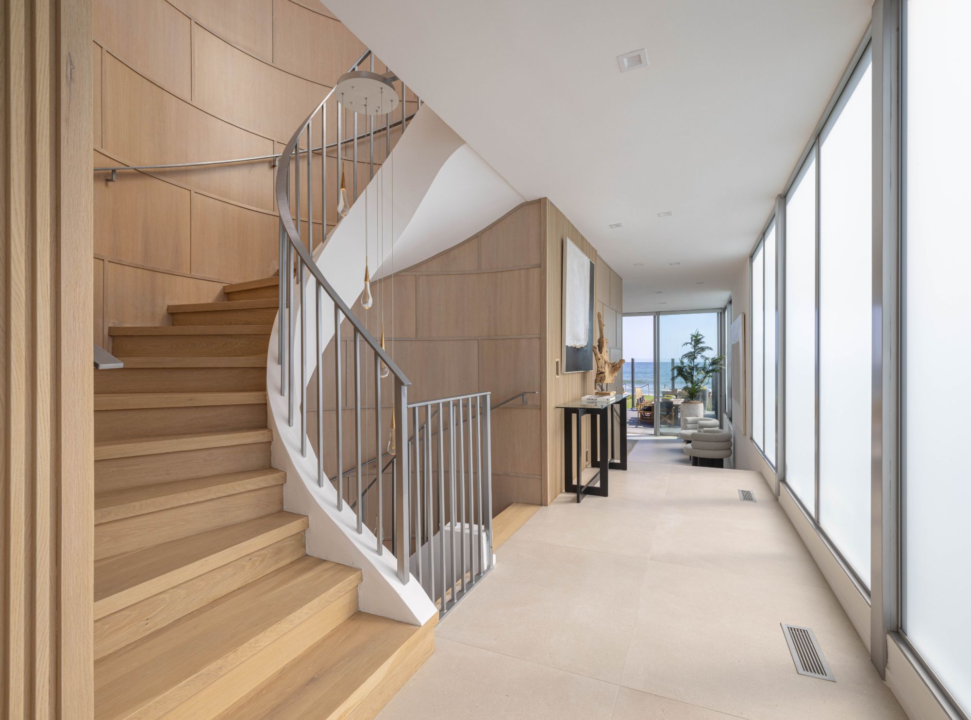 Hidden behind a quiet, luxurious, warm teakwood facade sits a spectacular Broad Beach architectural retreat. It offers seamless indoor-outdoor beach-style living with breathtaking ocean views and great privacy from your front deck, which leads you to your private lawn right on the sand. Nothing gets better than this! Away from the street, separated by the 3-car garage and a welcoming courtyard, this jewel has been completely reimagined and crafted with the finest materials, a soothing color palette, natural elements, white Oak floors, custom natural wood sidings, and electric shades throughout the house. The open-concept living area speaks volumes with a 12' high ceiling and floor-to-ceiling glass doors which frames the picture-perfect view of the ocean, sand, and beach. The expensive living room offers a 7' long fireplace with a flawless stone accent wall that seamlessly blends with the dining area. The upscale and airy chef's kitchen is adorned with quartzite walls, an oversized kitchen island, well-equipped Miele appliances, and custom light fixtures. Architectural hallways with frosted side window panels and skylights fill the space with natural light. The sophisticated circular stairway leads to the second floor where double doors grant you access to the grand primary suite. As you enter the suite, the mesmerizing views of white water and coastline remind you why Malibu is one of the most sought-after places in the world. The primary is generously sized with thoughtful 11' high ceilings providing massive, full-width sized floor-to-ceiling windows. The calming atmosphere, state-of-the-art fireplace, and private deck will make you never want to leave. The grand suite includes a custom, spacious, walk-in closet and an exquisite spa-like bathroom enhanced with a stand-alone bathtub, marvelous natural stones, and an oversized shower with a stylish rain showerhead and lavish fixtures. The game/media room is located at the lower/basement level and is opened to the side of the house with a large window to invite the light in. Along with the main house includes 4 bedrooms and an ideal separate 1 bedroom /1 bathroom guest house with a kitchenette. The exquisite glass-protected deck area is fit for an outdoor dining experience. The seating area has been enhanced with a firepit to enjoy dreamy al fresco evenings. The private outdoor space extends to a long turfed walkway leading to your own sun lounge area where you can spend days watching the ever-changing panorama of ocean, islands, coastline, and sky from morning light to those stargazing nights. Enjoy the magic of mother nature from the comfort of your own sanctuary: whale watching, dolphins riding the waves, flocks of birds flying under the sunset. The combination of a finished home with a private lawn on the sandy beach, full-width glass doors facing the ocean, multiple high-ceiling floors, privacy, full views, and an extraordinary guest house make this a trophy property- too rare to be found again.