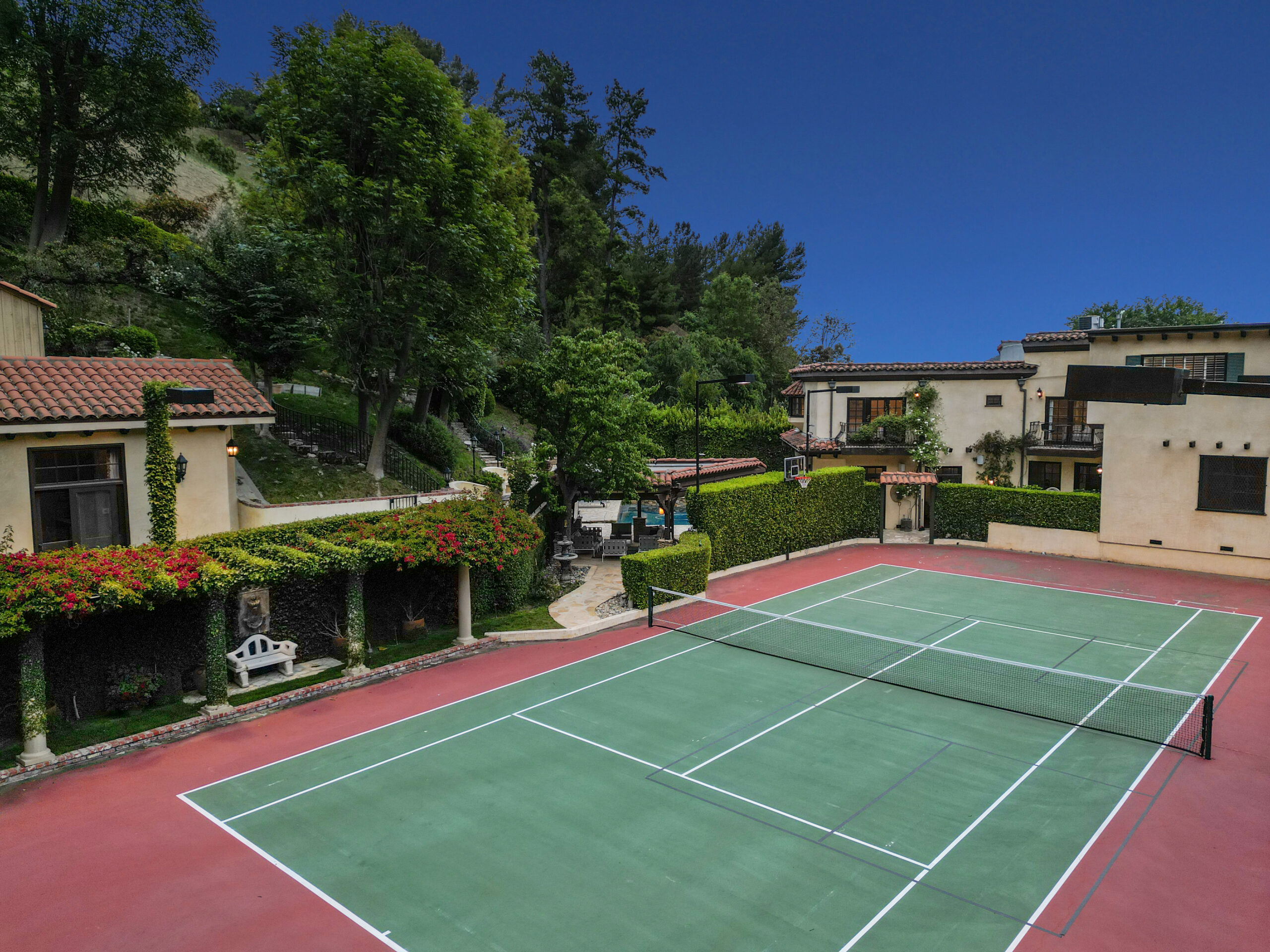 AVAILABLE. Offered partially furnished. The only six bedroom 3/4 acre property with a tennis court at the end of a private cul-de-sac in BHPO. This home is perfect for a large family. All six bedrooms are well appointed each with their own bathroom and closet. The tennis court has been well-maintained and there is a large guesthouse that looks over it. This backyard is meant for entertaining. The large living room opens up to the backyard where you'll find an incredible pool, Jacuzzi and barbecue area. This home boasts everything a $25 million estate would.