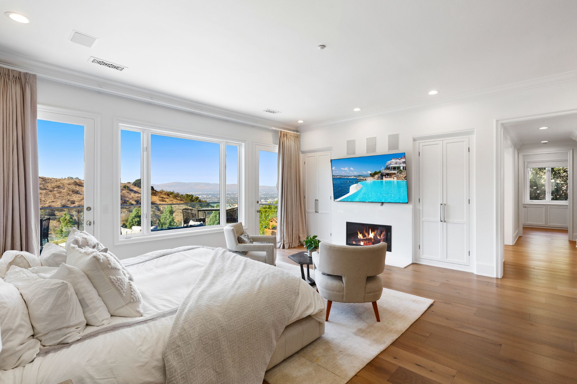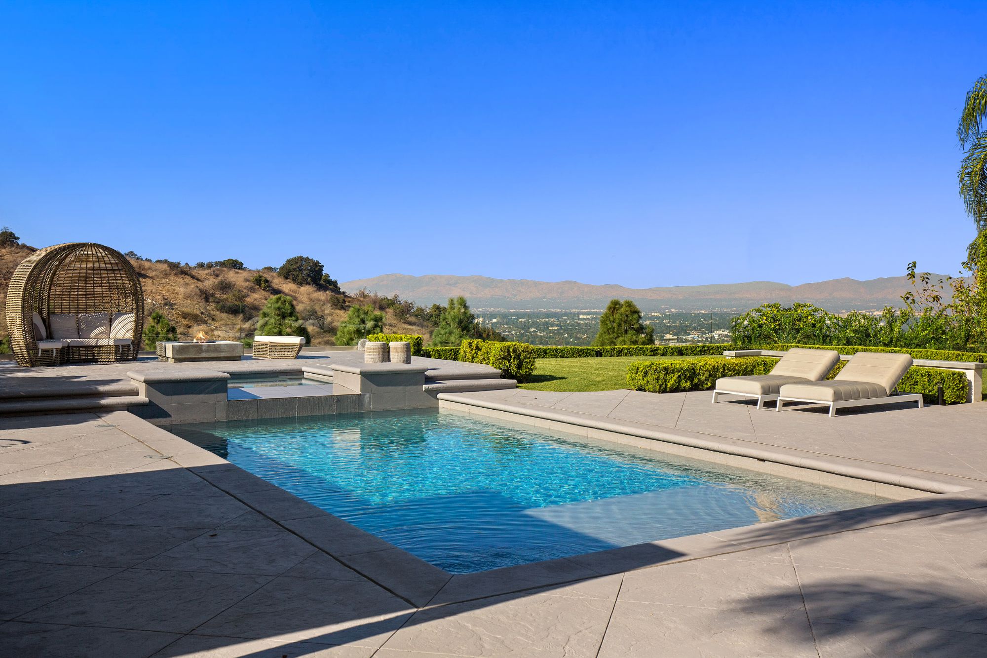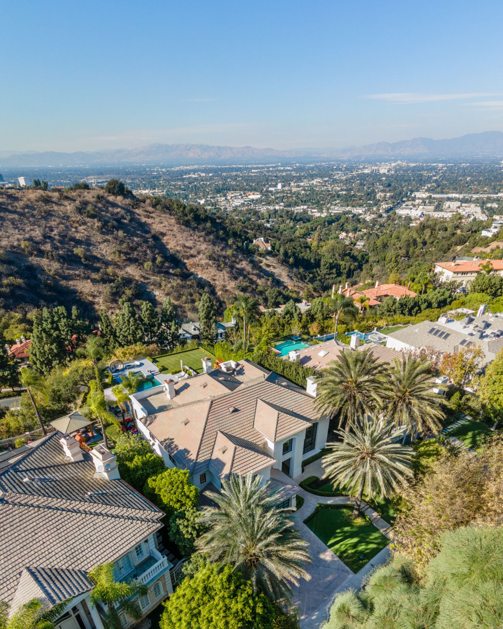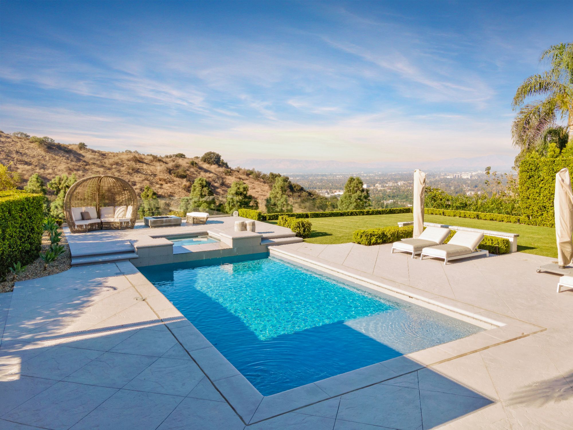 Gorgeous home set in the guard-gated Mulholland Estates community of Beverly Hills with panoramic views of the valley. Steel encased glass doors welcome you into this home that has been fully renovated with high-end contemporary finishes. Spacious two-story foyer and formal living room with double-height windows to maximize natural light. Kitchen features high-end stainless-steel appliances including 2 Sub-Zeros and a 10-Burner Viking stove. The kitchen blends seamlessly into the breakfast nook and family room, which opens to the backyard. Main level also offers formal dining room and one ensuite bedroom. The second level has three bedrooms, home office, and expansive primary suite with fireplace, walk-in closet, and private deck with views. The backyard has a lush flat grassy area, pool, spa, cabana with fireplace, BBQ, and incredible views. Have the best of both worlds when you live between the west side and the valley in the ultra-exclusive Mulholland Estates.