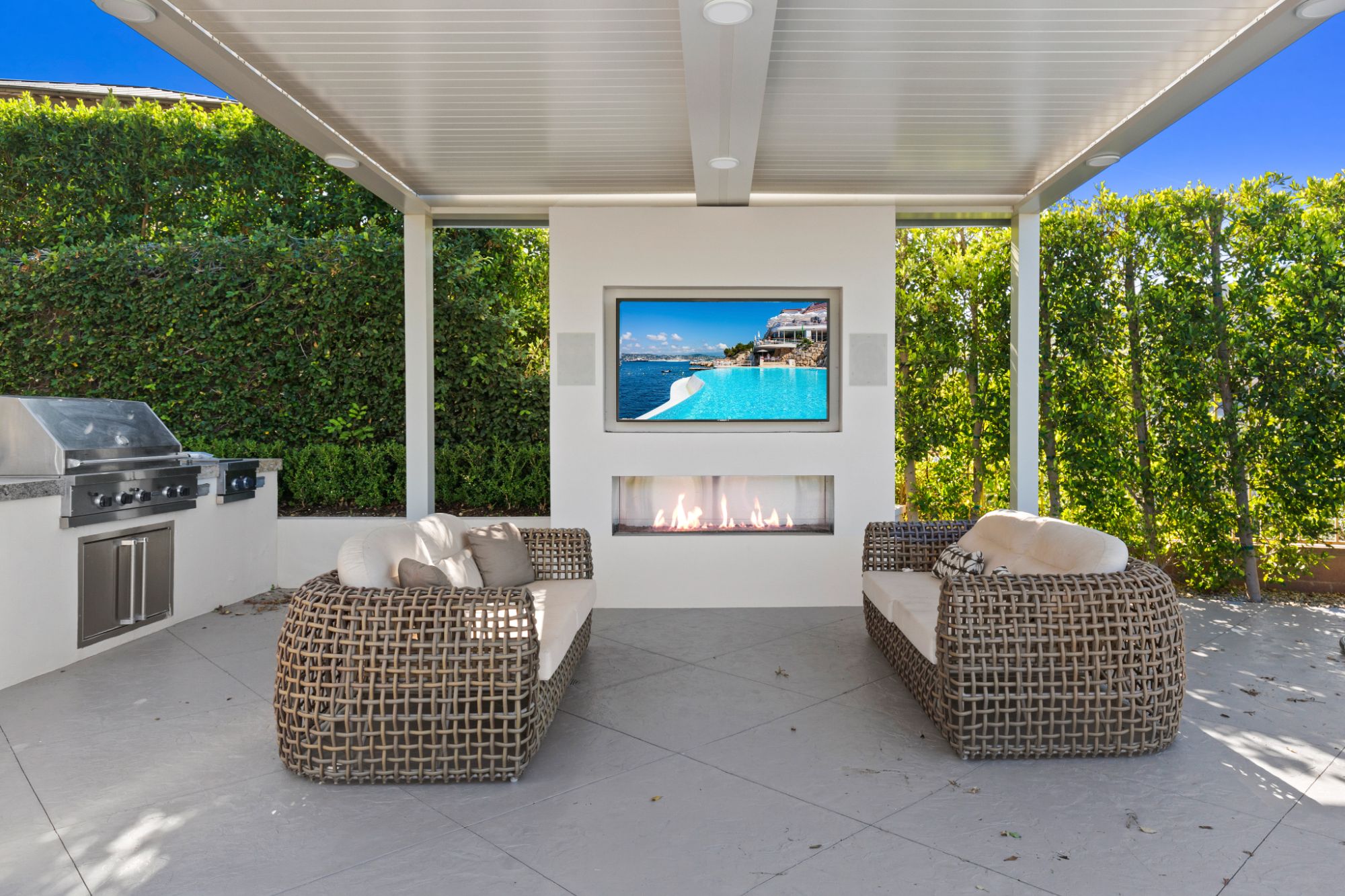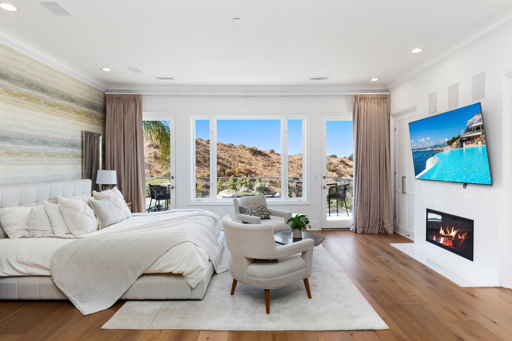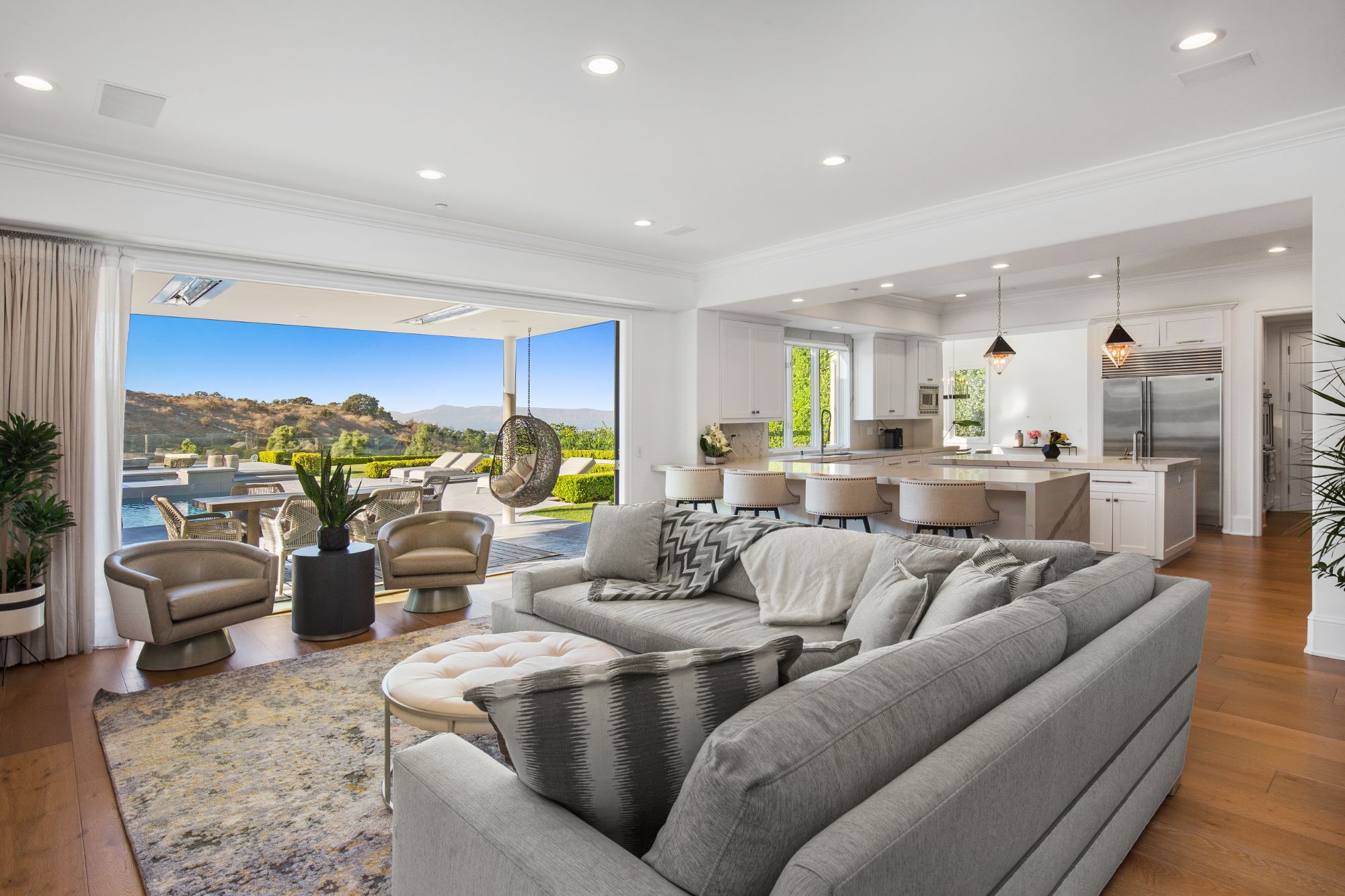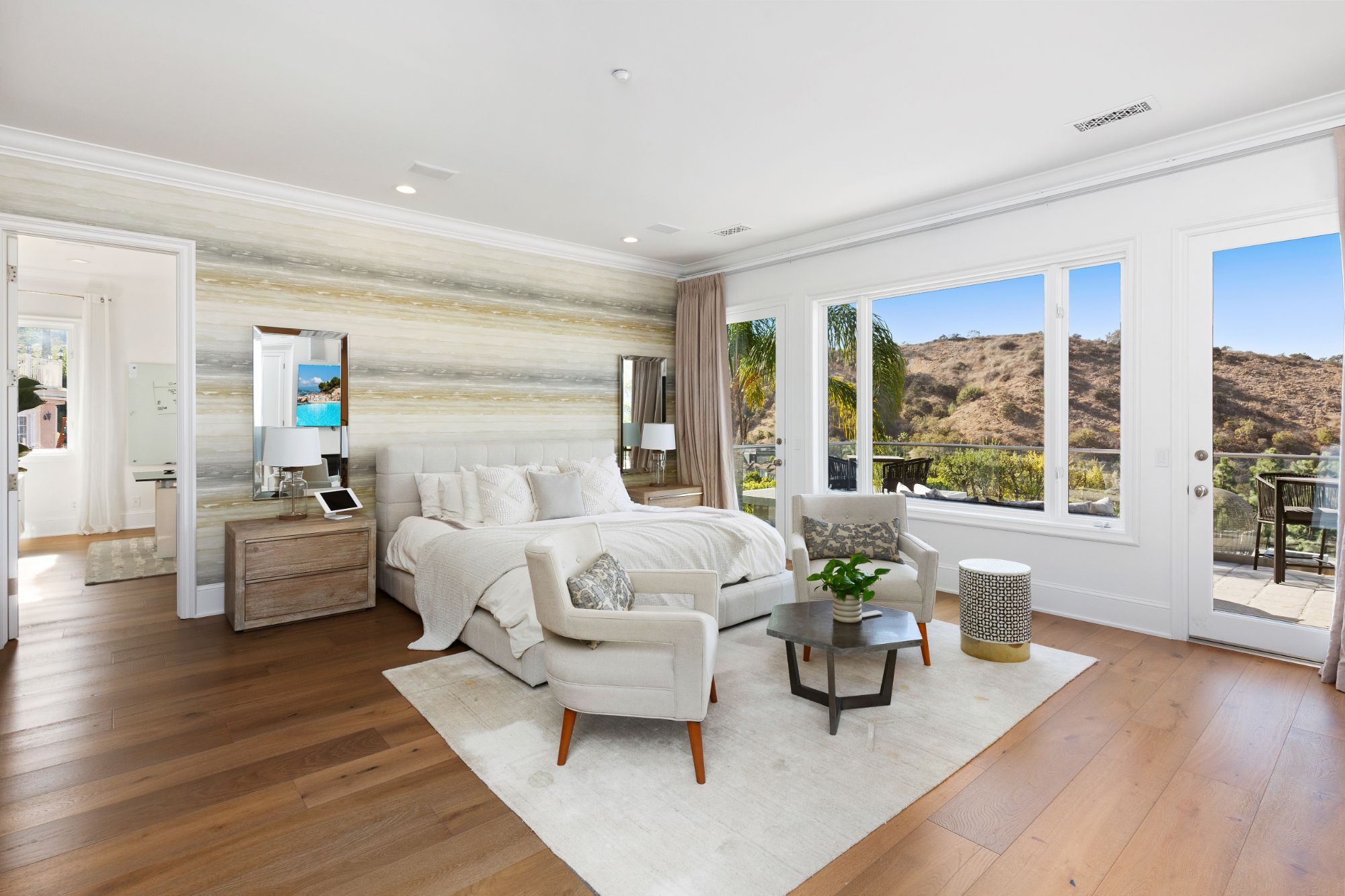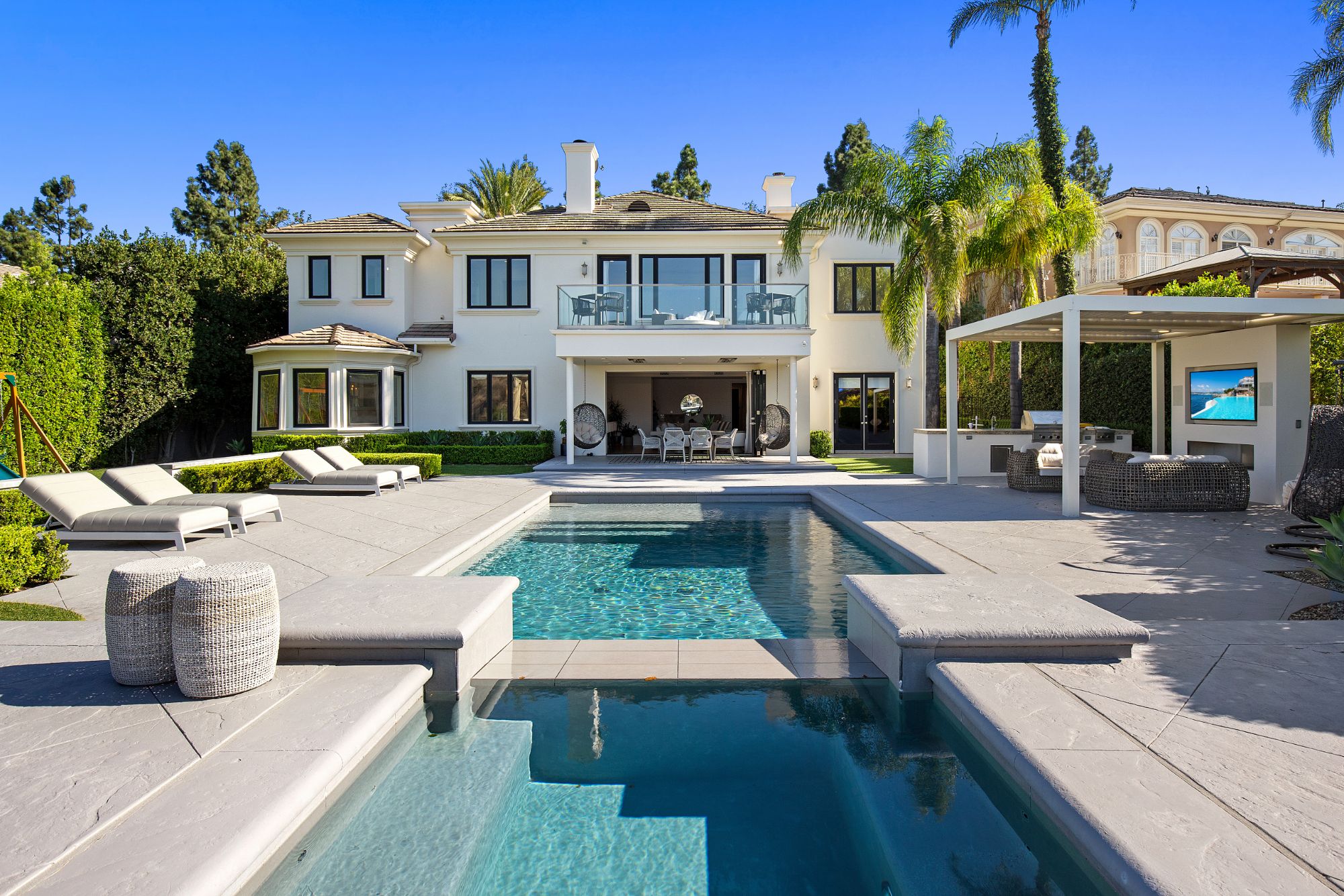 Gorgeous home set in the guard-gated Mulholland Estates community of Beverly Hills with panoramic views of the valley. Steel encased glass doors welcome you into this home that has been fully renovated with high-end contemporary finishes. Spacious two-story foyer and formal living room with double-height windows to maximize natural light. Kitchen features high-end stainless-steel appliances including 2 Sub-Zeros and a 10-Burner Viking stove. The kitchen blends seamlessly into the breakfast nook and family room, which opens to the backyard. Main level also offers formal dining room and one ensuite bedroom. The second level has three bedrooms, home office, and expansive primary suite with fireplace, walk-in closet, and private deck with views. The backyard has a lush flat grassy area, pool, spa, cabana with fireplace, BBQ, and incredible views. Have the best of both worlds when you live between the west side and the valley in the ultra-exclusive Mulholland Estates.