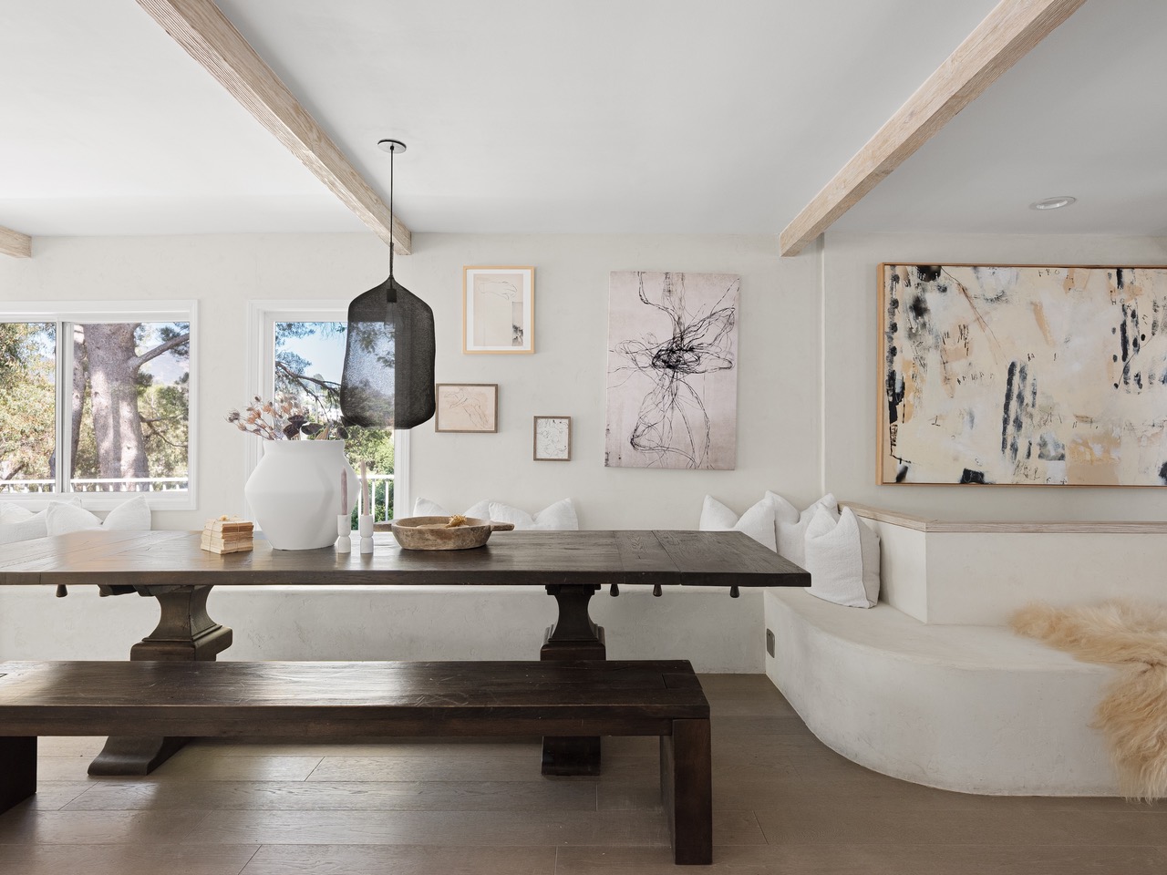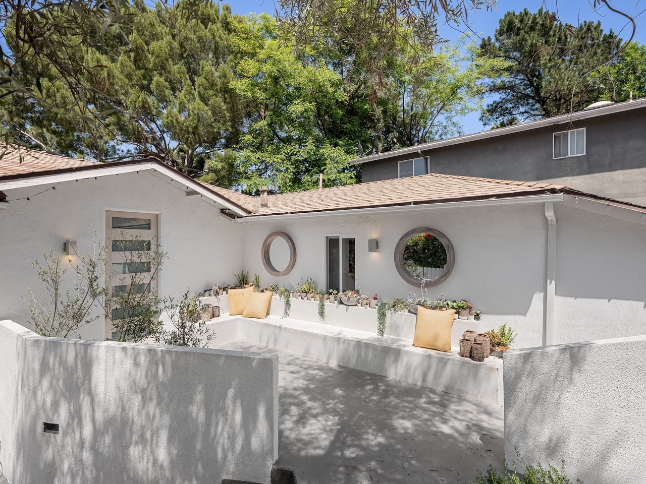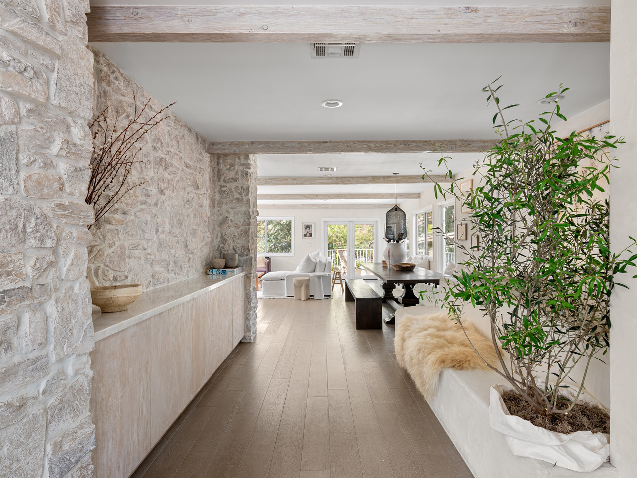There are homes you live in, and there are homes that transform how you live. Designed by celebrity stylist Dani Michelle (Hailey Bieber, Kendall Jenner, Kourtney Kardashian, Elsa Hosk) with interiors by design icon Leanne Ford, this fully furnished sanctuary, featured in Domino Magazine, offers a rare opportunity to lease an architectural gem in the heart of the Hills. Throughout the home, materials and textures create an immersive sensory experience. Venetian plaster walls, sueded marble, whitewashed stone, oxidized steel, sculptural built-ins, vintage lighting, hand-painted surfaces, natural textures, and layered vintage tones. Every surface and finish responds to the shifting light and rhythm of the day. The layout offers four bedrooms (including a fully custom dream closet), four baths, and expansive indoor/outdoor living spaces designed for connection and ease. The elevated chef's kitchen, complete with a built-in Italian cappuccino maker and dining for twelve, opens to living areas that transition effortlessly from day to night.From sun-soaked mornings to golden hour canyon views to cozy evenings on the oversized RH Cloud Couch, the home offers a dynamic canvas for daily life and entertaining.Outdoor spaces evoke the spirit of the Greek isles. Olive trees sway above hand-painted terraces, while an oversized globe pendant anchors the dining area, setting the tone for long dinners and intimate gatherings. A private grass backyard provides a rare layer of outdoor space in the Hills. A finished garage, with HVAC and its own patio, adds flexible space for a studio, gym, or creative office. Additional features include full smart home integration (Nest, Ring, Frame TVs, B-Hyve watering system), gated entry, drought-tolerant landscaping, and a full suite of bespoke furnishings, including Fendi Home, Olive Atelier, Restoration Hardware, rare art, and curated accessories, all ready to be lived in. Leasing a fully designed home by two of LA's most visionary curators, an internationally celebrated interior designer and a globally recognized stylist, is an extraordinary offering. For those who value beauty, creativity, and elevated living, this is one of the most coveted homes to lease in Los Angeles.