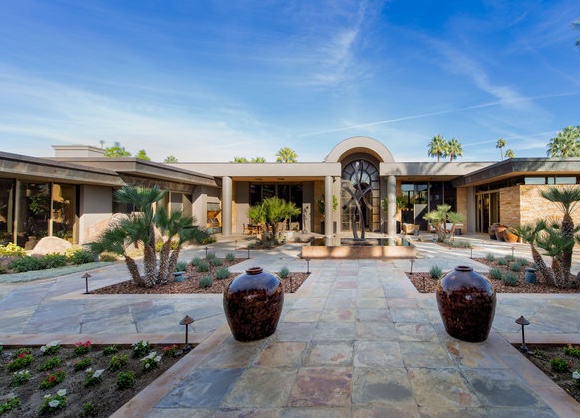 This extraordinary 1.5-acre estate is unparalleled in its distinctive style and resort-caliber amenities. Designed to celebrate light and art, it is truly irreplaceable, an oasis of tranquility that includes a one-of-a-kind five-bedroom residence, caretaker's quarters, and two chic one-bedroom guesthouses. Surrounded by towering palms, the home was constructed by superior craftsmen, has been thoughtfully rejuvenated, and boasts striking lines, angles, and details from around the world. It is an ideal venue for entertaining, with a climate-controlled wine cellar, a bar, and living and dining areas where glass pocket doors blur the line between indoors and out. The idyllic grounds offer sunny patios, numerous water features, fruit trees, swaths of emerald lawn, a koi pond enveloped by Taihu stone, and a secluded swimmer's pool and spa. The estate has been equipped with a security system, a gated motor court, a Crestron home-automation system, and an air-conditioned four-car garage.