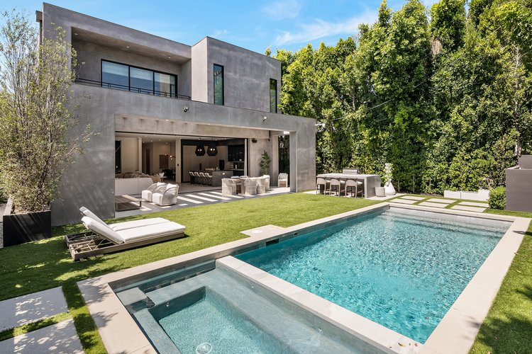 Brand new contemporary estate in prime Beverly Grove. This exquisitely crafted residence boasts dramatic modern detail and a wealth of lifestyle amenities. Framed by mature trees and leafy foliage, the property showcases soaring ceilings, gallery walls and expansive windows. The 1st floor features an office, open-plan dining and living areas and a chefs kitchen with Italian cabinetry, marble countertops and Miele appliances. Fleetwood pocket doors open to the resort-style backyard with spacious patios, BBQ kitchen, pool, spa and grass lawn. The floating glass stairwell leads upstairs to another terrace and 3 ensuite bedrooms, including the spectacular primary with fireplace, balcony, spa bath and walk-in closet. Features include a lower-level game room, bar, wine storage and plush theater, Control 4 home automation, a 2-car garage and carport parking. From its tree-lined residential street, the home is moments from the shops and restaurants of Melrose, 3rd Street and Beverly Blvd.