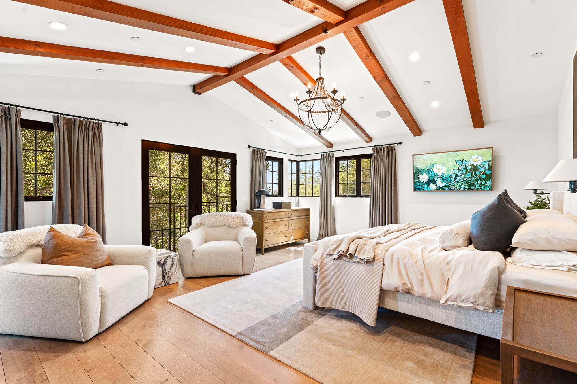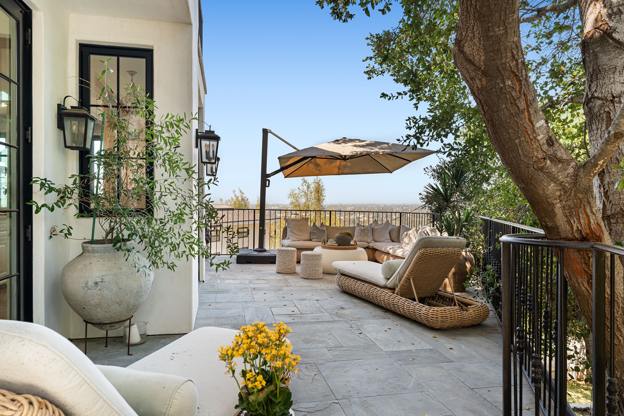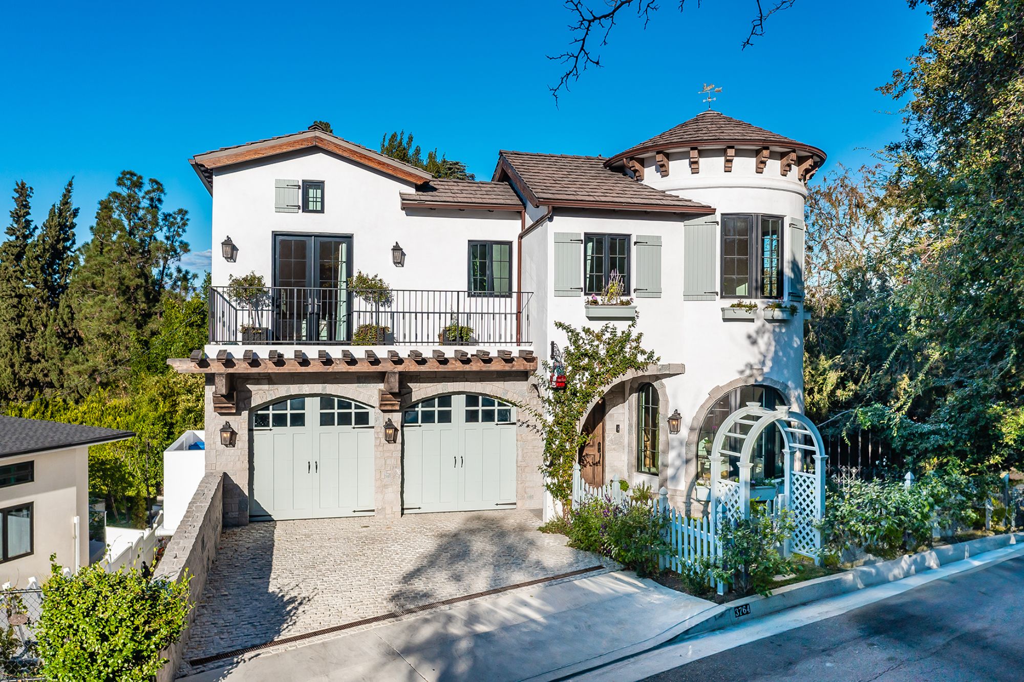 Welcome to this exquisite 2018 French Country home, a true masterpiece of design and craftsmanship, nestled in the heart of highly sought-after Studio City. This stunning residence boasts an open floorplan that maximizes breathtaking city and mountain views from nearly every room. As you enter, you'll be captivated by the high vaulted ceilings, which soar to 25 feet in the grand great room, accentuated by beautiful beams that add a touch of rustic elegance. The space is filled with natural light, courtesy of the large windows that frame the picturesque vistas. The great room seamlessly transitions into the chef's kitchen, a culinary enthusiast's dream, featuring a La Cornue range, a Wolf double oven, and a Subzero fridge/freezer. An additional refrigerator and freezer are integrated into the stunning kitchen island, providing ample space for food preparation and entertaining. The home offers four spacious bedrooms, each designed with high vaulted ceilings that create an airy, open feel. An optional fifth bedroom suite is located downstairs, perfect for guests or as a recreational room, complete with a private entrance and ensuite bathroom for added convenience. Step outside into the large grassy backyard, a rare find among hillside homes. Here, you'll discover a charming fountain surrounded by mature trees and lush landscaping, providing a tranquil setting for relaxation or outdoor gatherings. The expansive outdoor space is complemented by three balconies, including a sizable entertaining deck that offers both east and west views, ideal for watching the sunrise and sunset in style. Additional features of this remarkable home include French oak hardwood floors that flow throughout the living spaces, crystal chandeliers that add a touch of luxury, and exquisite Carrara marble finishes that enhance the overall aesthetic. For your storage needs, the property includes a spacious basement, perfect for organizing seasonal items, sports equipment, or can be used a work space. Located in the prestigious Carpenter School District, this home is not only a haven of comfort and style but also offers close proximity to an array of restaurants, shopping venues, and renowned hiking trails. Please note that the renter will be responsible for all utilities, as well as gardener services, fountain maintenance, and alarm monitoring/response. Renter's insurance is required to ensure peace of mind in this stunning residence. Don't miss the opportunity to call this extraordinary home your own, where elegance meets functionality in one of the most desirable neighborhoods in the area.