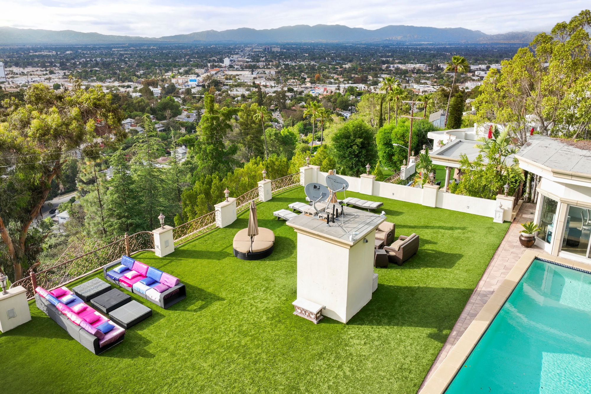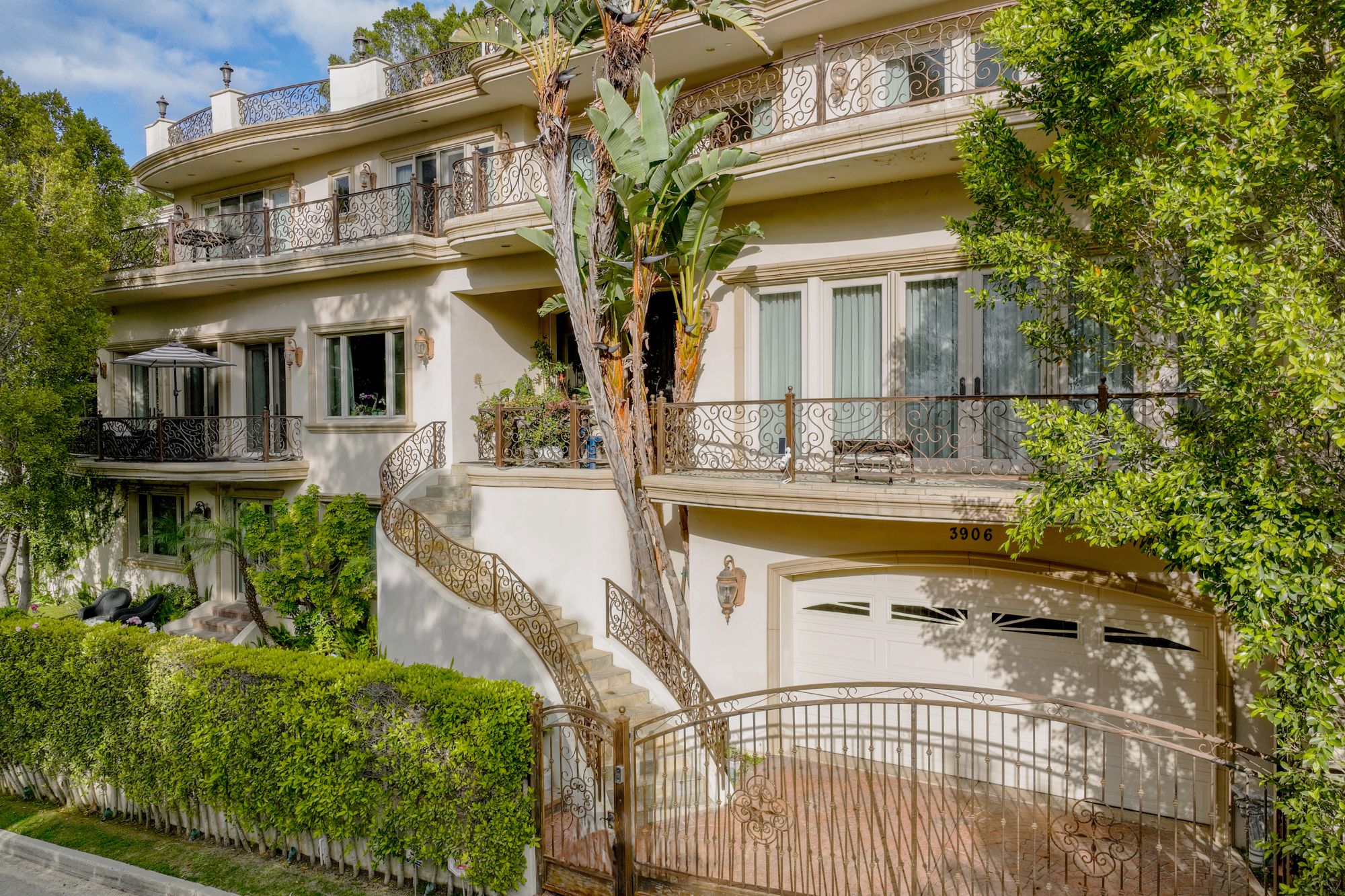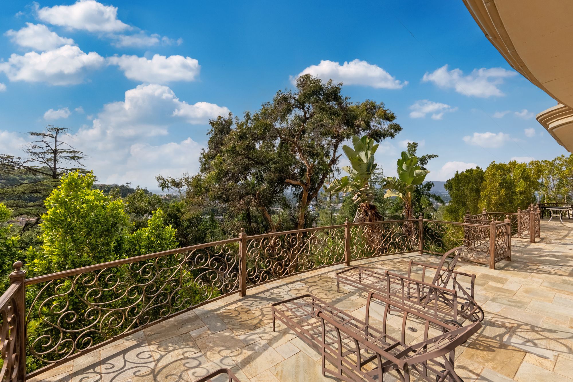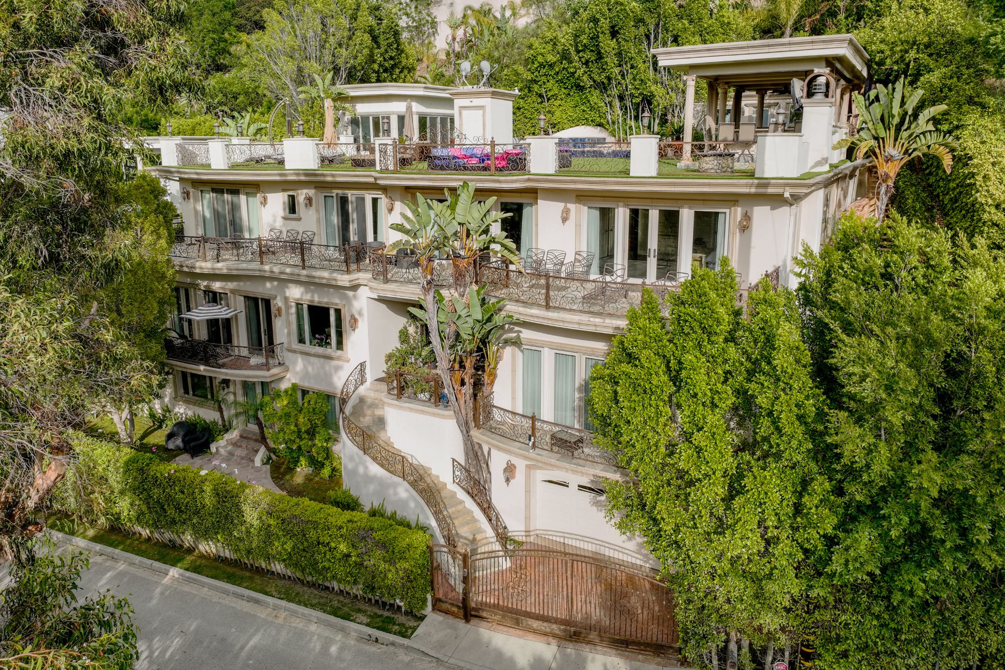 Welcome to your dream home, a Mediterranean estate sprawling over approximately 7,300 square feet of pure luxury, complemented by additional amenities such as a pool house and a rooftop sauna. Built in 2008 and meticulously maintained by its original owner, this three-level property offers an unparalleled living experience. As you step through the magnificent iron and glass doors, you are greeted by a breathtaking foyer and a grand, winding travertine staircase that sets the tone for the rest of this exquisite home. This residence boasts four spacious bedrooms plus a den, including two fabulous Master Suites that offer unparalleled, breathtaking views. The gourmet kitchen is a chef's delight, featuring stainless steel appliances and a large island. It opens up to a spacious family room, creating the perfect gathering space for family and friends. The elegant dining room is ideal for hosting opulent dinner parties. Every room throughout the home has access to connecting outdoor balconies, providing tree-top and city views, ensuring complete privacy and a seamless indoor-outdoor living experience. For your convenience, this home includes an elevator that travels from the four-car garage to the expansive rooftop, ensuring easy access to all levels. There is also a versatile bonus room that can be tailored to your needs and ample space for a dedicated TV viewing room. The outdoor living space is nothing short of spectacular. The expansive rooftop area features a sumptuous pool, a pool house, a sauna, and an outdoor kitchen, making it the perfect spot for relaxation and entertaining while enjoying panoramic views. Imagine hosting dinner parties al fresco, surrounded by the serene beauty of the landscape and the twinkling city lights. Experience the epitome of luxury living in this extraordinary Mediterranean estate, where every detail has been carefully considered to provide the utmost in comfort and style.