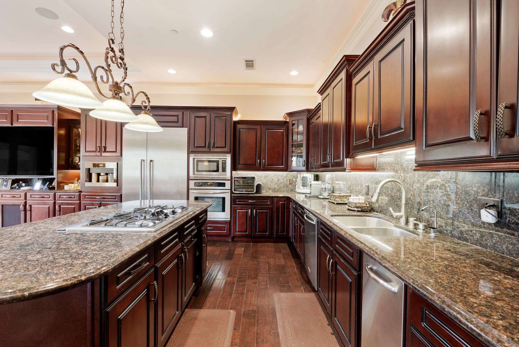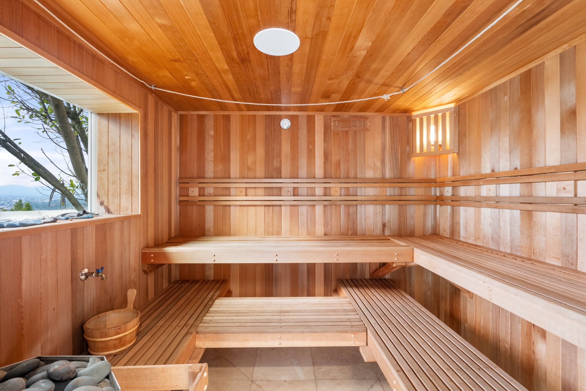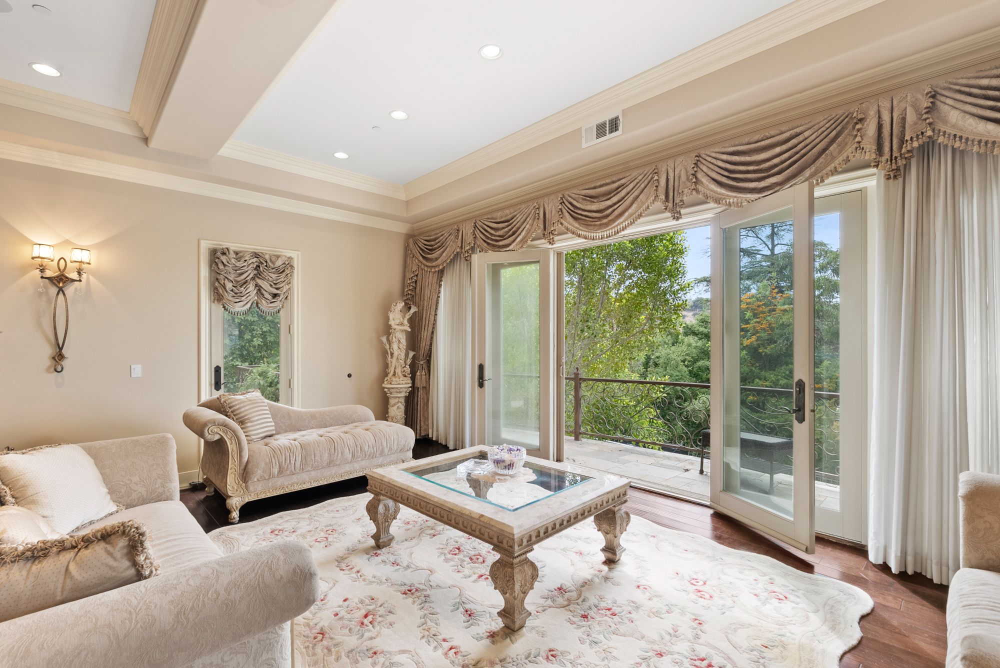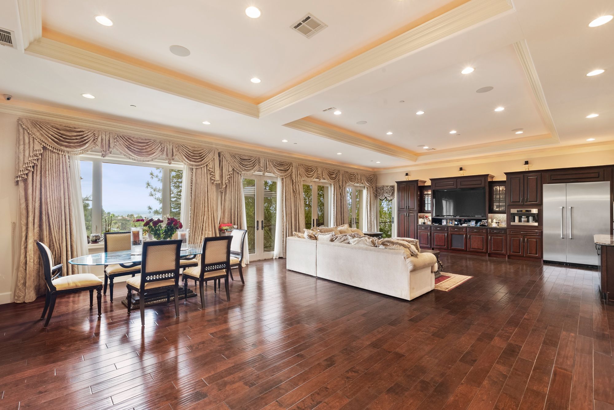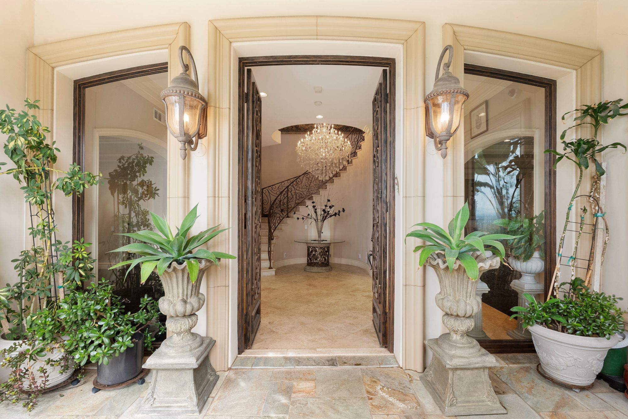 Welcome to your dream home, a Mediterranean estate sprawling over approximately 7,300 square feet of pure luxury, complemented by additional amenities such as a pool house and a rooftop sauna. Built in 2008 and meticulously maintained by its original owner, this three-level property offers an unparalleled living experience. As you step through the magnificent iron and glass doors, you are greeted by a breathtaking foyer and a grand, winding travertine staircase that sets the tone for the rest of this exquisite home. This residence boasts four spacious bedrooms plus a den, including two fabulous Master Suites that offer unparalleled, breathtaking views. The gourmet kitchen is a chef's delight, featuring stainless steel appliances and a large island. It opens up to a spacious family room, creating the perfect gathering space for family and friends. The elegant dining room is ideal for hosting opulent dinner parties. Every room throughout the home has access to connecting outdoor balconies, providing tree-top and city views, ensuring complete privacy and a seamless indoor-outdoor living experience. For your convenience, this home includes an elevator that travels from the four-car garage to the expansive rooftop, ensuring easy access to all levels. There is also a versatile bonus room that can be tailored to your needs and ample space for a dedicated TV viewing room. The outdoor living space is nothing short of spectacular. The expansive rooftop area features a sumptuous pool, a pool house, a sauna, and an outdoor kitchen, making it the perfect spot for relaxation and entertaining while enjoying panoramic views. Imagine hosting dinner parties al fresco, surrounded by the serene beauty of the landscape and the twinkling city lights. Experience the epitome of luxury living in this extraordinary Mediterranean estate, where every detail has been carefully considered to provide the utmost in comfort and style.