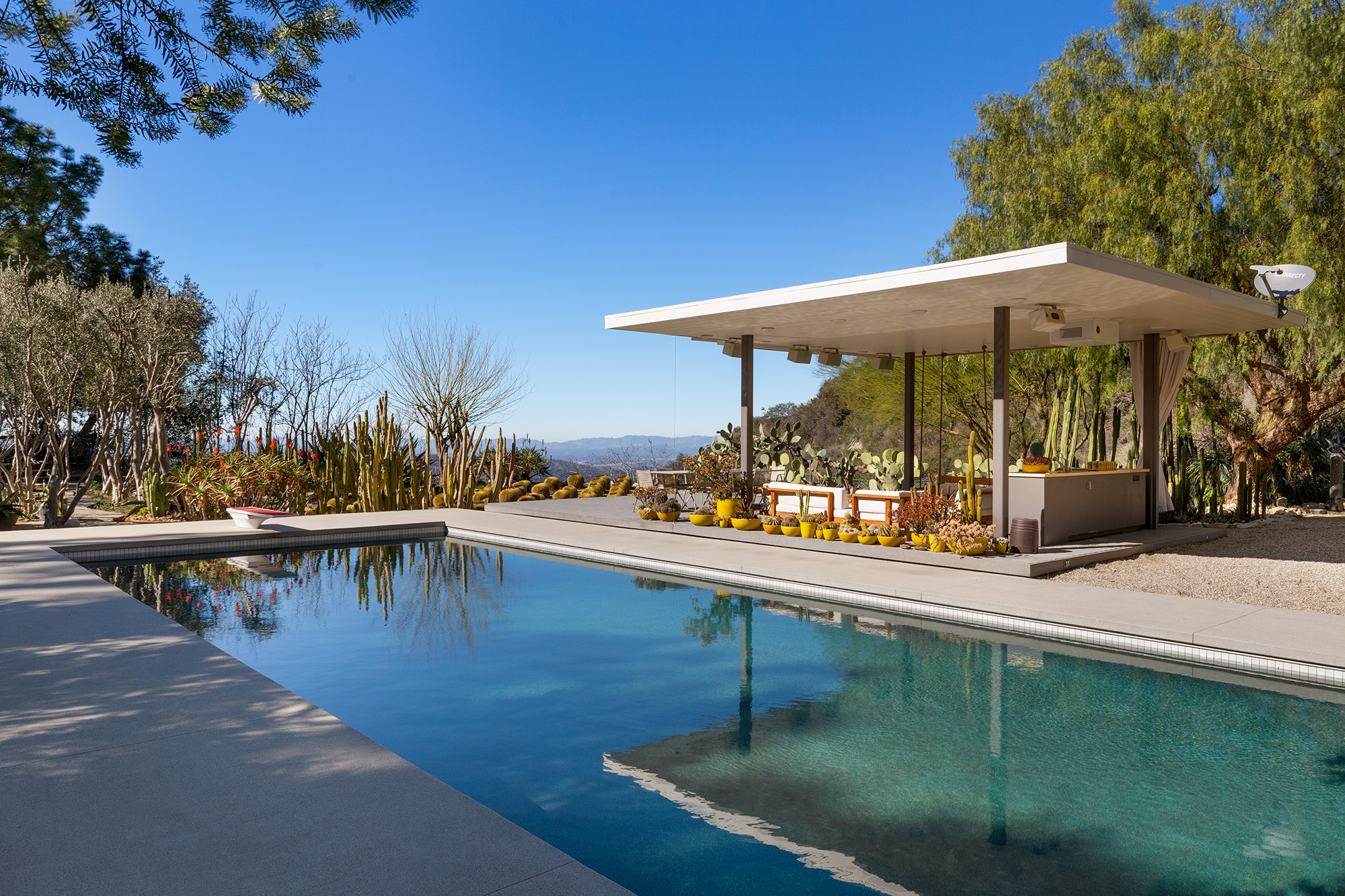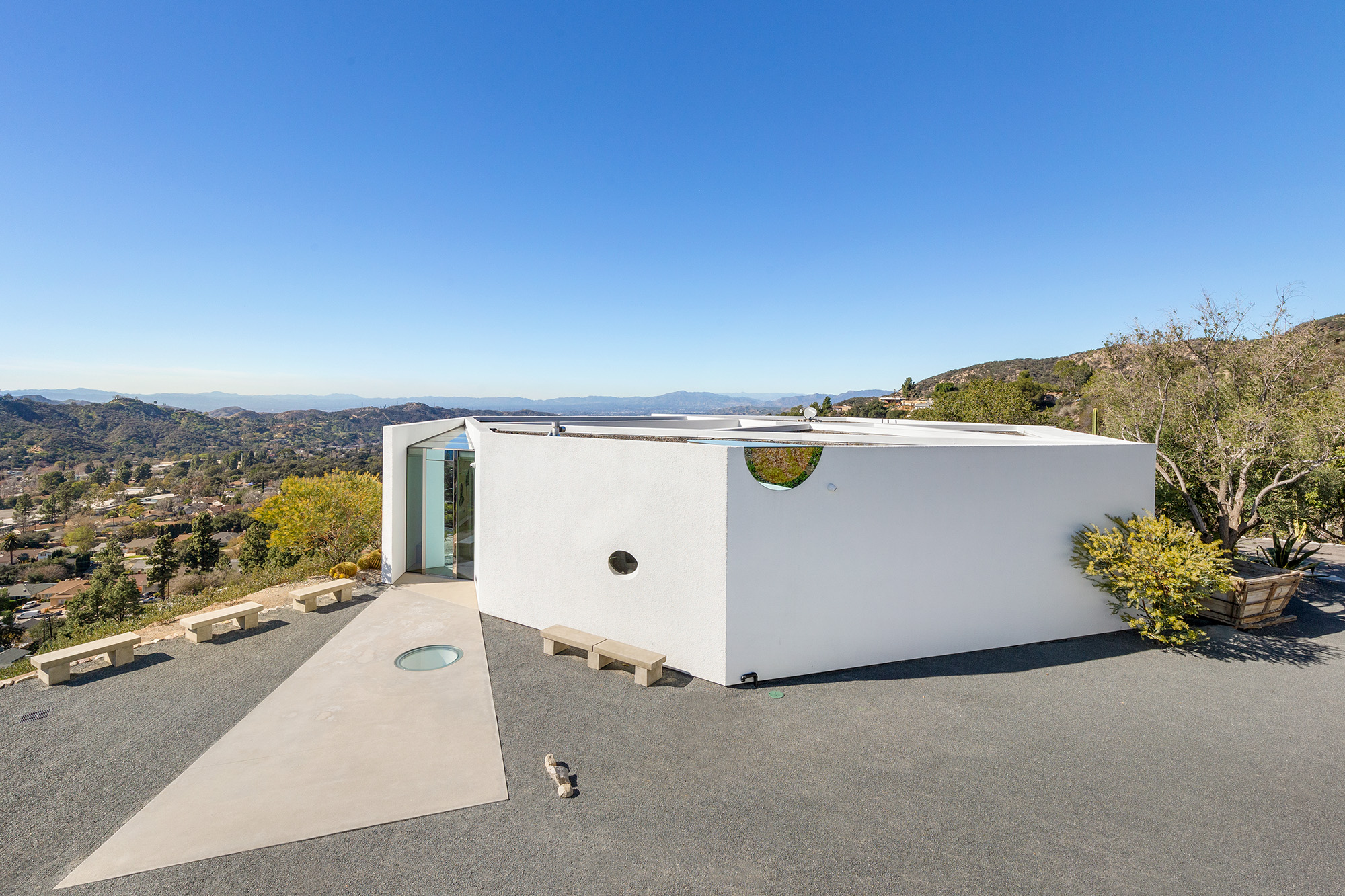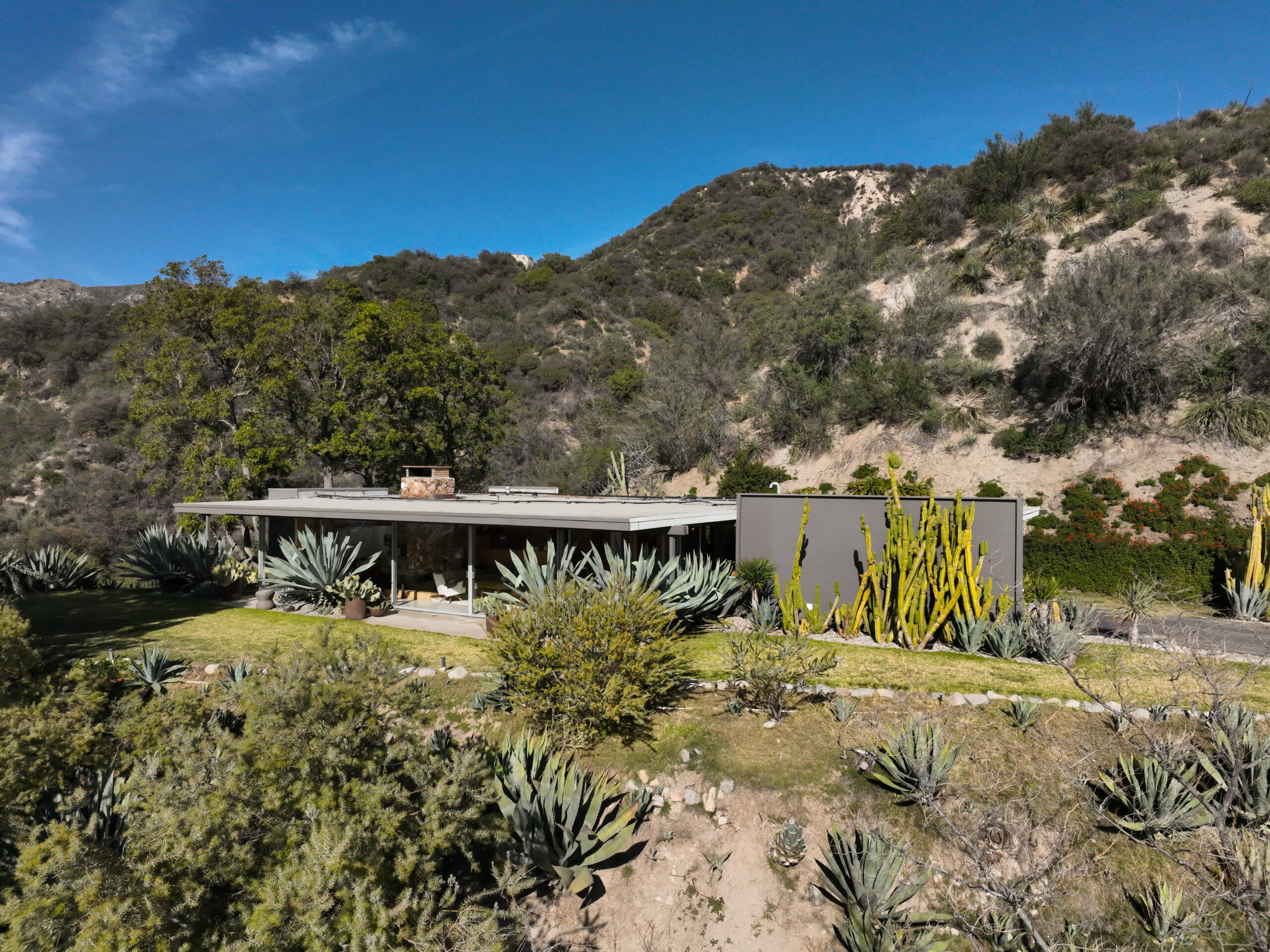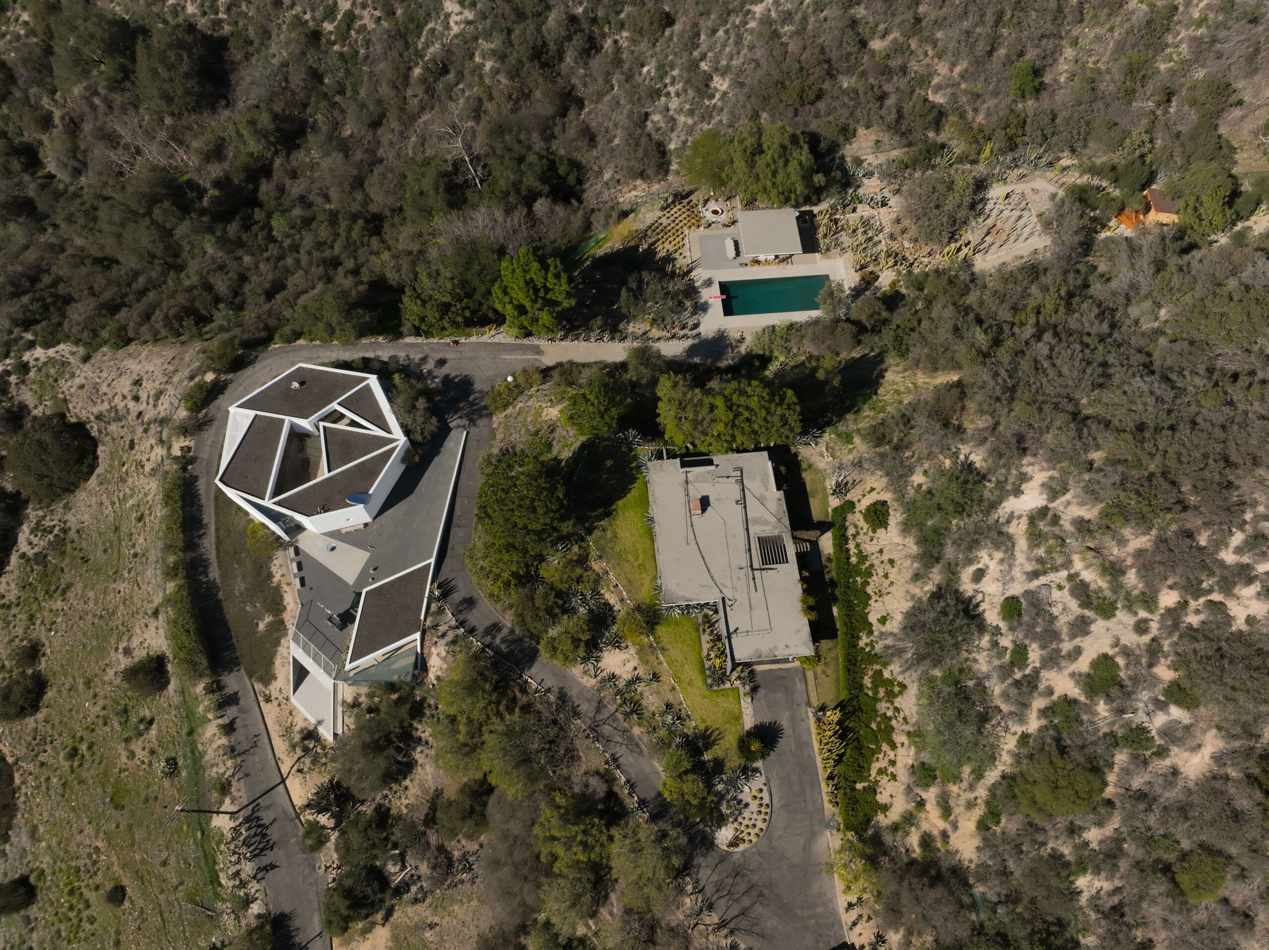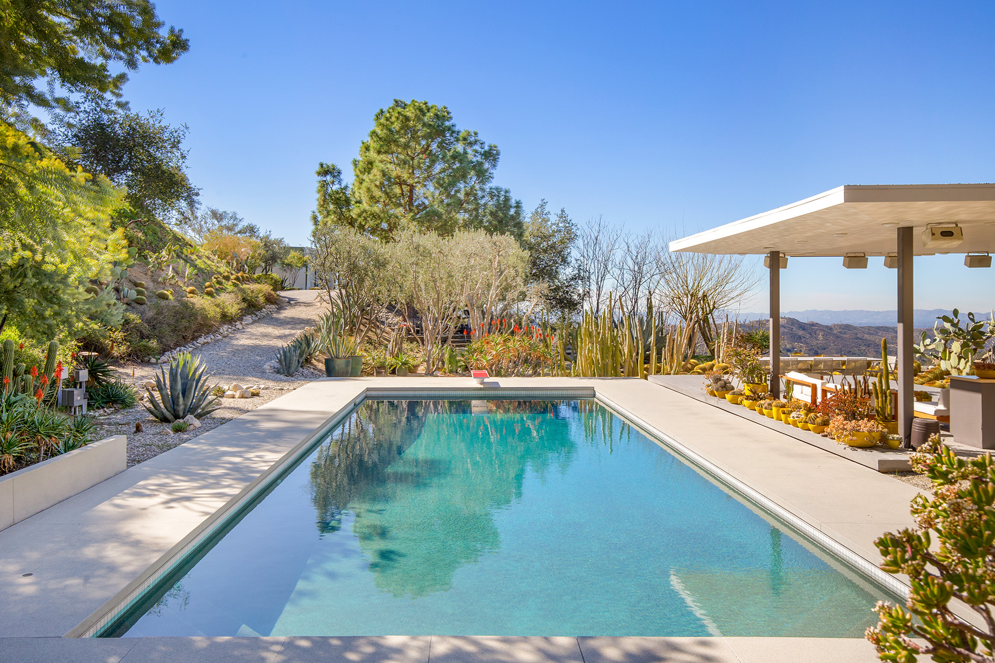 Exceptional Architectural compound offering total hilltop privacy. This stunning pair of pedigreed properties occupy an extraordinary 5.7 acre curated succulent garden. The original structure was built by Richard Neutra FAIA for his secretary, Dorothy Serulnic, in 1953. The 1,350 SF floor plan features 2 bedrooms, one bath, walls of glass, a bear valley stone fireplace and a plethora of Neutra designed built-ins, including a sofa system with record player and concealed speakers, multiple desks, shelving systems, dining room table, sliding breakfast nook and vanity. This pristine architectural masterpiece opens to a flat grassy pad with spectacular mountain and city skyline views throughout. Nearly a half a century later, award winning architect Michael Maltzan was commissioned to build the main residence. His unique design is anchored by a 7 sided structure with an interior courtyard. A sensational 875 SF addition was completed by the noteworthy architect in 2021. The entire structure has breathtaking mountain and city skyline views. The heavenly primary suite with curvilinear penny tiled bathroom looks through the courtyard and onto the dramatic view. There is a smart office area, cozy den, and a multitude of built-in storage throughout. The enormous Johnston Vidal lap pool is 50'long. The outdoor movie pavilion with wind screen and catering kitchen is the perfect place to entertain. A spectacular cabin designed by Mariah O'Brien interiors and Mind Tree Arts completes the unique estate. This special compound offers peace and privacy like no other.