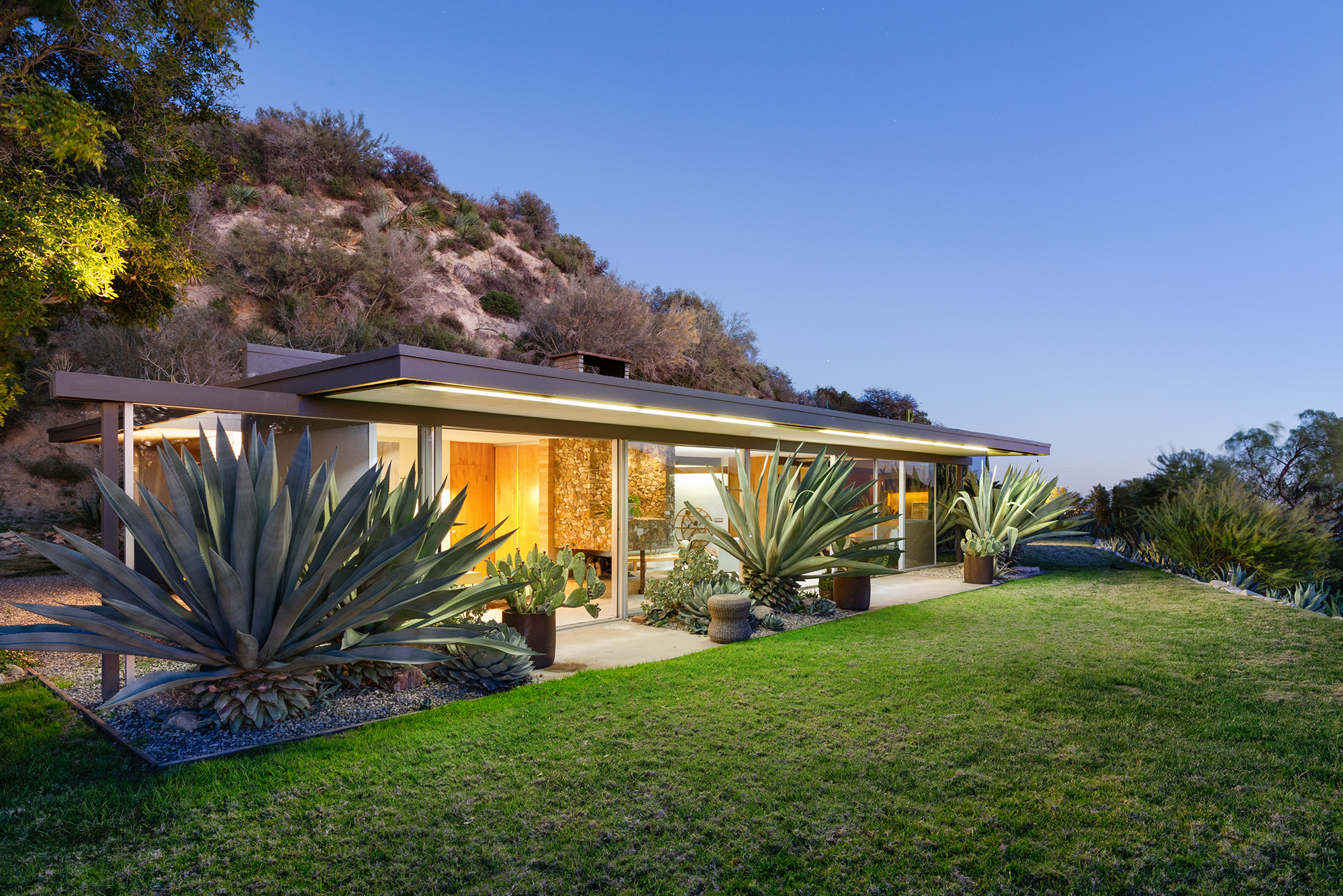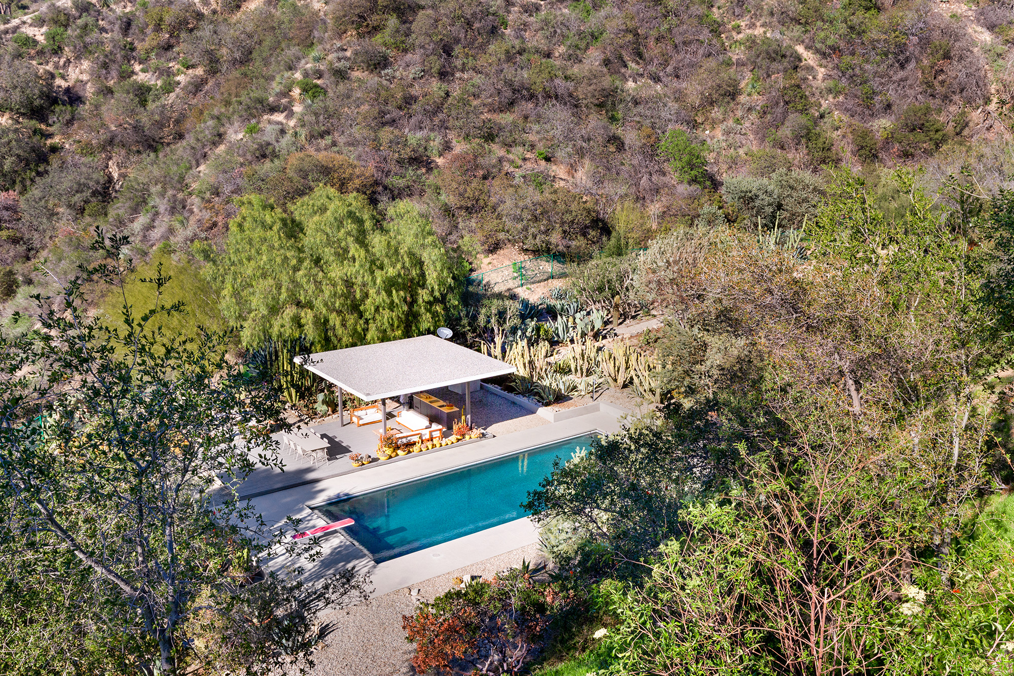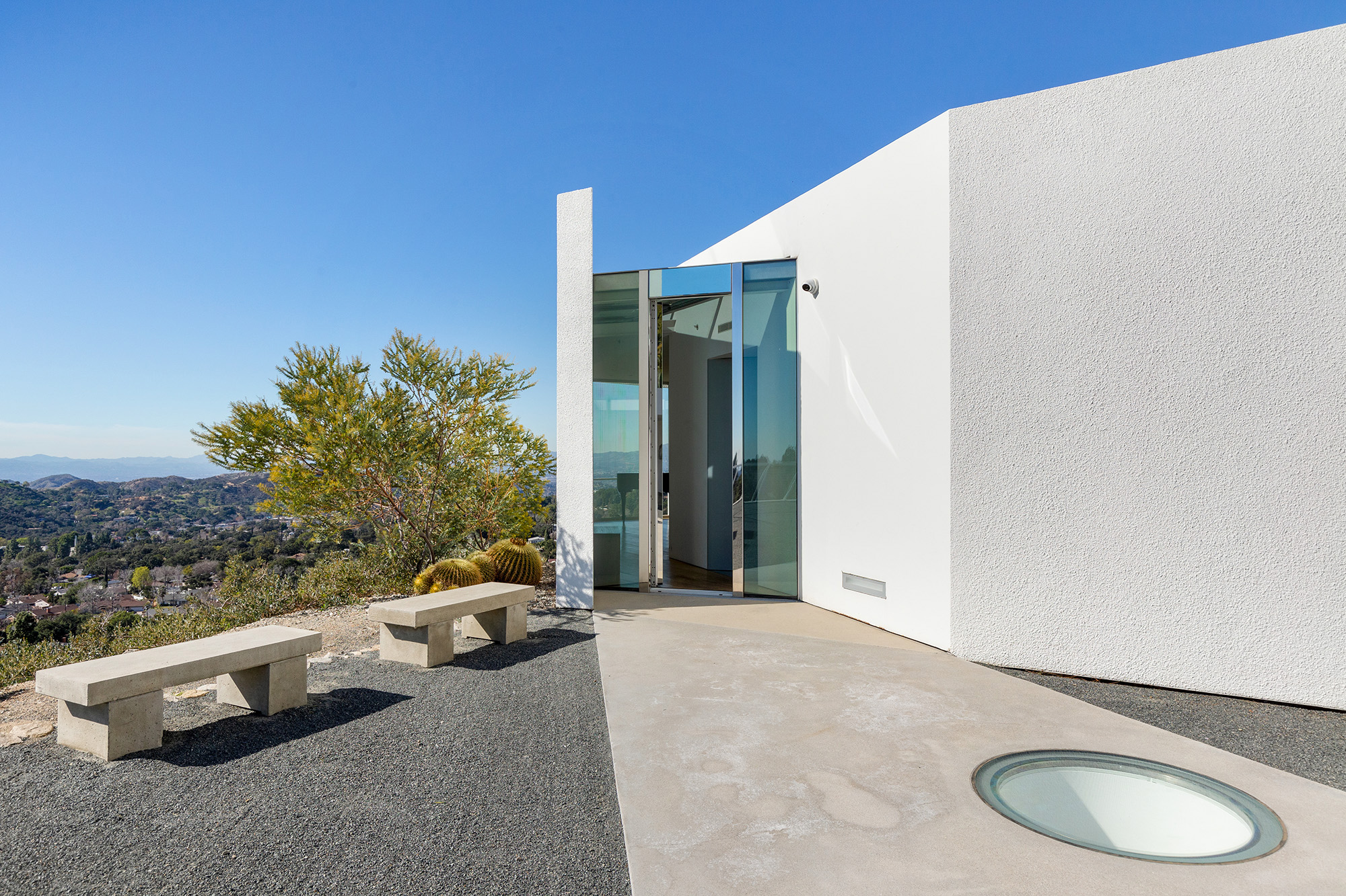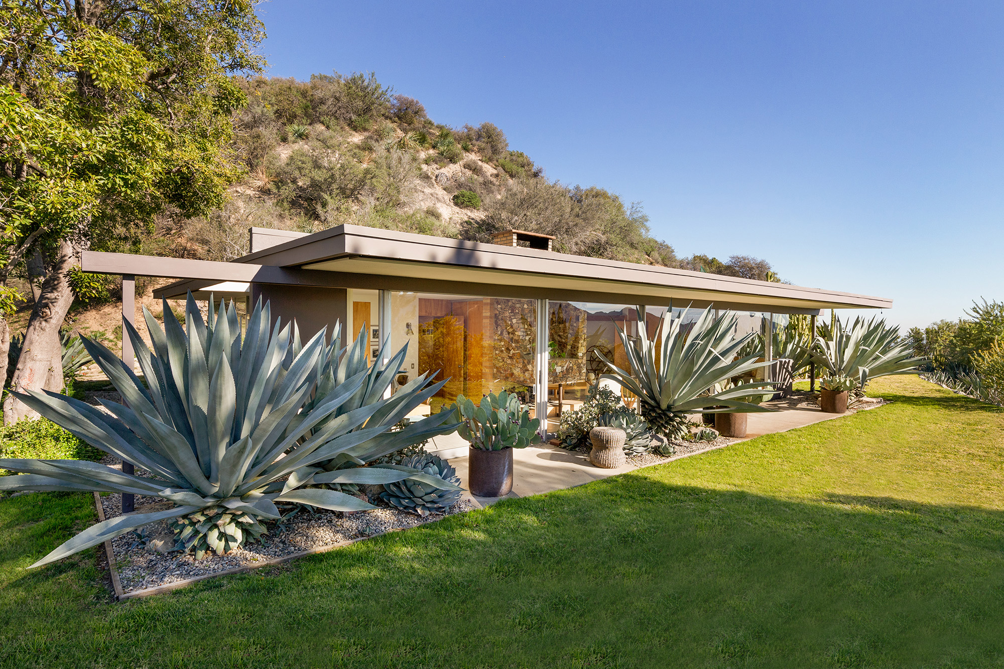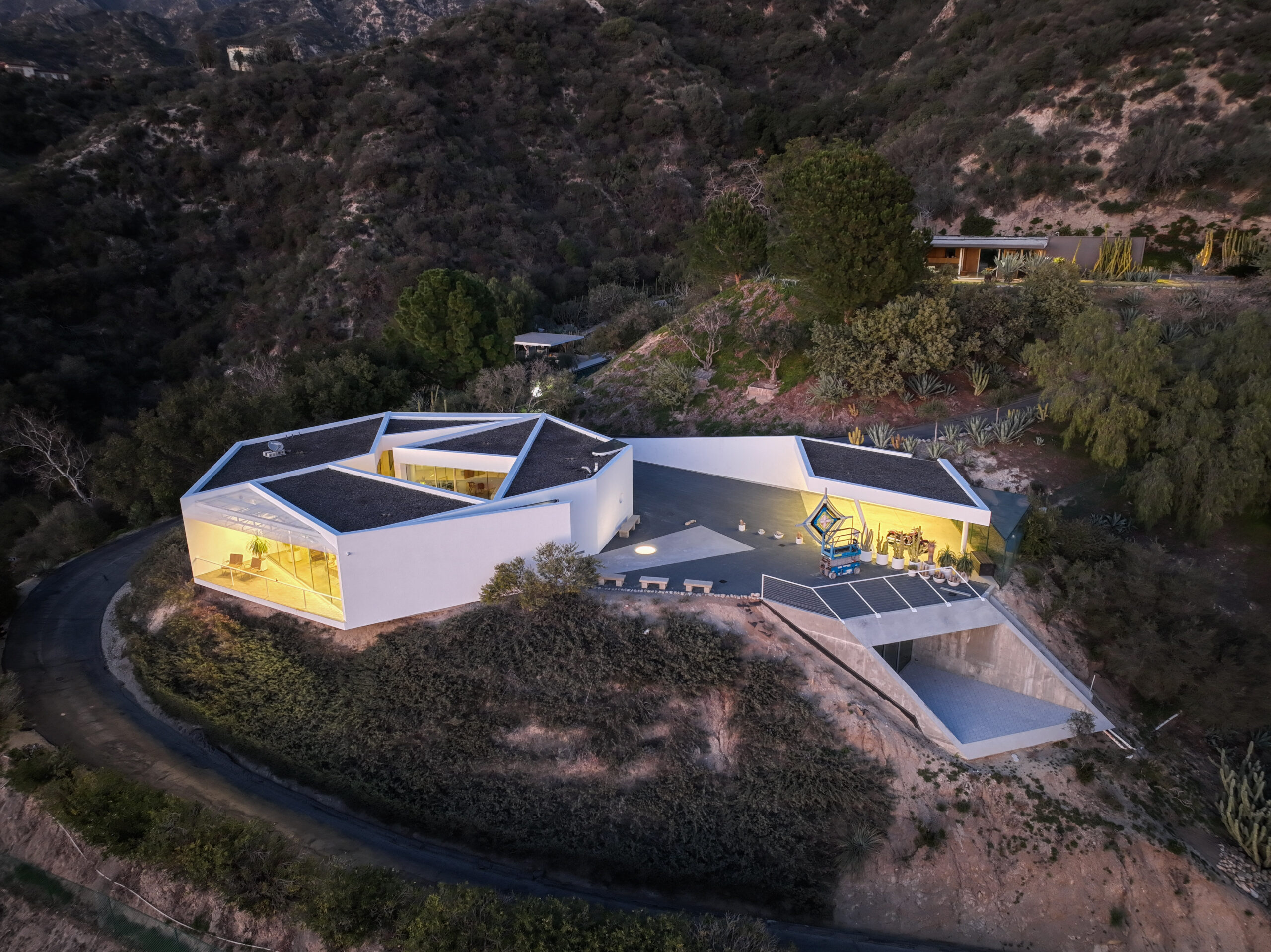 Exceptional Architectural compound offering total hilltop privacy. This stunning pair of pedigreed properties occupy an extraordinary 5.7 acre curated succulent garden. The original structure was built by Richard Neutra FAIA for his secretary, Dorothy Serulnic, in 1953. The 1,350 SF floor plan features 2 bedrooms, one bath, walls of glass, a bear valley stone fireplace and a plethora of Neutra designed built-ins, including a sofa system with record player and concealed speakers, multiple desks, shelving systems, dining room table, sliding breakfast nook and vanity. This pristine architectural masterpiece opens to a flat grassy pad with spectacular mountain and city skyline views throughout. Nearly a half a century later, award winning architect Michael Maltzan was commissioned to build the main residence. His unique design is anchored by a 7 sided structure with an interior courtyard. A sensational 875 SF addition was completed by the noteworthy architect in 2021. The entire structure has breathtaking mountain and city skyline views. The heavenly primary suite with curvilinear penny tiled bathroom looks through the courtyard and onto the dramatic view. There is a smart office area, cozy den, and a multitude of built-in storage throughout. The enormous Johnston Vidal lap pool is 50'long. The outdoor movie pavilion with wind screen and catering kitchen is the perfect place to entertain. A spectacular cabin designed by Mariah O'Brien interiors and Mind Tree Arts completes the unique estate. This special compound offers peace and privacy like no other.