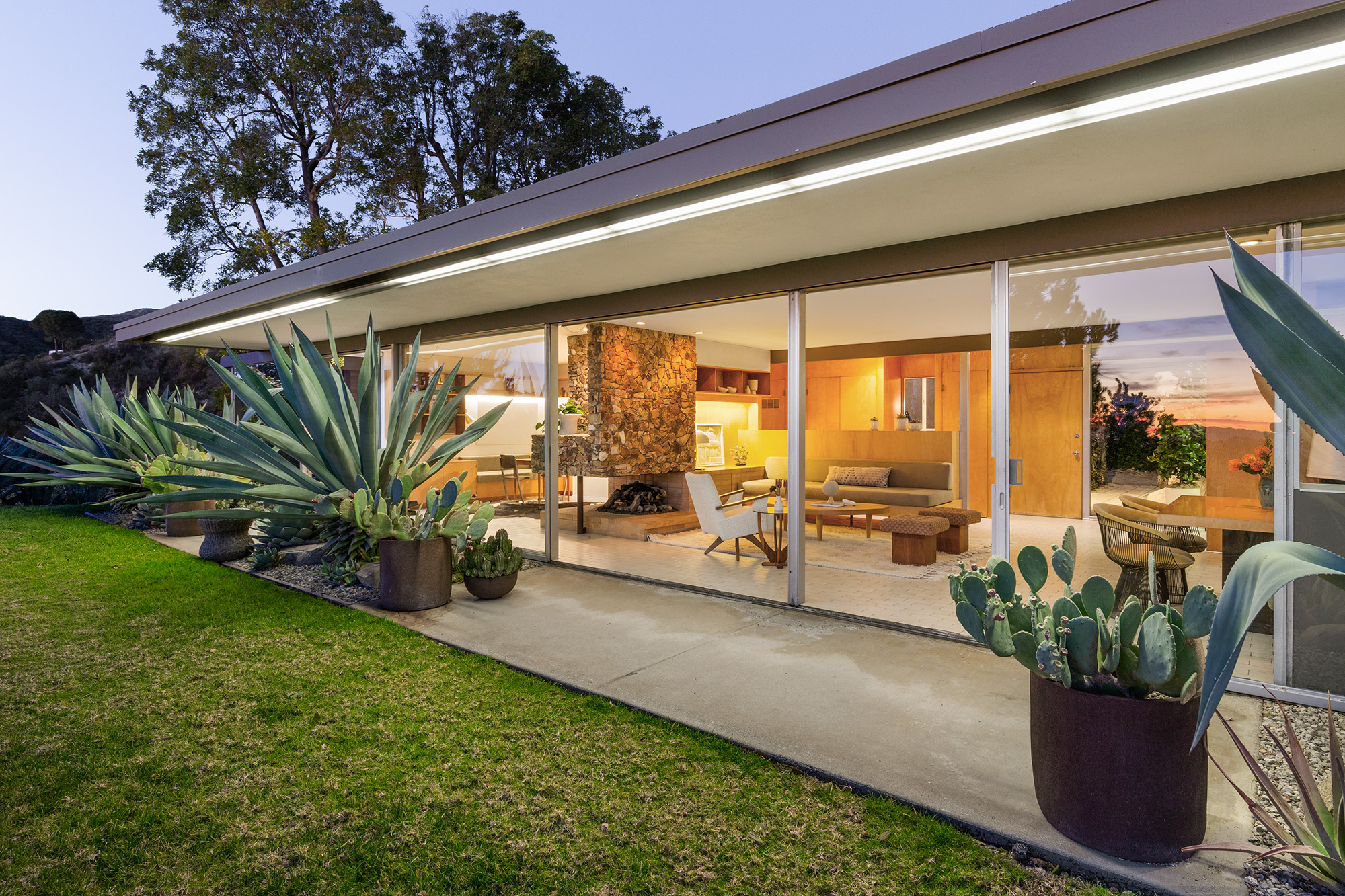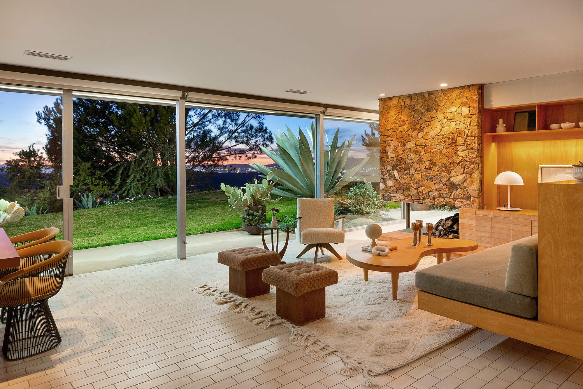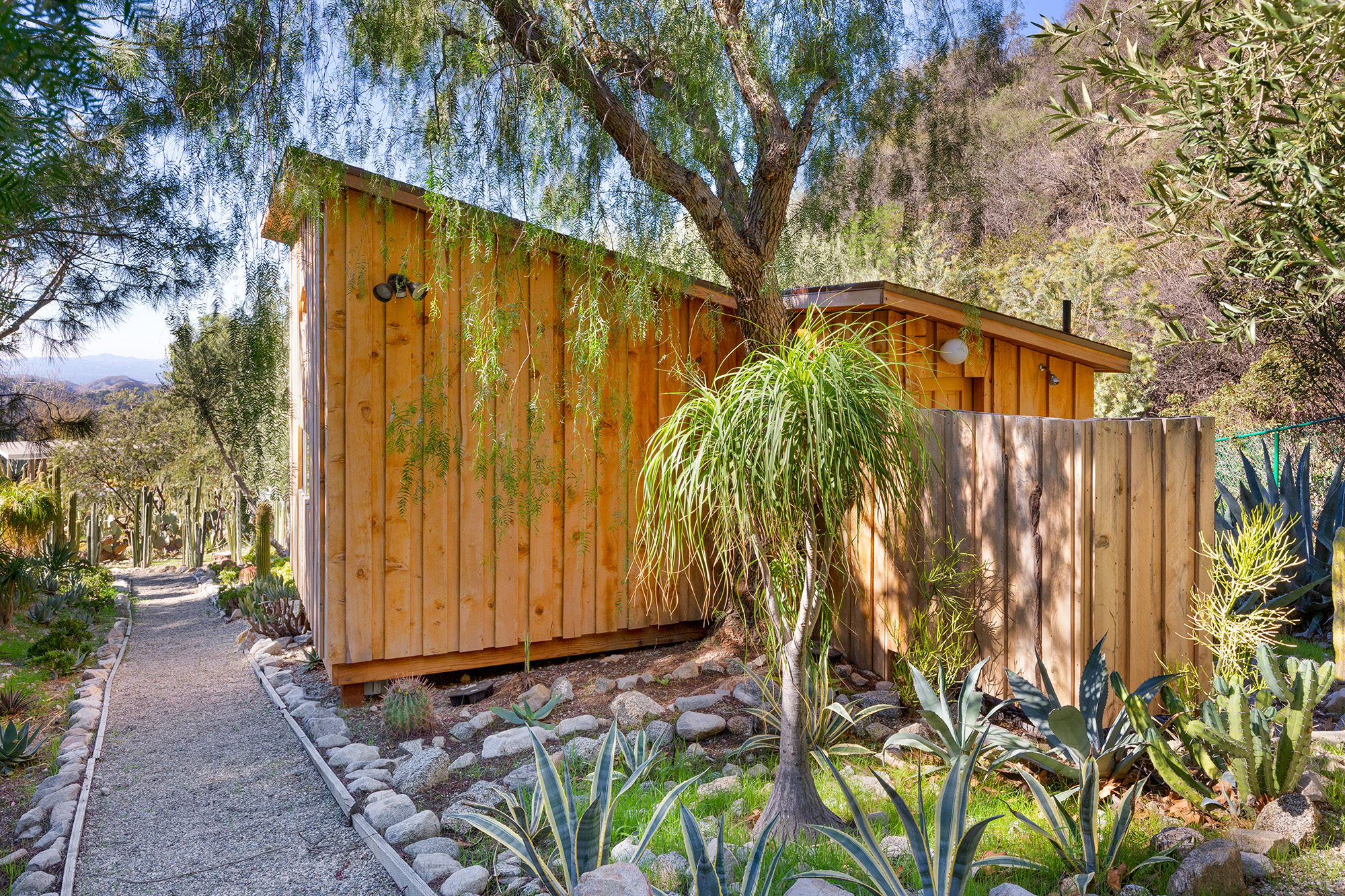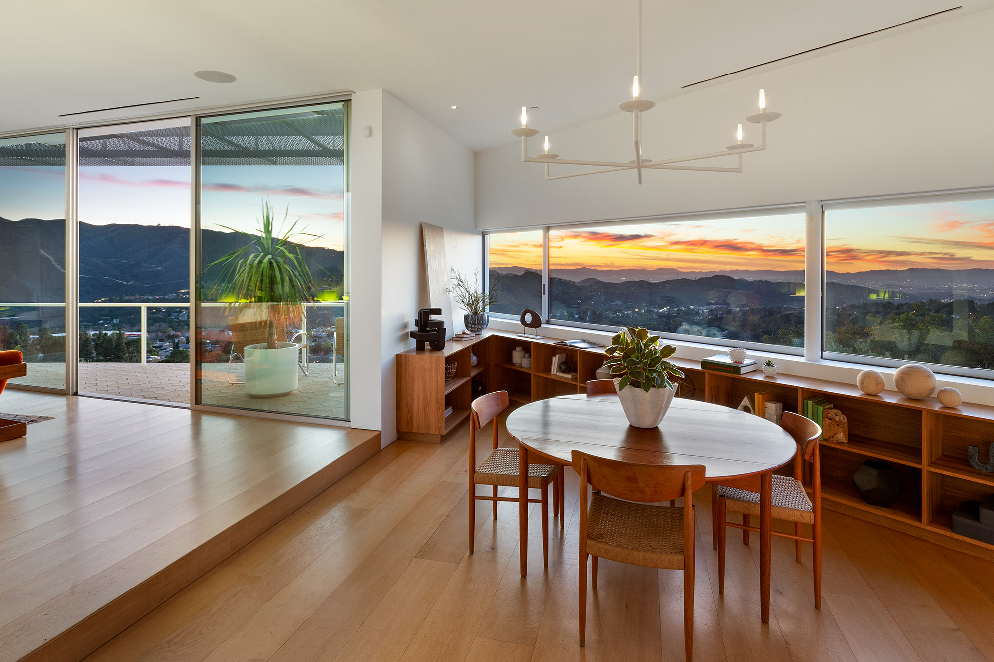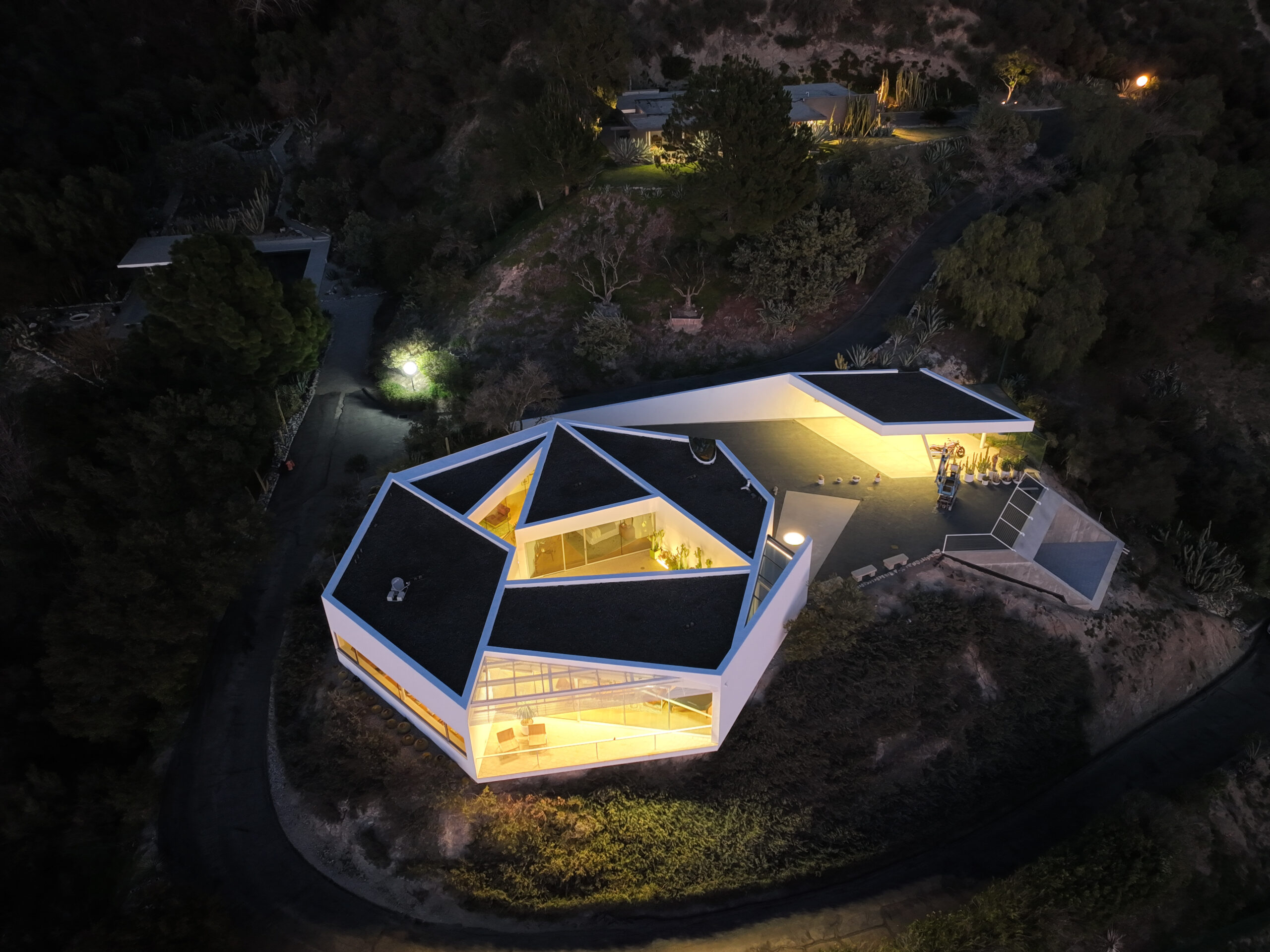Exceptional Architectural compound offering total hilltop privacy. This stunning pair of pedigreed properties occupy an extraordinary 5.7 acre curated succulent garden. The original structure was built by Richard Neutra FAIA for his secretary, Dorothy Serulnic, in 1953. The 1,350 SF floor plan features 2 bedrooms, one bath, walls of glass, a bear valley stone fireplace and a plethora of Neutra designed built-ins, including a sofa system with record player and concealed speakers, multiple desks, shelving systems, dining room table, sliding breakfast nook and vanity. This pristine architectural masterpiece opens to a flat grassy pad with spectacular mountain and city skyline views throughout. Nearly a half a century later, award winning architect Michael Maltzan was commissioned to build the main residence. His unique design is anchored by a 7 sided structure with an interior courtyard. A sensational 875 SF addition was completed by the noteworthy architect in 2021. The entire structure has breathtaking mountain and city skyline views. The heavenly primary suite with curvilinear penny tiled bathroom looks through the courtyard and onto the dramatic view. There is a smart office area, cozy den, and a multitude of built-in storage throughout. The enormous Johnston Vidal lap pool is 50'long. The outdoor movie pavilion with wind screen and catering kitchen is the perfect place to entertain. A spectacular cabin designed by Mariah O'Brien interiors and Mind Tree Arts completes the unique estate. This special compound offers peace and privacy like no other.