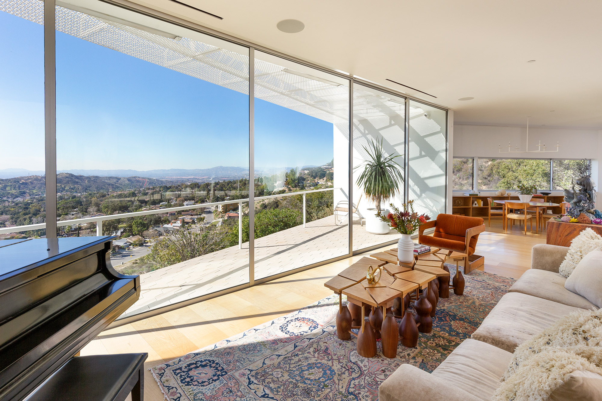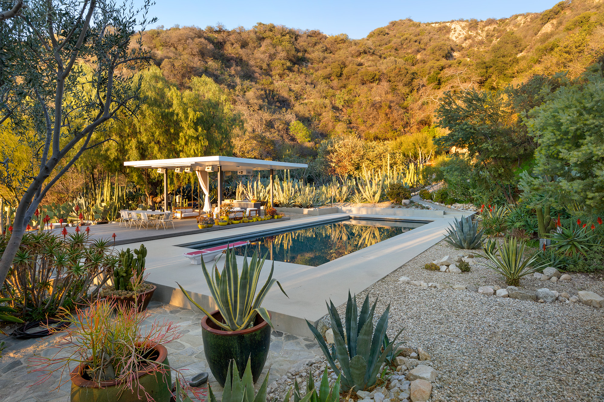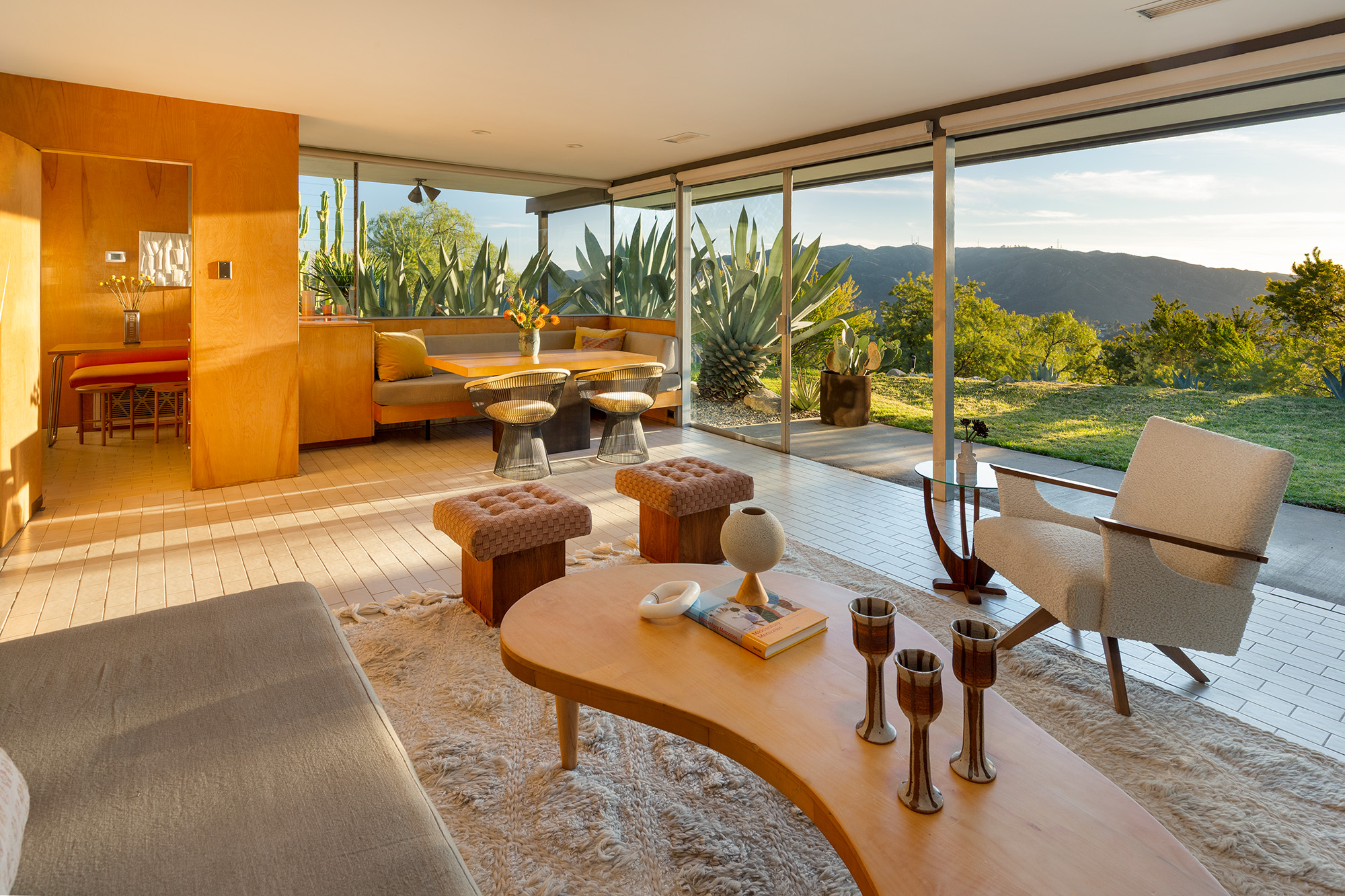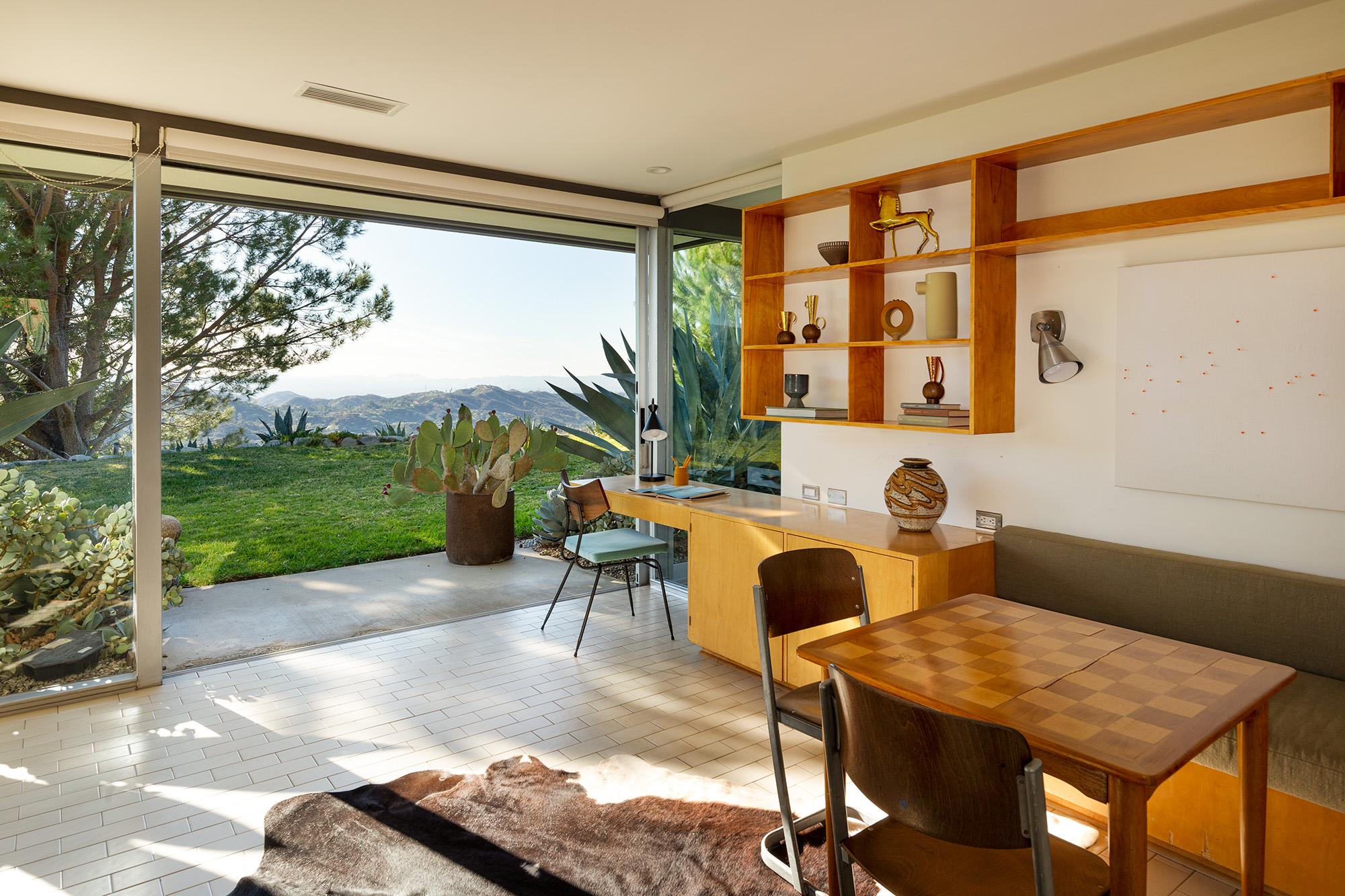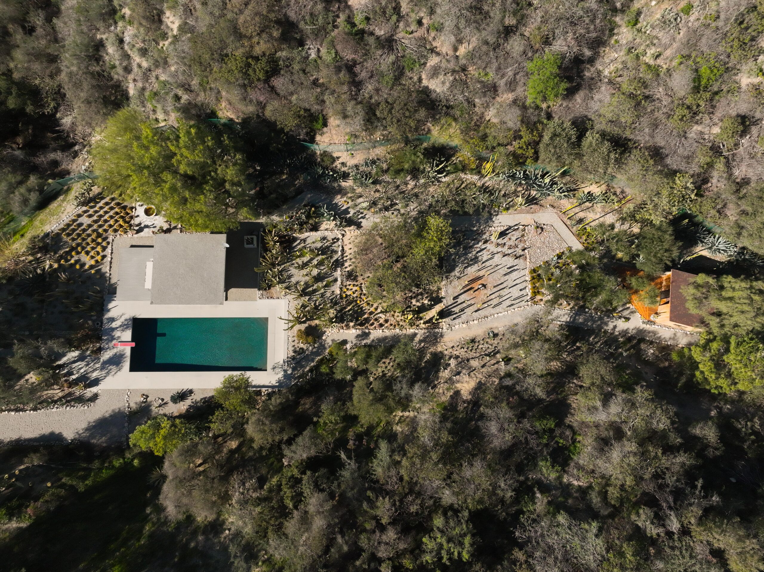 Exceptional Architectural compound offering total hilltop privacy. This stunning pair of pedigreed properties occupy an extraordinary 5.7 acre curated succulent garden. The original structure was built by Richard Neutra FAIA for his secretary, Dorothy Serulnic, in 1953. The 1,350 SF floor plan features 2 bedrooms, one bath, walls of glass, a bear valley stone fireplace and a plethora of Neutra designed built-ins, including a sofa system with record player and concealed speakers, multiple desks, shelving systems, dining room table, sliding breakfast nook and vanity. This pristine architectural masterpiece opens to a flat grassy pad with spectacular mountain and city skyline views throughout. Nearly a half a century later, award winning architect Michael Maltzan was commissioned to build the main residence. His unique design is anchored by a 7 sided structure with an interior courtyard. A sensational 875 SF addition was completed by the noteworthy architect in 2021. The entire structure has breathtaking mountain and city skyline views. The heavenly primary suite with curvilinear penny tiled bathroom looks through the courtyard and onto the dramatic view. There is a smart office area, cozy den, and a multitude of built-in storage throughout. The enormous Johnston Vidal lap pool is 50'long. The outdoor movie pavilion with wind screen and catering kitchen is the perfect place to entertain. A spectacular cabin designed by Mariah O'Brien interiors and Mind Tree Arts completes the unique estate. This special compound offers peace and privacy like no other.